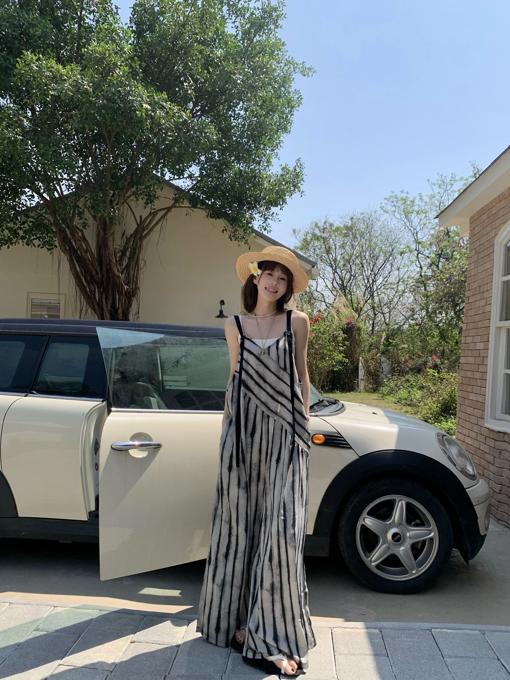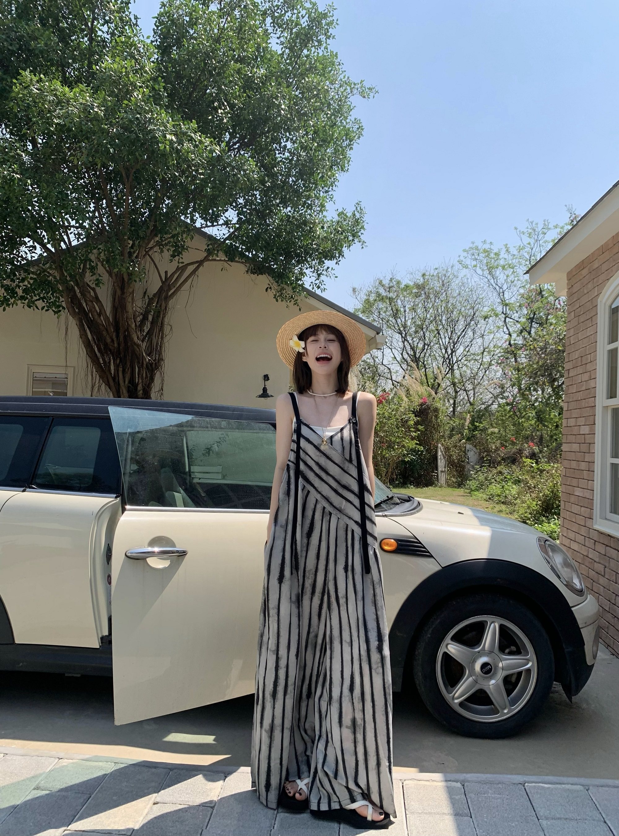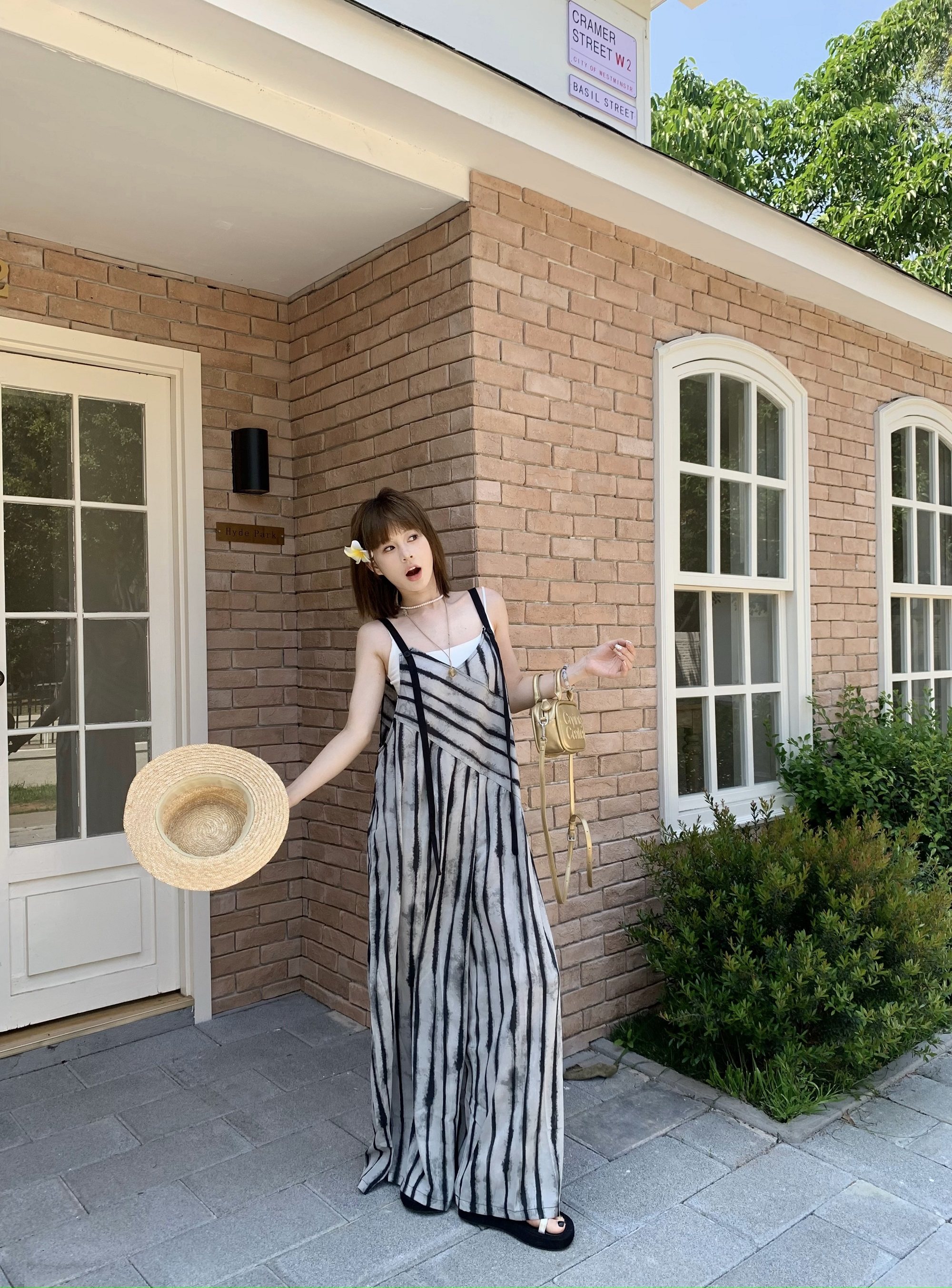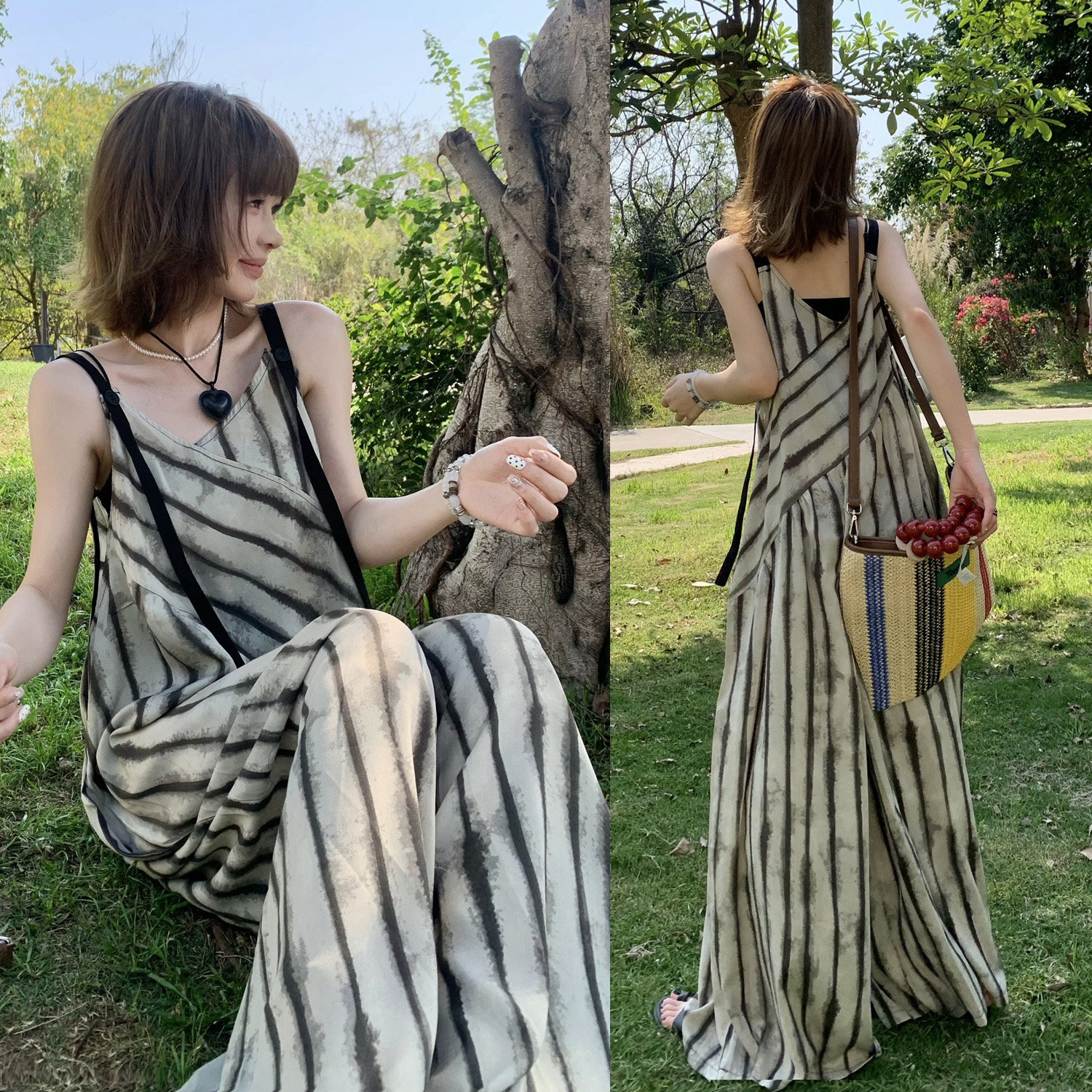 【ボトムス】夏新作 ルーズシルエット オーバーサイズ ストライプ キャミサロペット ワイドパンツ 【SHシリーズ】