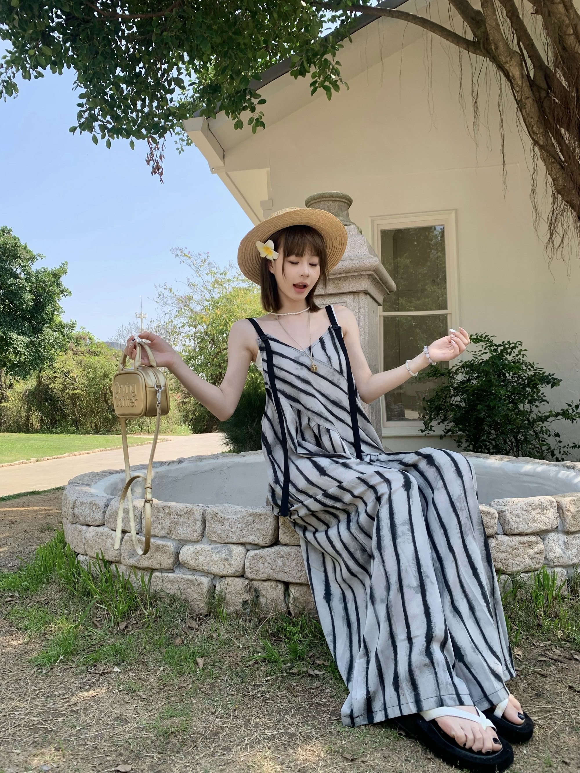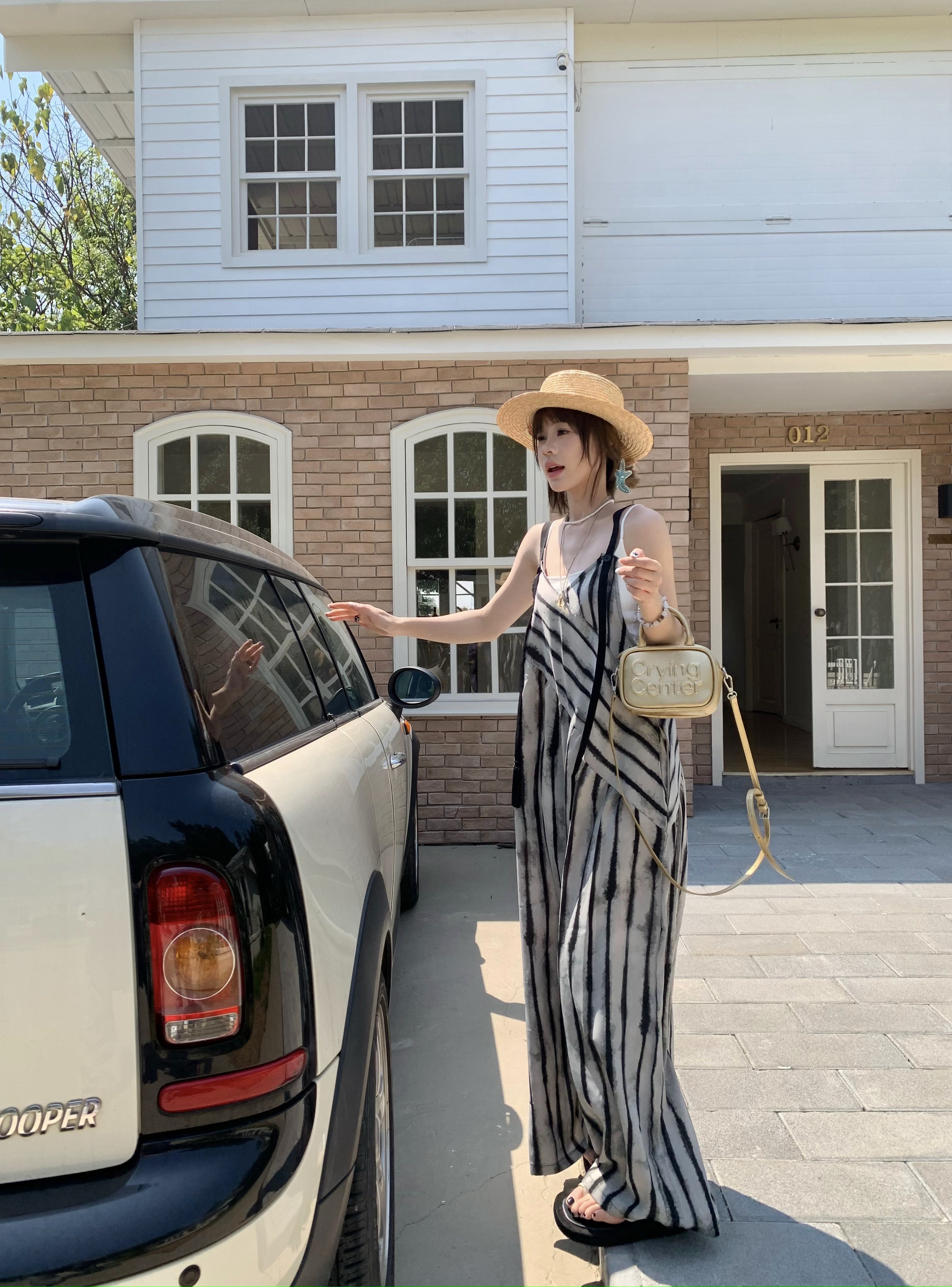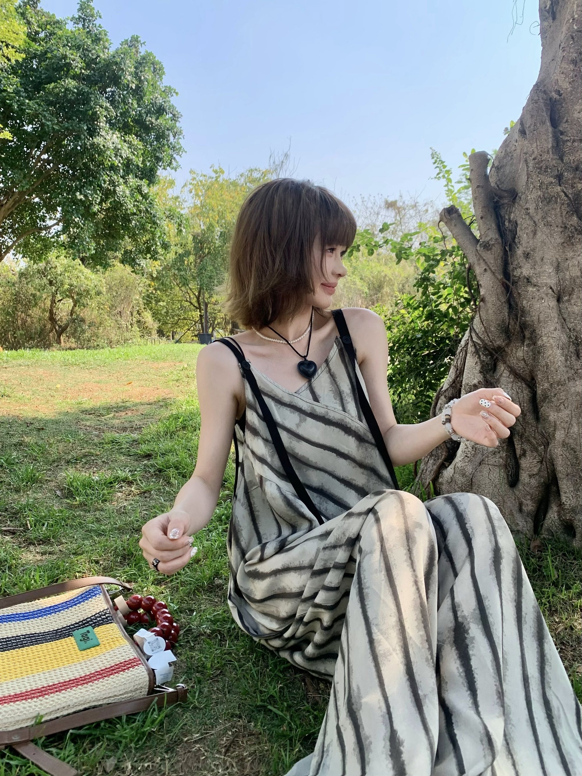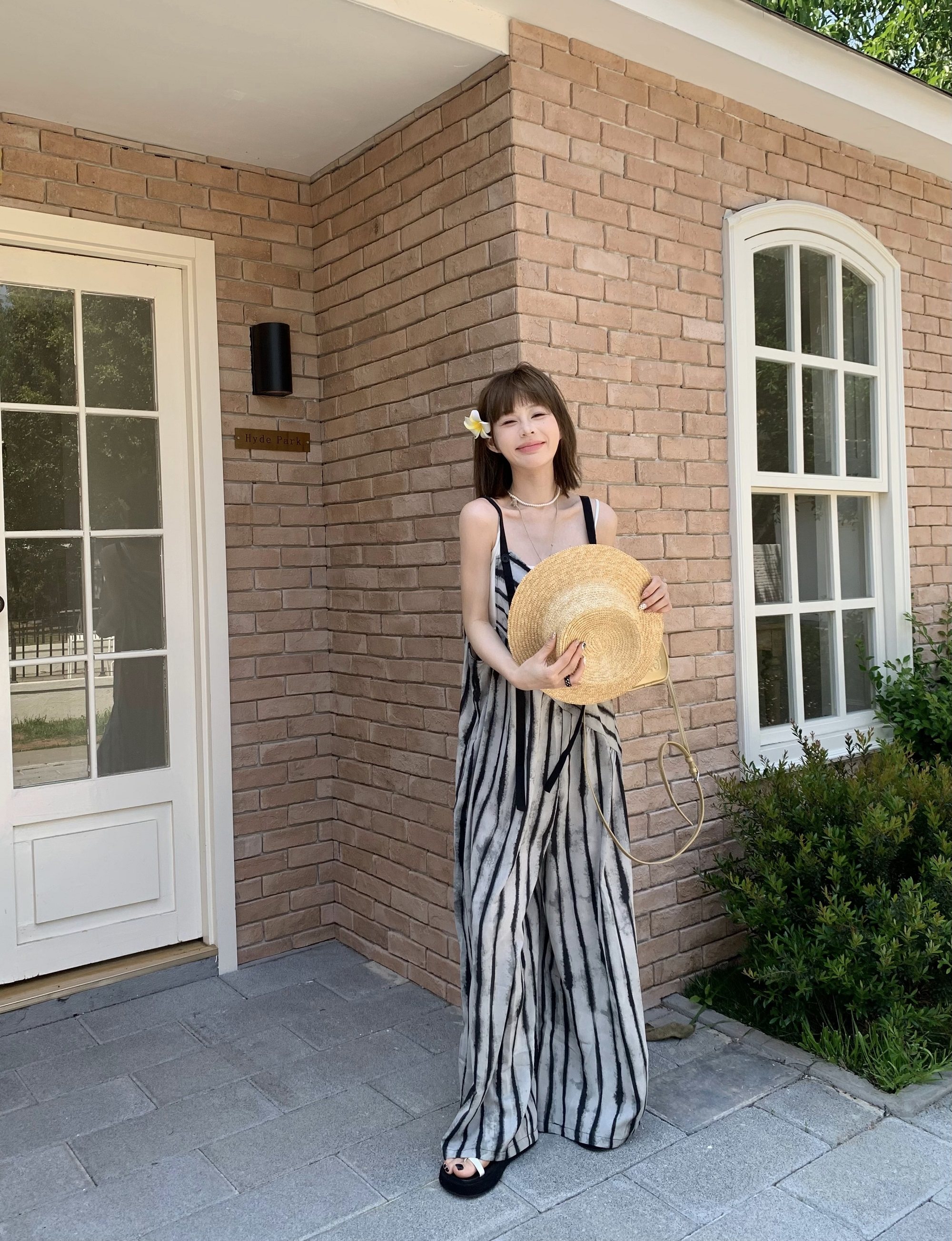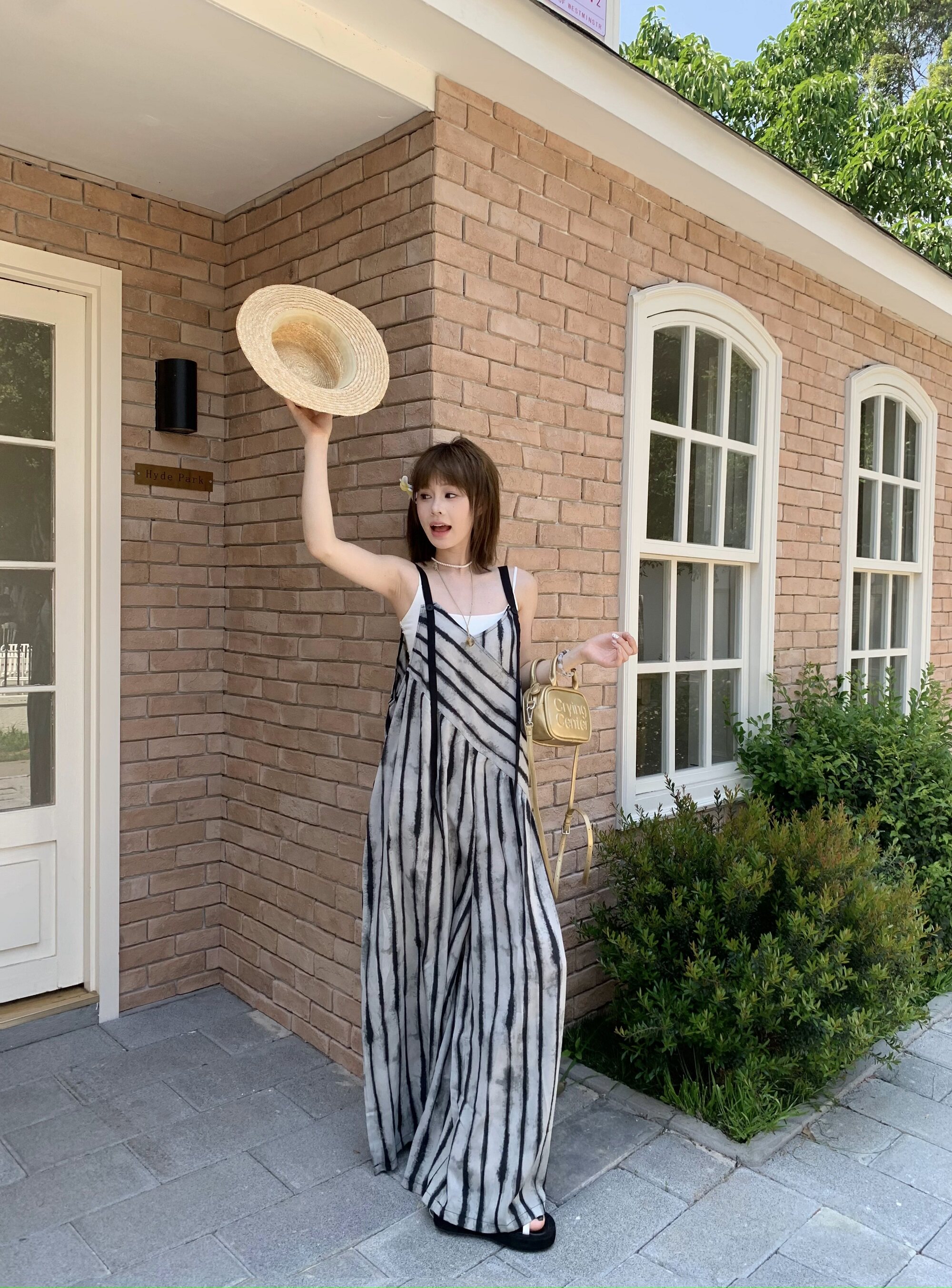 【ボトムス】夏新作 ルーズシルエット オーバーサイズ ストライプ キャミサロペット ワイドパンツ 【SHシリーズ】
