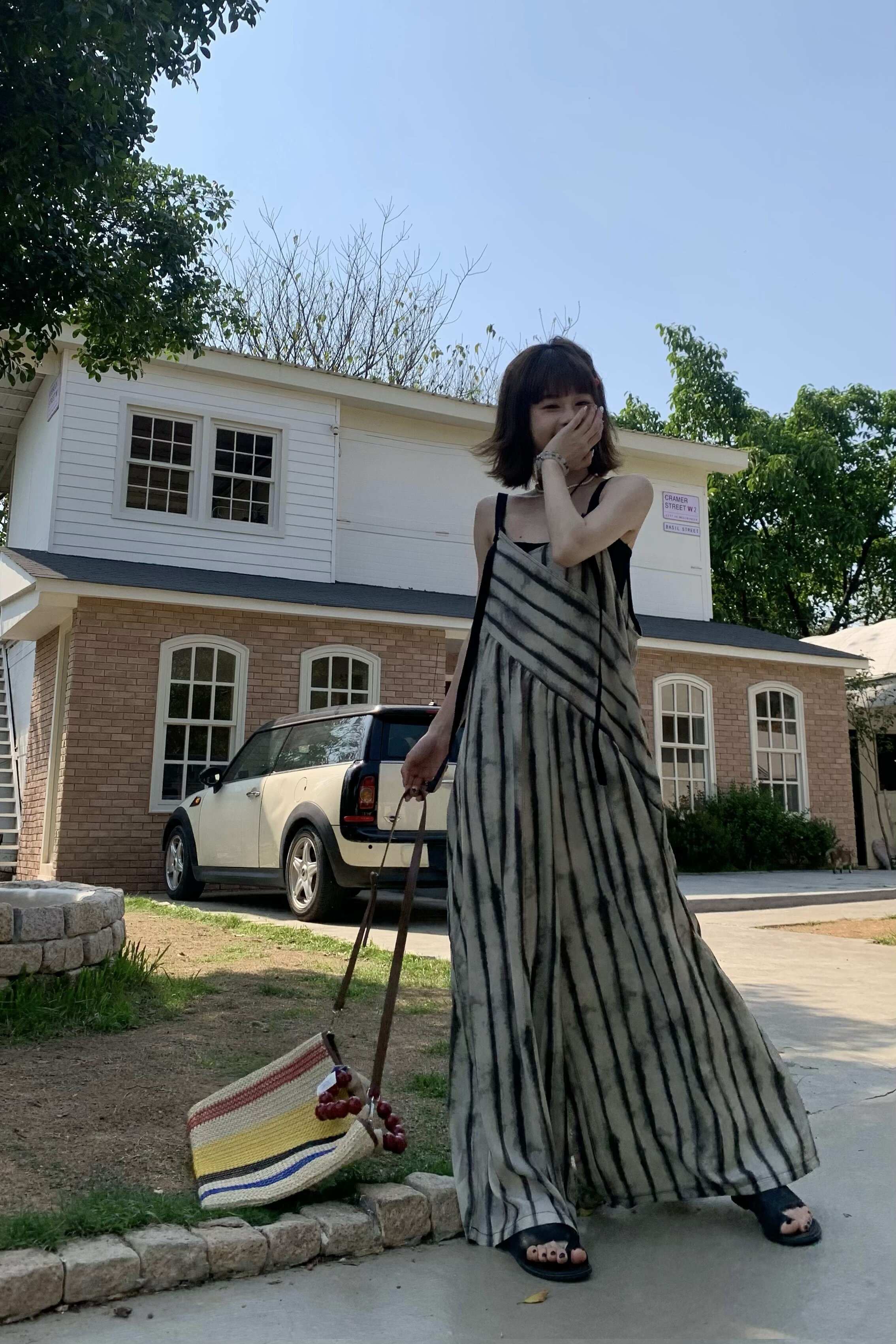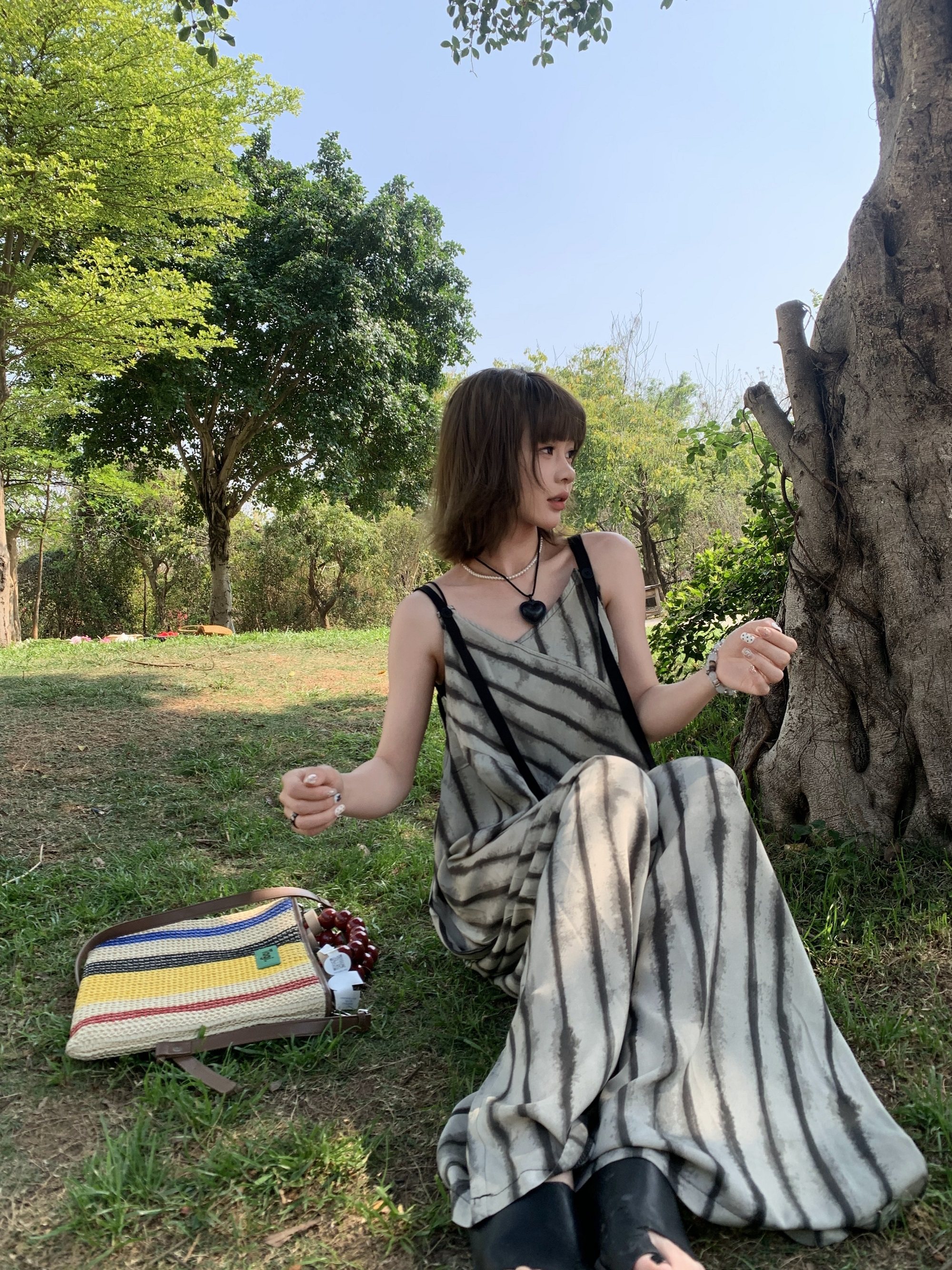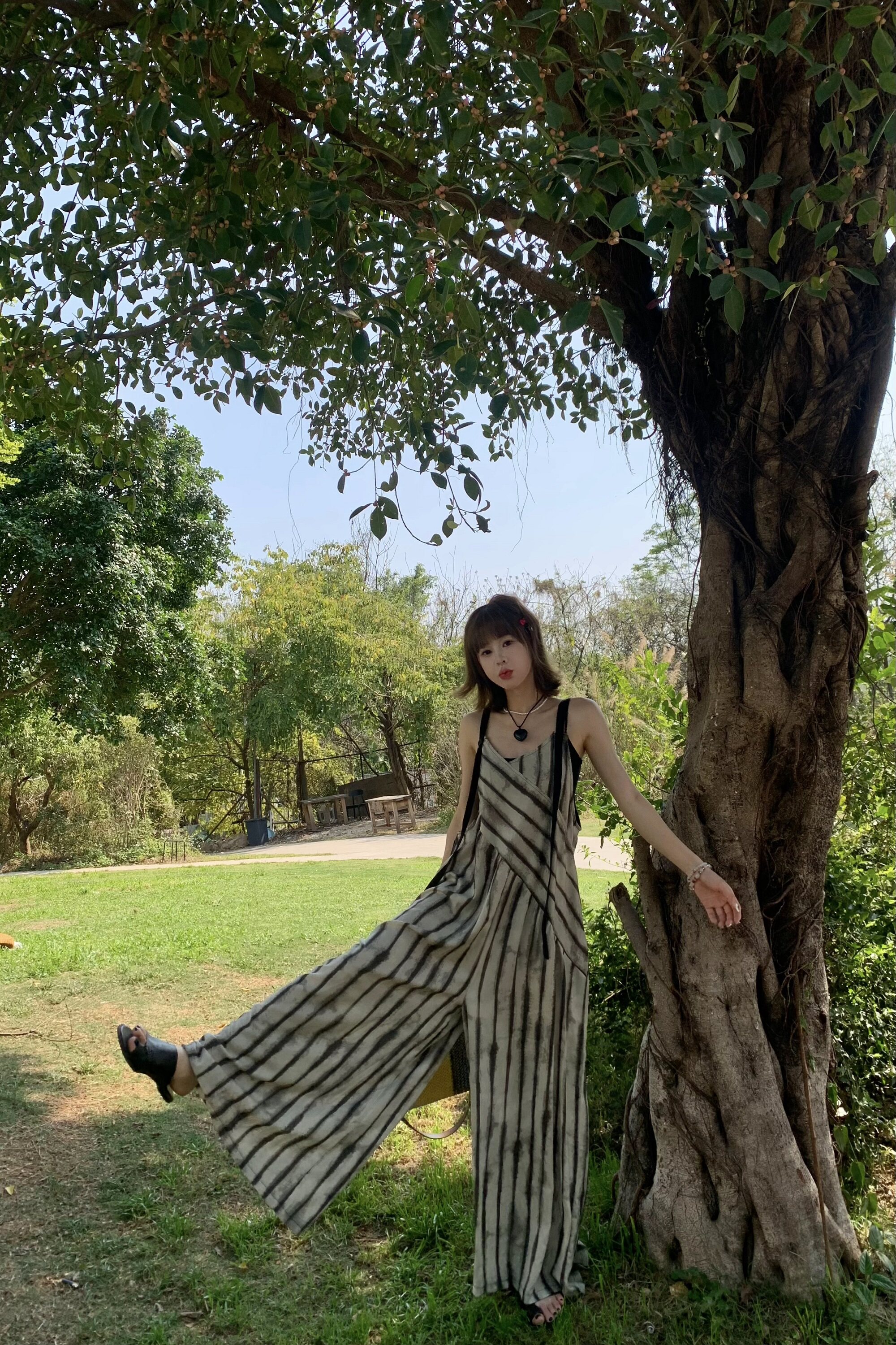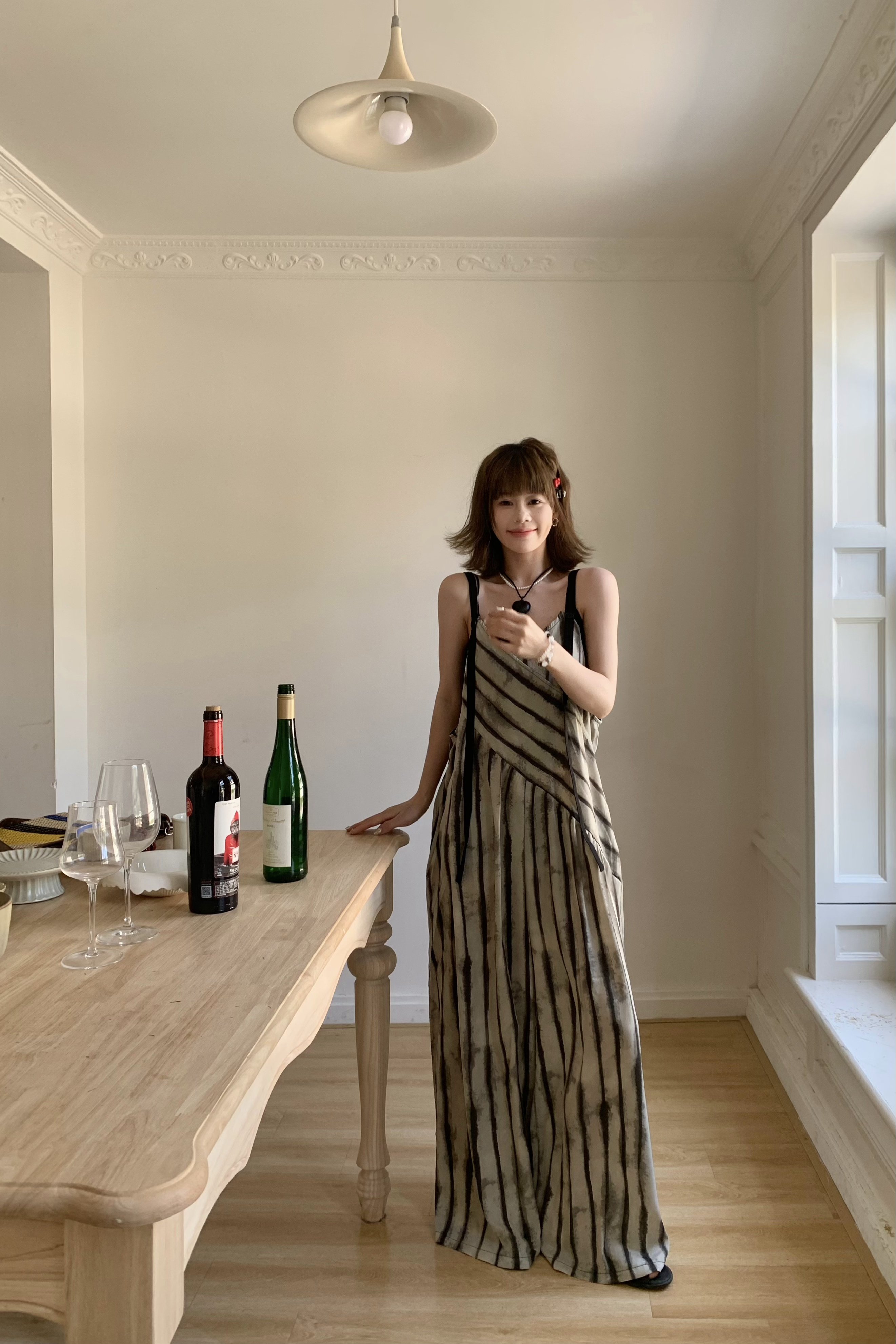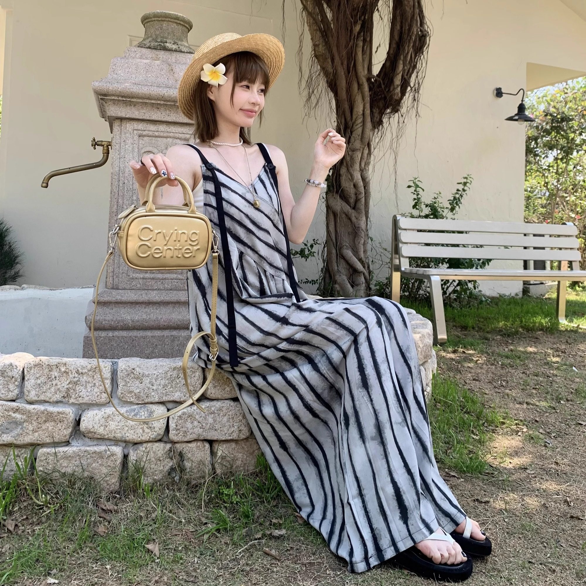 【ボトムス】夏新作 ルーズシルエット オーバーサイズ ストライプ キャミサロペット ワイドパンツ 【SHシリーズ】