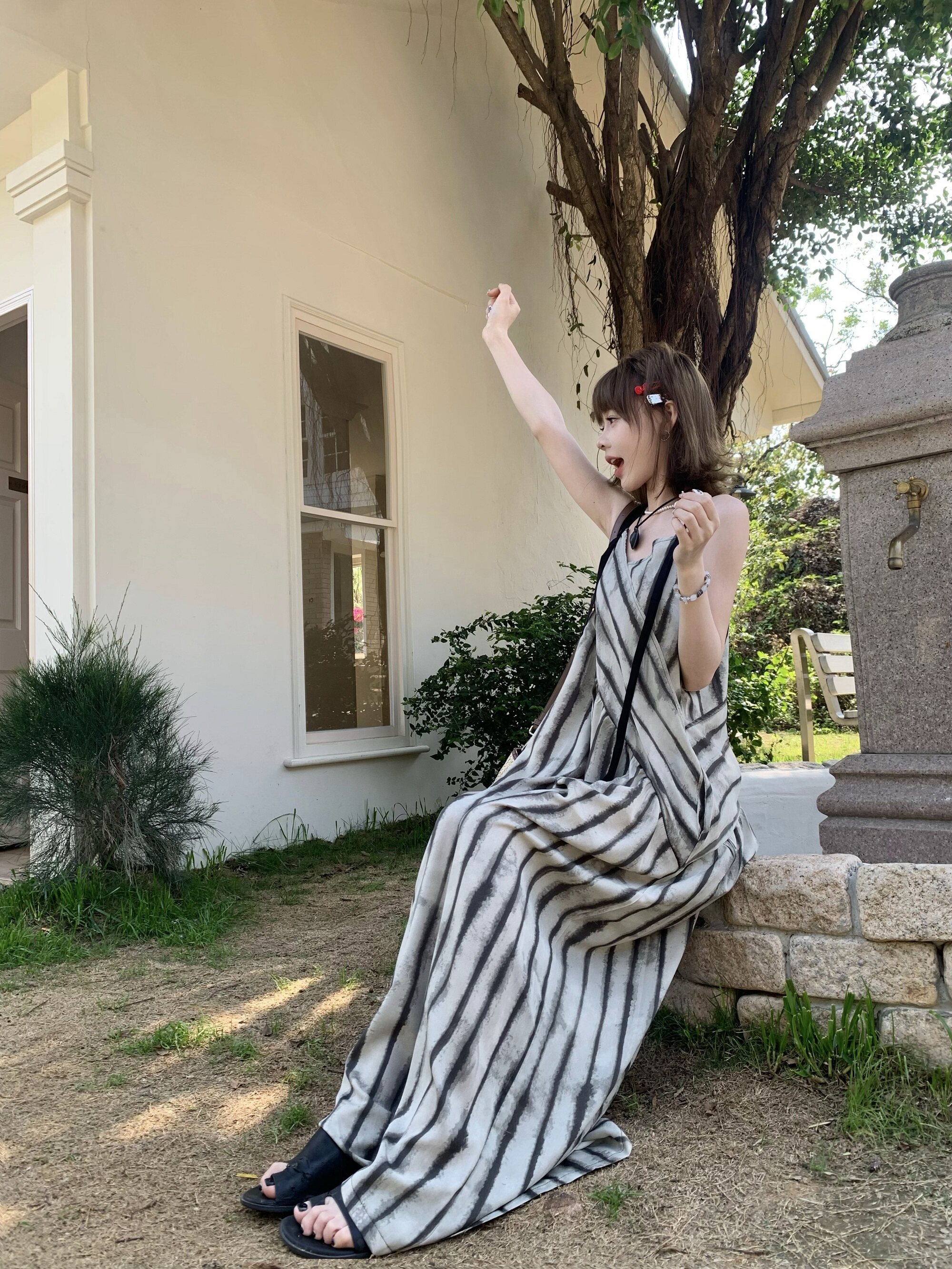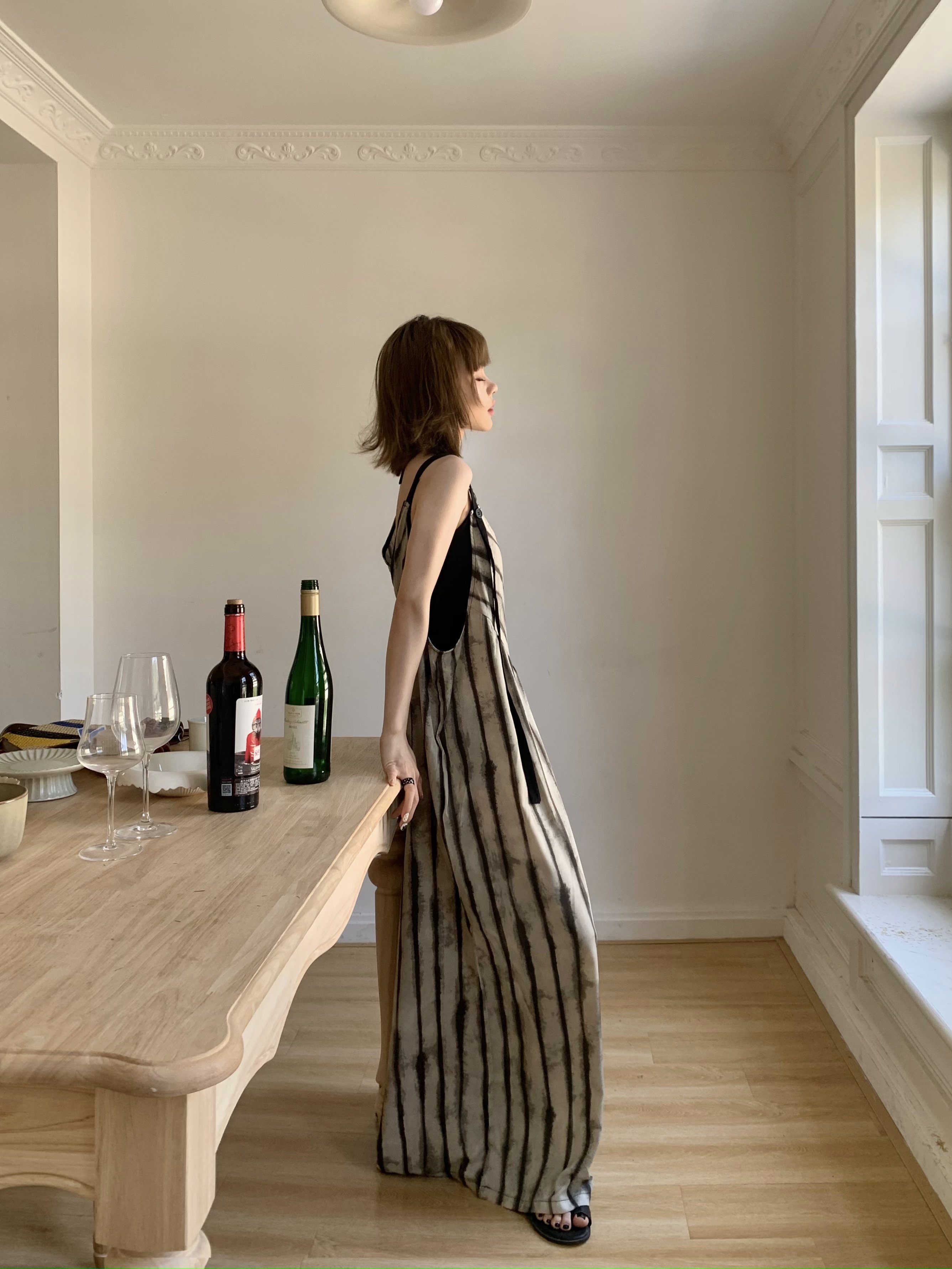 【商品名】【ボトムス】夏新作 ルーズシルエット オーバーサイズ ストライプ キャミサロペット ワイドパンツ 【SHシリーズ】