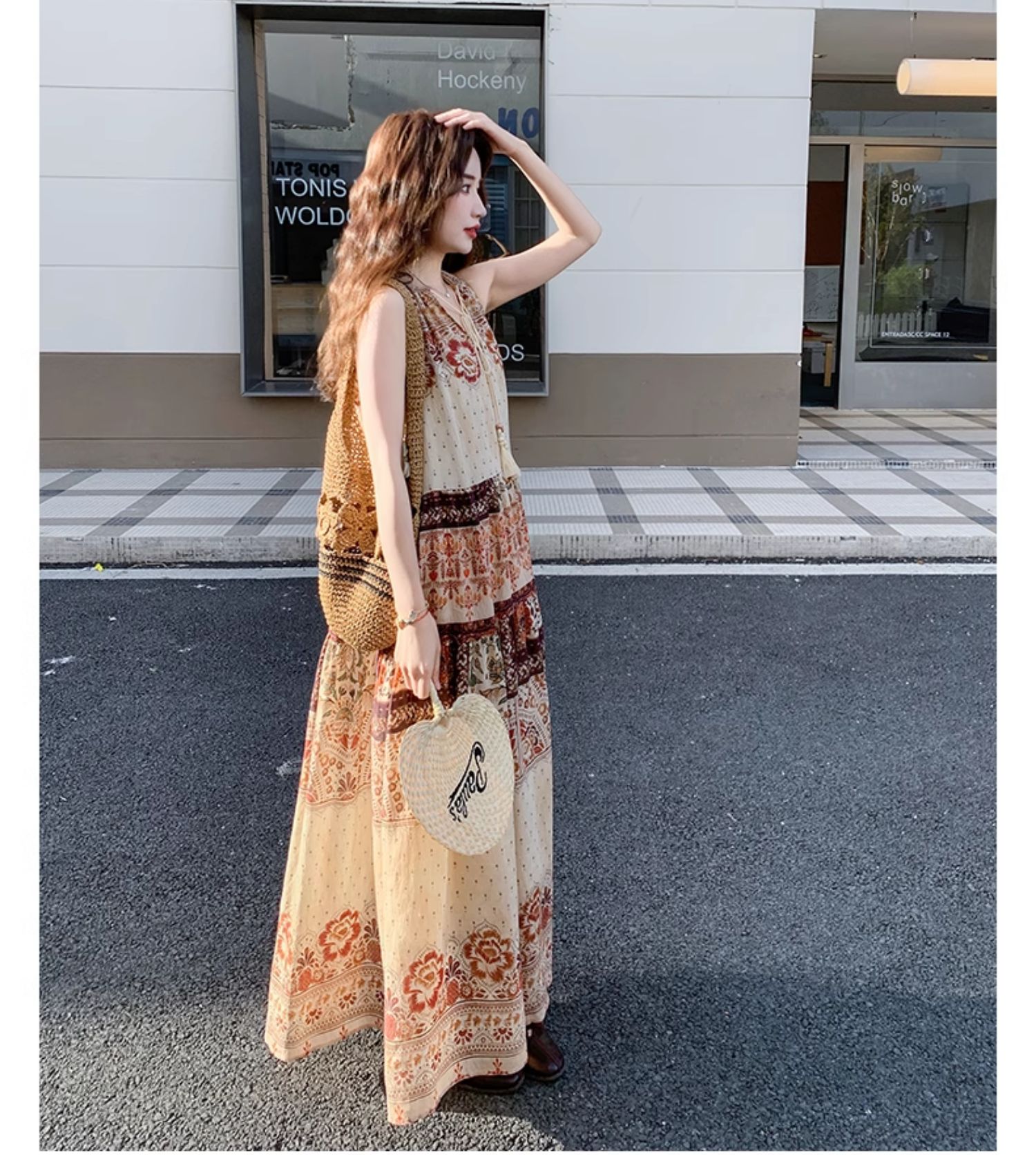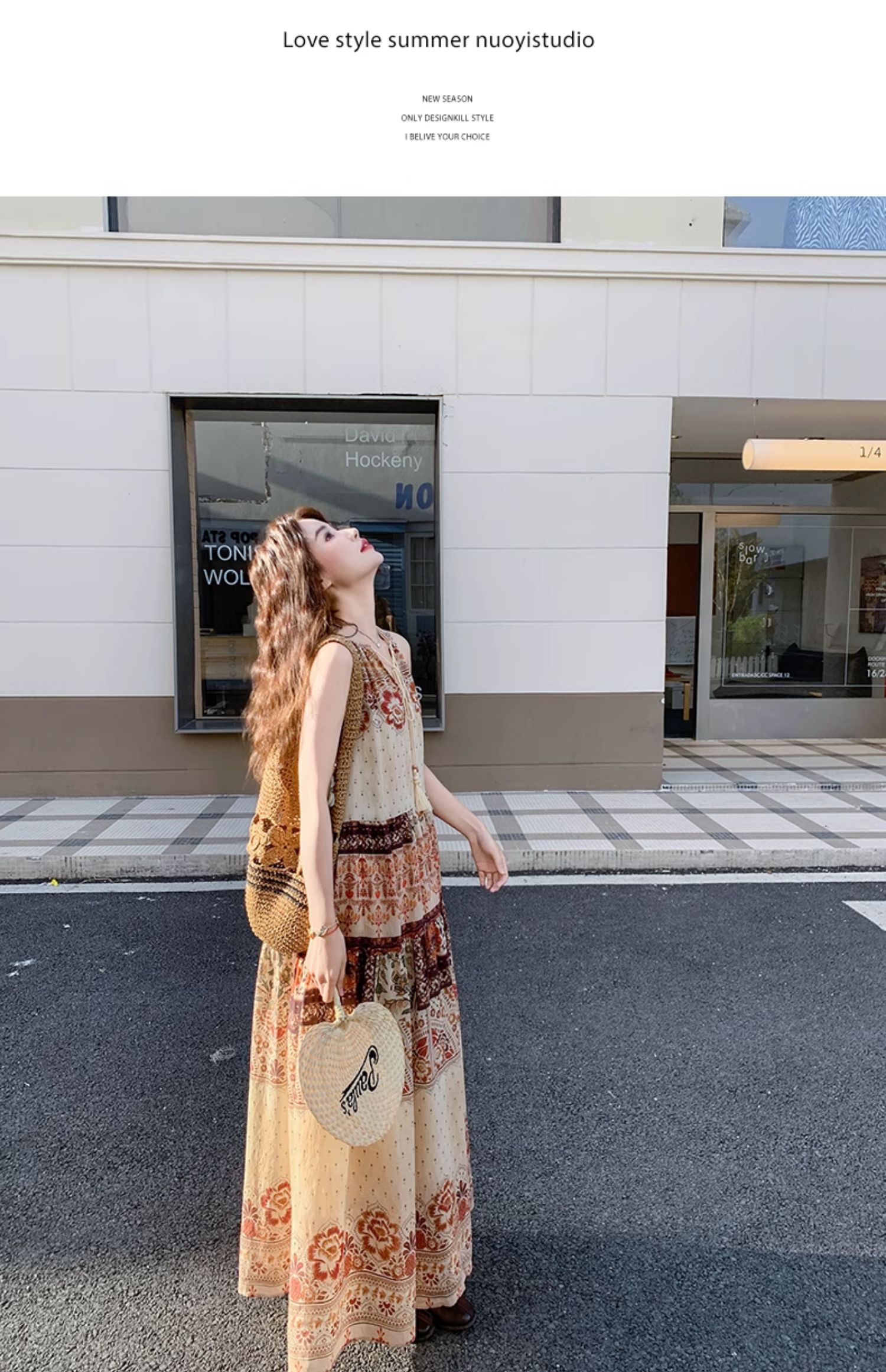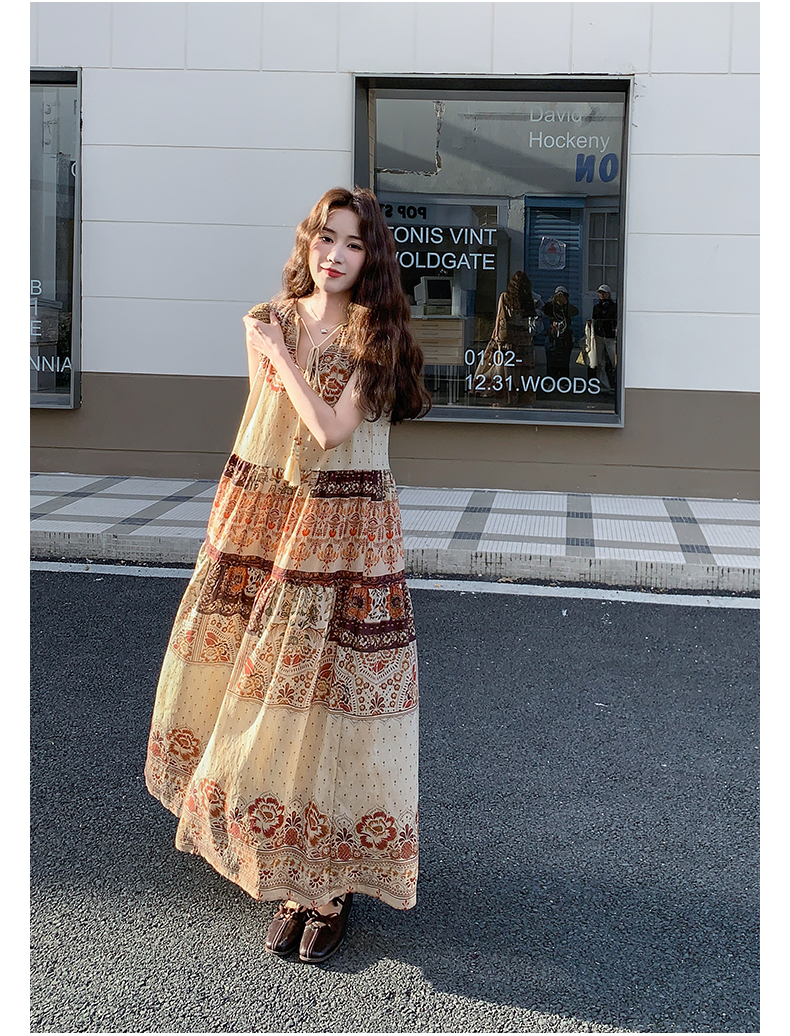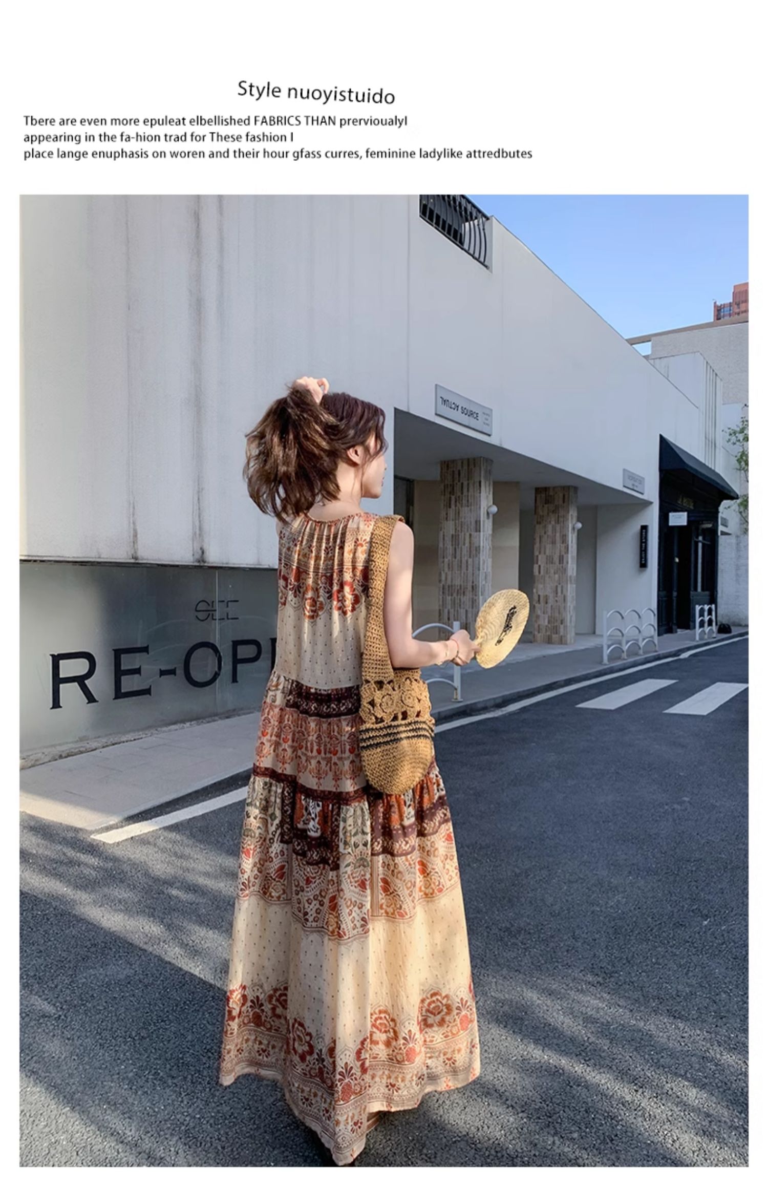 【ワンピース】フレンチヴィンテージ 花柄ボヘミアンワンピース ゆったり 夏新作 ノースリーブワンピース【SHシリーズ】
