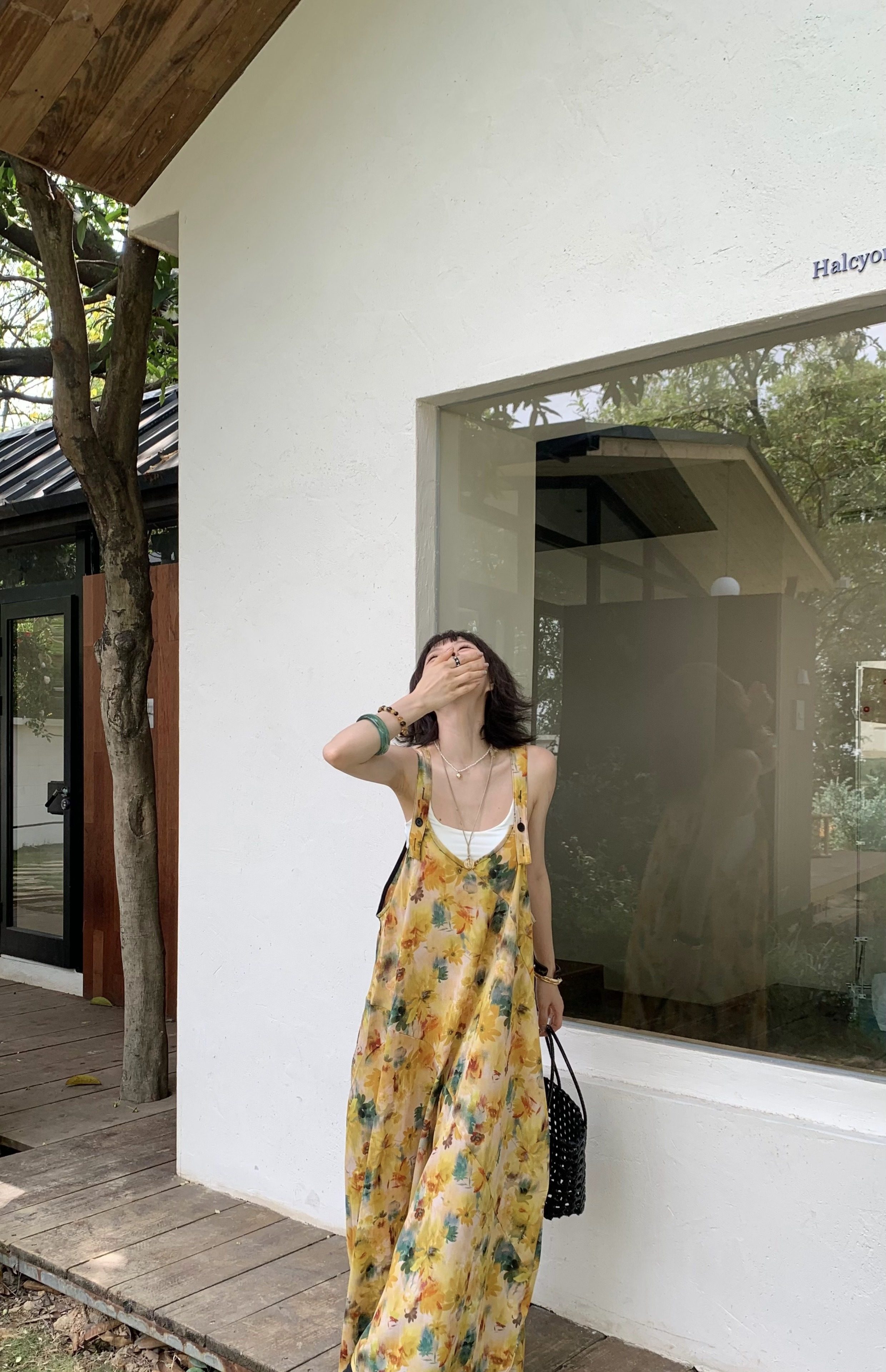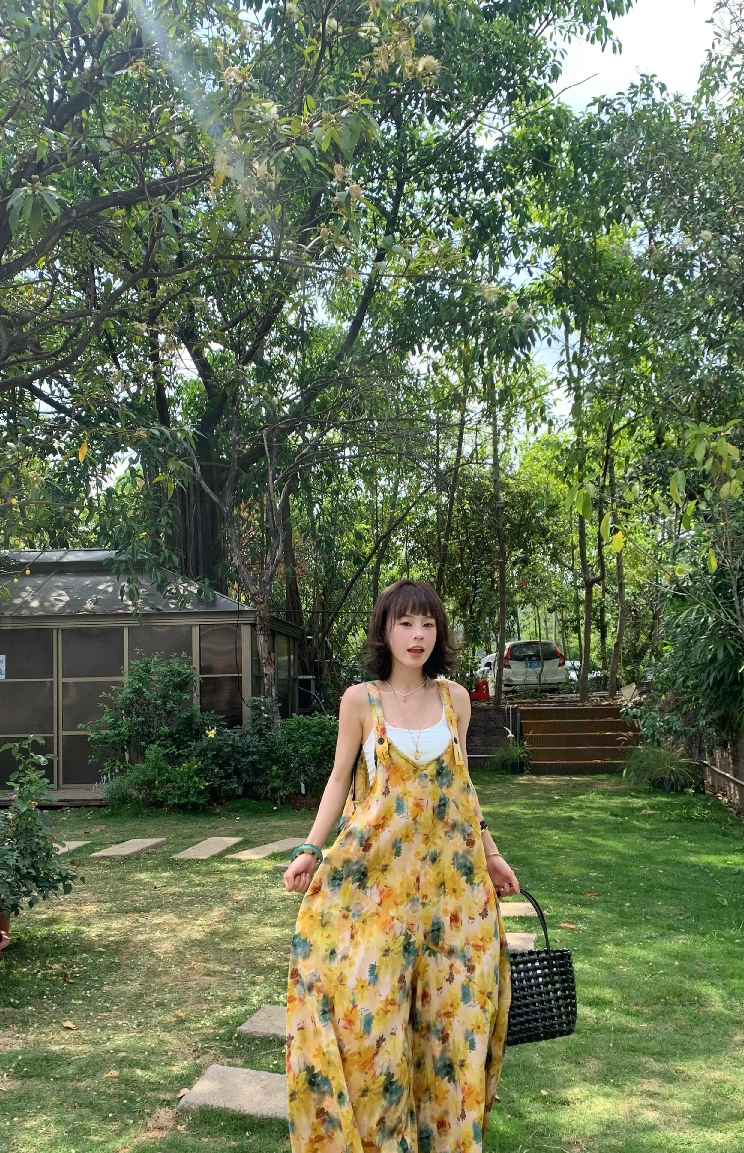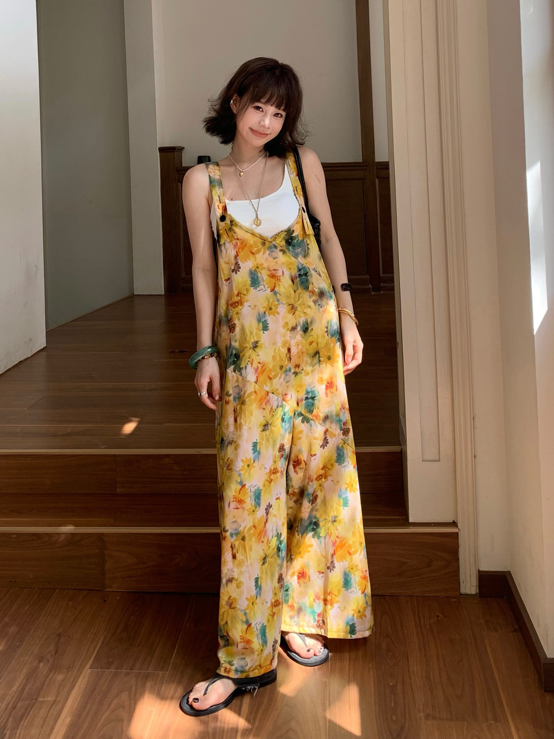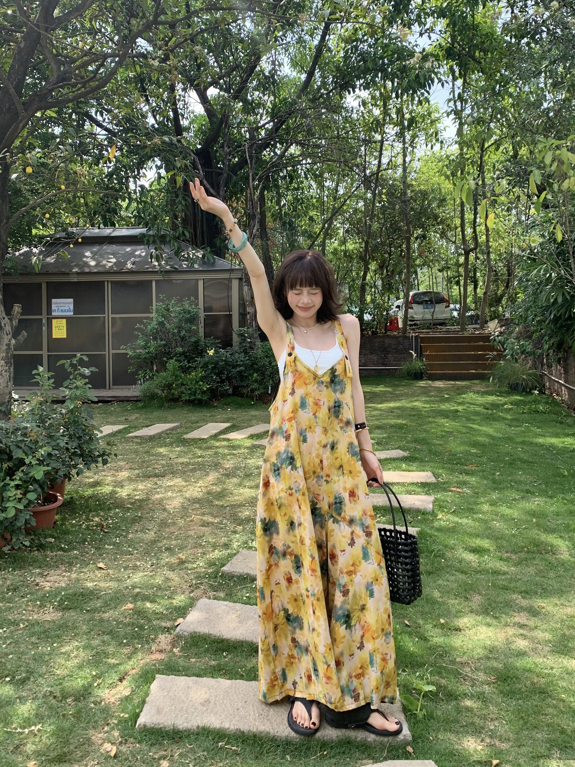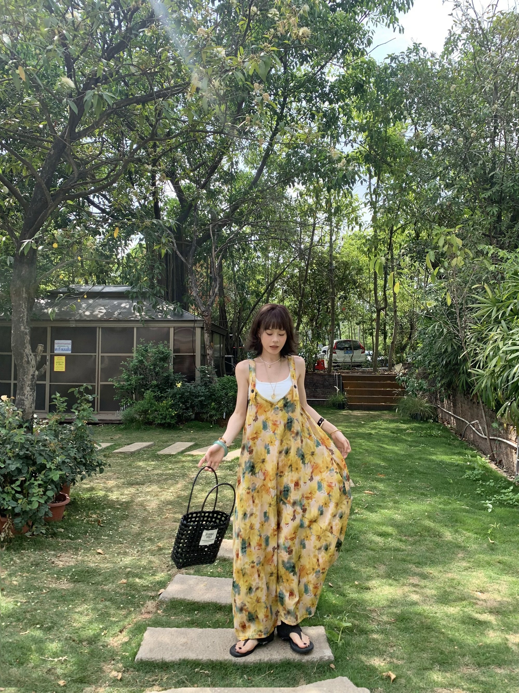 【商品名】【ボトムス】夏新作 アート染め油絵風 ゆったりレトロ Vネック 気質スタイルオールインワン 【SHシリーズ】