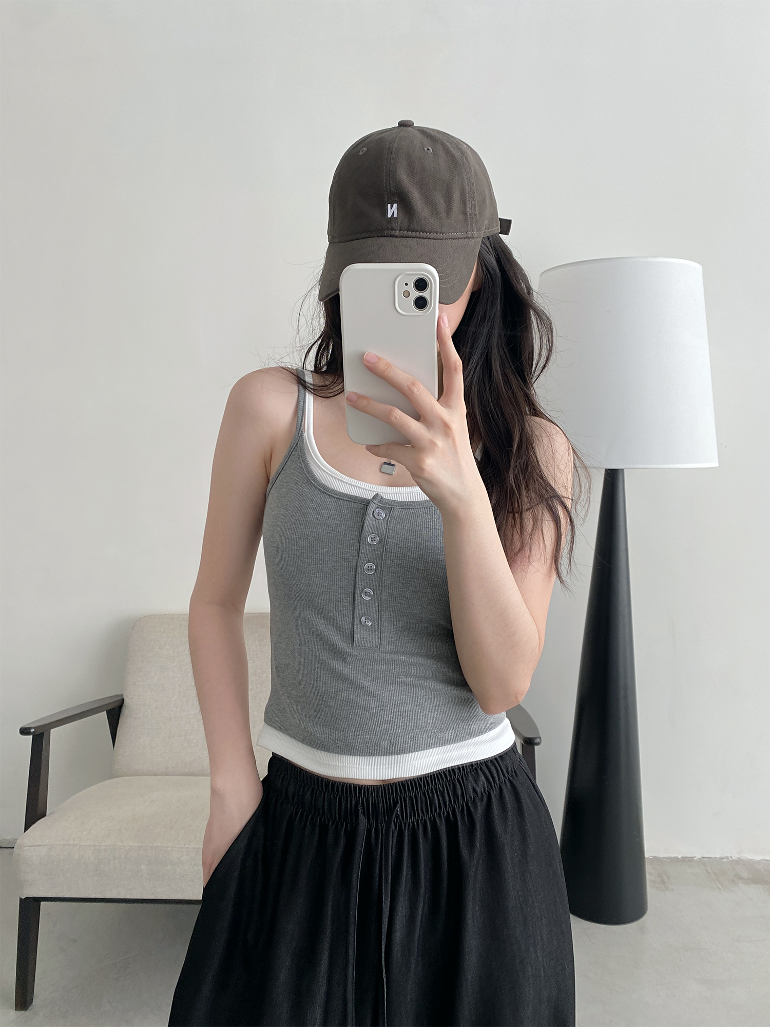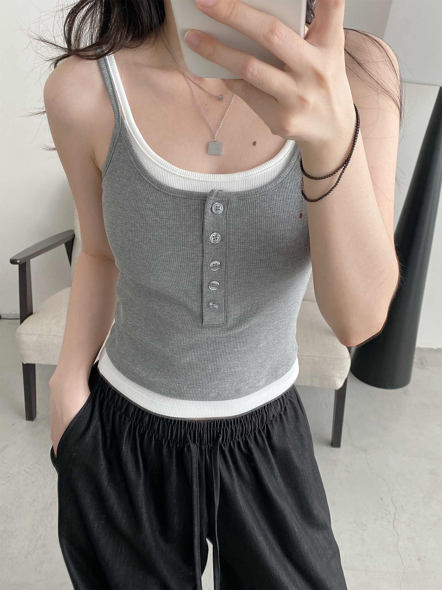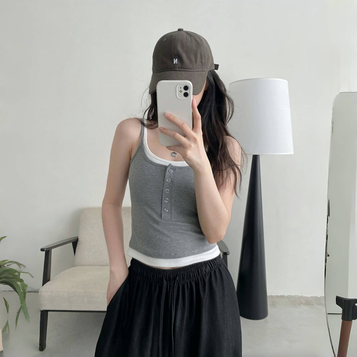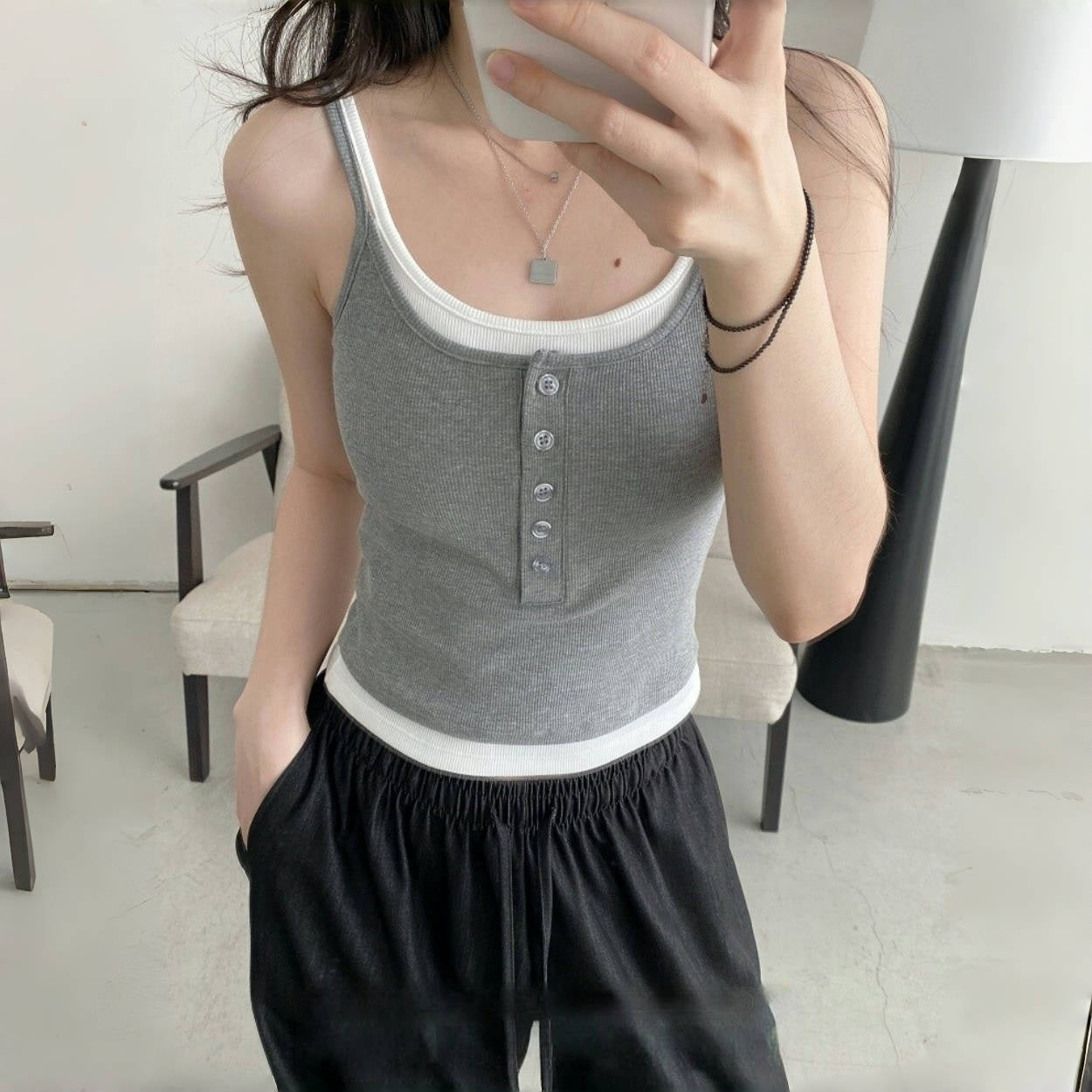 【トップス】夏 フェイクレイヤード パッド付き 着痩せ効果 タンクトップ 【FCシリーズ】
