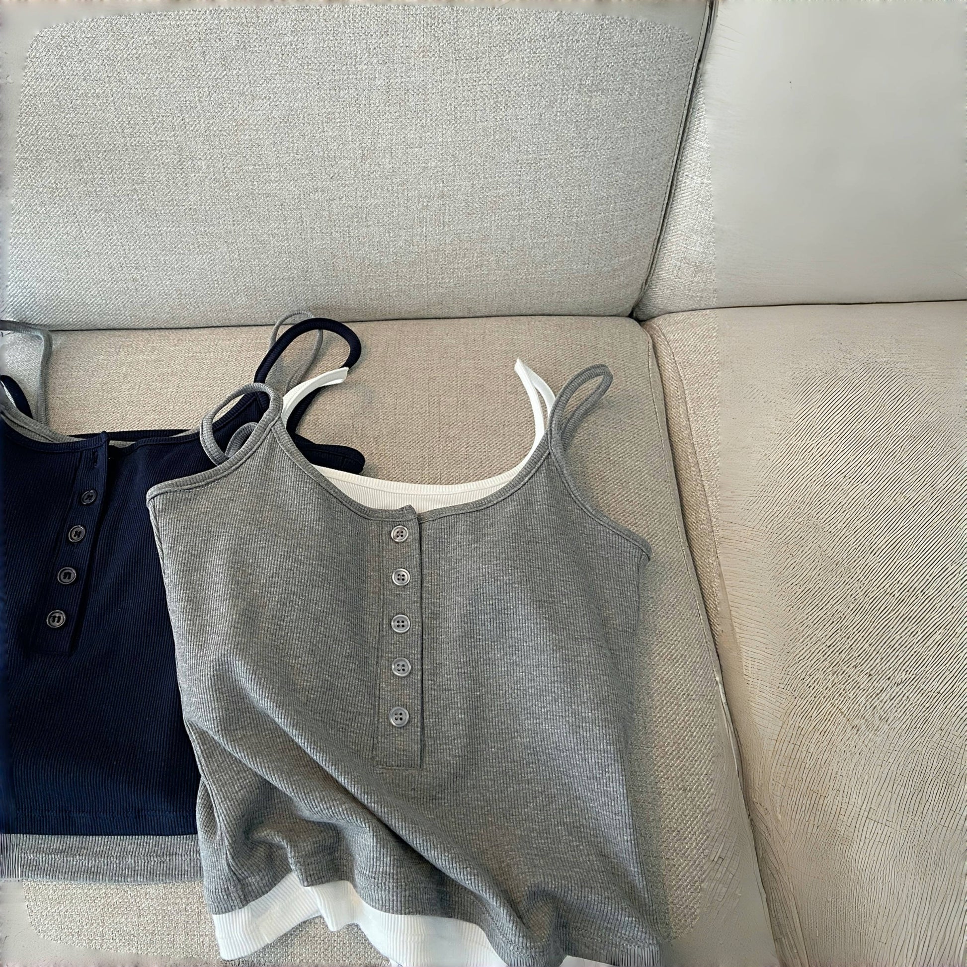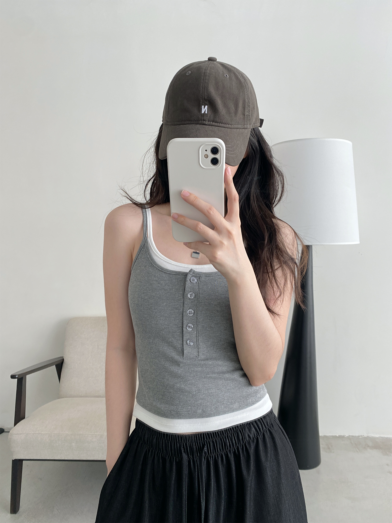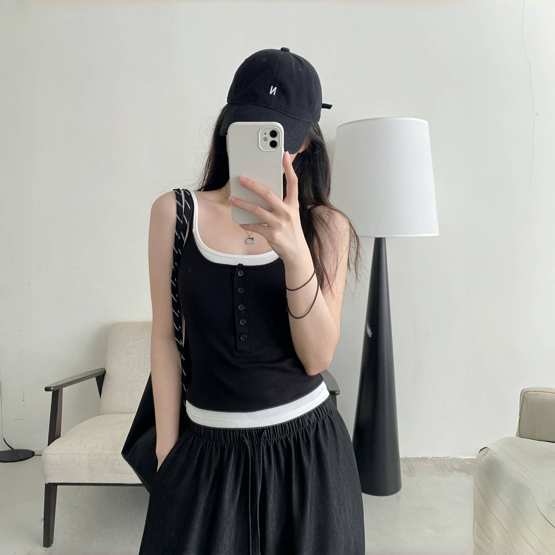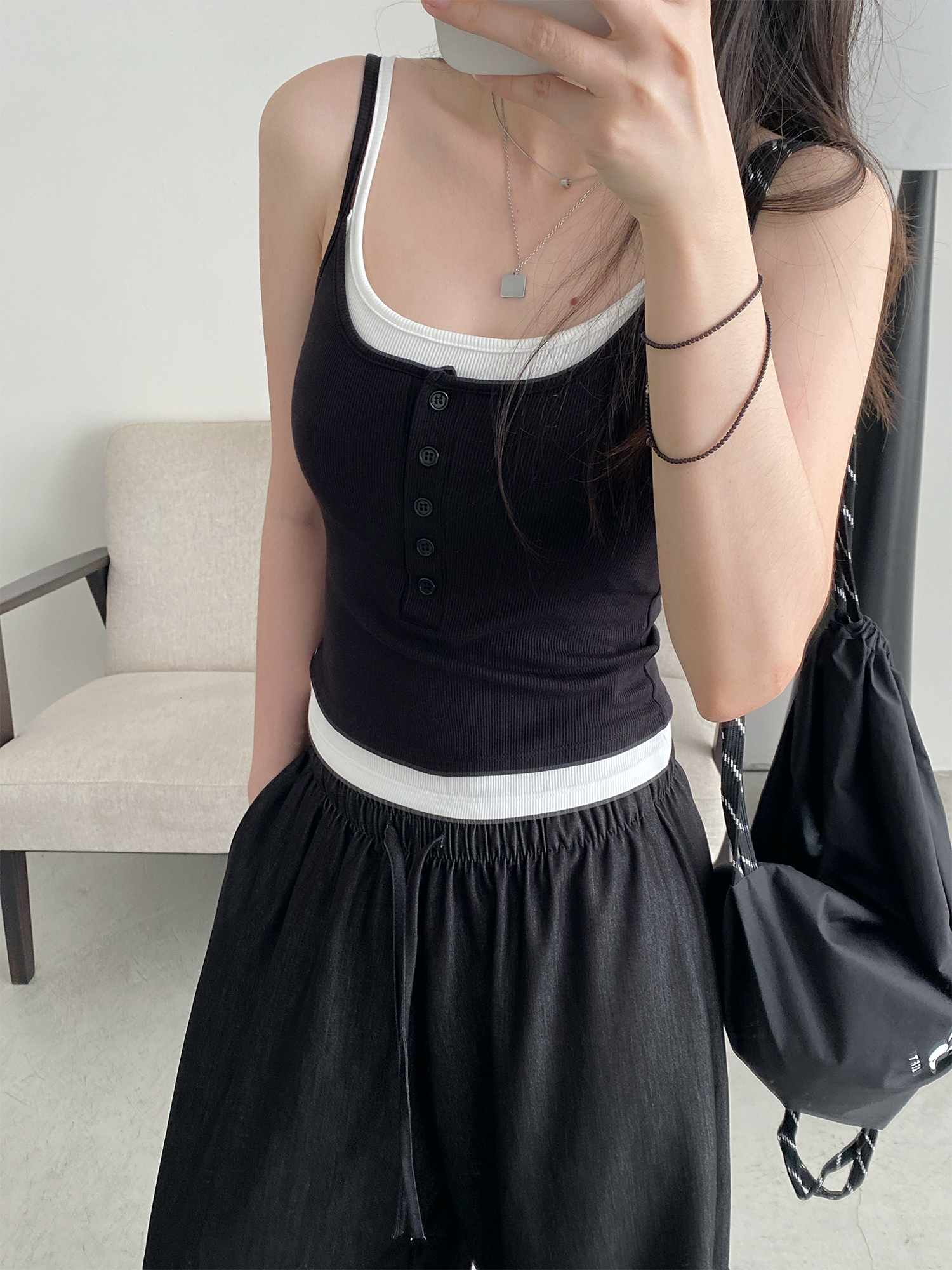 【トップス】夏 フェイクレイヤード パッド付き 着痩せ効果 タンクトップ 【FCシリーズ】