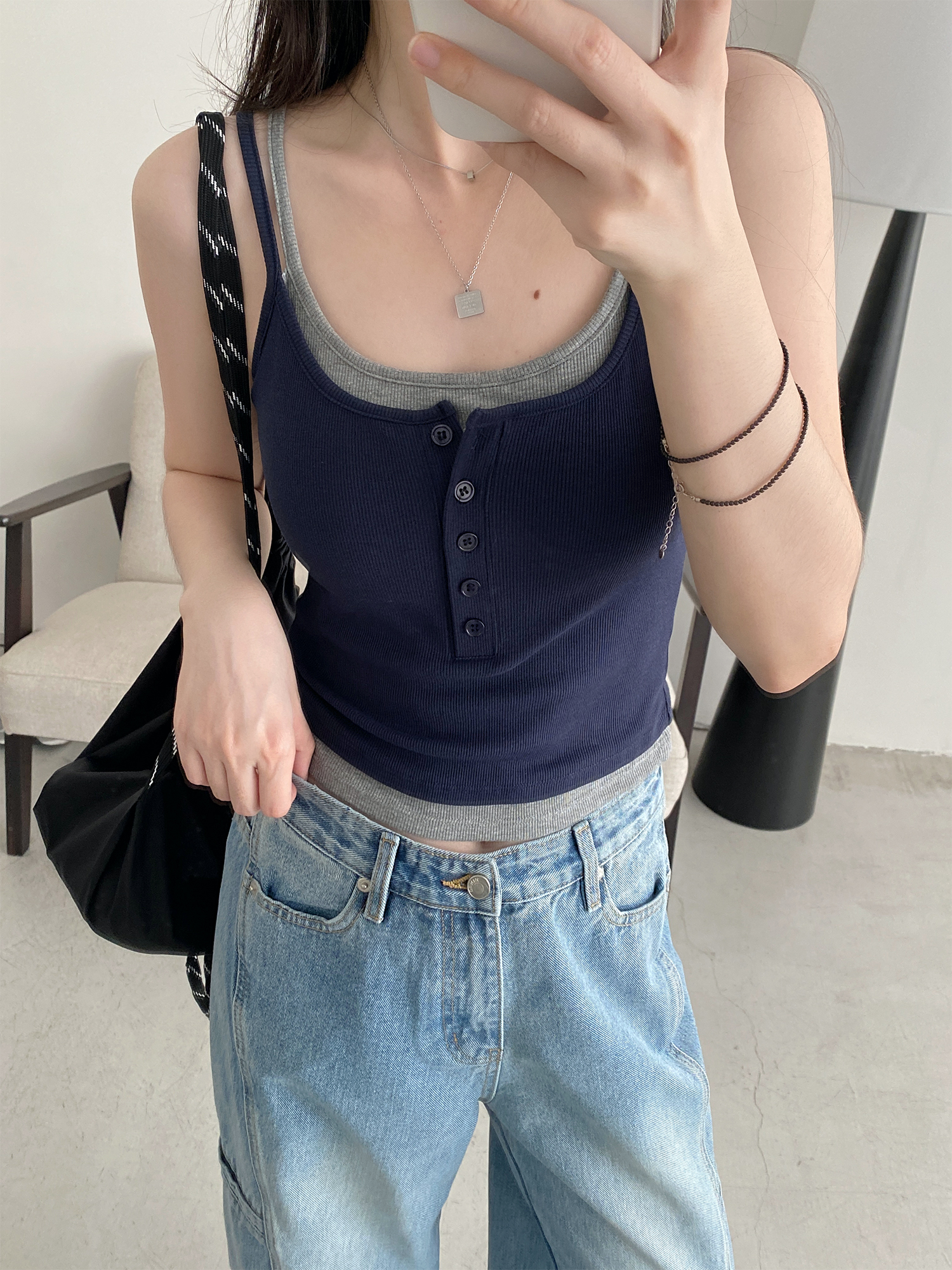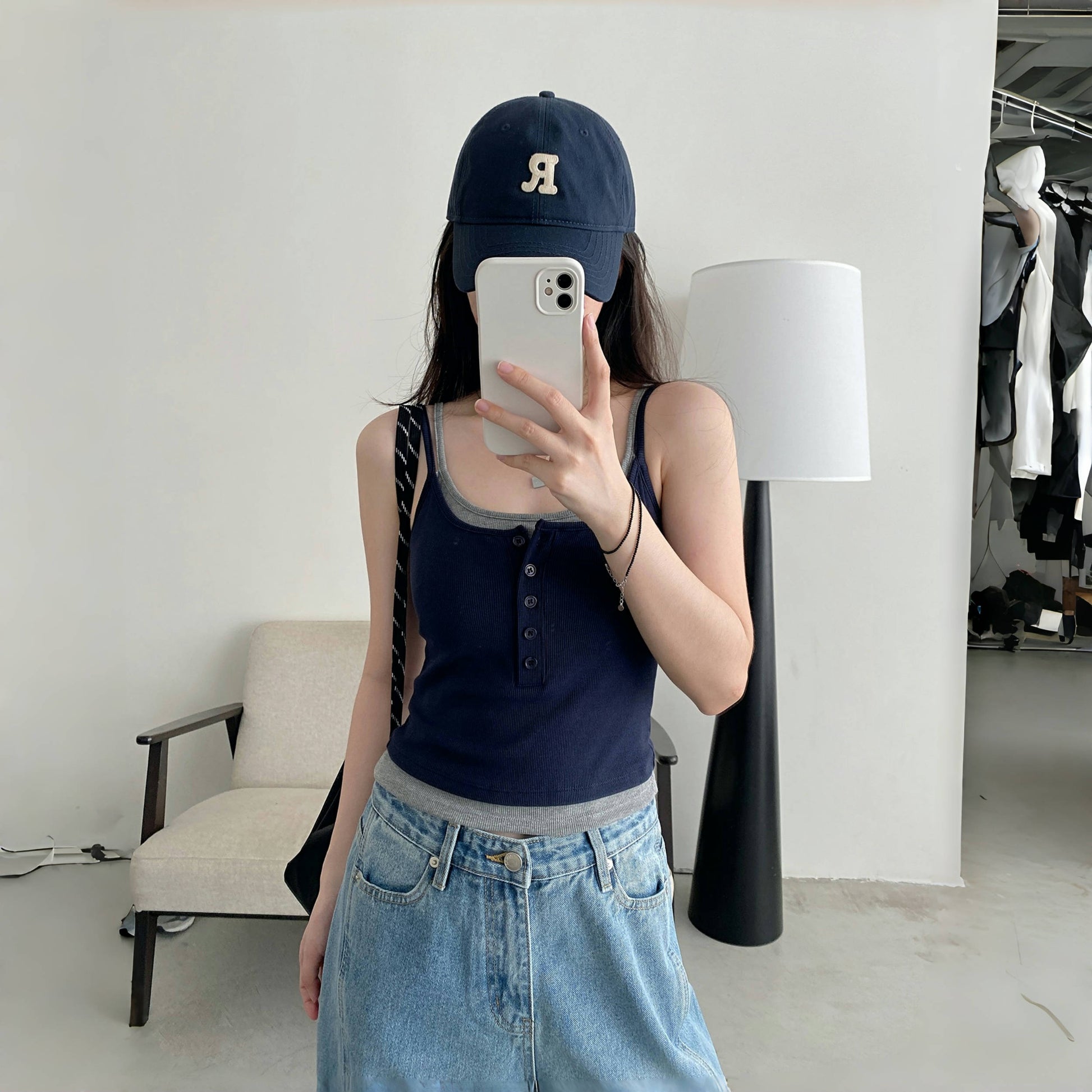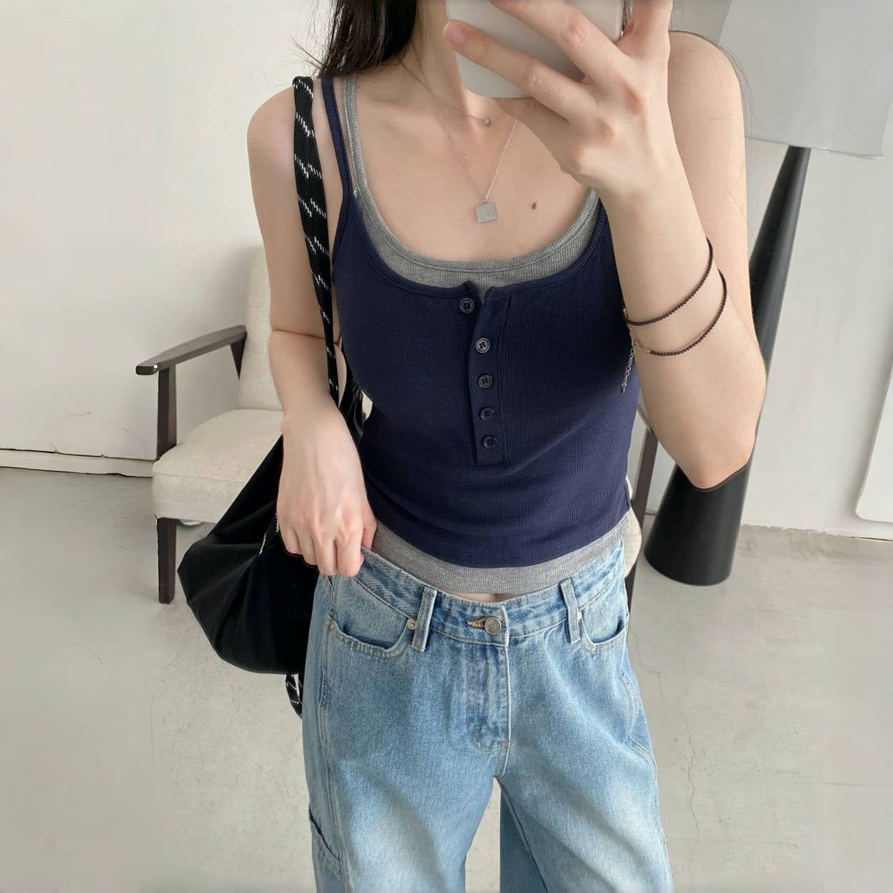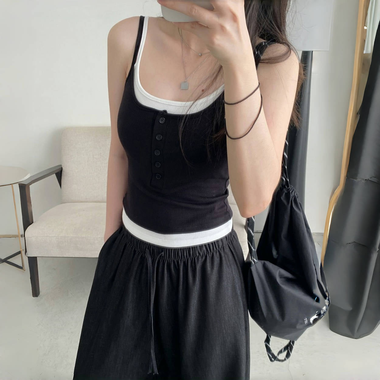 【トップス】夏 フェイクレイヤード パッド付き 着痩せ効果 タンクトップ 【FCシリーズ】