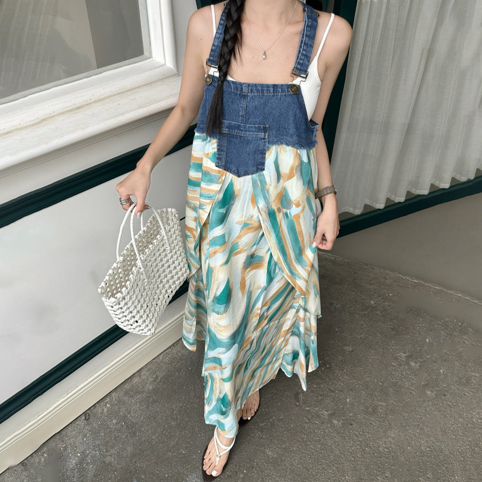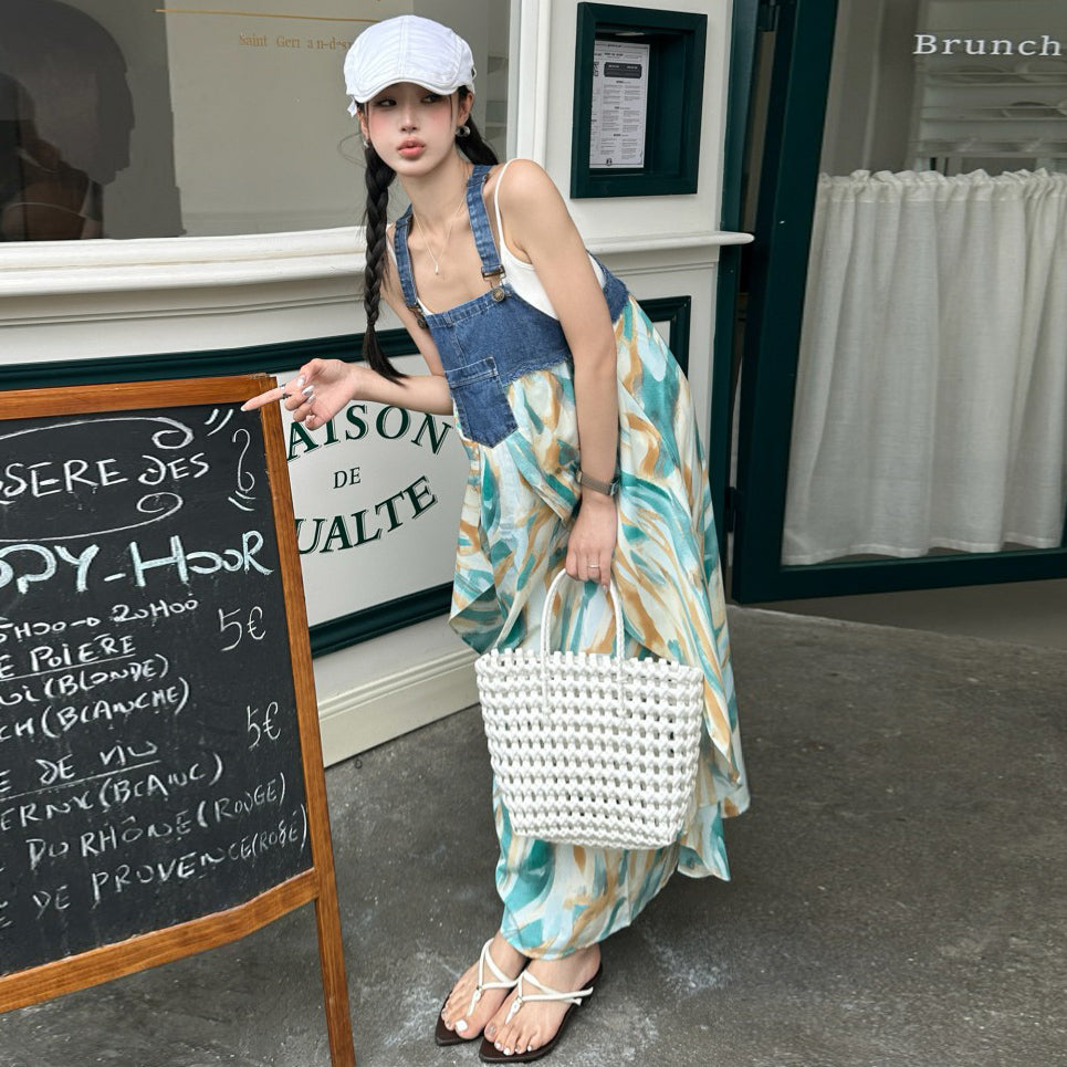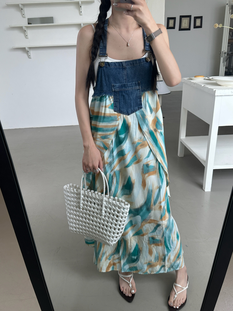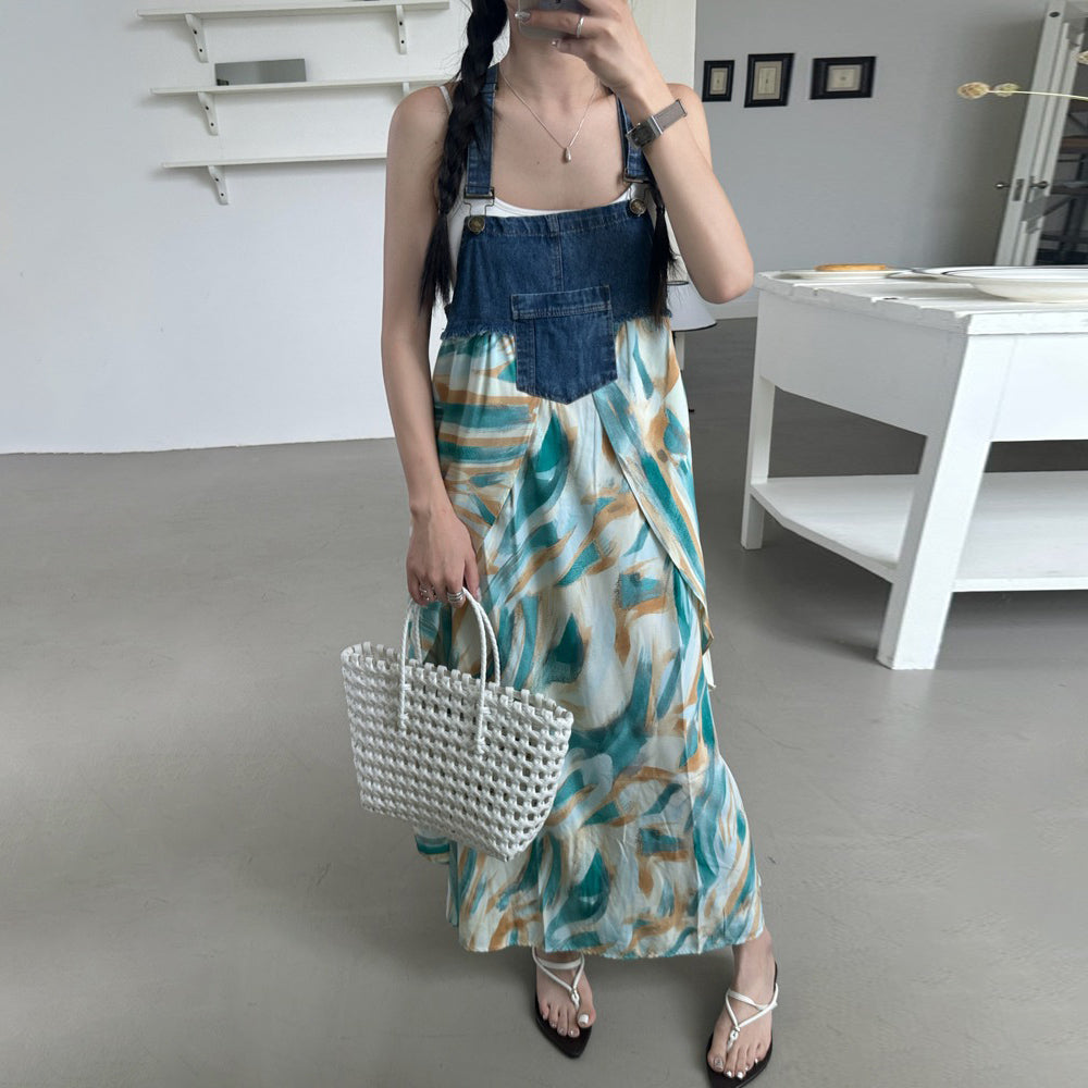 【ワンピース】夏新作 デザイン感たっぷり デニム切り替え シフォン花柄ノースリーブワンピース【SHシリーズ】