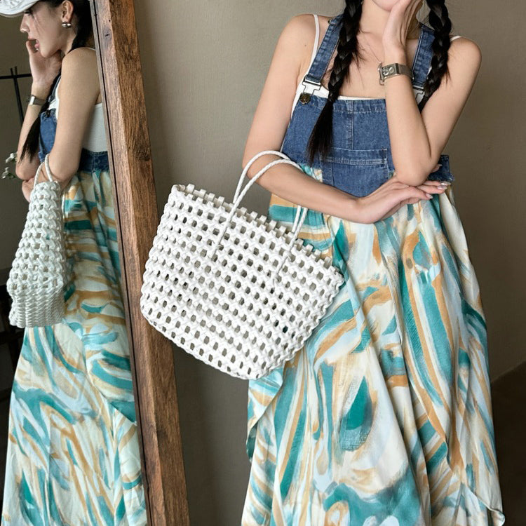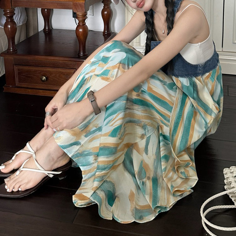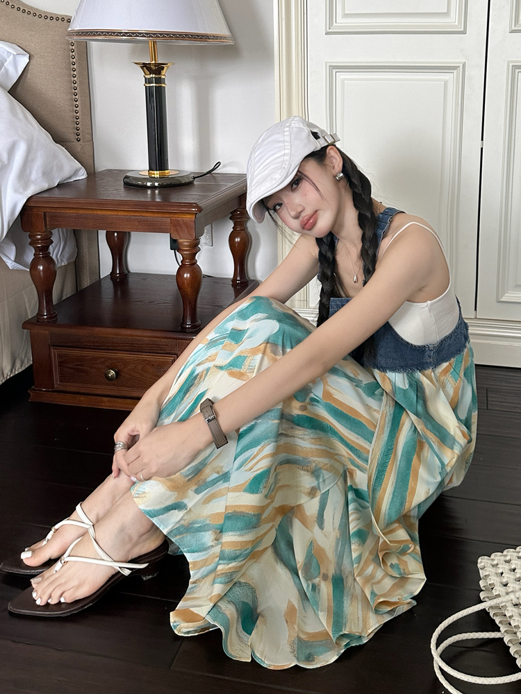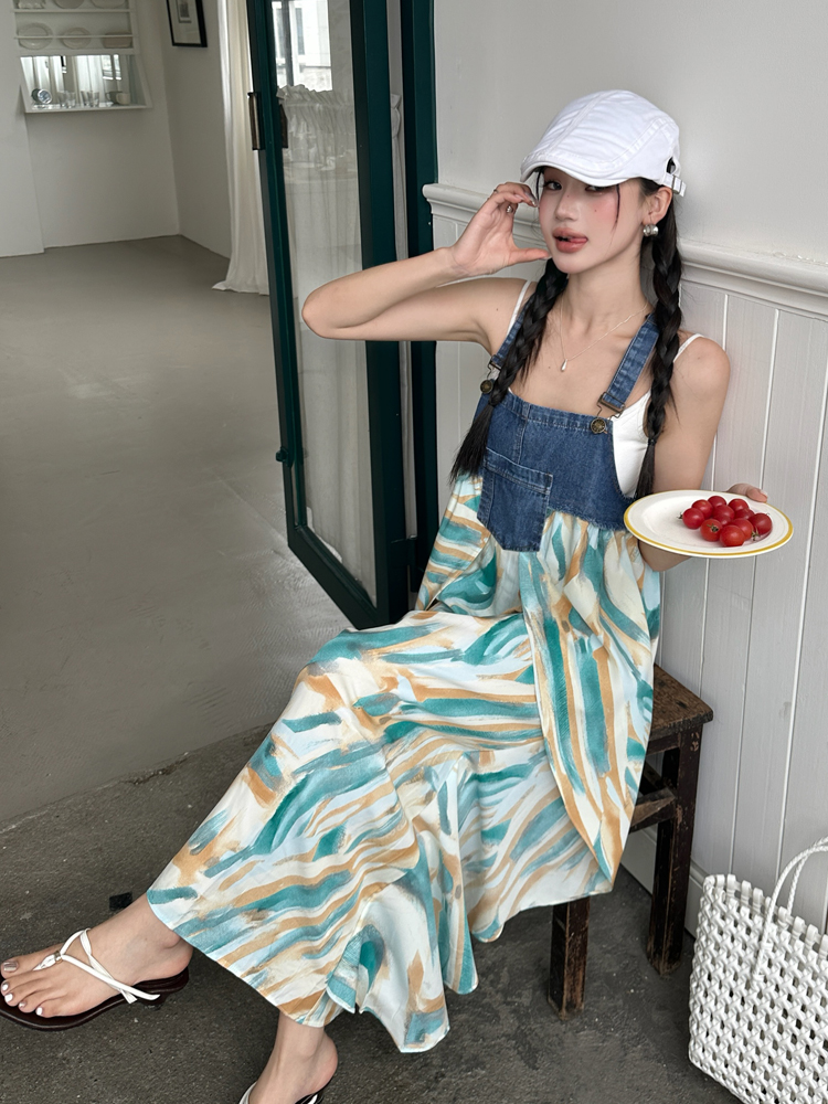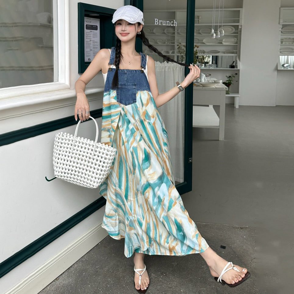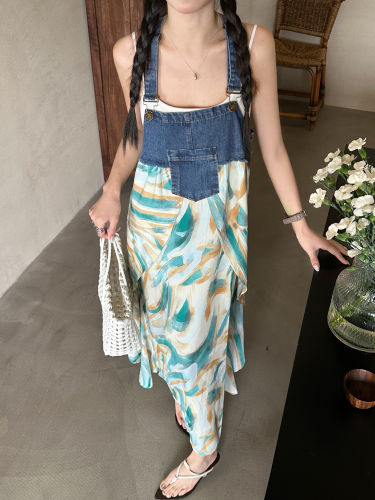 【ワンピース】夏新作 デザイン感たっぷり デニム切り替え シフォン花柄ノースリーブワンピース【SHシリーズ】