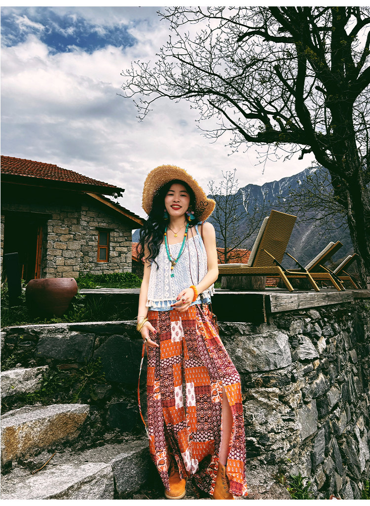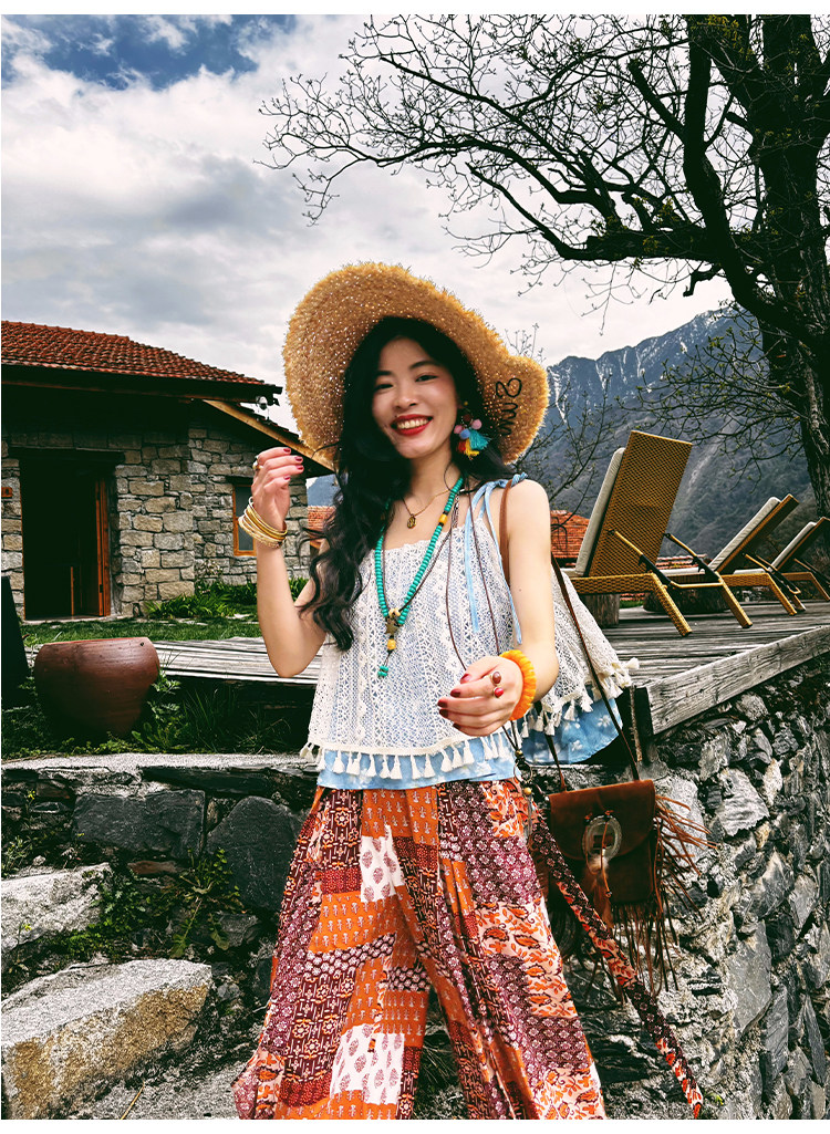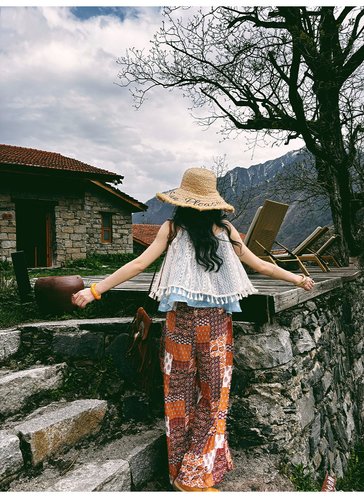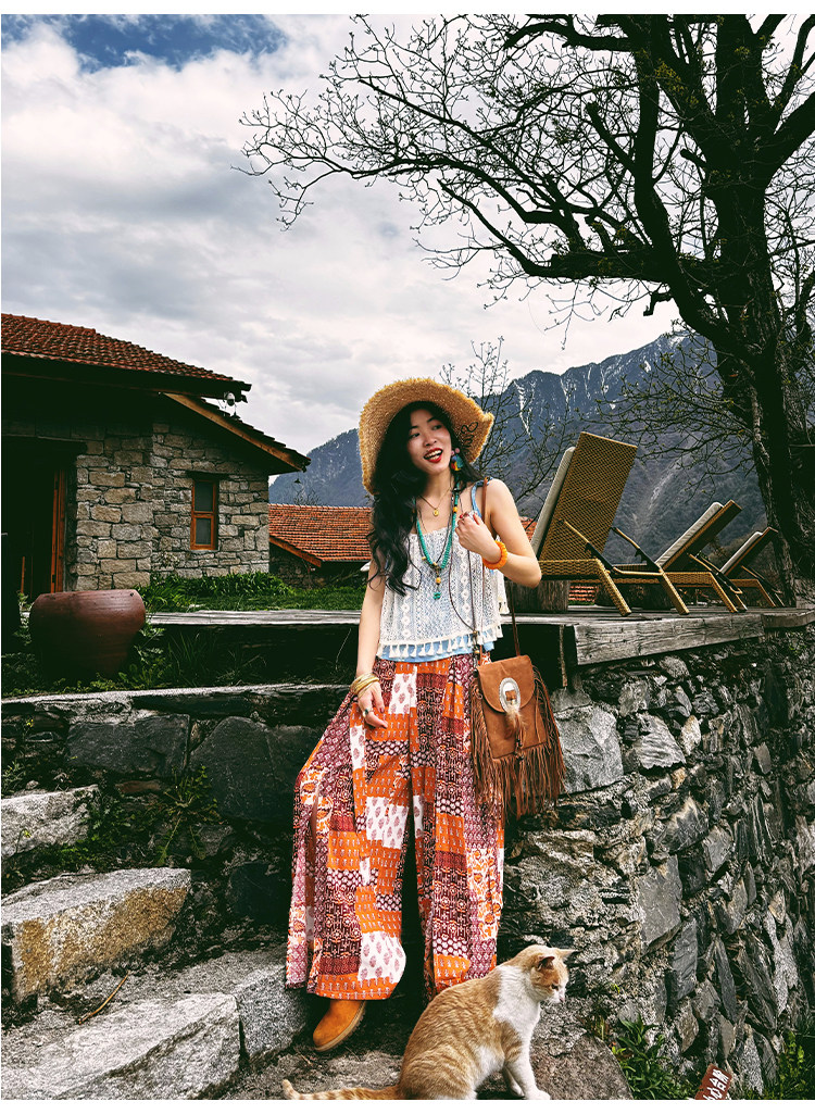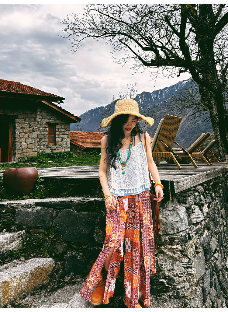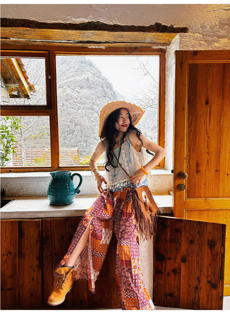 【単品注文】【セットアップ】夏新作 民族風タンクトップ+花柄ハイウエストスリットワイドパンツ 上下セット【SHシリーズ】
