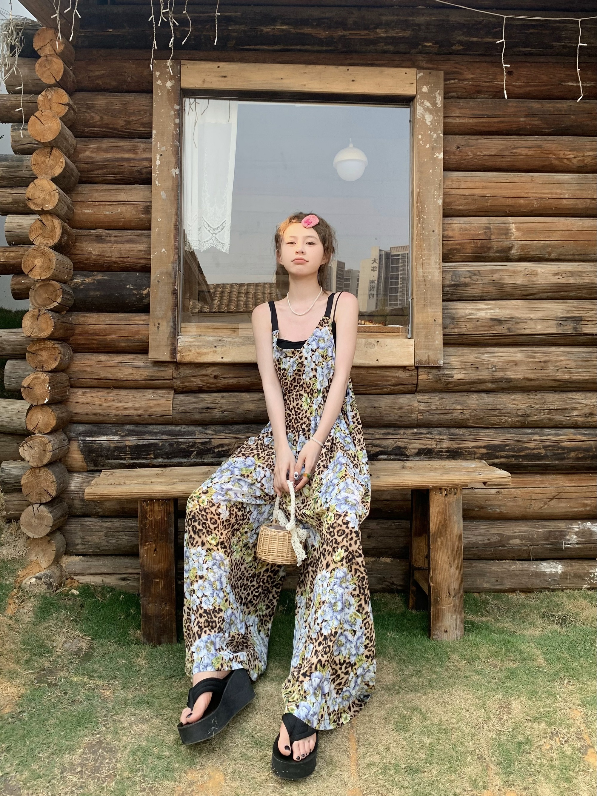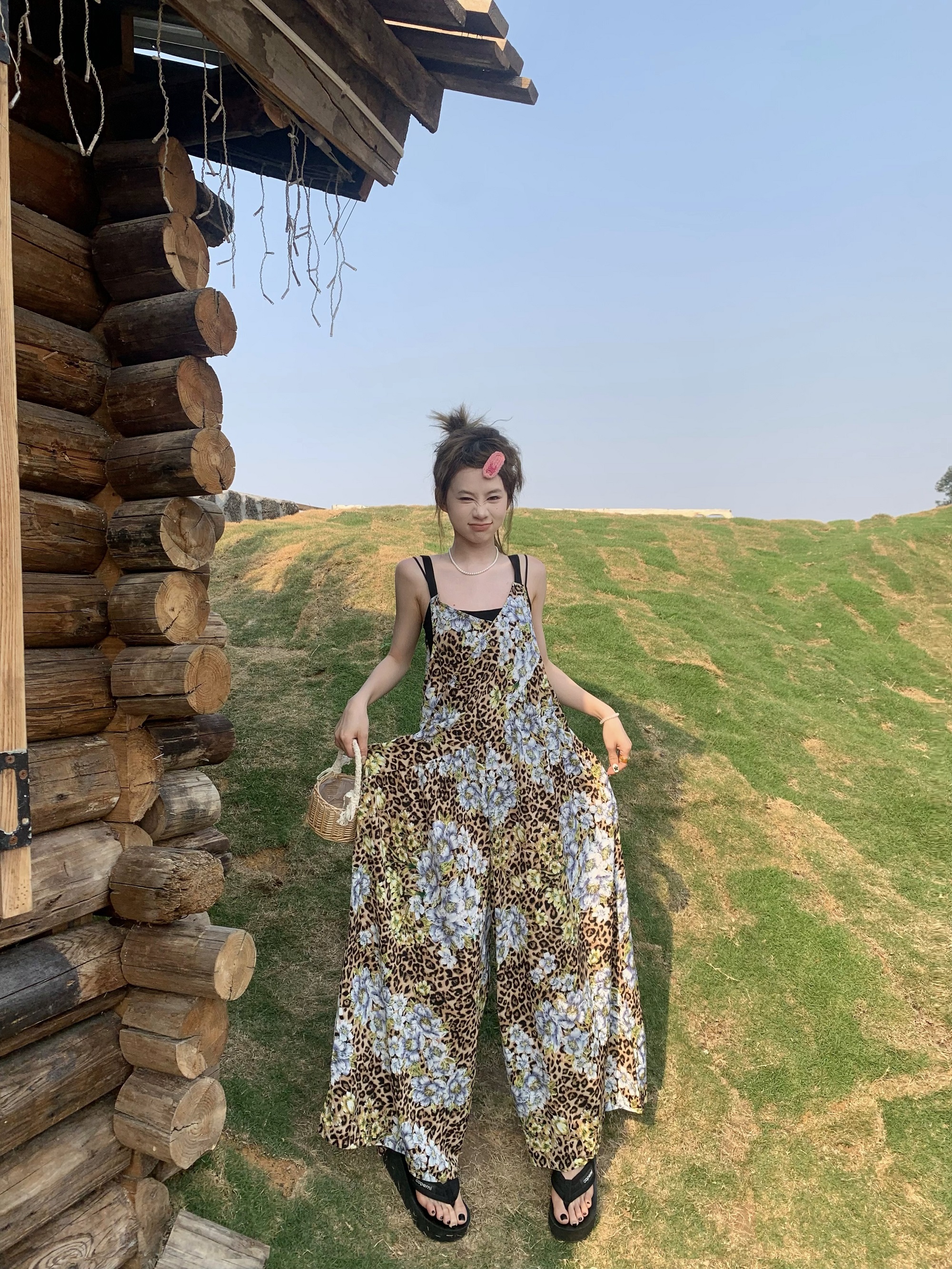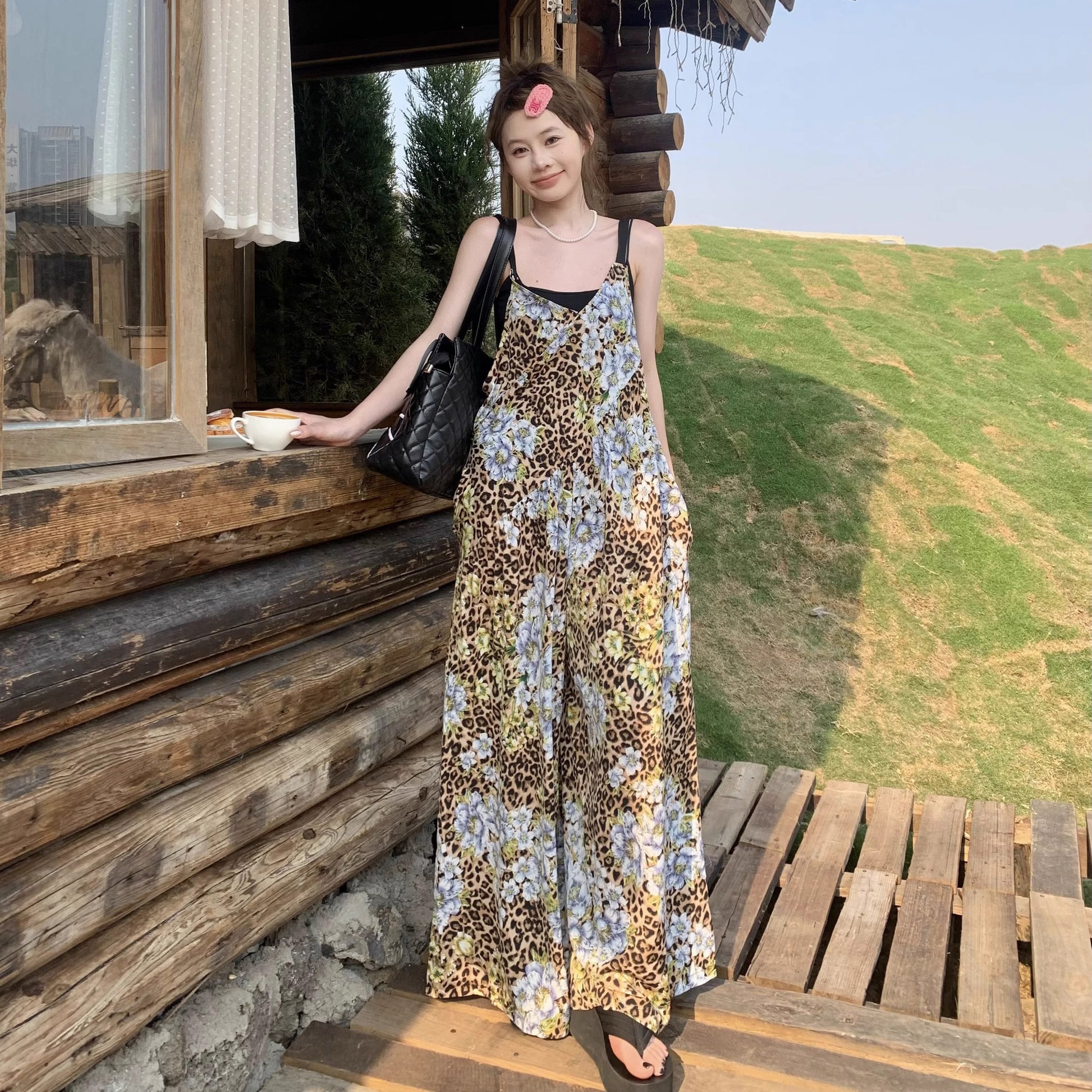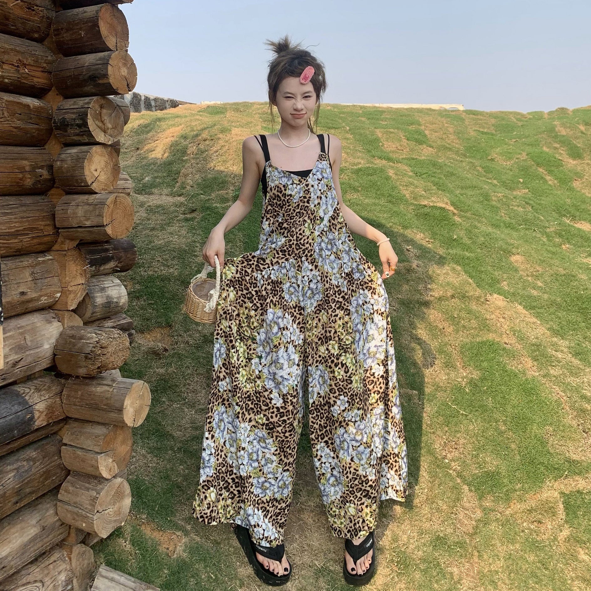 【ボトムス】夏新作 優雅に揺れる 雪青フラワー柄 オーバーサイズサロペット オールインワン【SHシリーズ】
