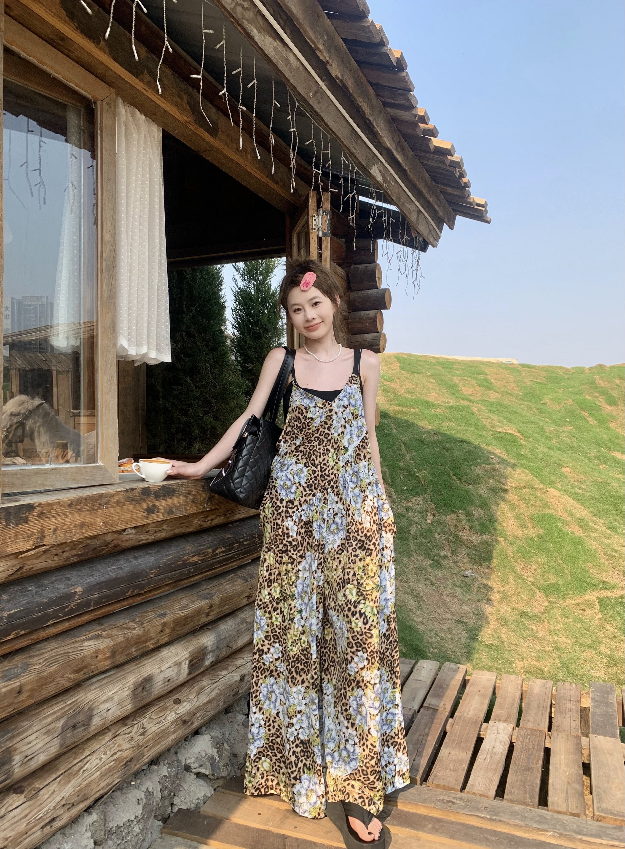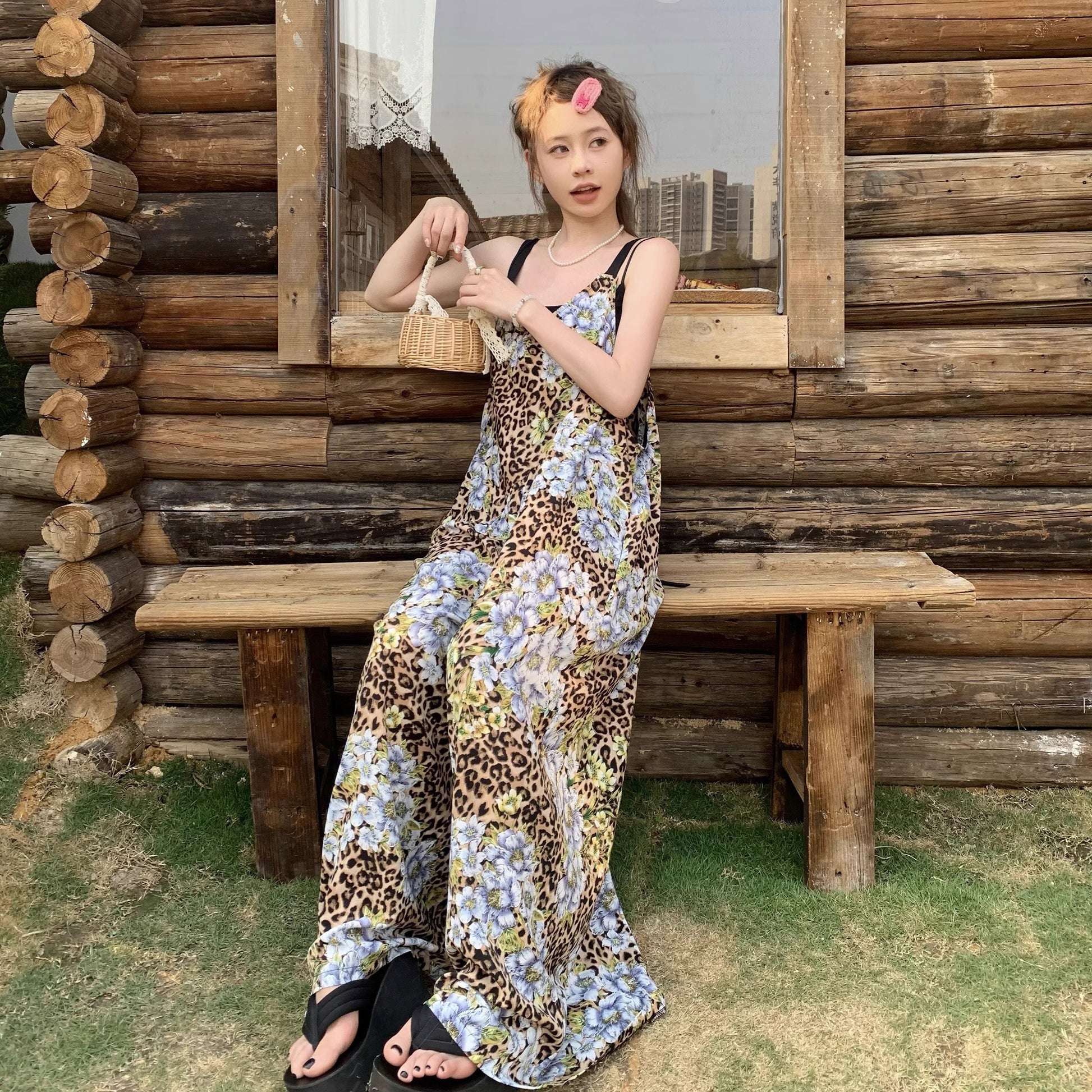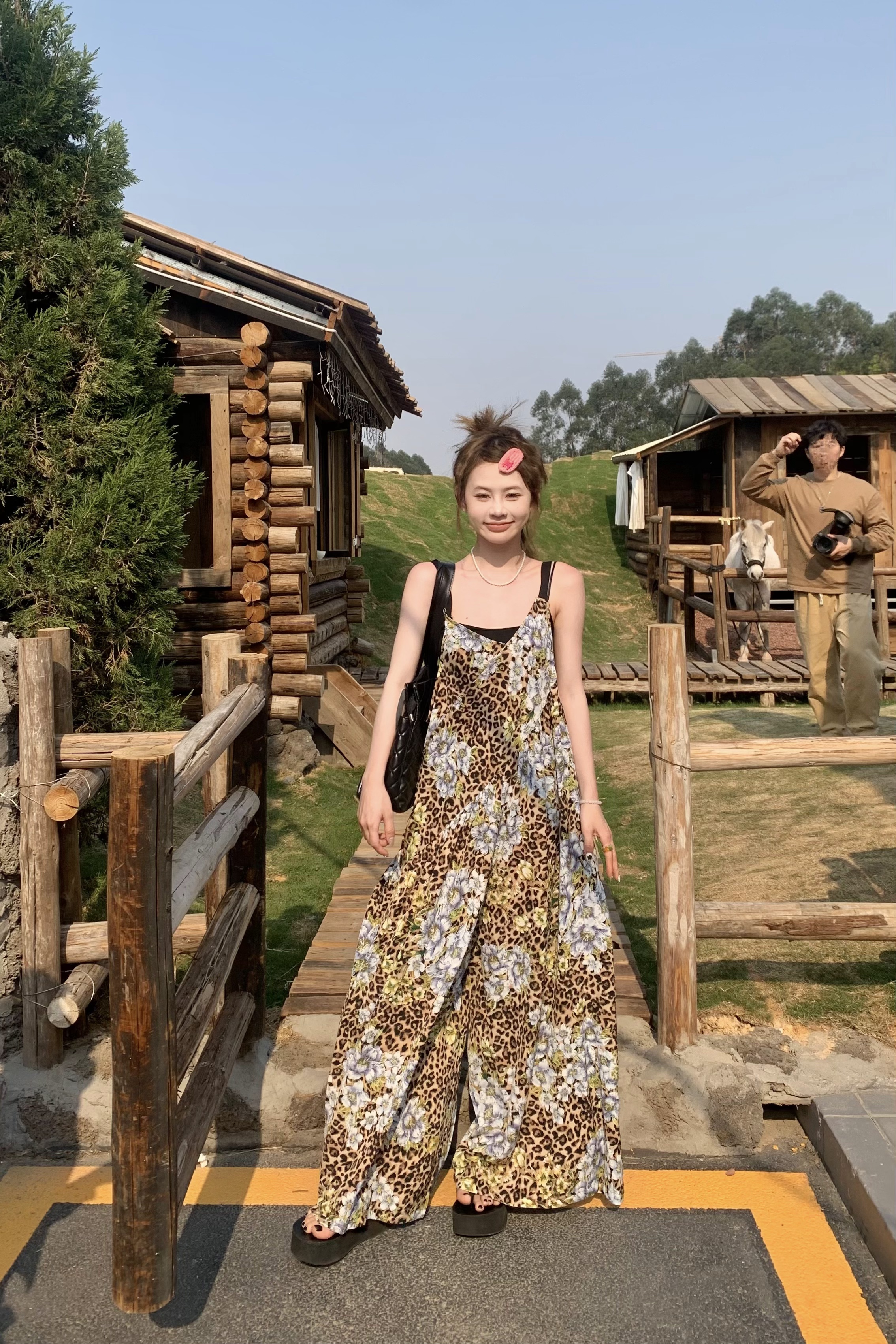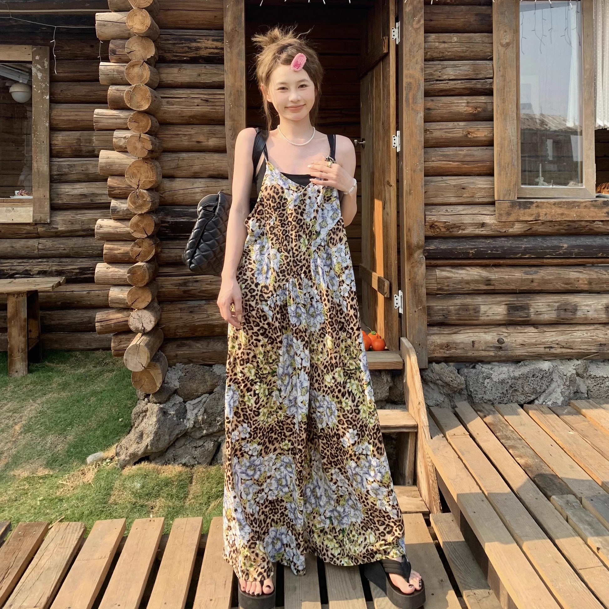 【ボトムス】夏新作 優雅に揺れる 雪青フラワー柄 オーバーサイズサロペット オールインワン【SHシリーズ】