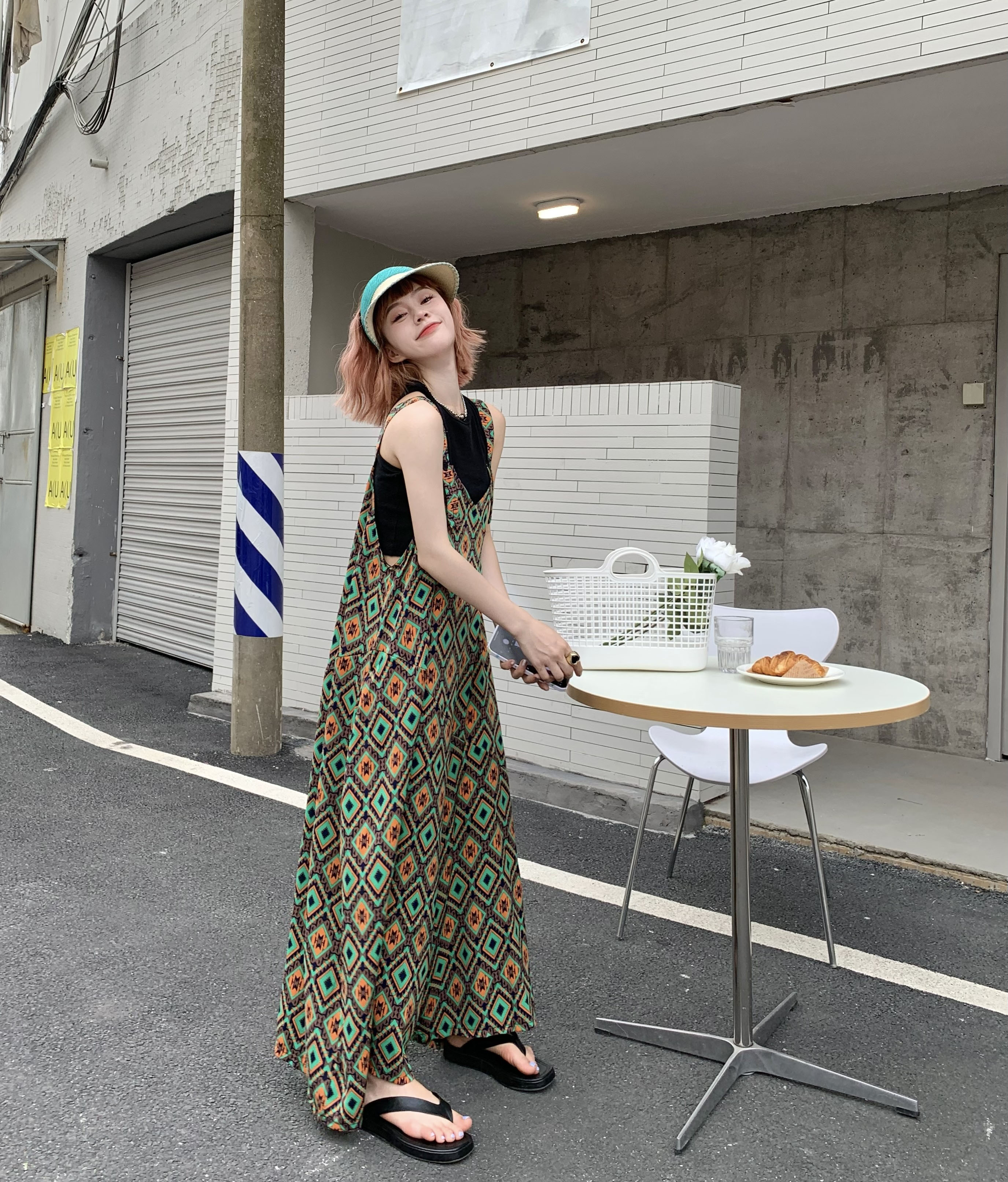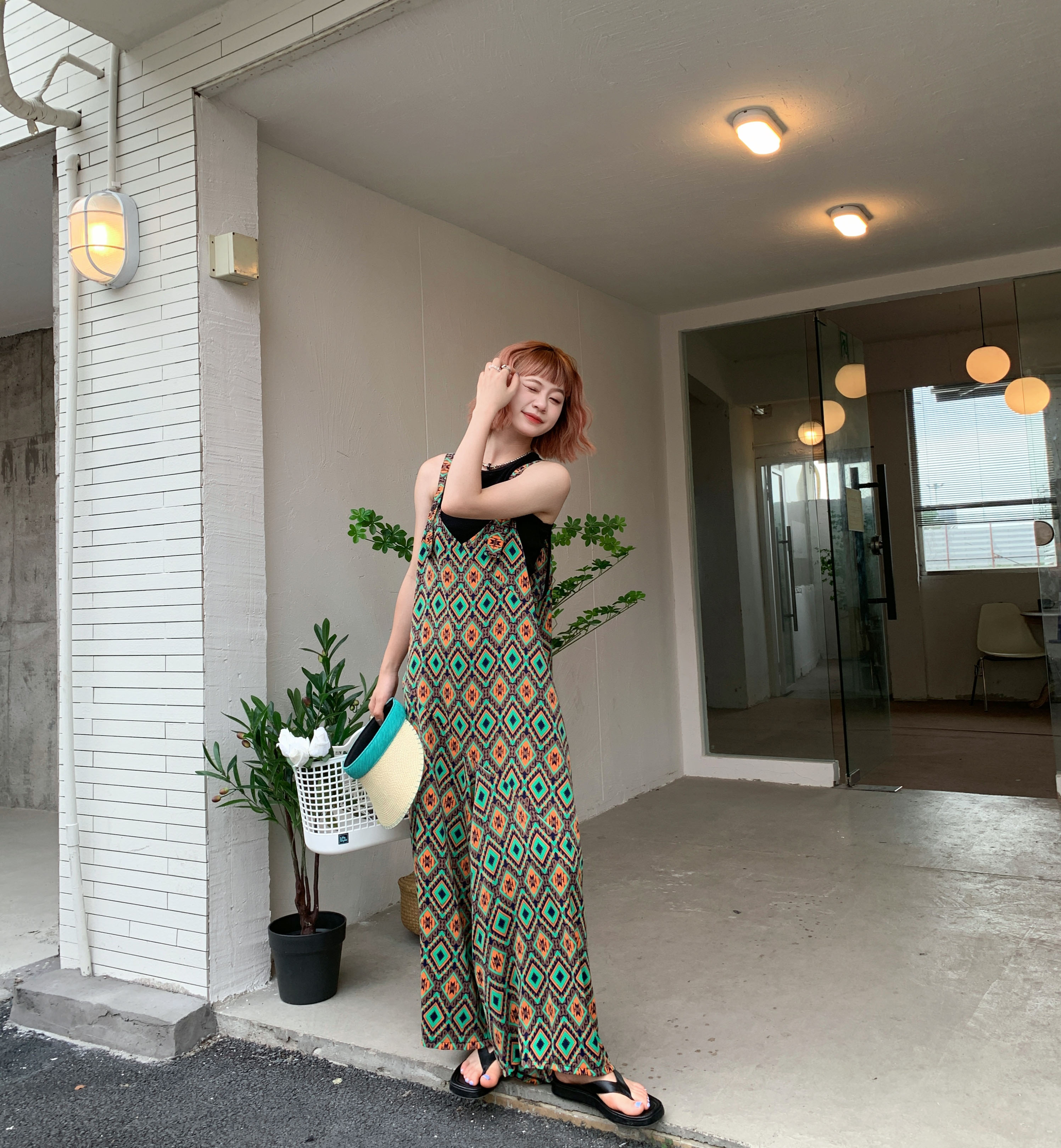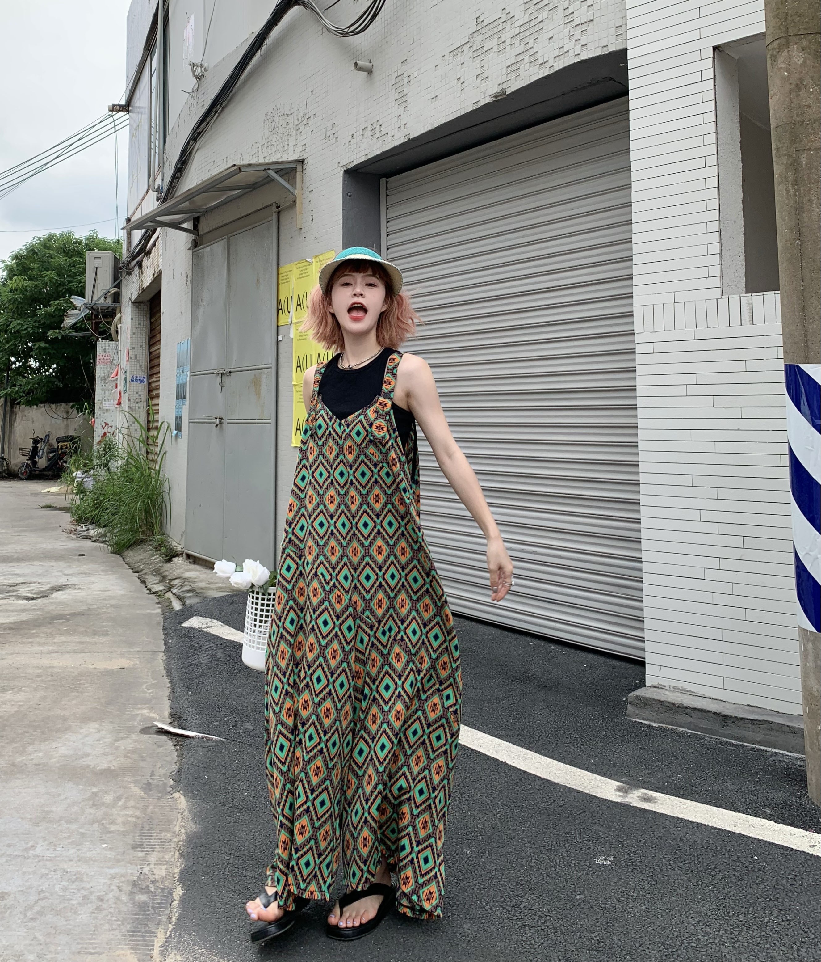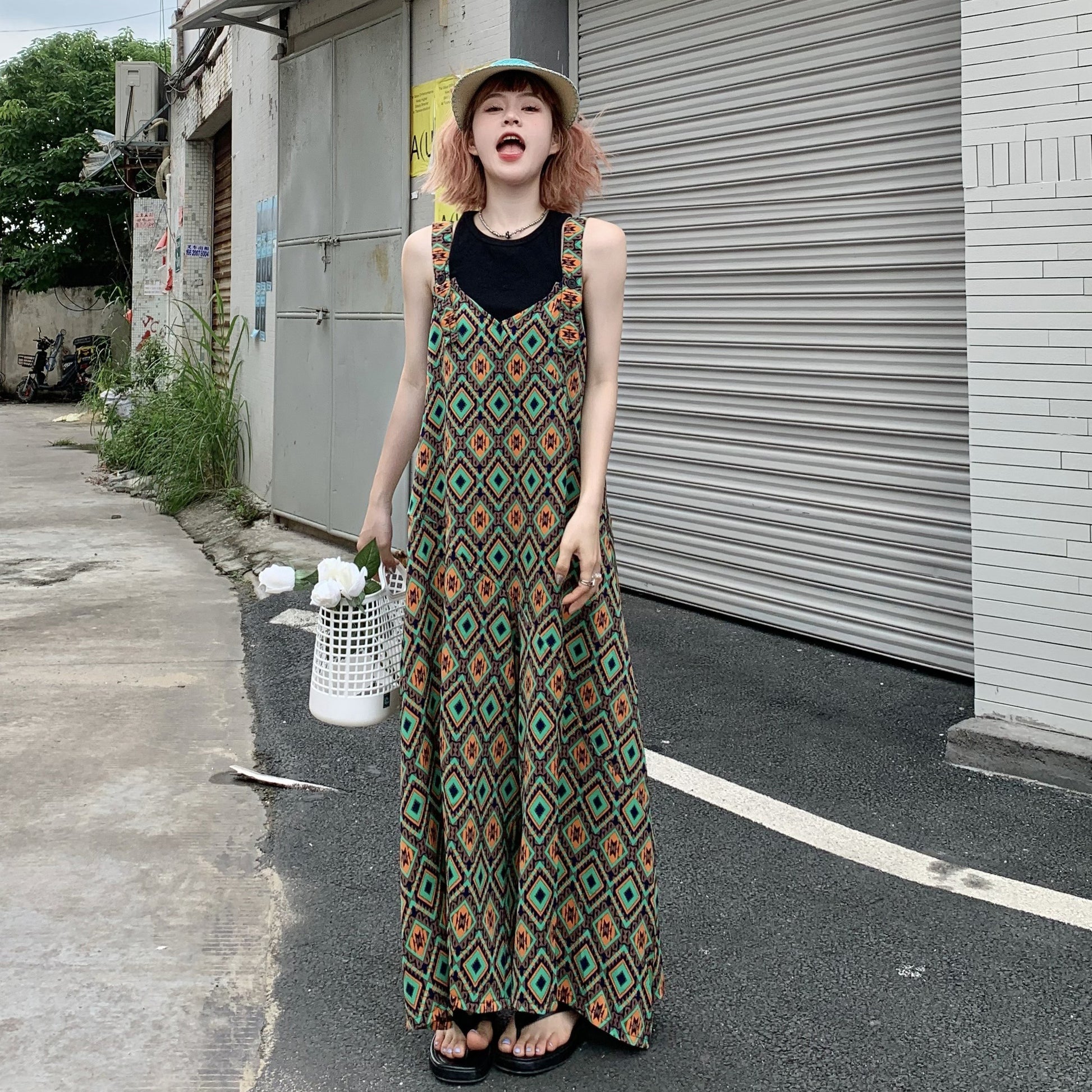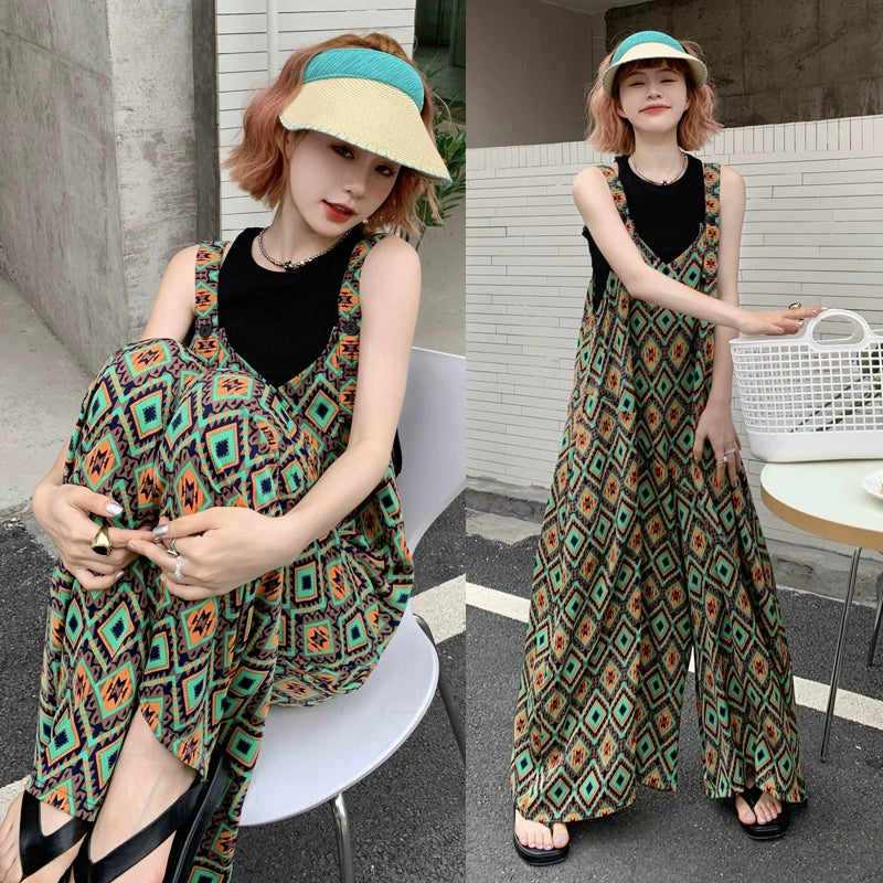 【ボトムス】夏新作 文芸ムードたっぷり 菱形チェック柄 オーバーサイズサロペットスカンツ オールインワン【SHシリーズ】