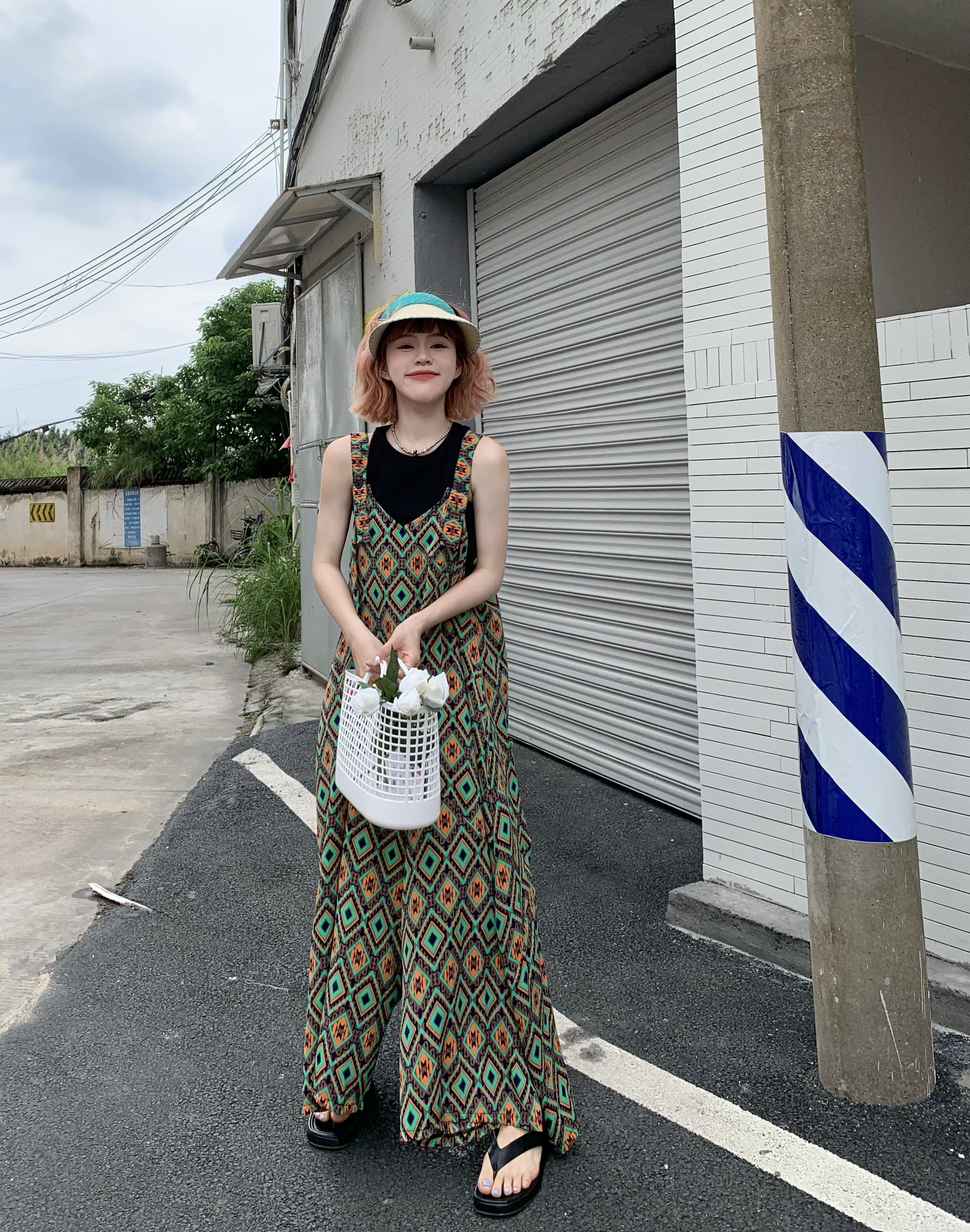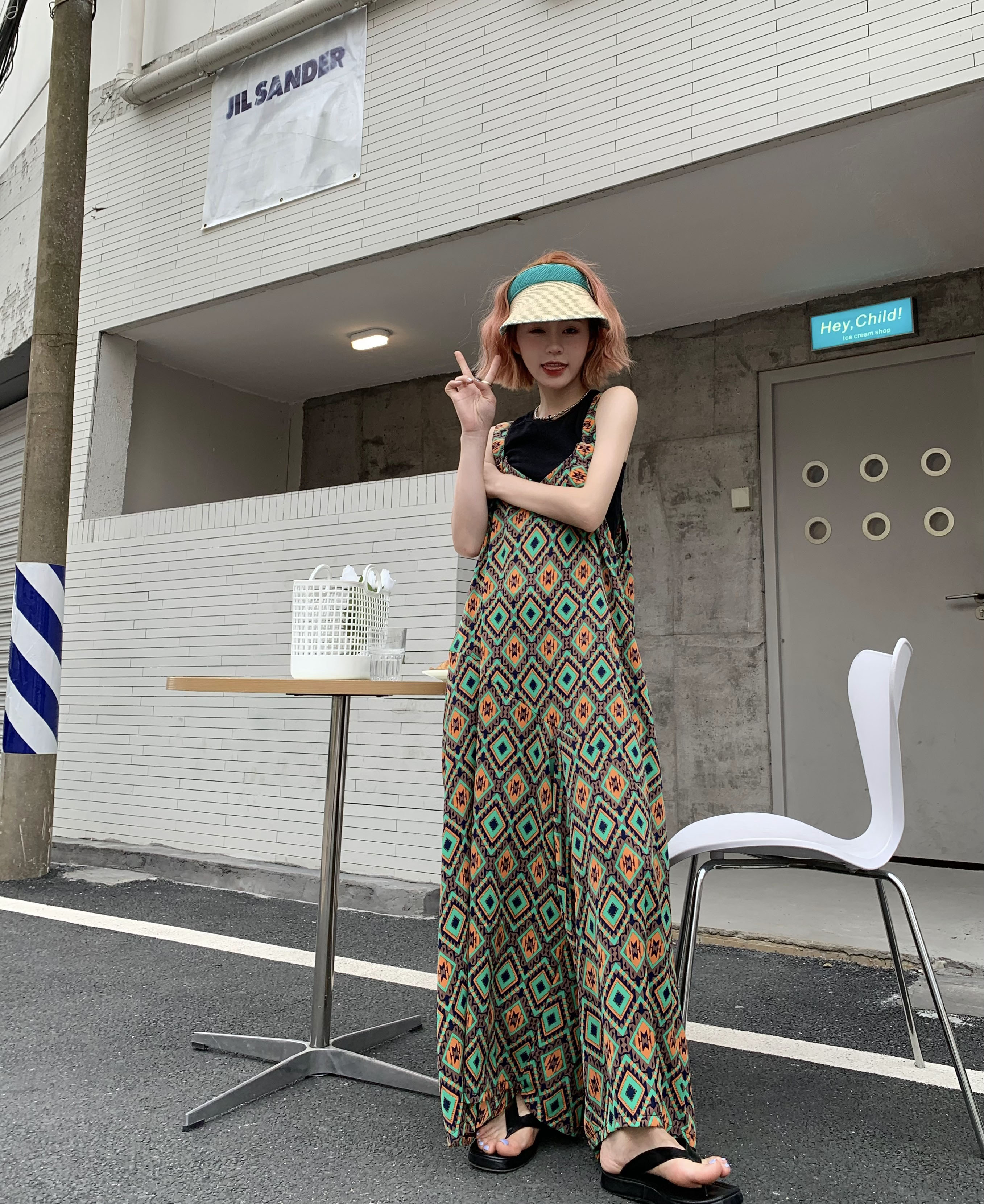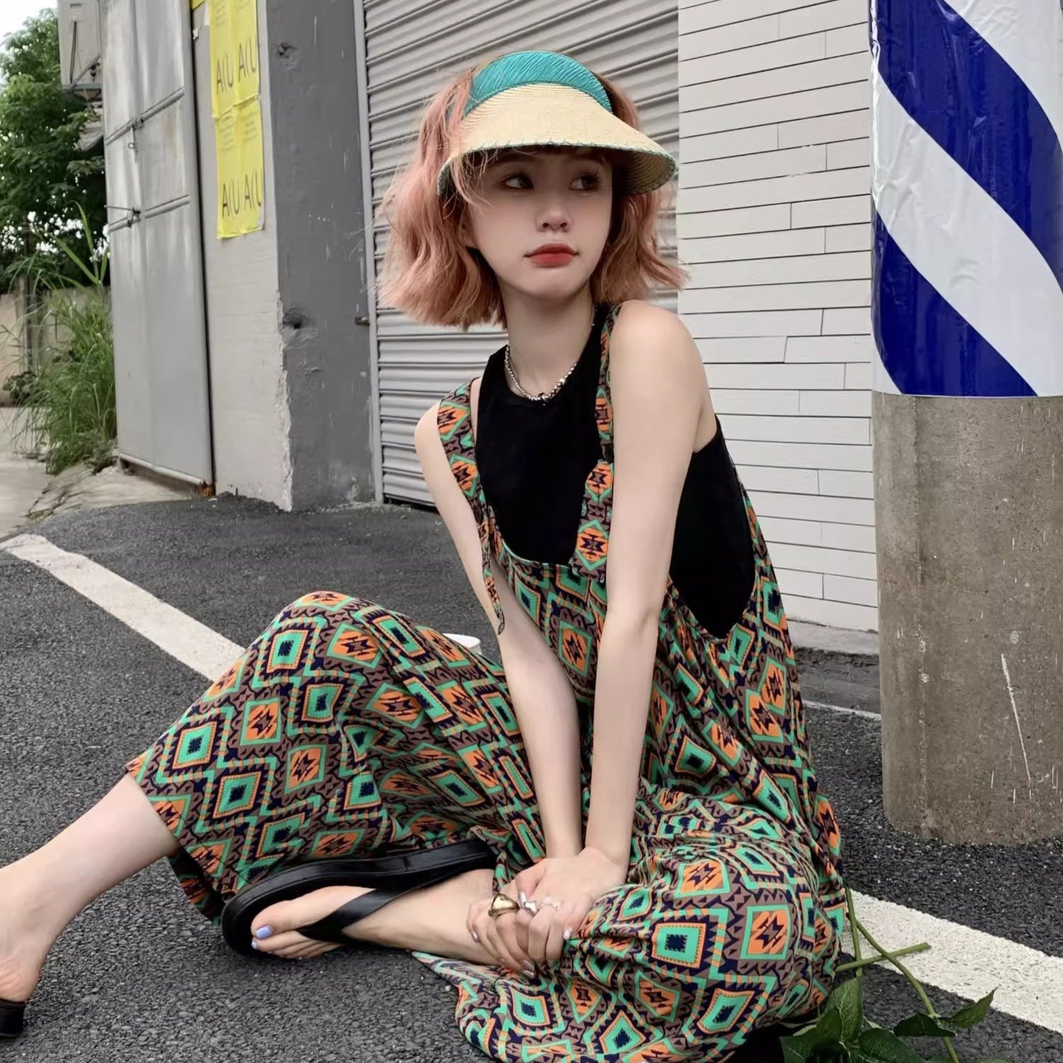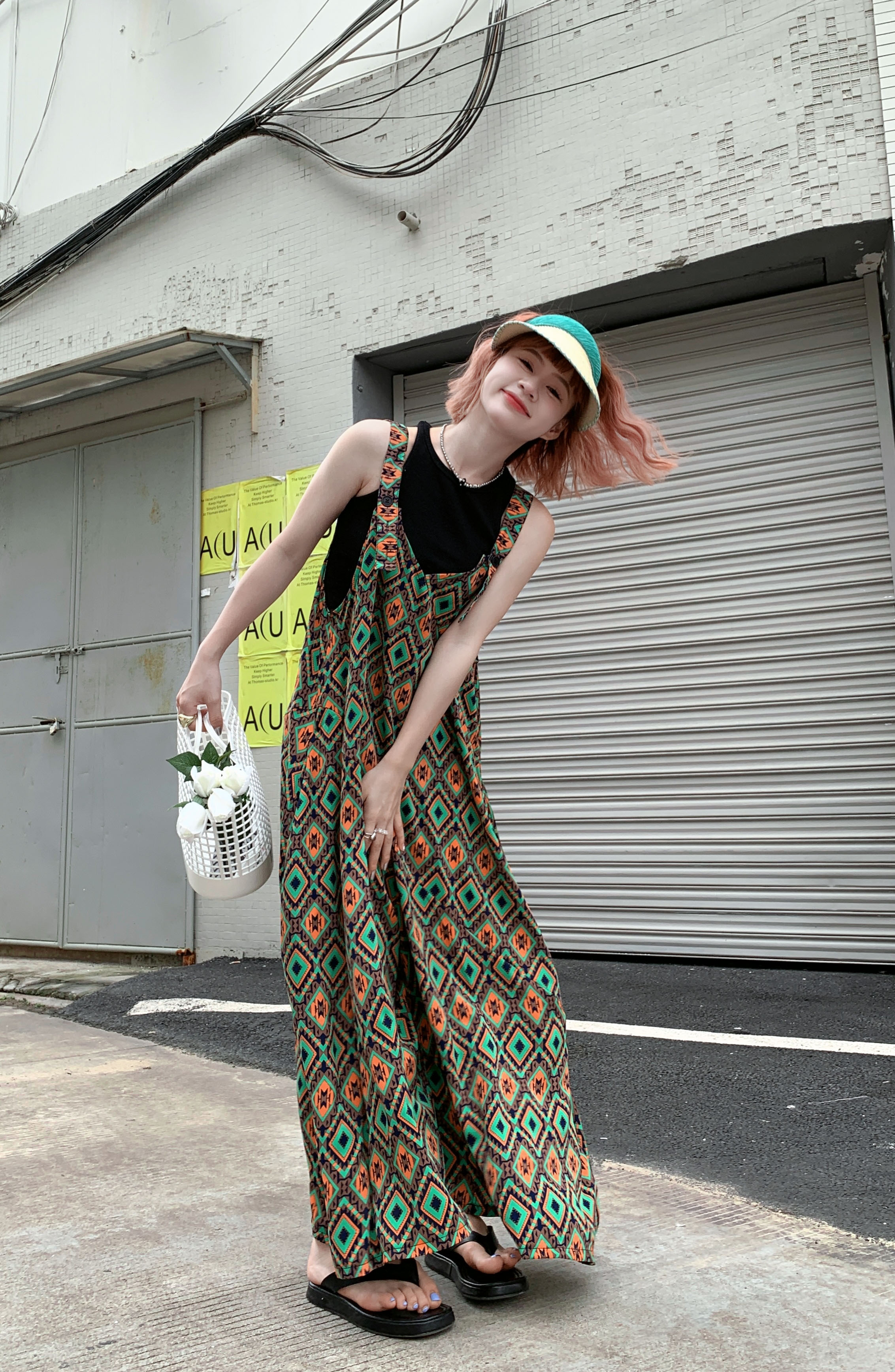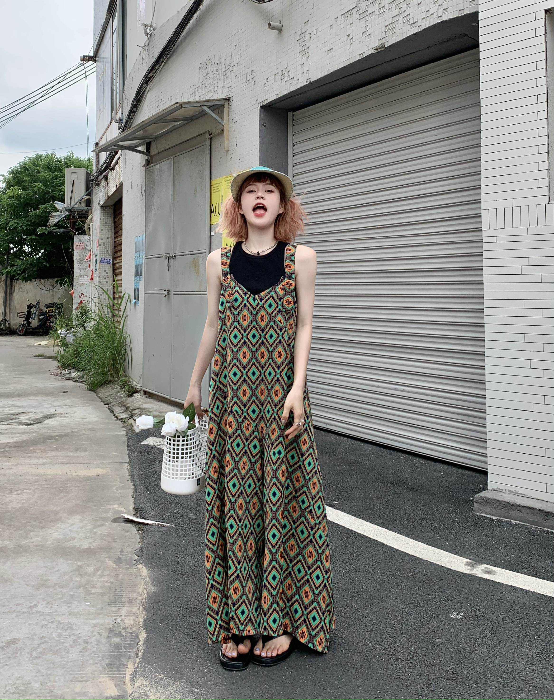 【ボトムス】夏新作 文芸ムードたっぷり 菱形チェック柄 オーバーサイズサロペットスカンツ オールインワン【SHシリーズ】