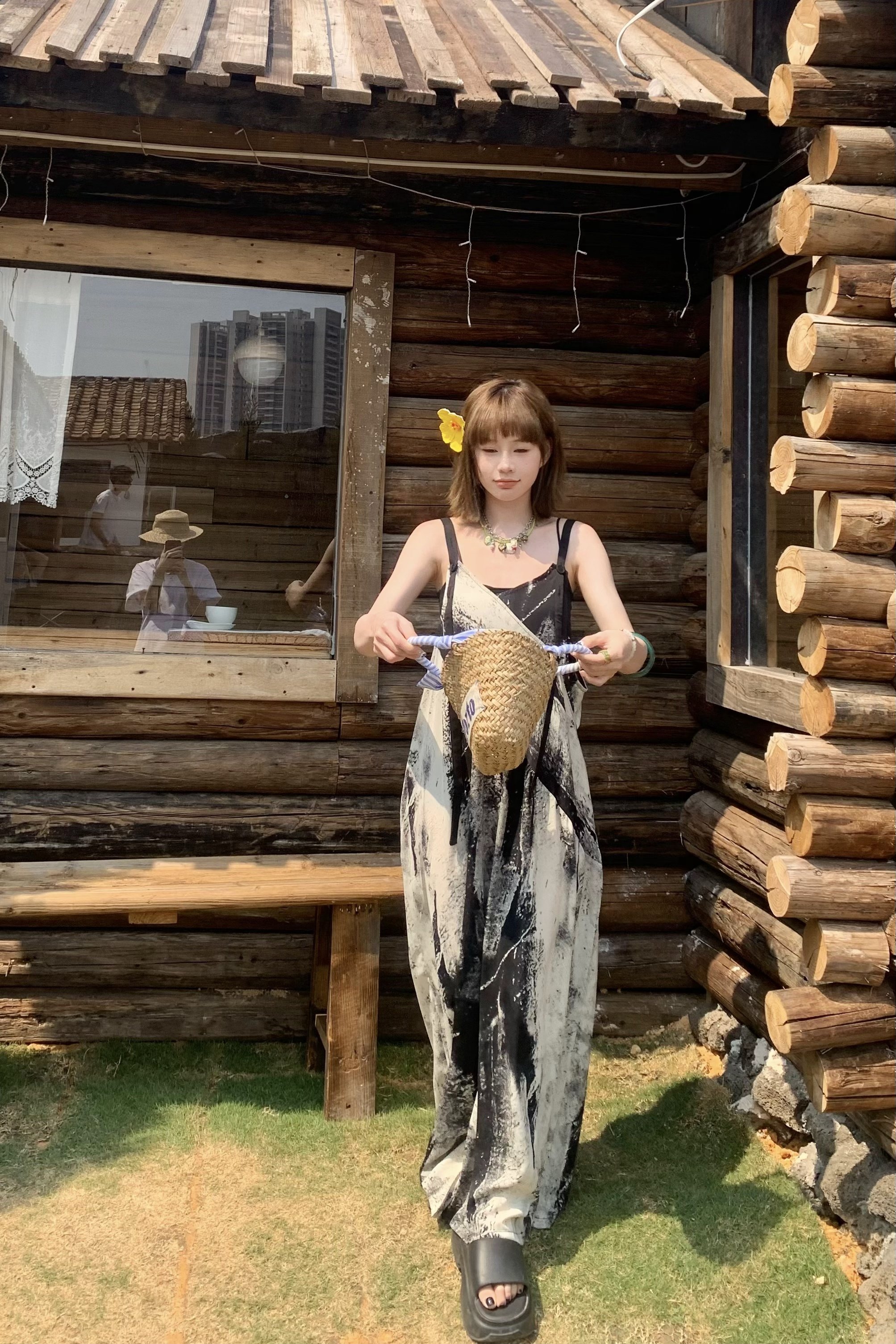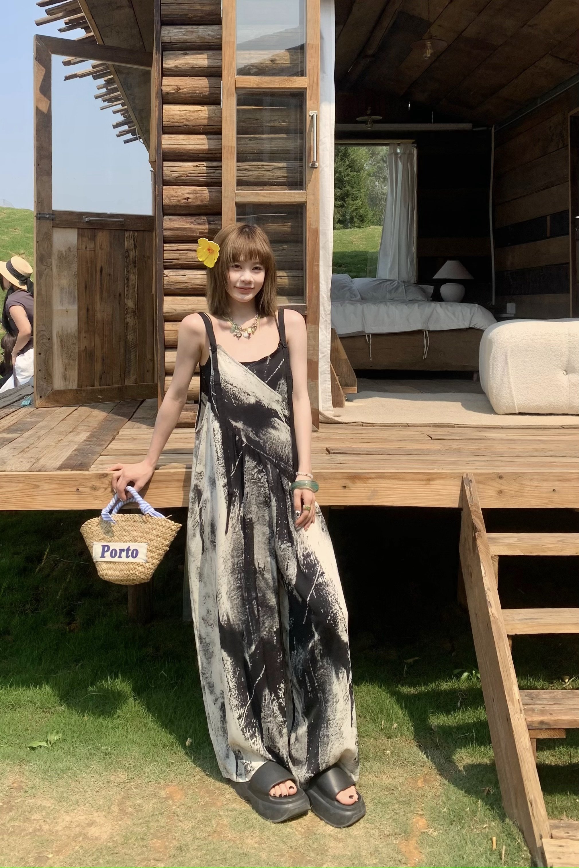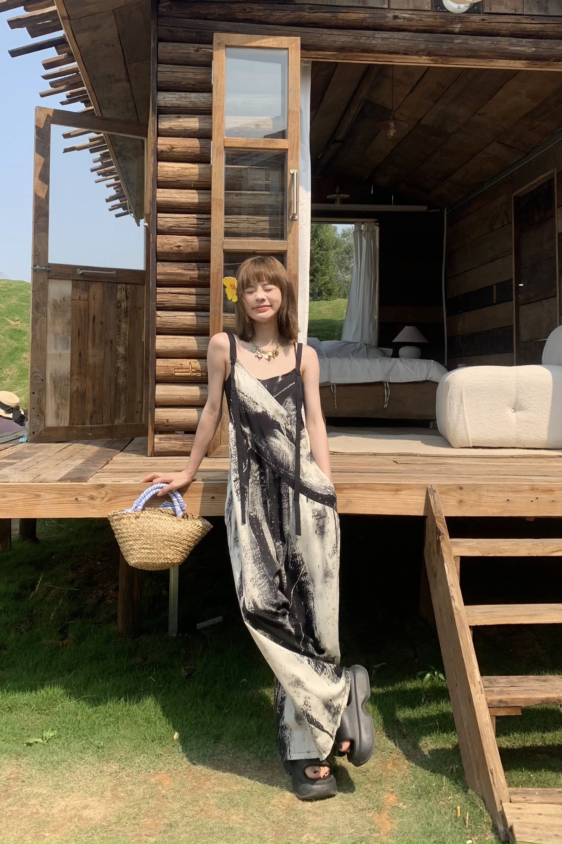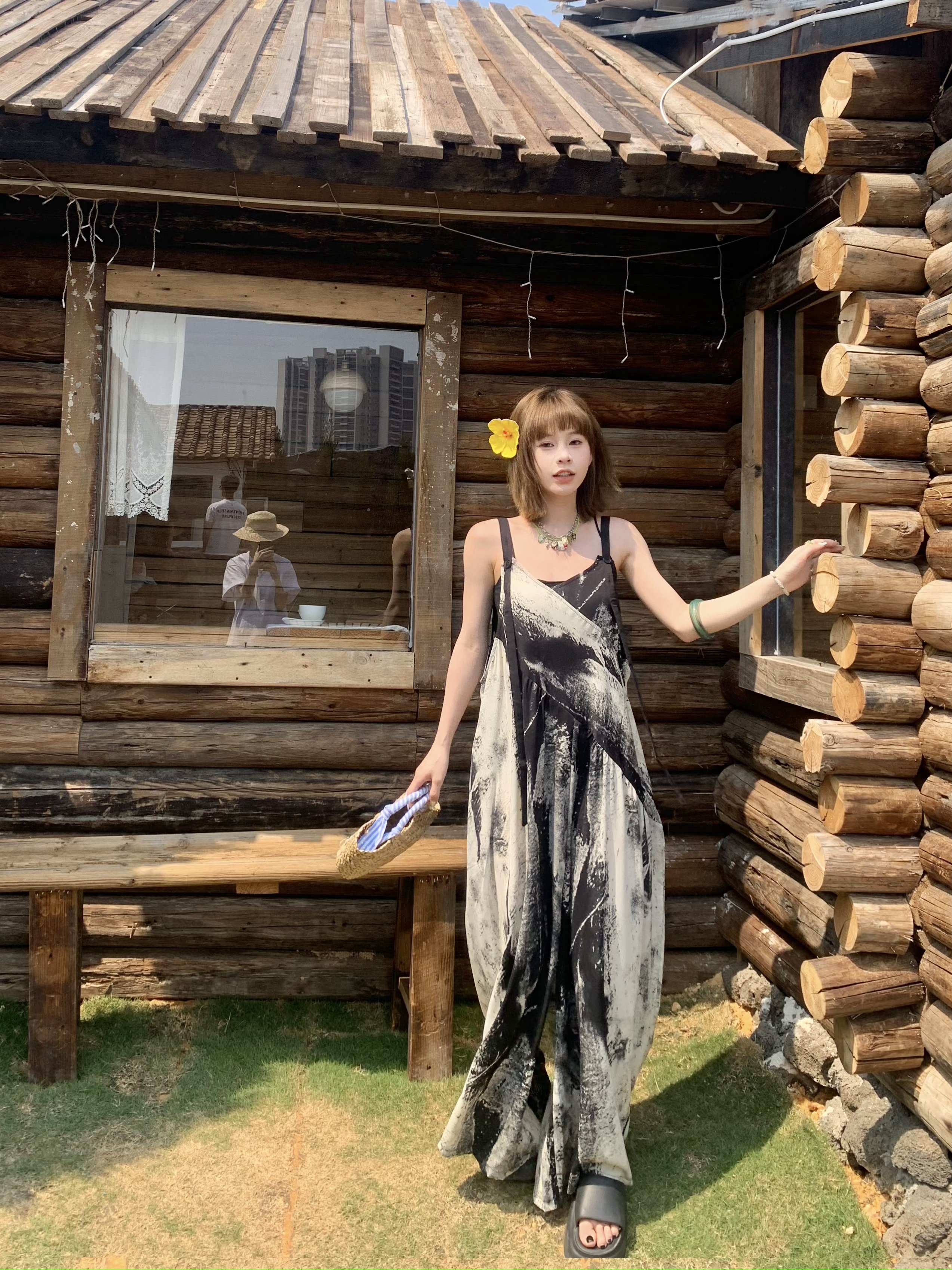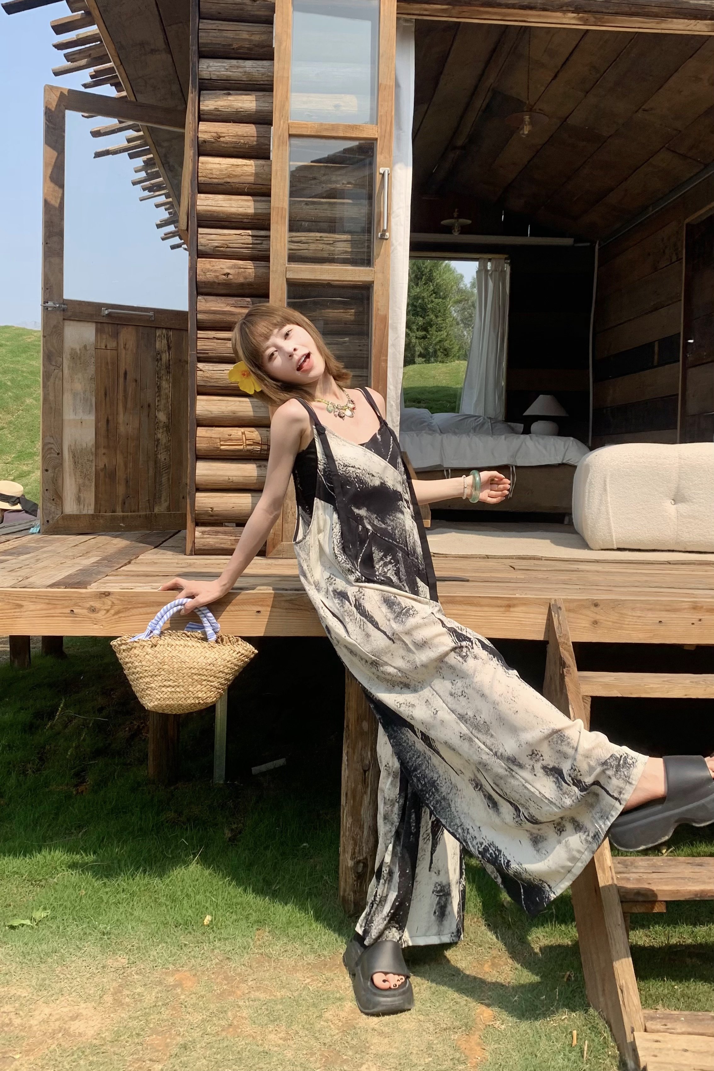 【ボトムス】夏新作 アート×ヴィンテージ 水墨画柄 ゆる感サロペット ワイドシルエット オールインワン【SHシリーズ】