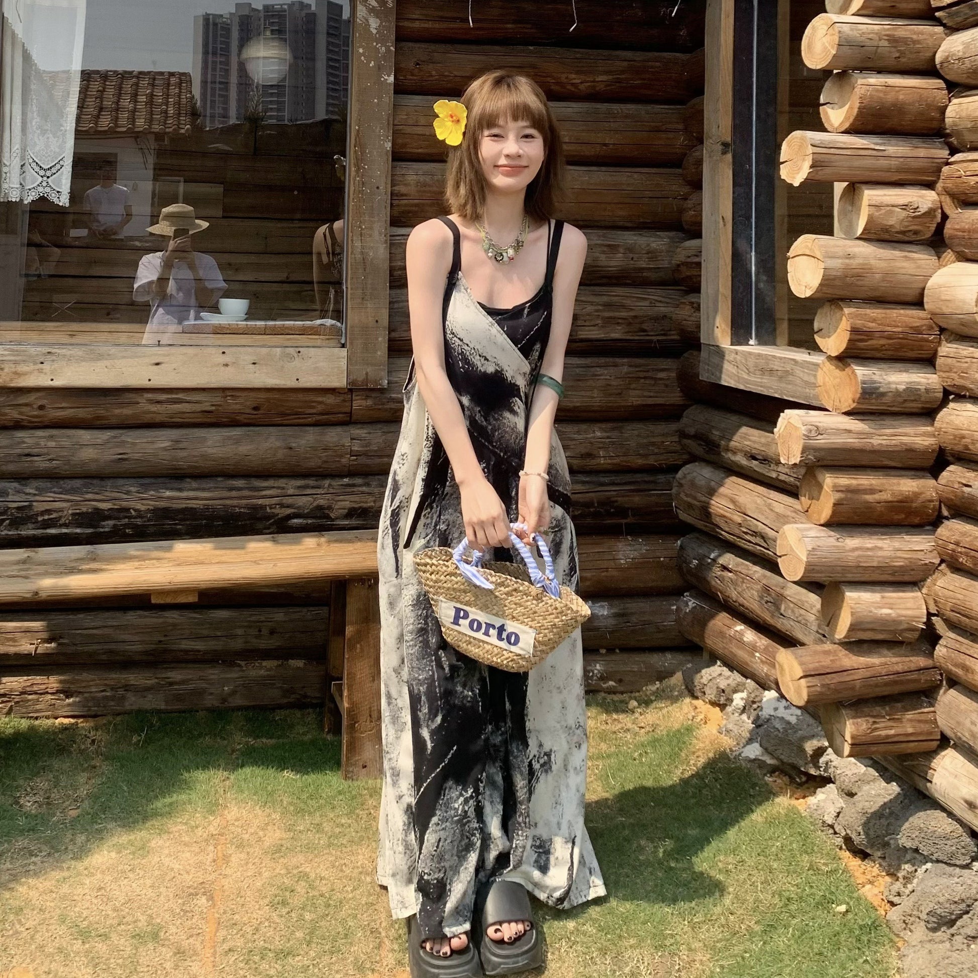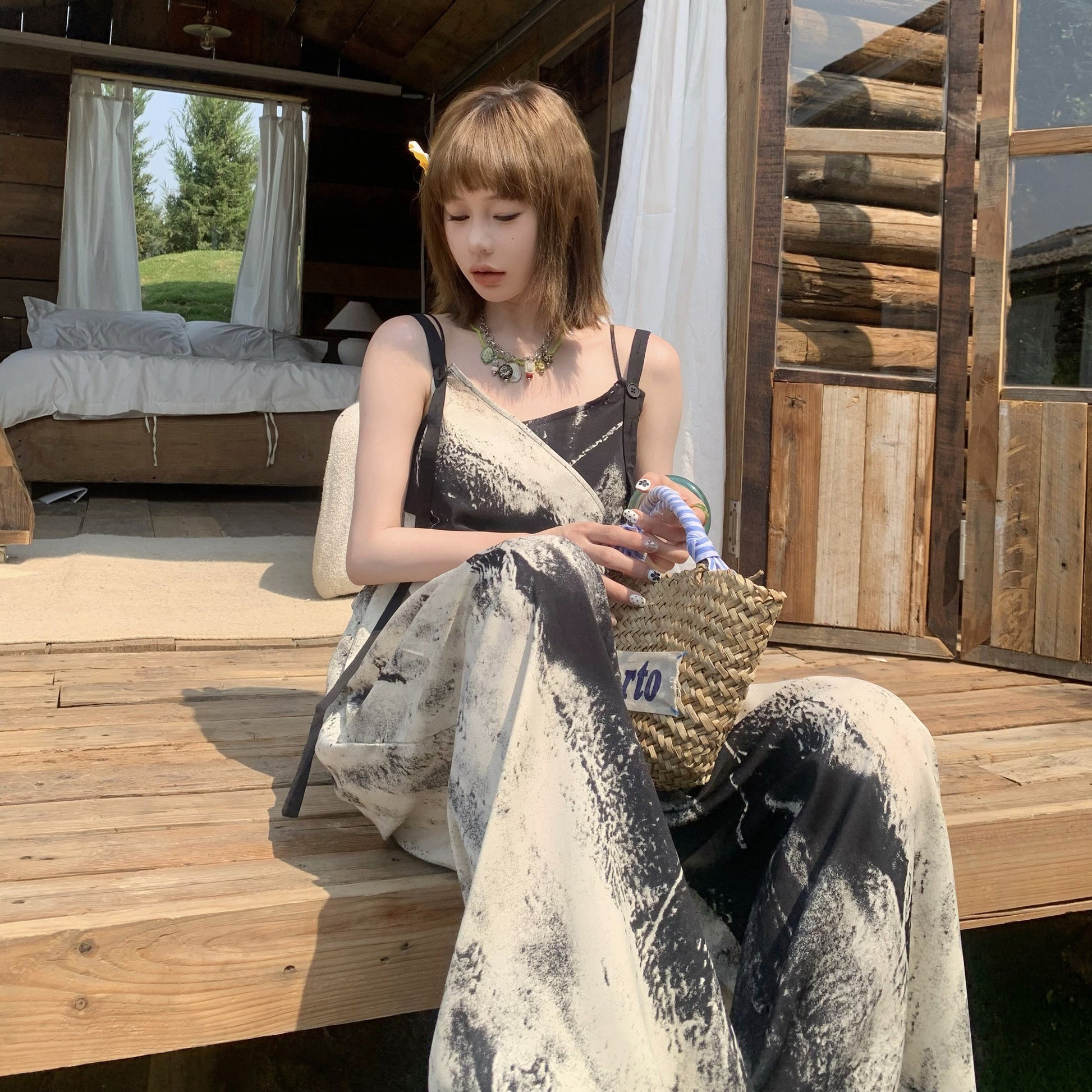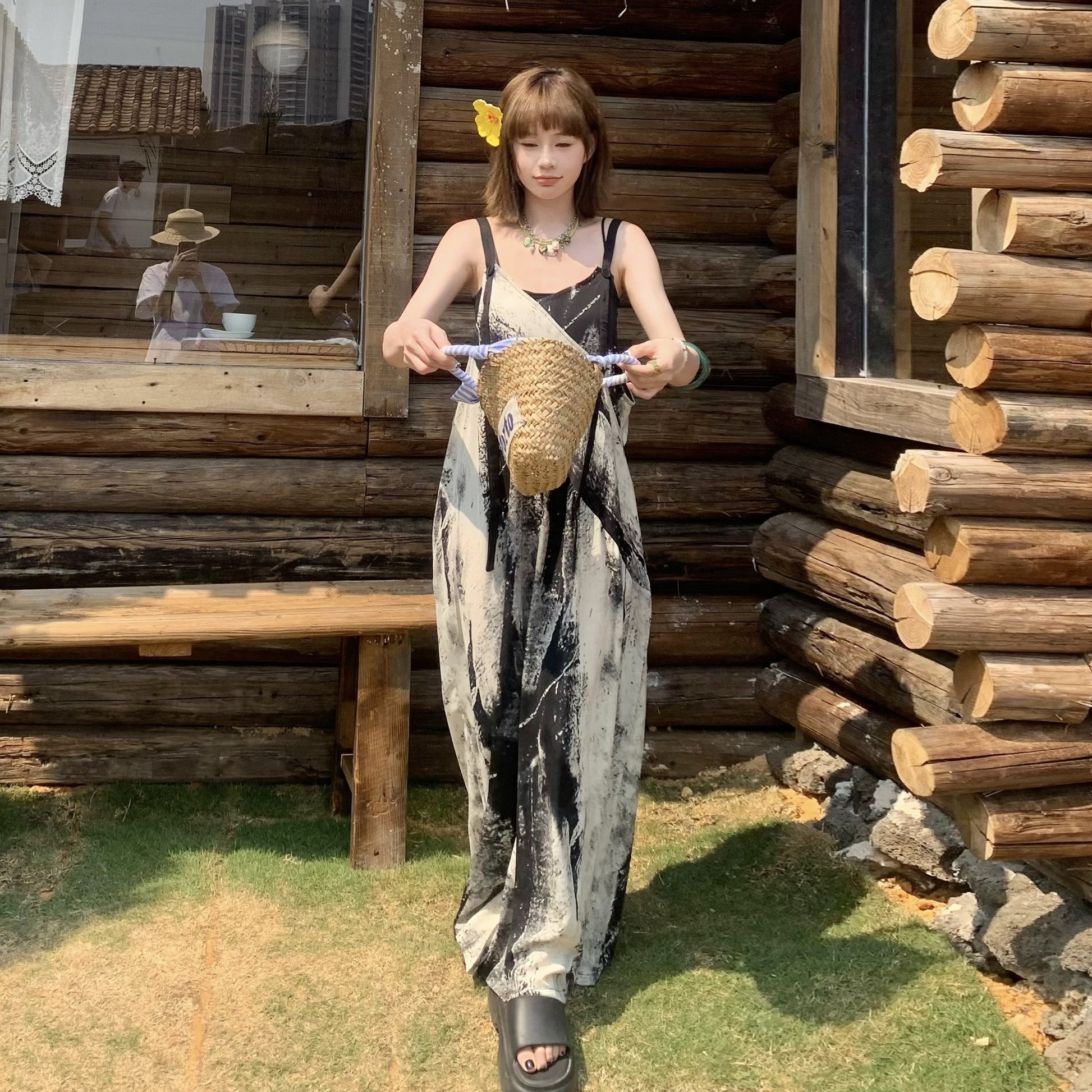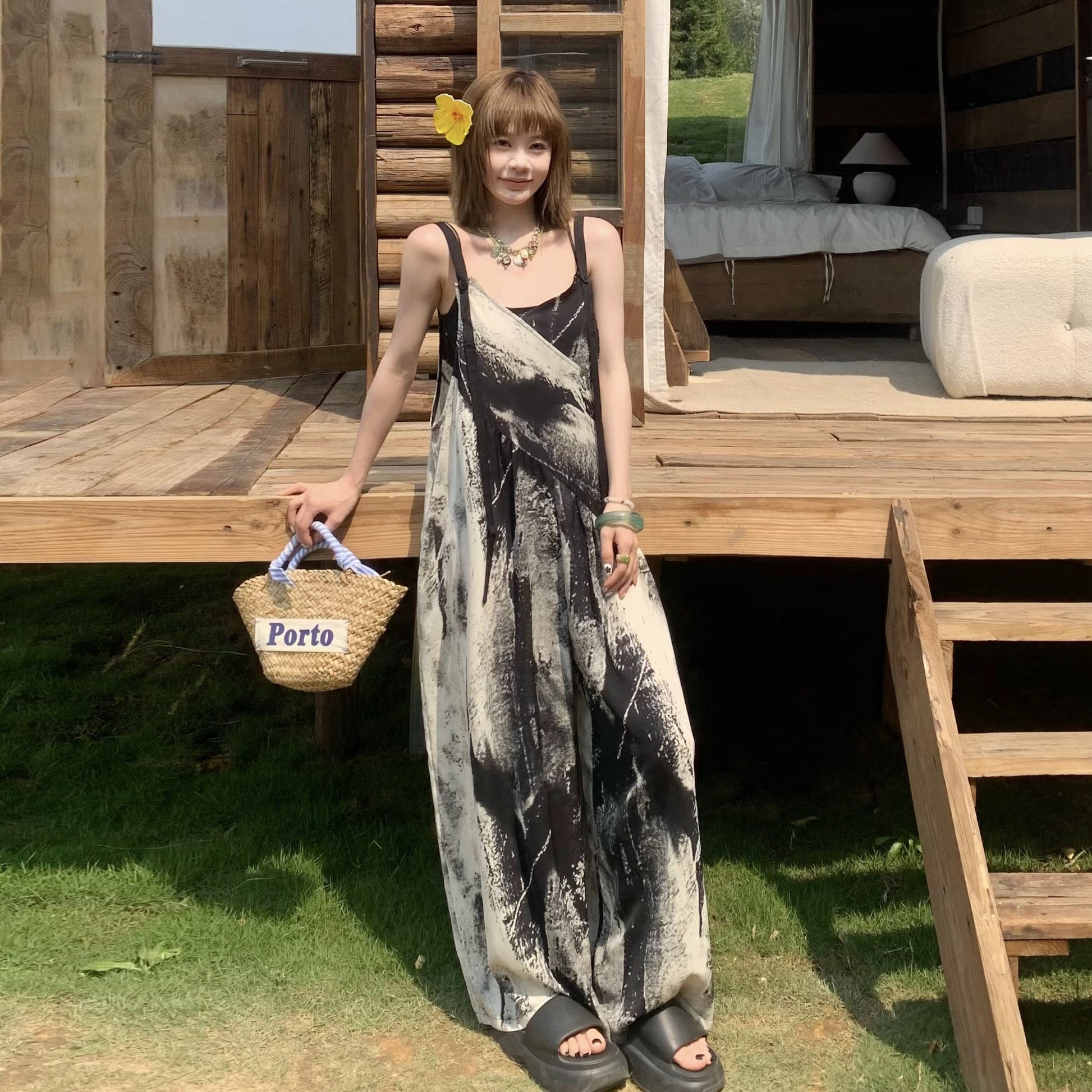 【商品名】【ボトムス】夏新作 アート×ヴィンテージ 水墨画柄 ゆる感サロペット ワイドシルエット オールインワン【SHシリーズ】