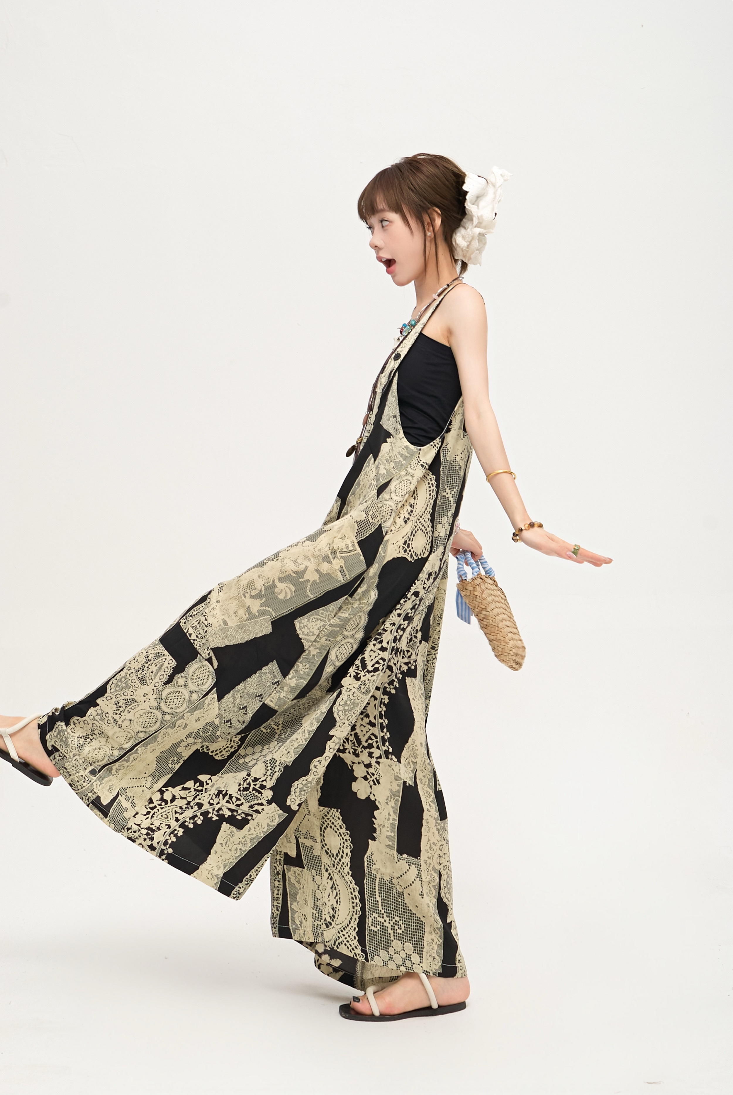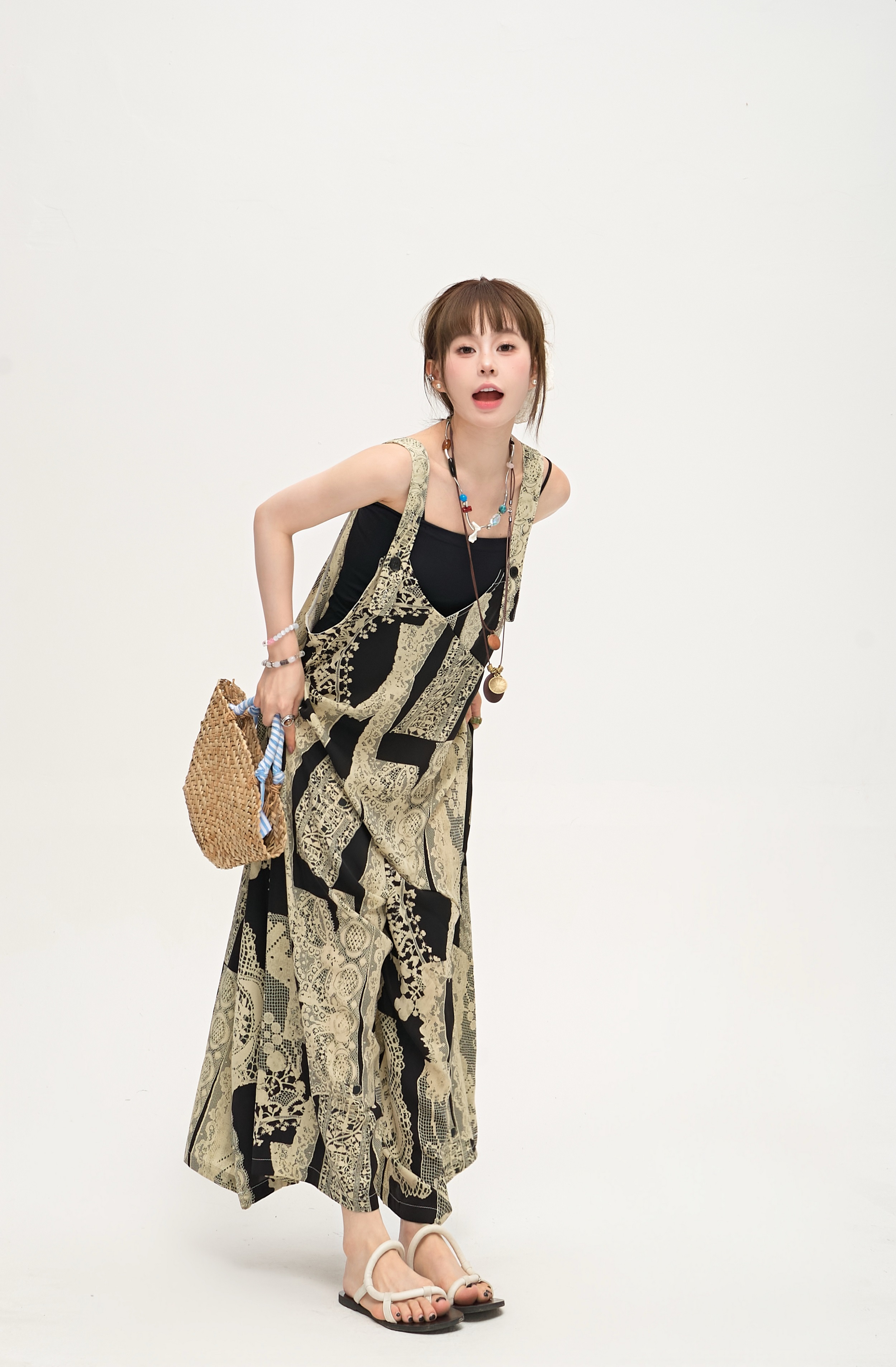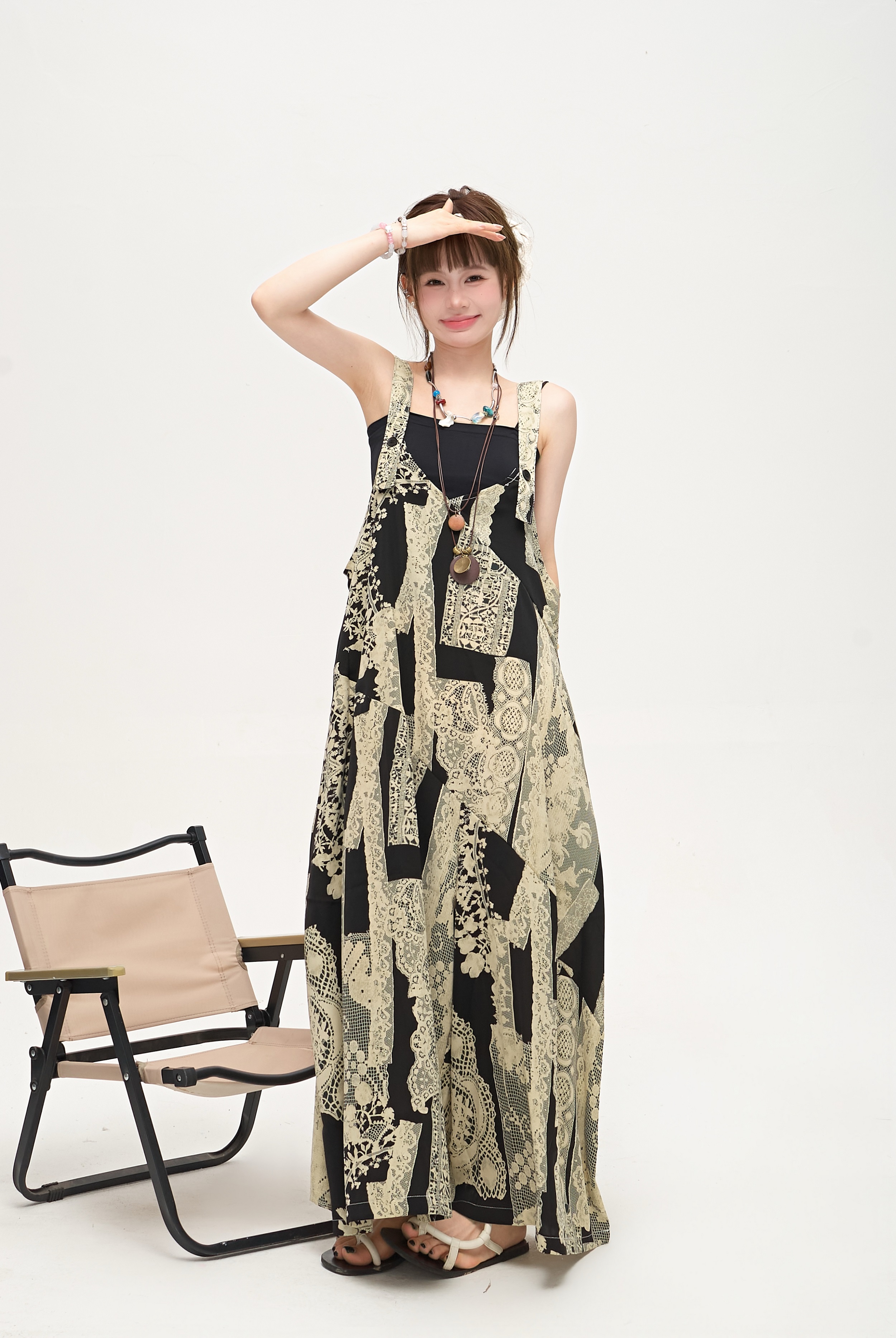 【ボトムス】ゆったりラフ感 オーバーサイズ サロペット 夏新作 アート水墨プリント ワイドパンツオールインワン【SHシリーズ】