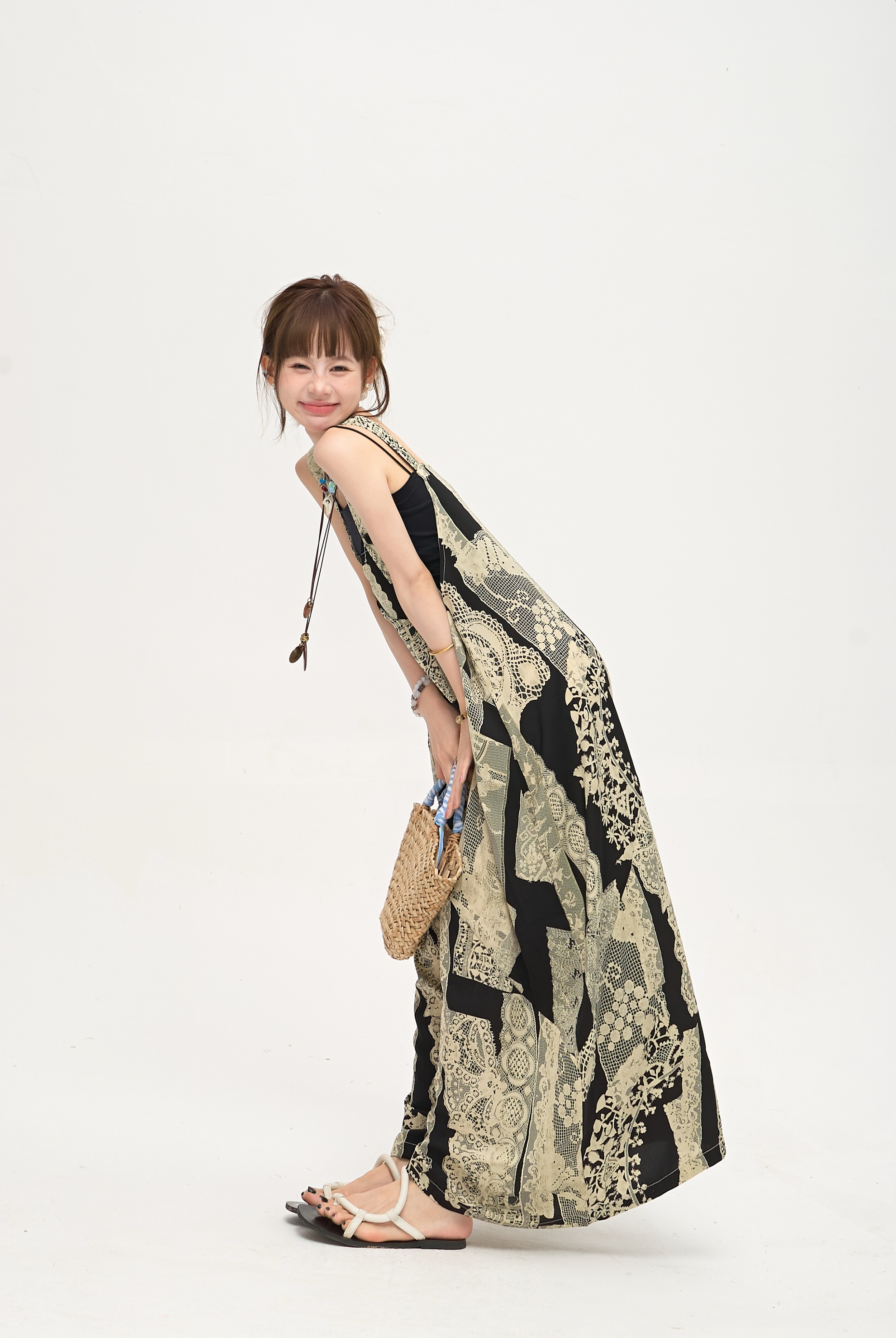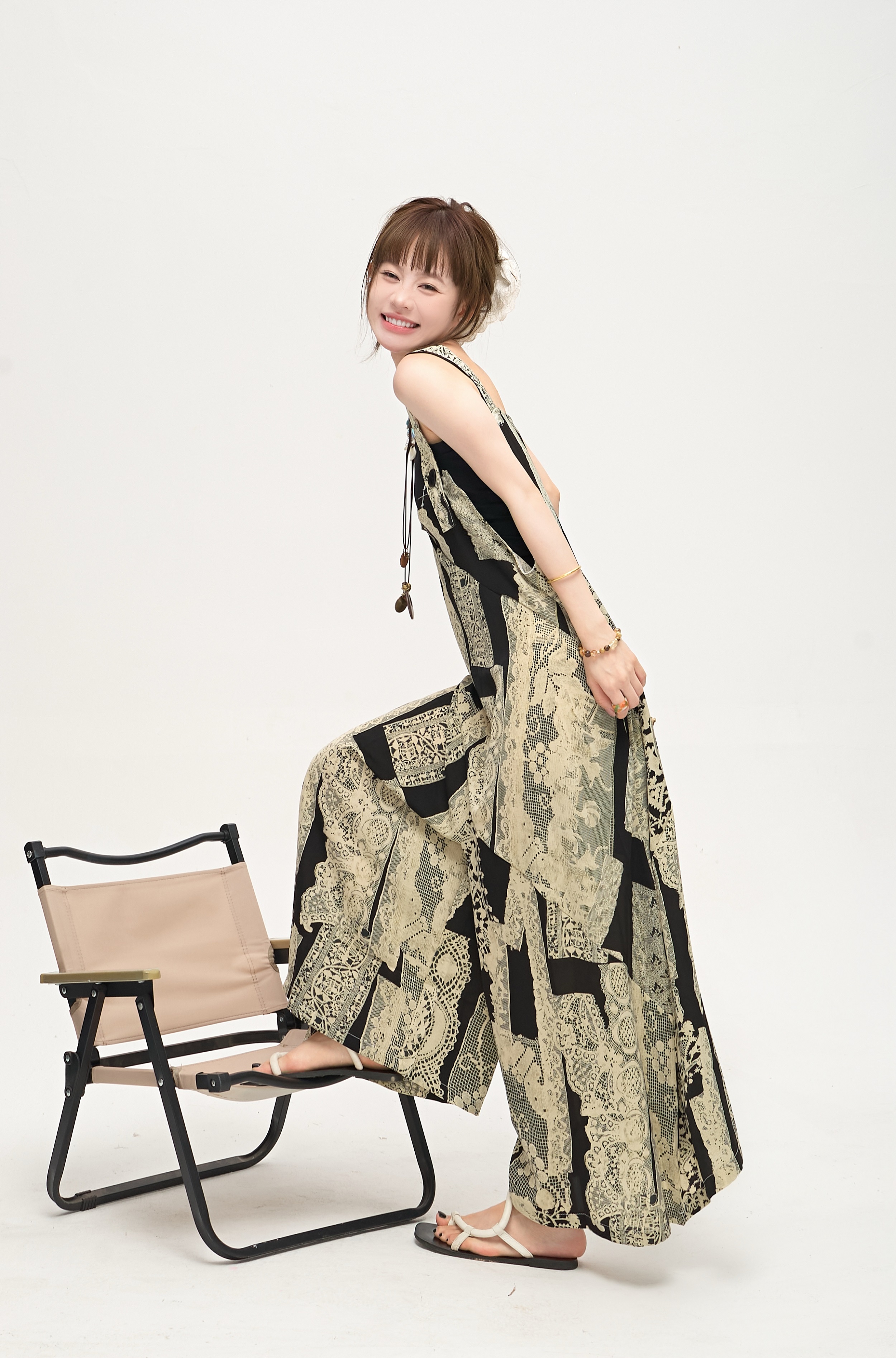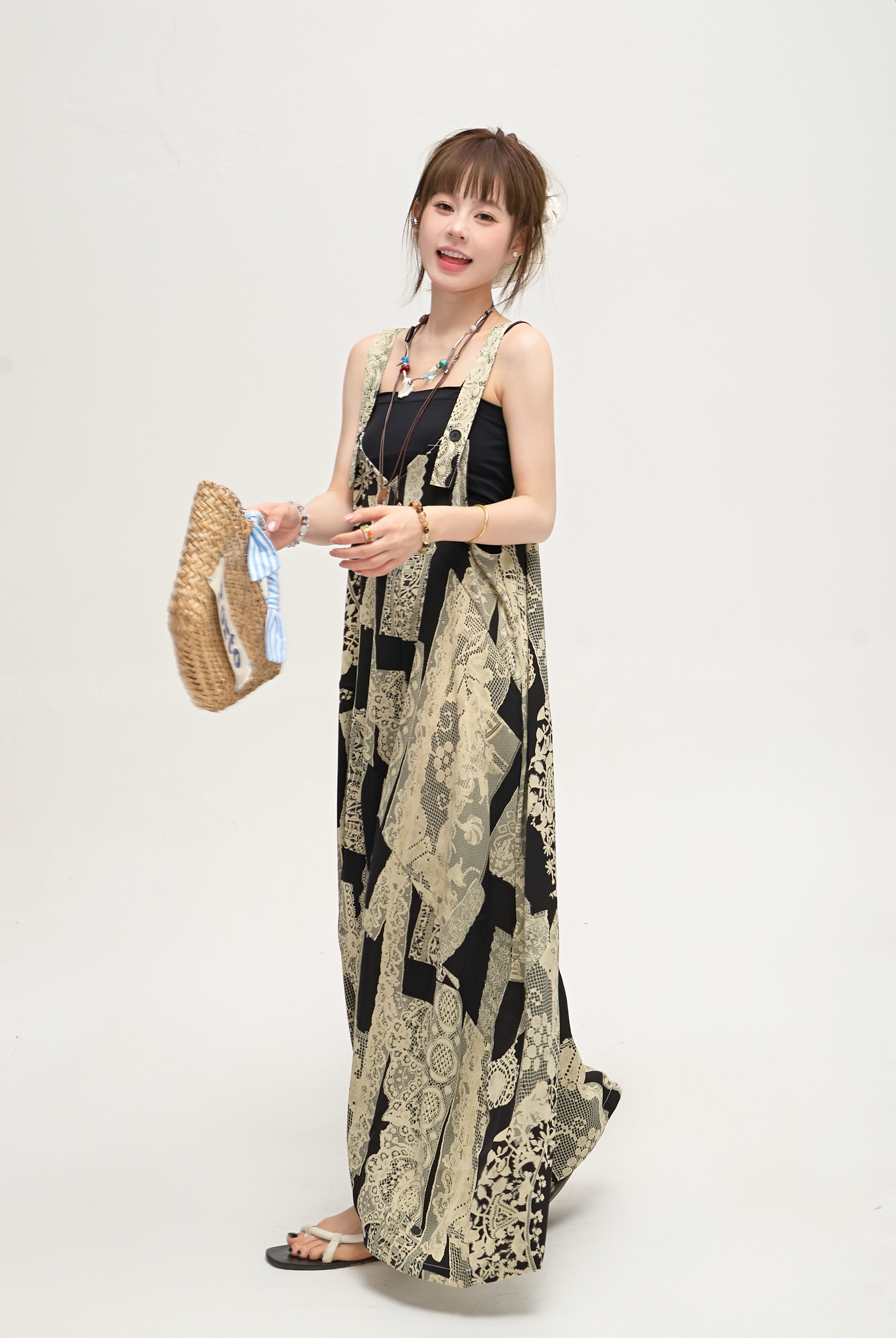 【ボトムス】ゆったりラフ感 オーバーサイズ サロペット 夏新作 アート水墨プリント ワイドパンツオールインワン【SHシリーズ】
