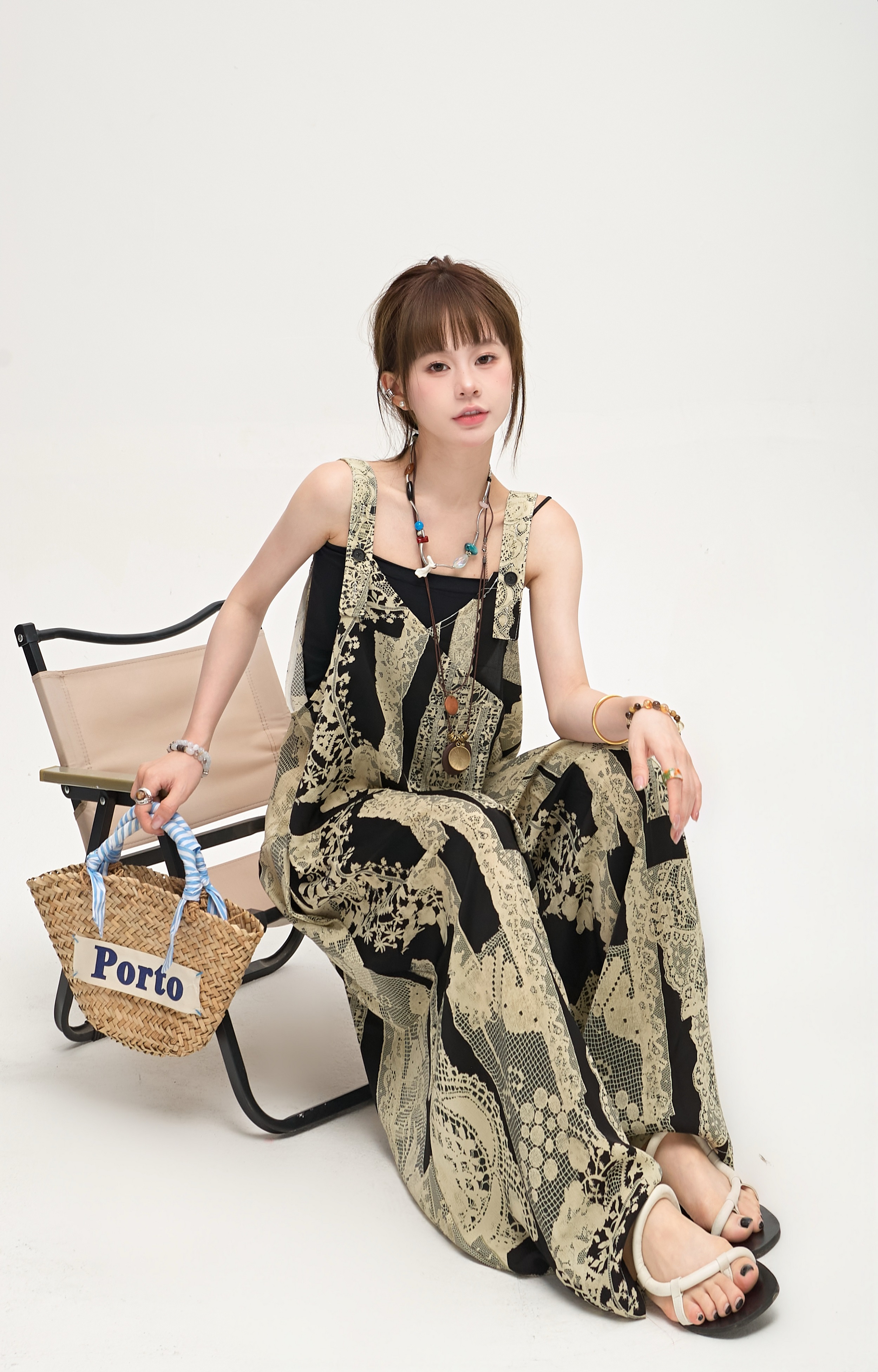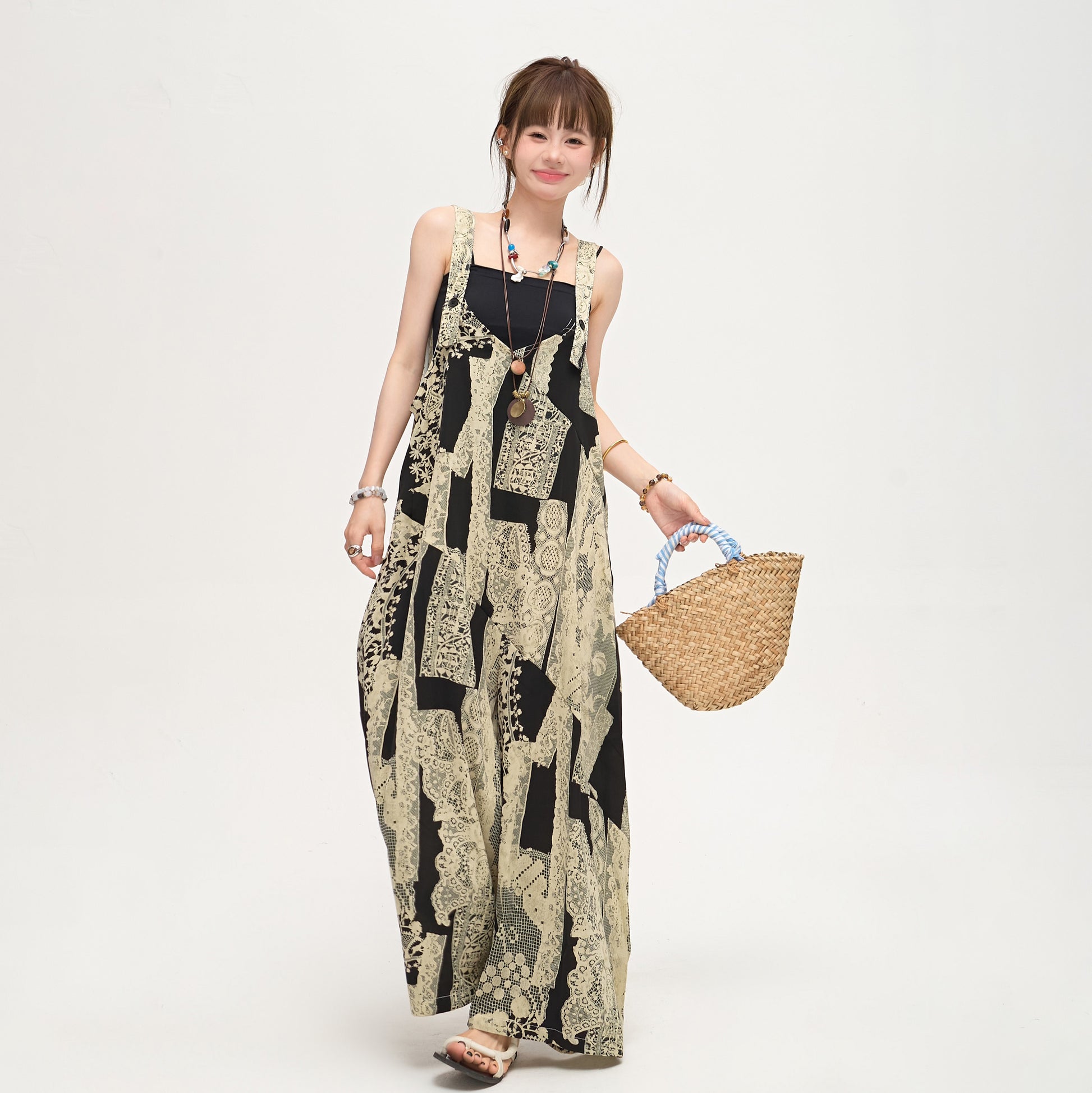 【商品名】【ボトムス】ゆったりラフ感 オーバーサイズ サロペット 夏新作 アート水墨プリント ワイドパンツオールインワン【SHシリーズ】