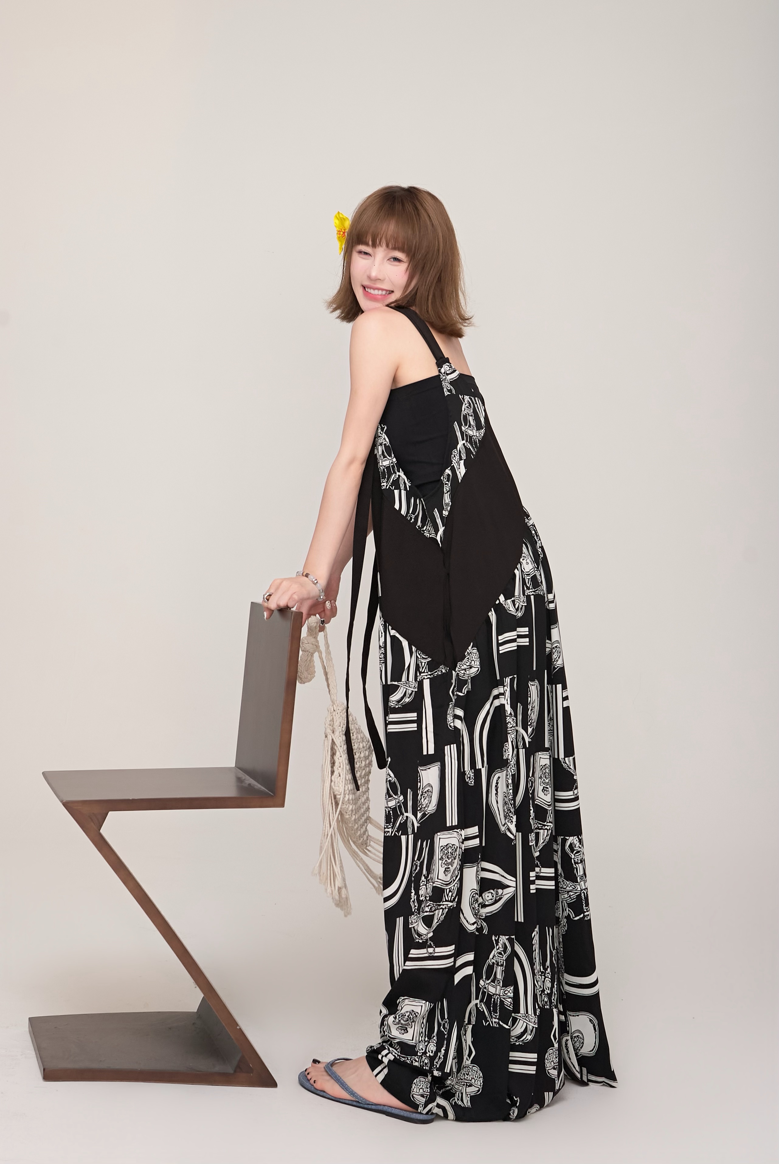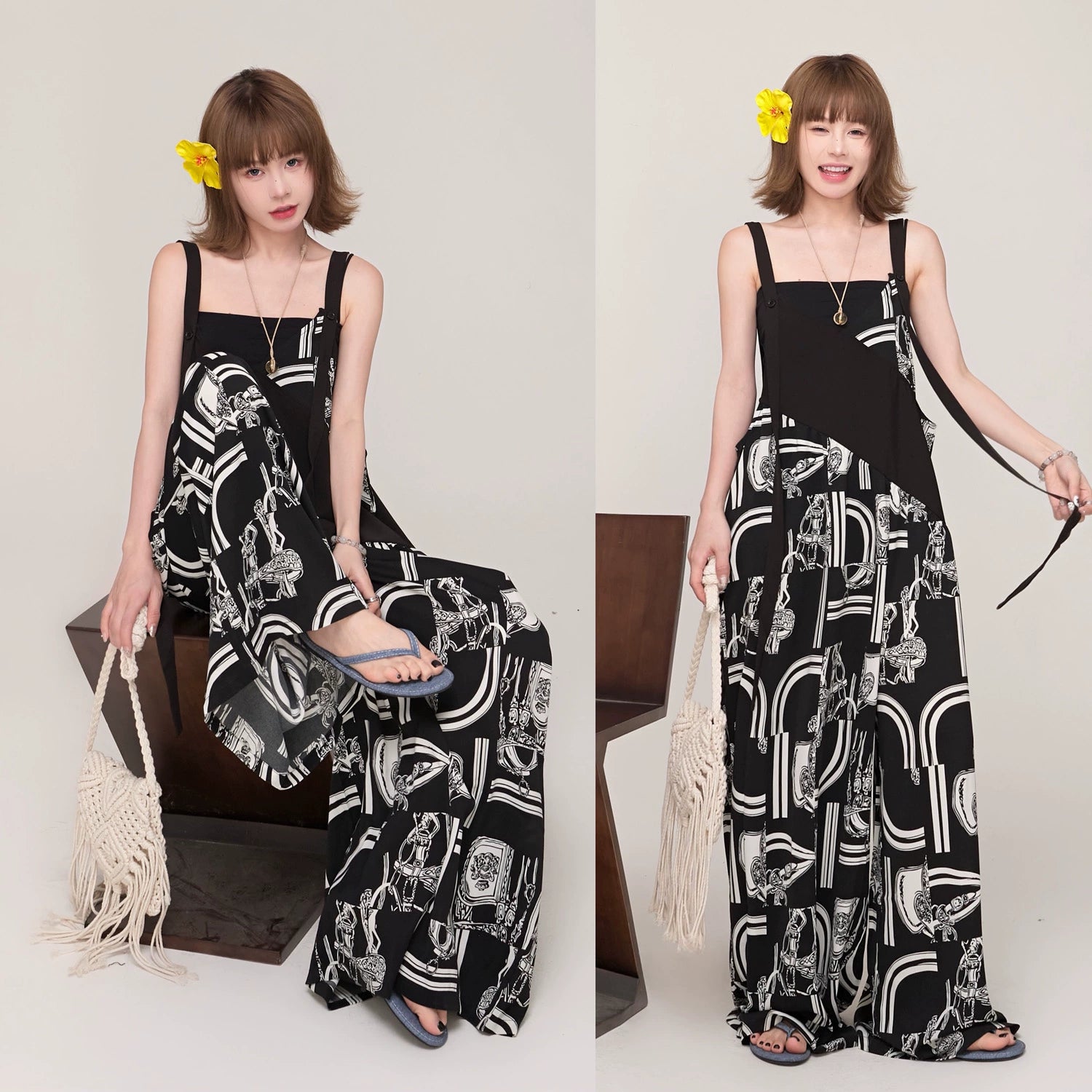 【ボトムス】ミュージックムード漂う Vネックサロペット ゆったりオーバーサイズ 春夏新作 ワイドパンツオールインワン【SHシリーズ】
