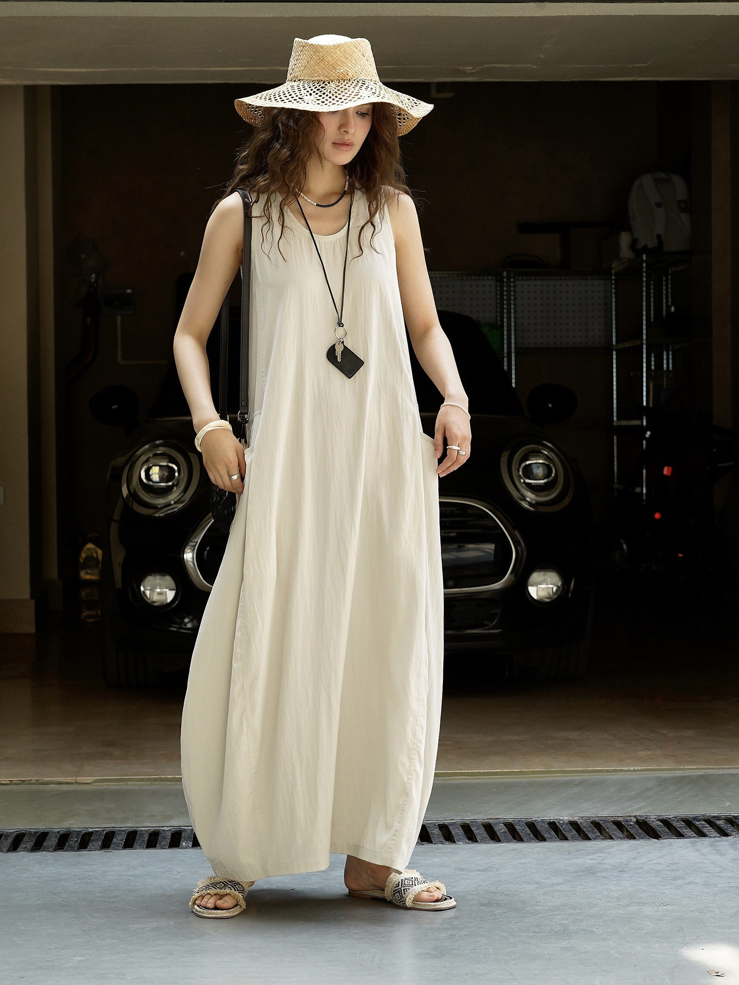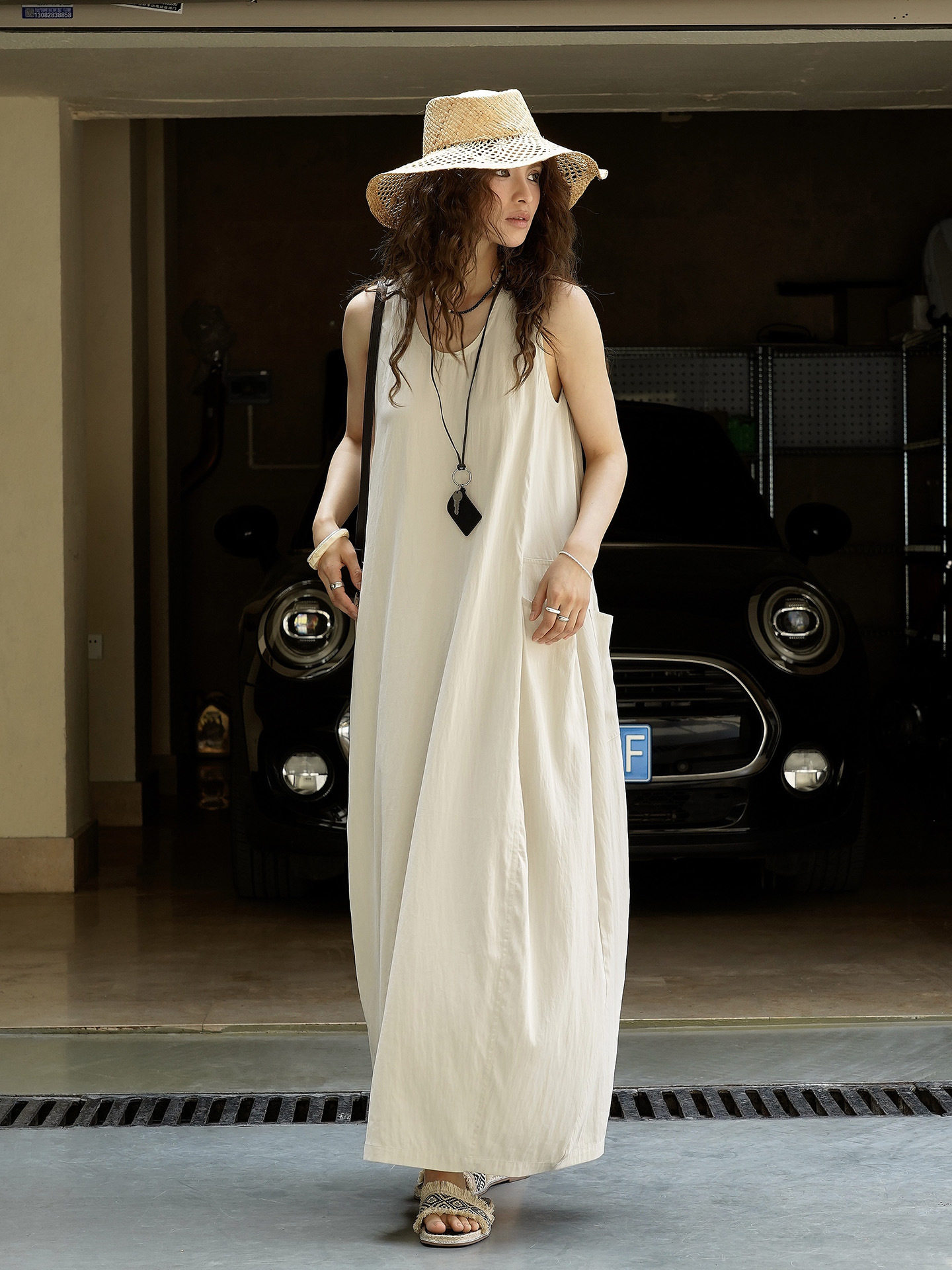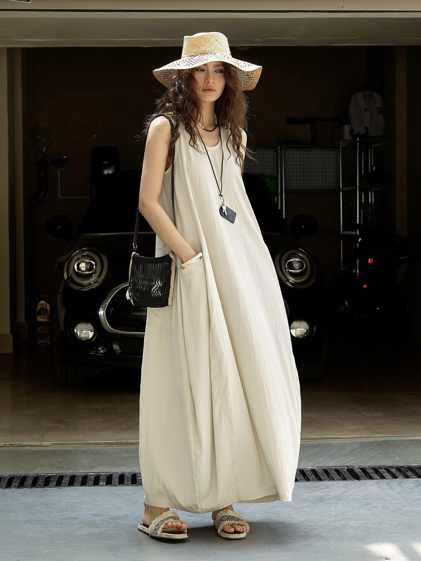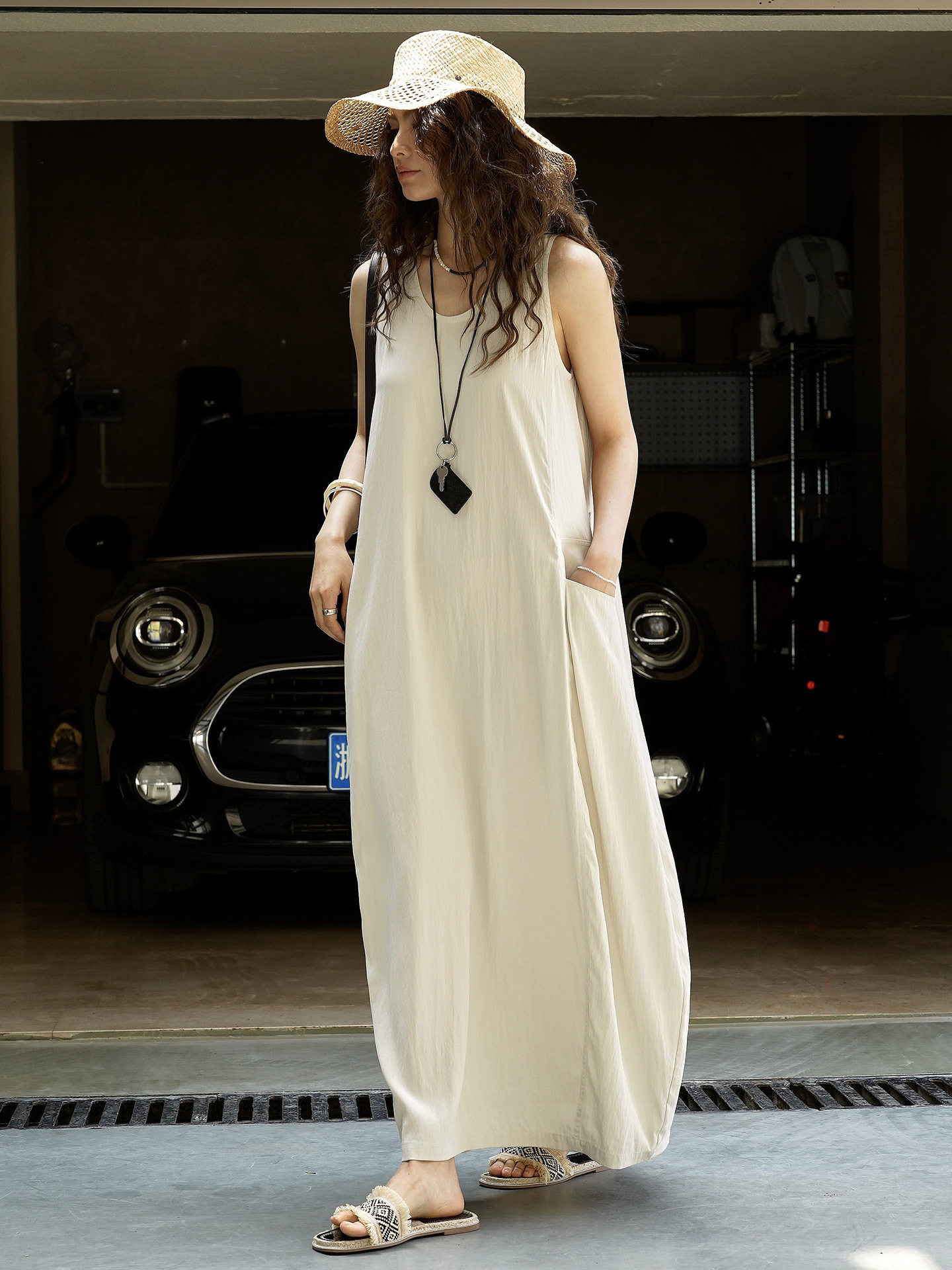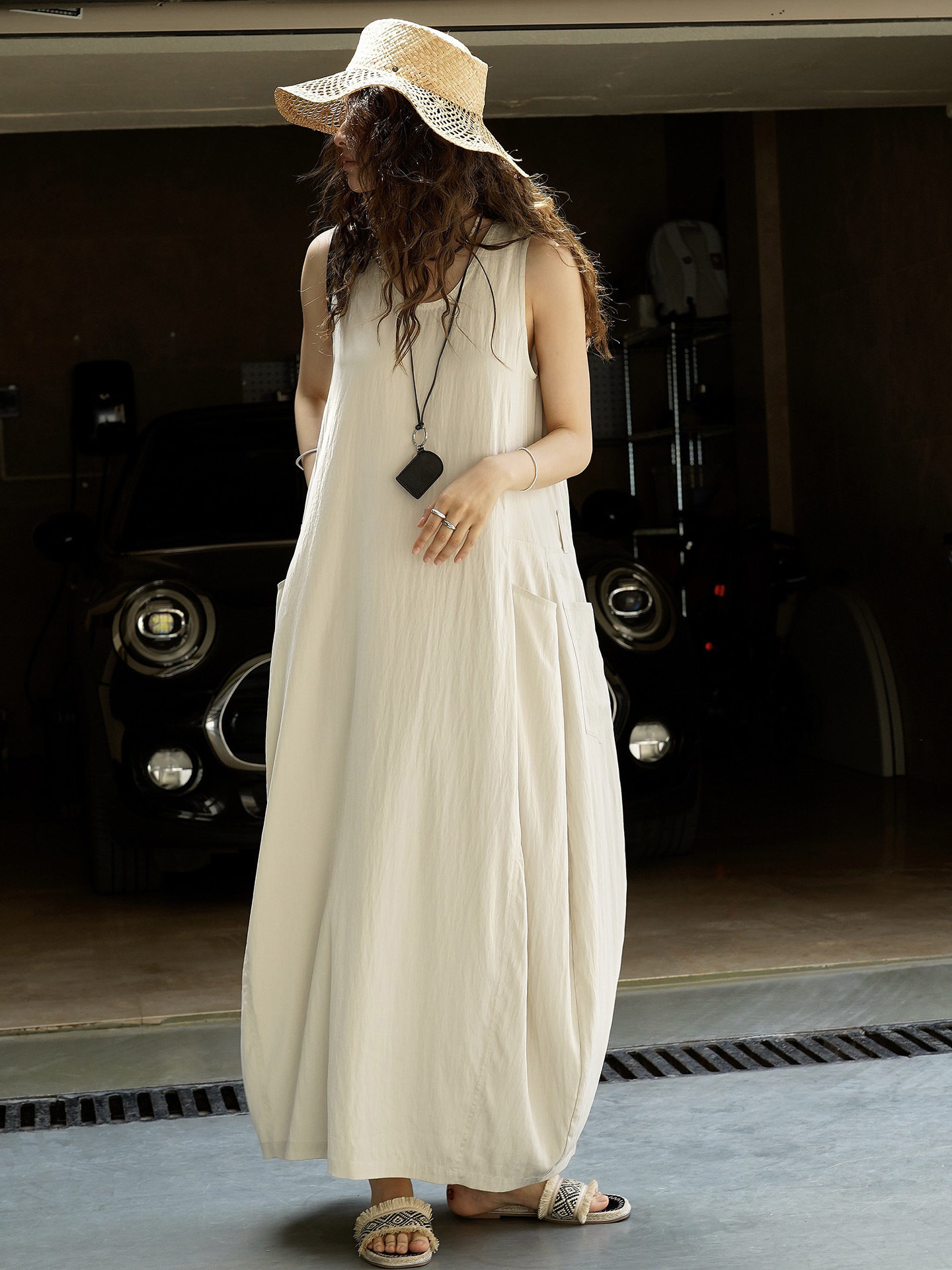 【商品名】【ワンピース】夏新作 フレンチヴィンテージ テンセル素材 デニム風 ダブルポケット ノースリーブワンピース【JZシリーズ】