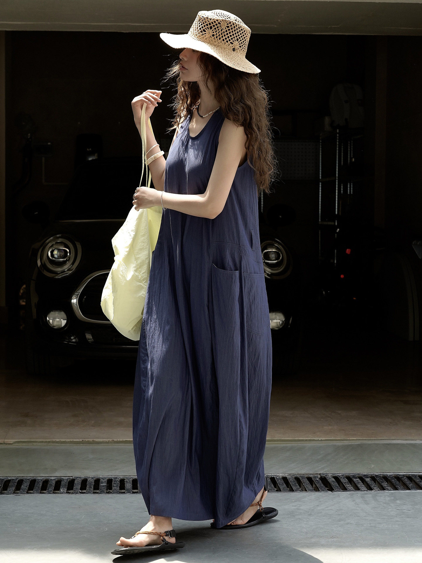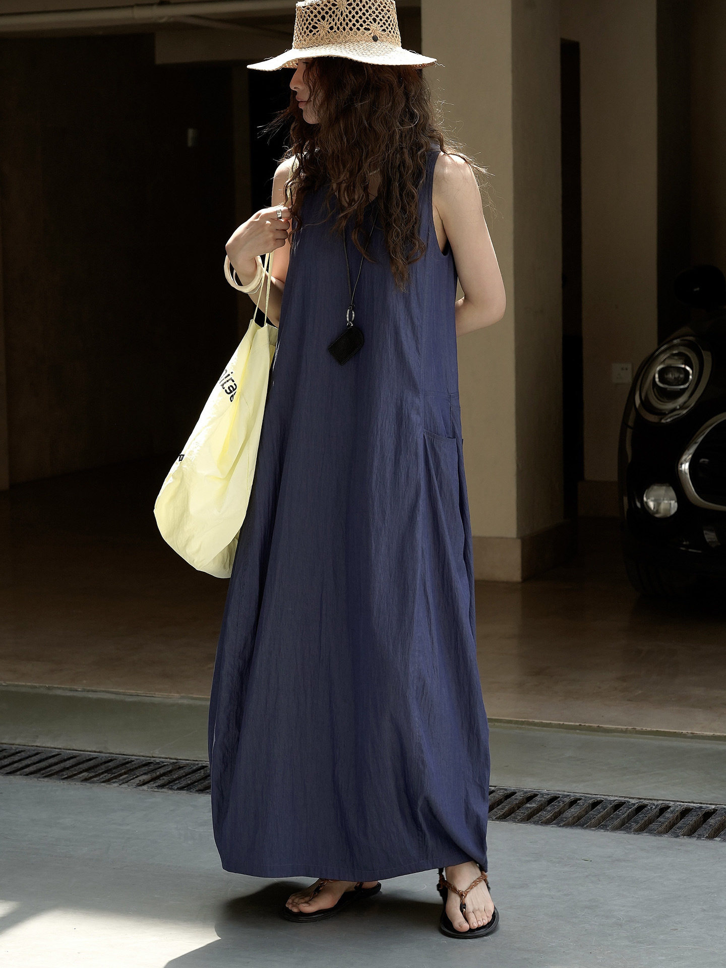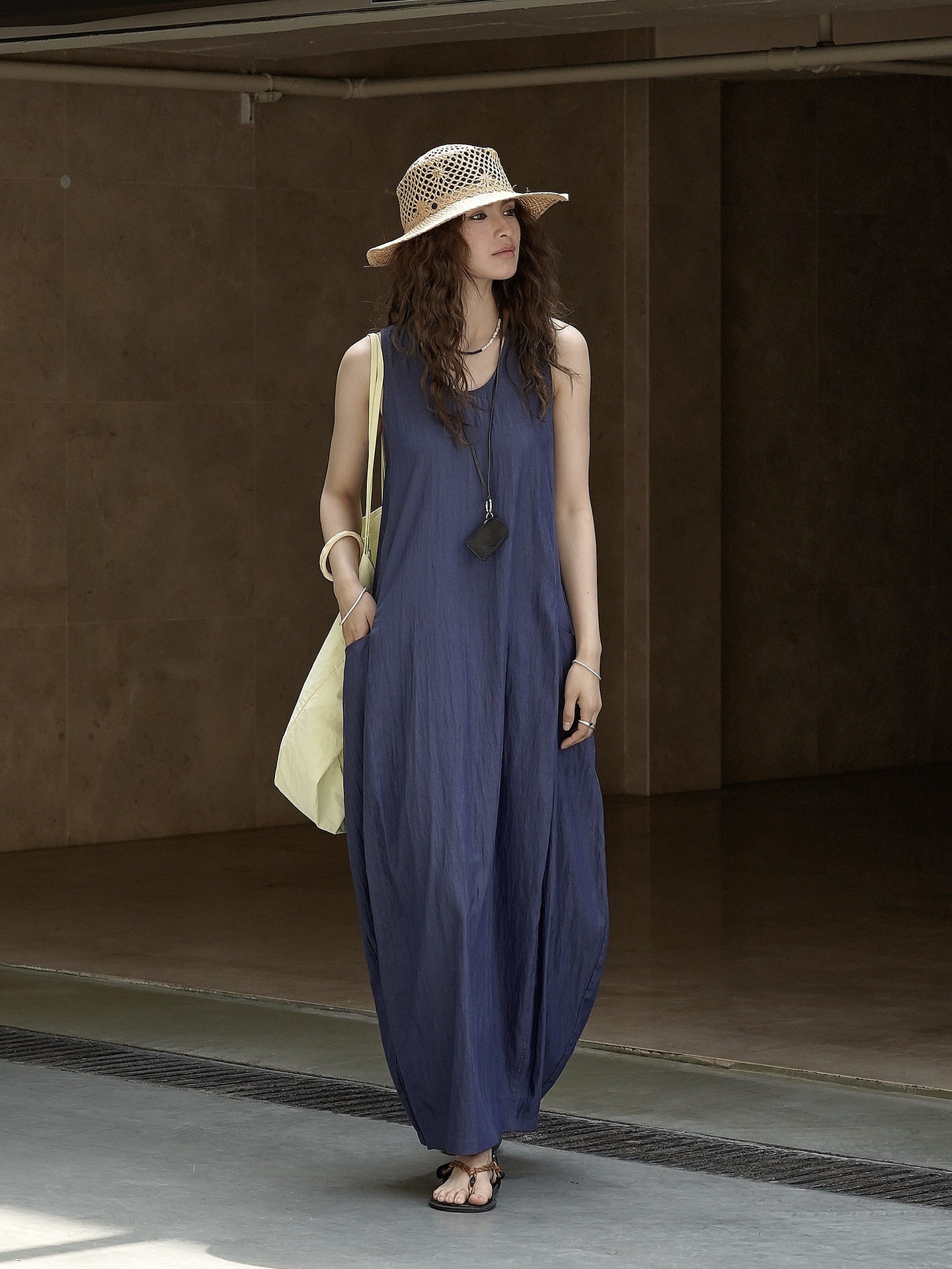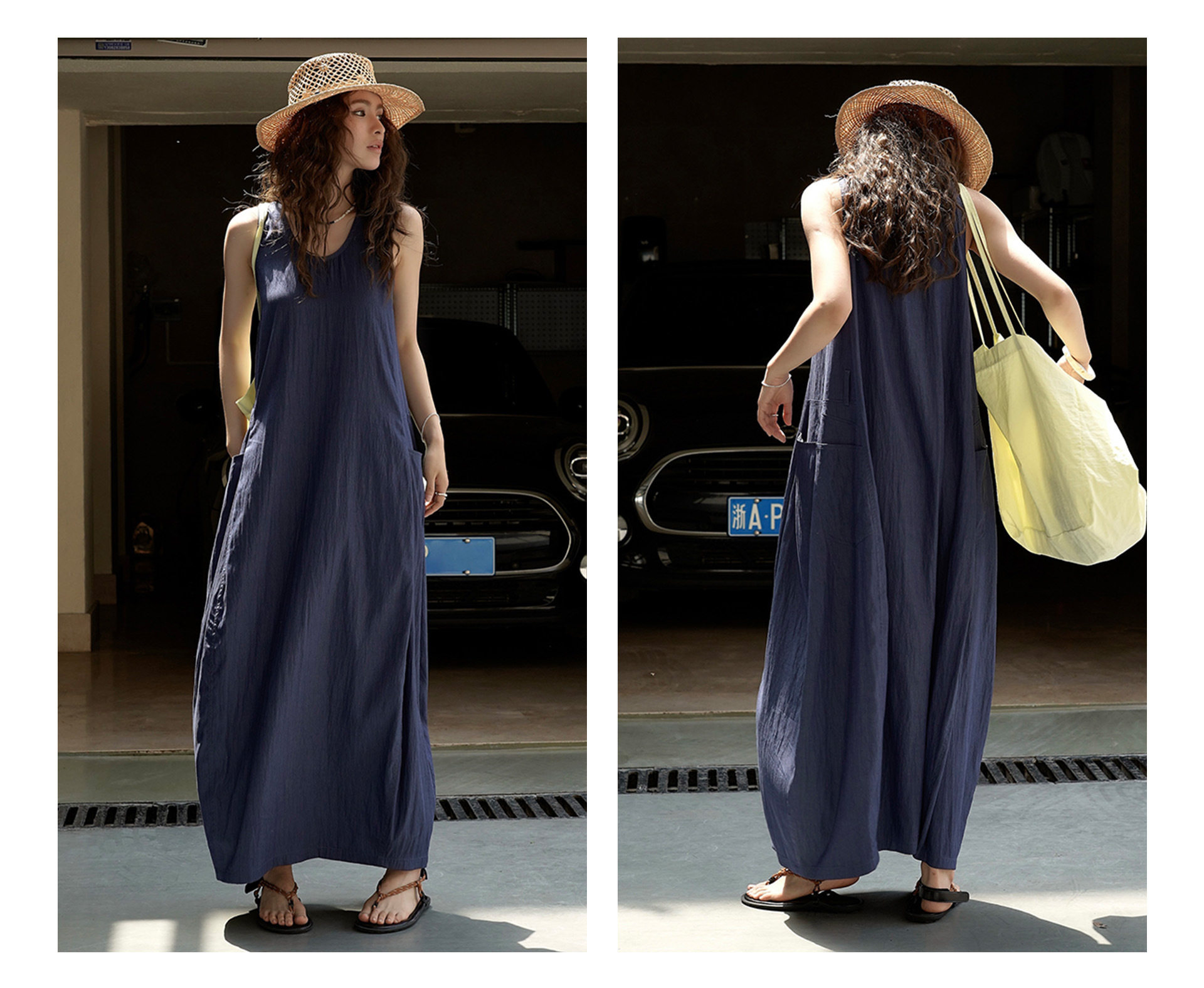 【ワンピース】夏新作 フレンチヴィンテージ テンセル素材 デニム風 ダブルポケット ノースリーブワンピース【JZシリーズ】