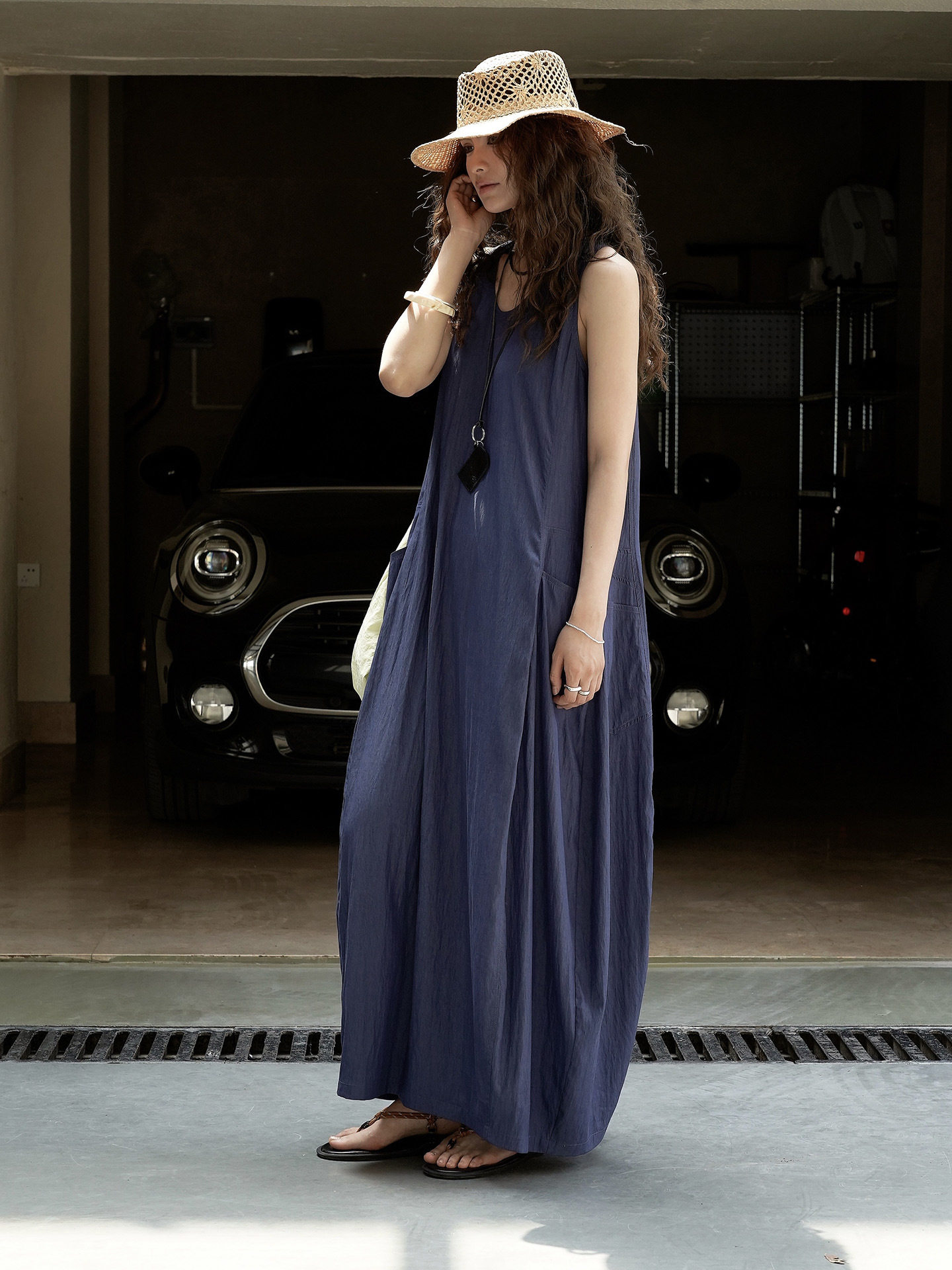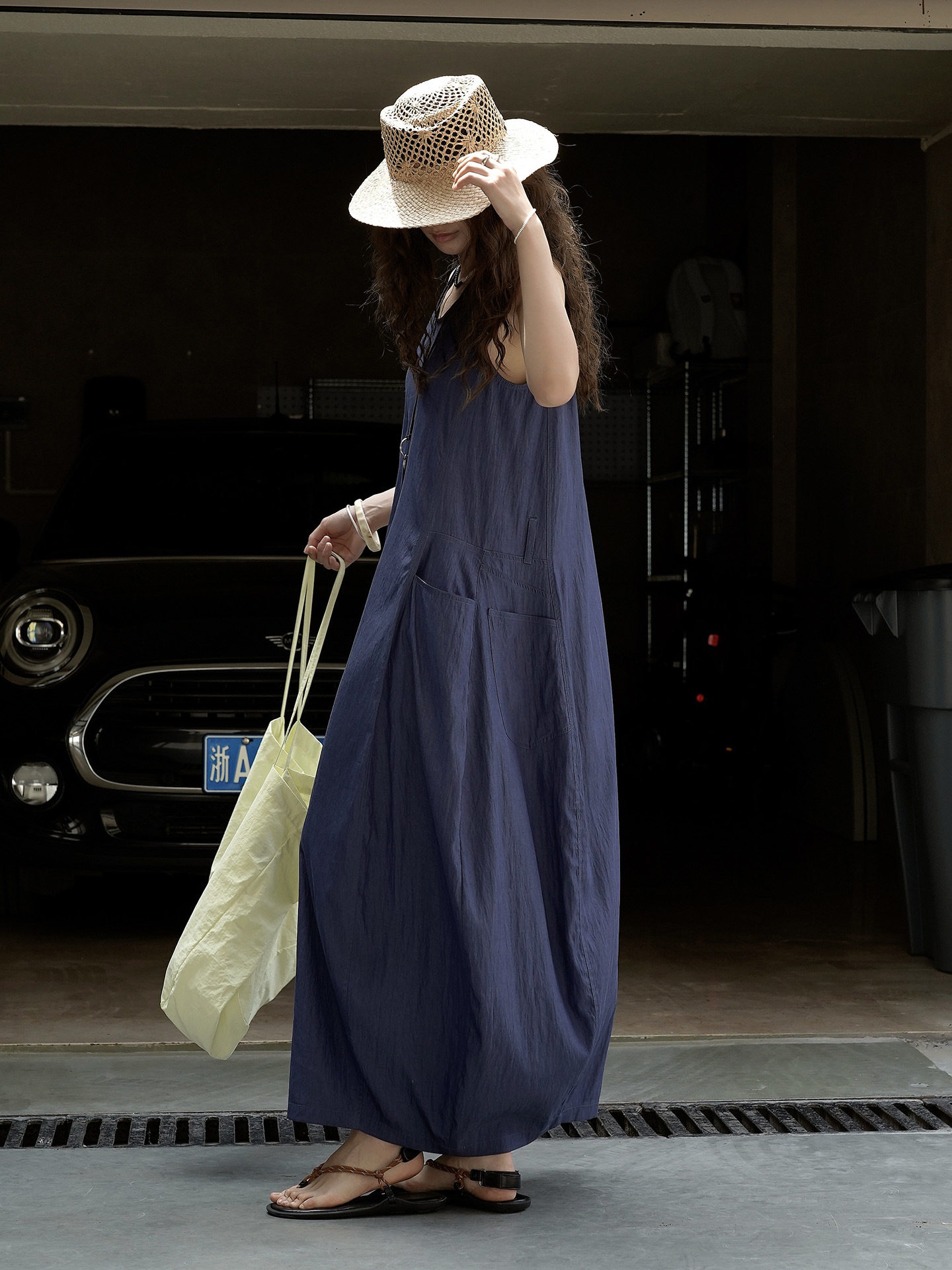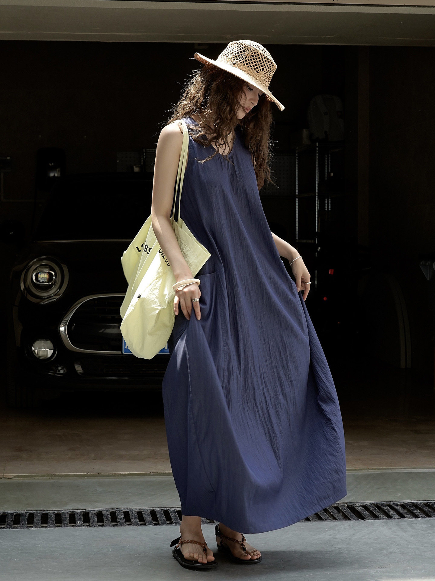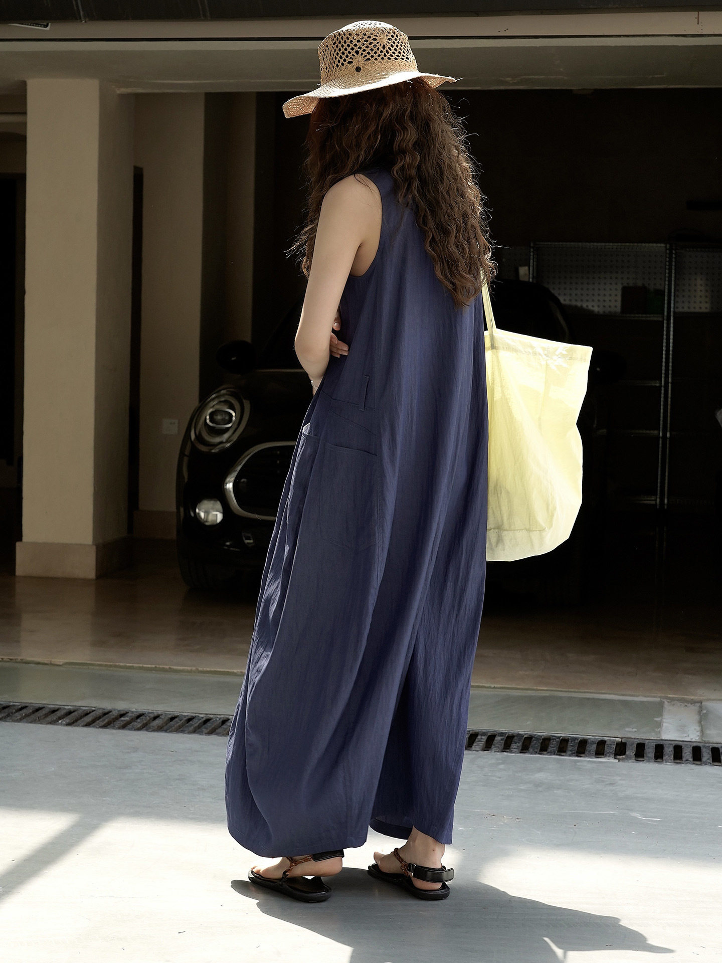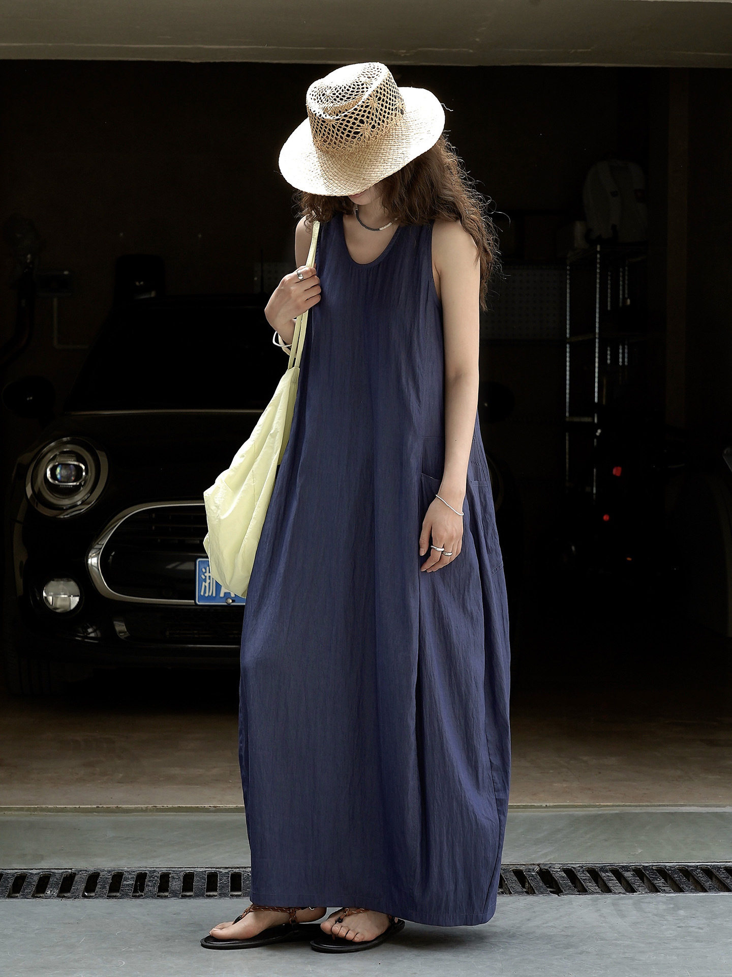 【ワンピース】夏新作 フレンチヴィンテージ テンセル素材 デニム風 ダブルポケット ノースリーブワンピース【JZシリーズ】
