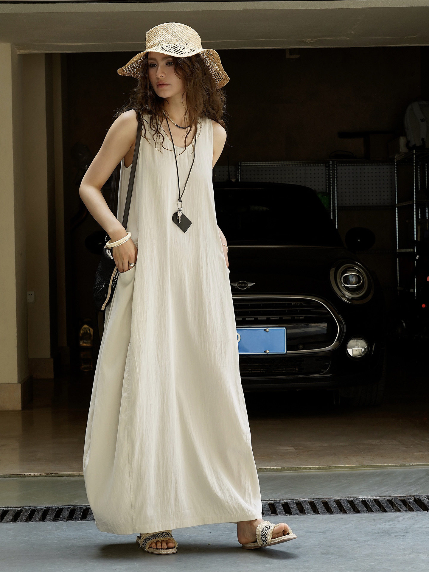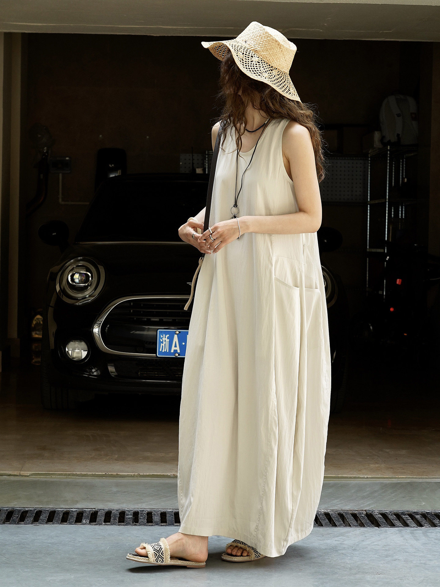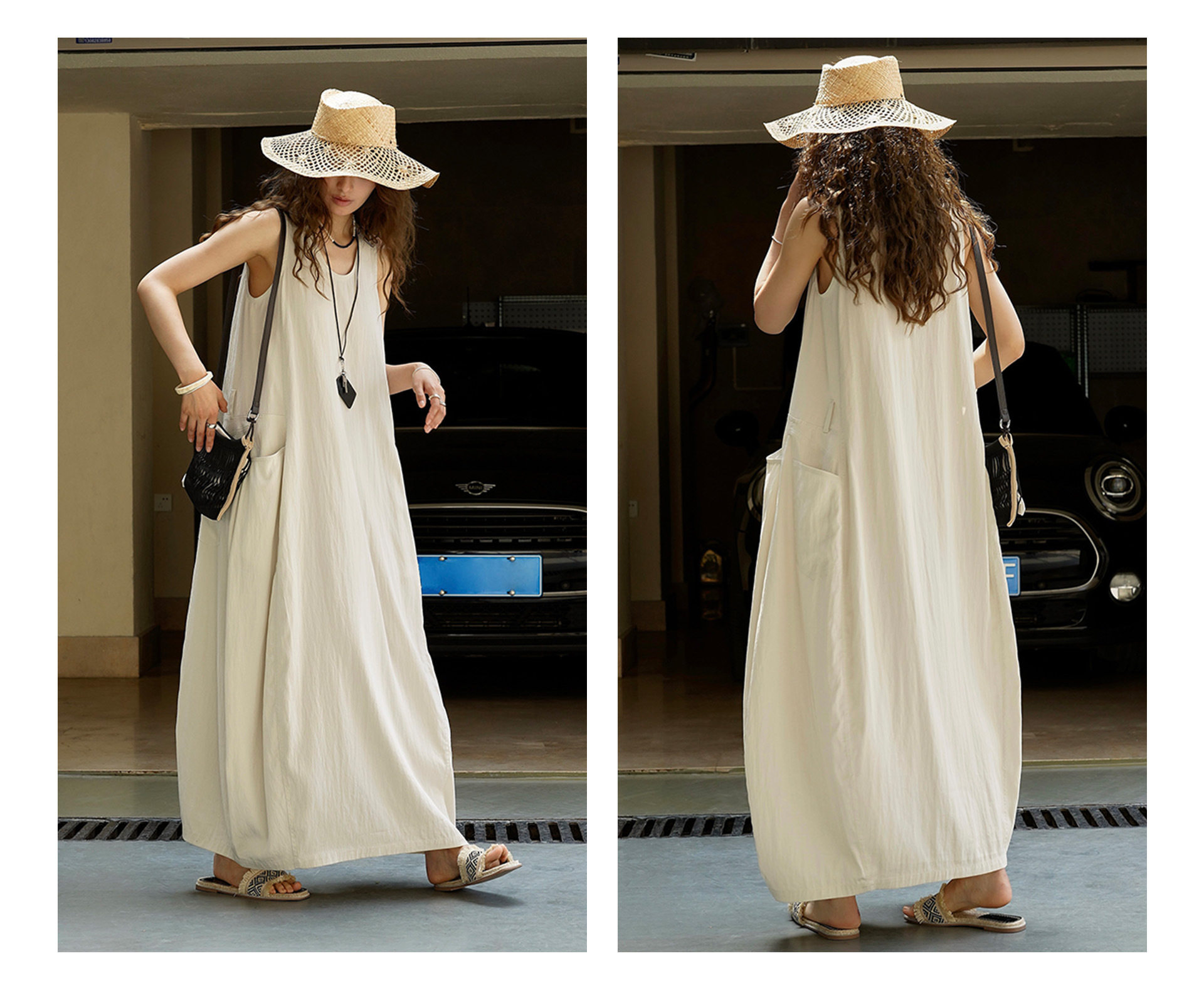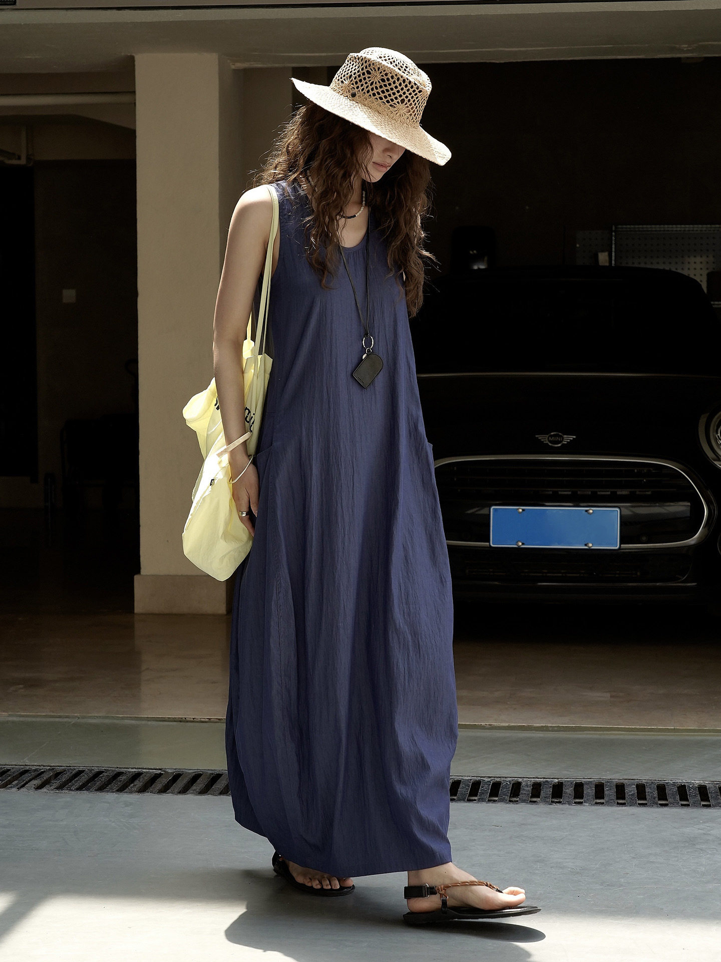 【ワンピース】夏新作 フレンチヴィンテージ テンセル素材 デニム風 ダブルポケット ノースリーブワンピース【JZシリーズ】