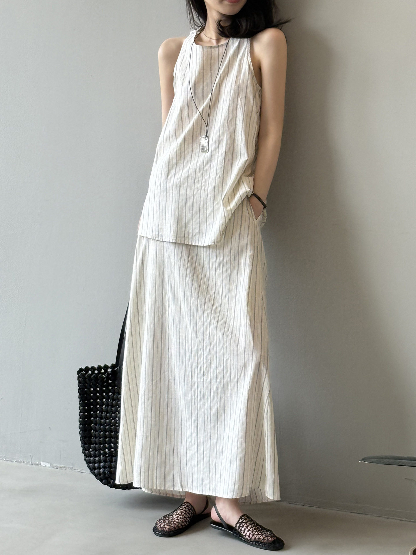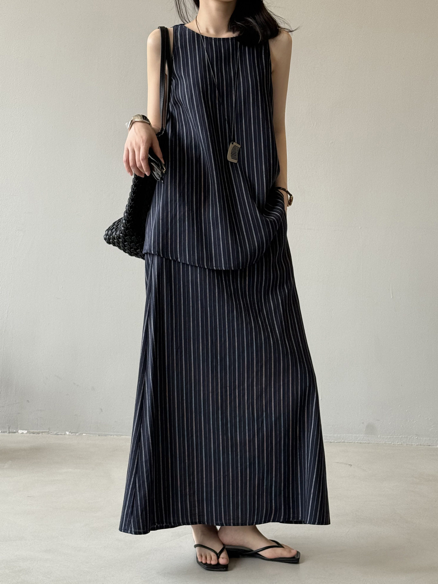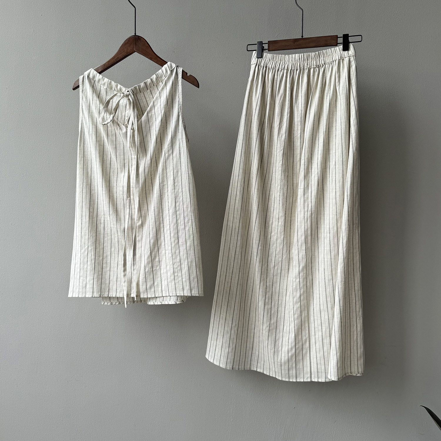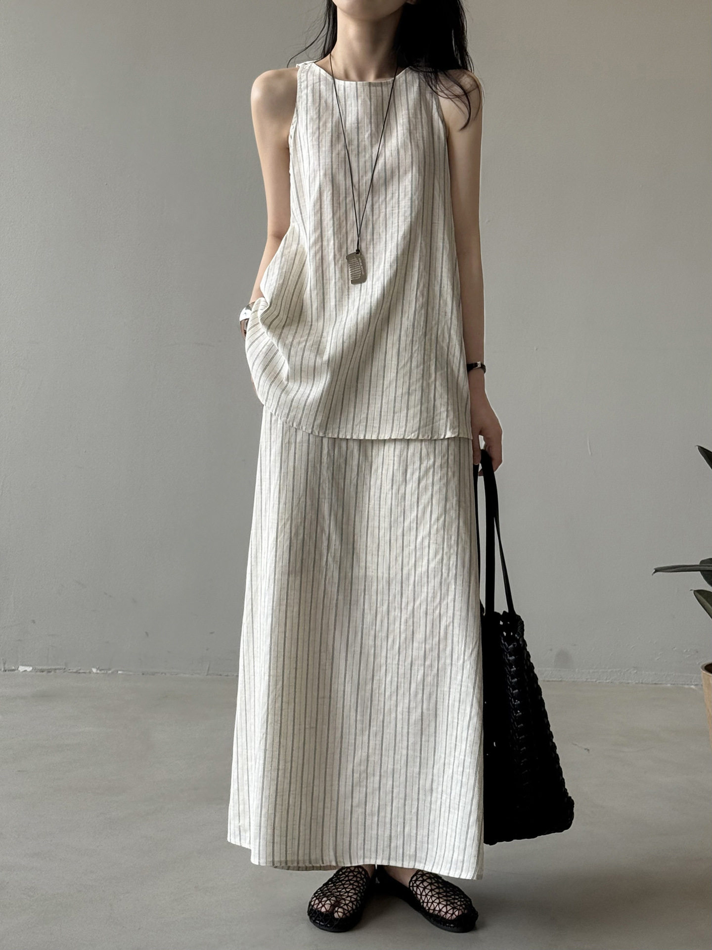 2点セット!【セットアップ】夏新作 テンセルリネン ストライプ柄 タンクトップ+上品 スカート 上下セット【JZシリーズ】