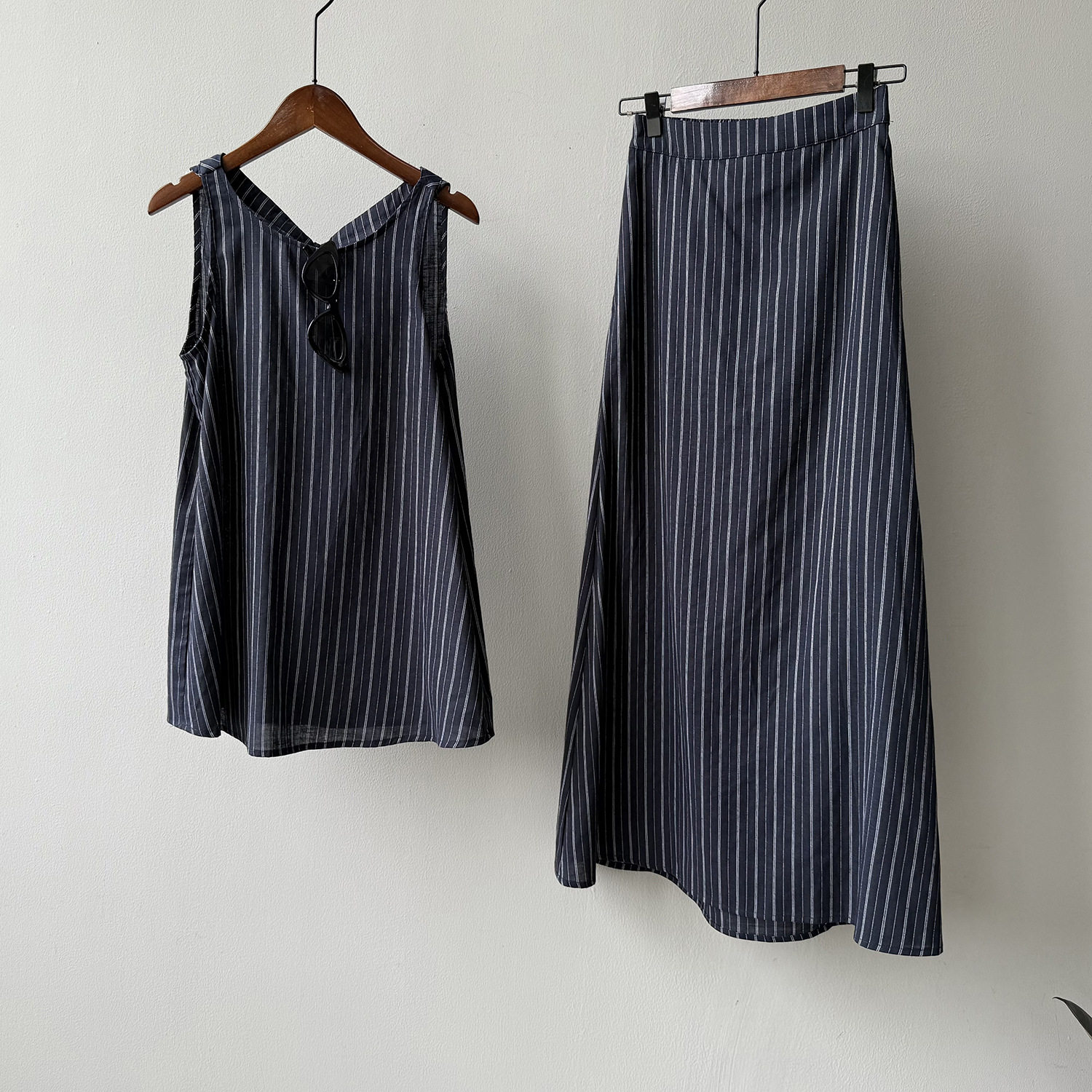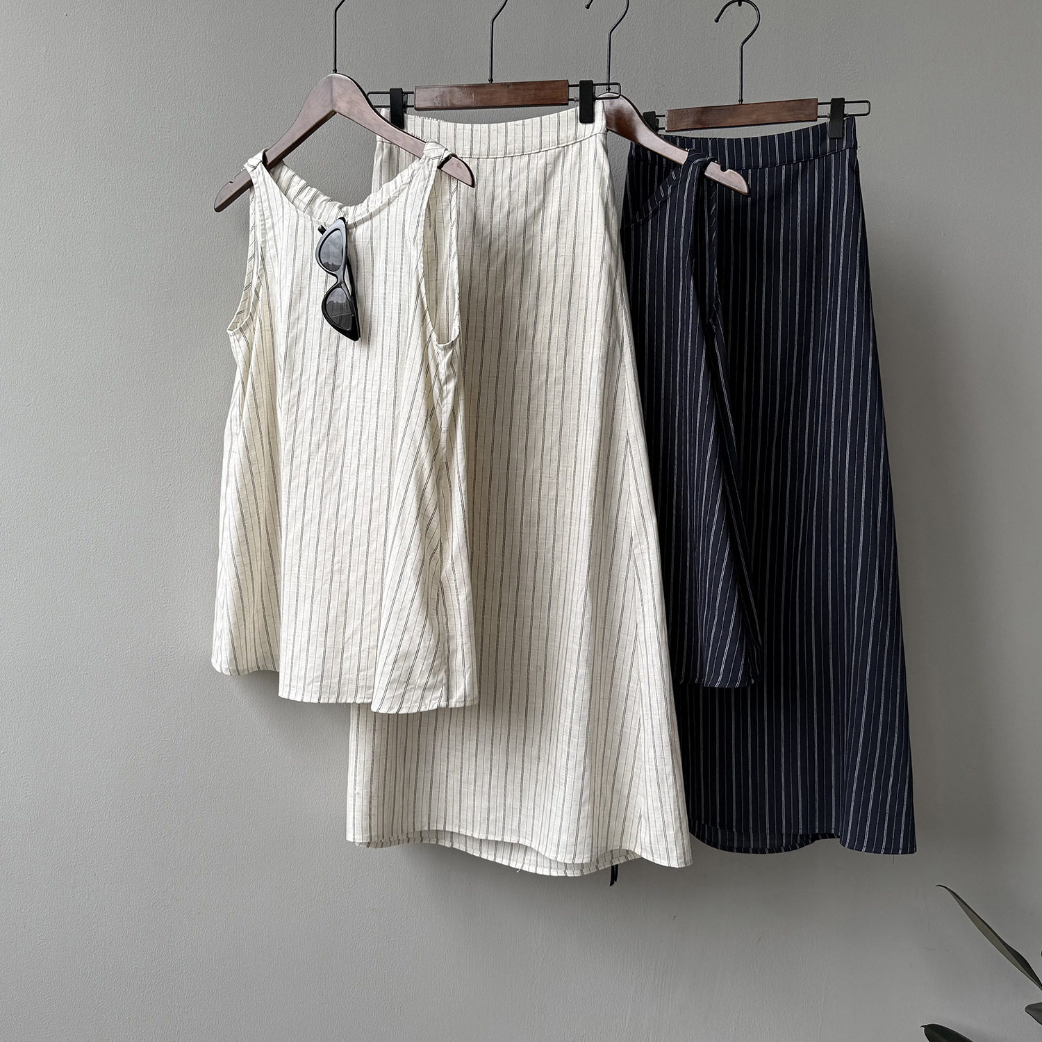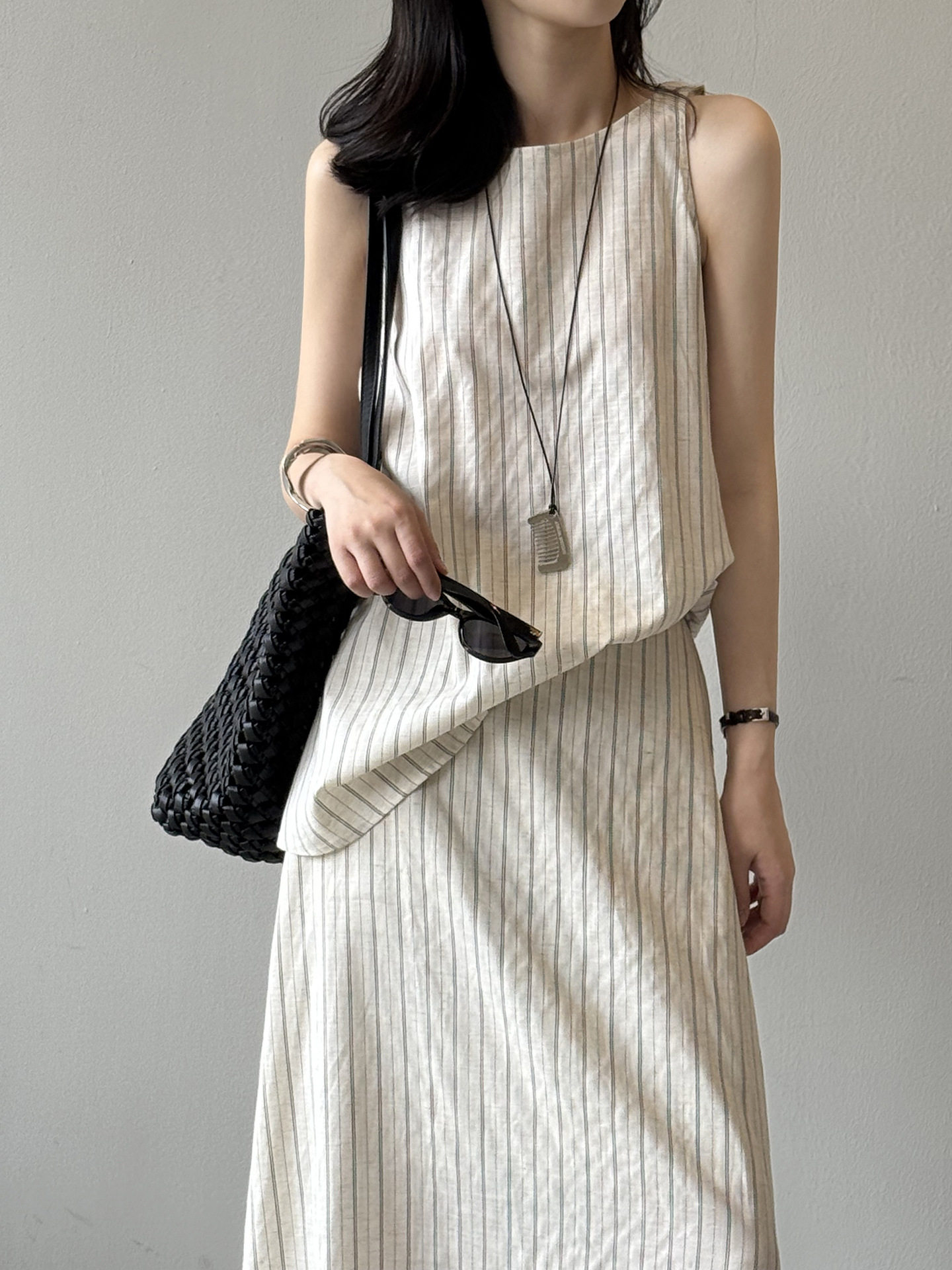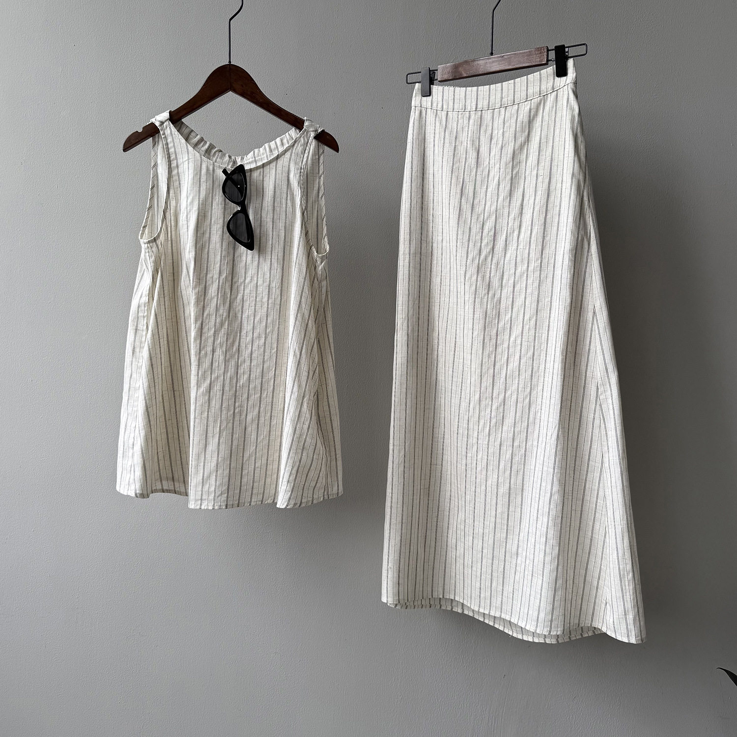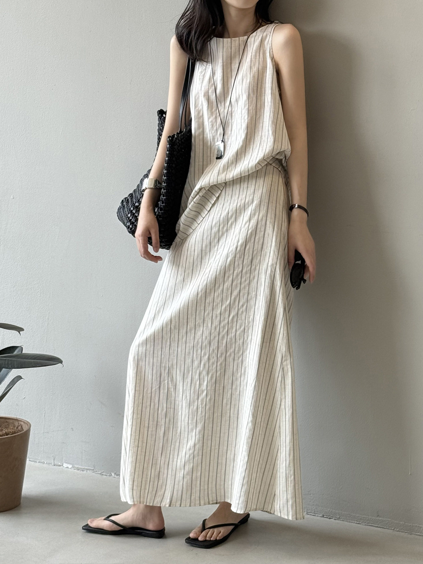 2点セット!【セットアップ】夏新作 テンセルリネン ストライプ柄 タンクトップ+上品 スカート 上下セット【JZシリーズ】