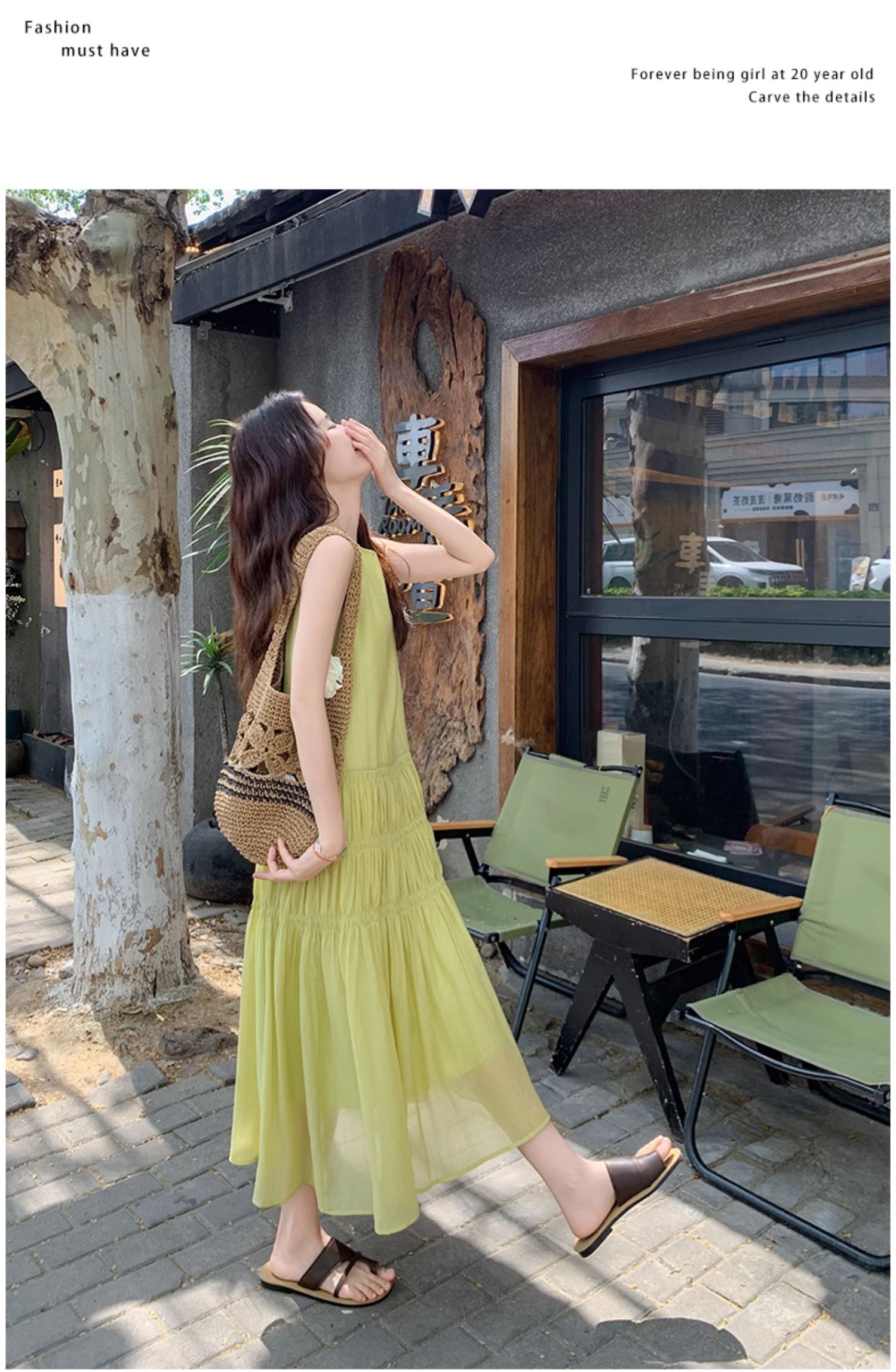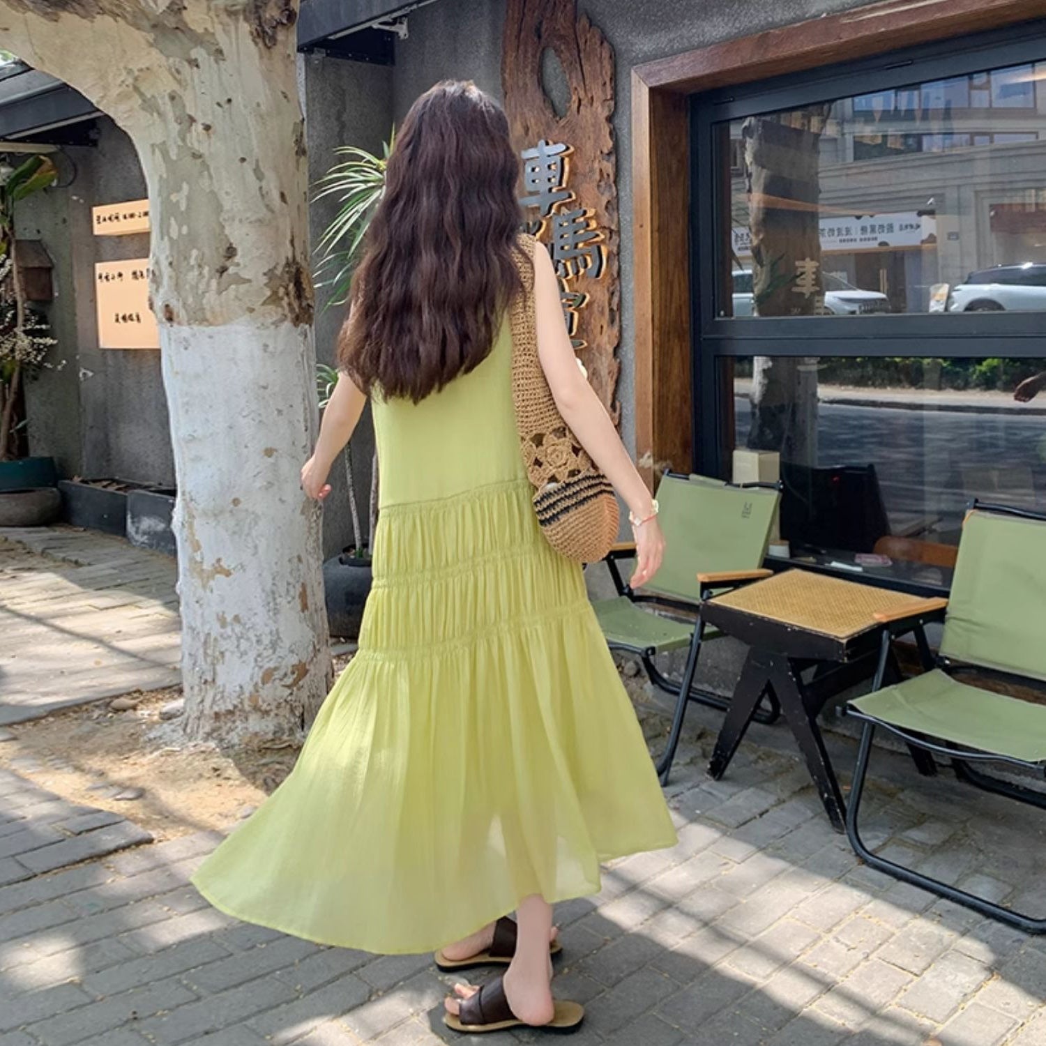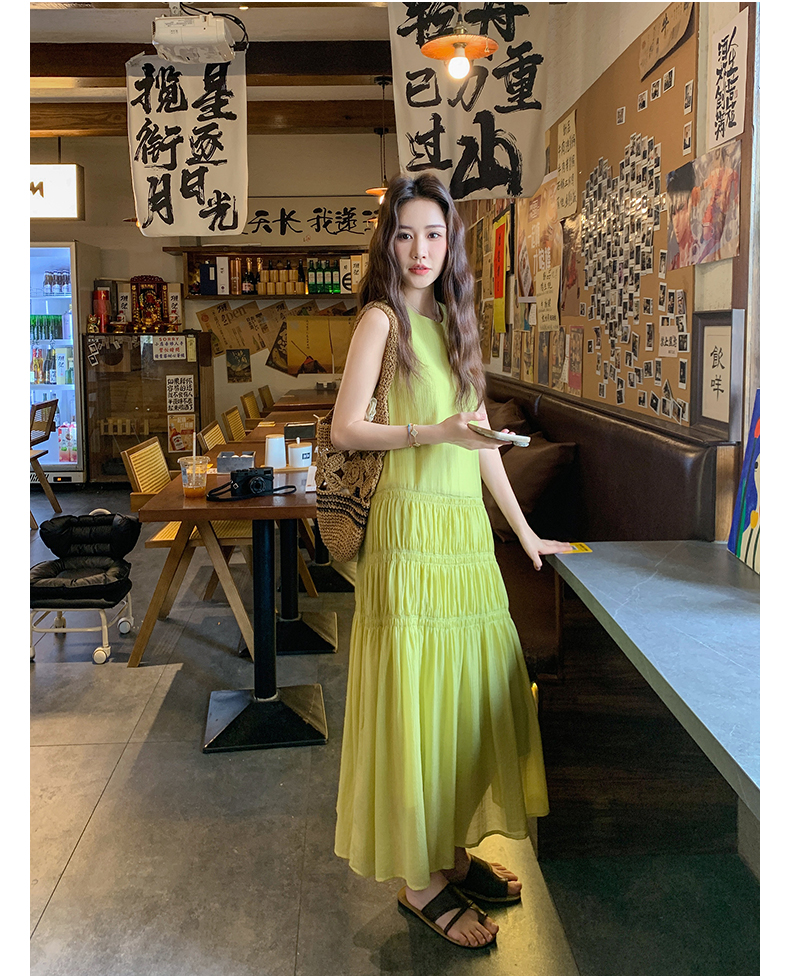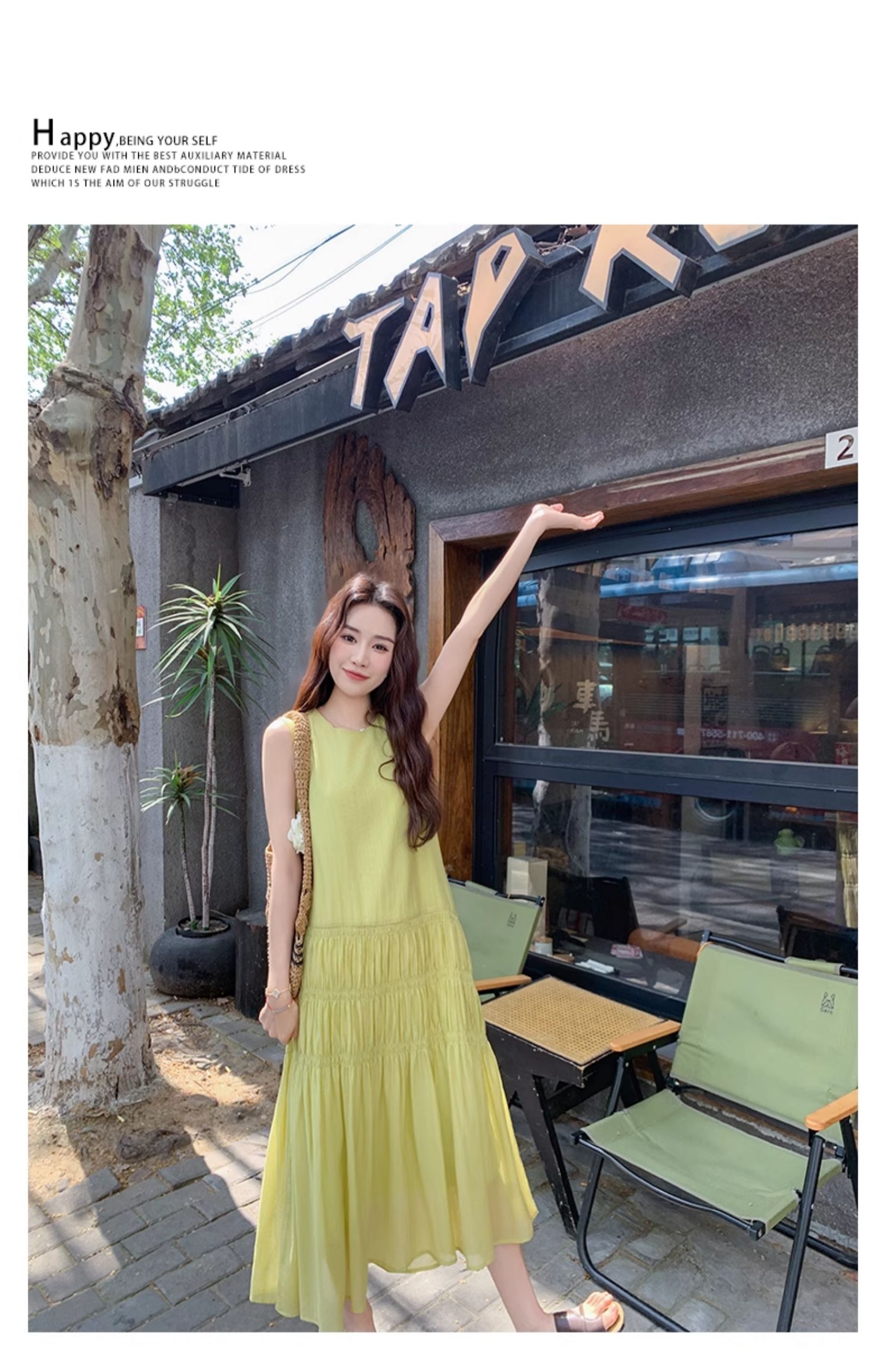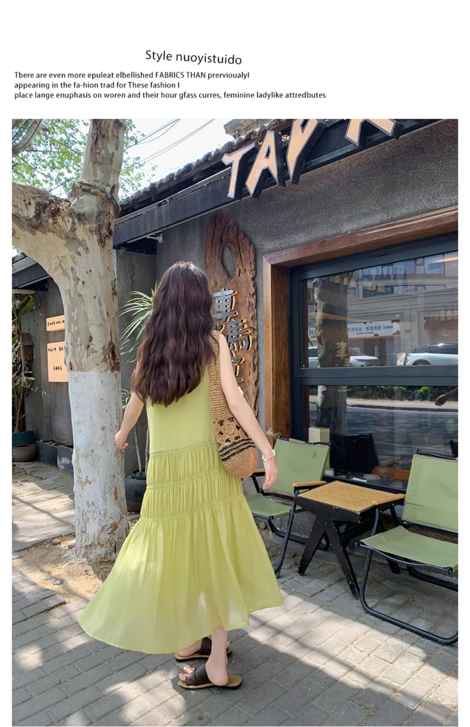 【ワンピース】気質スタイル 夏 海辺リゾート風 ギャザー入りシフォンロングドレス ノースリーブワンピース