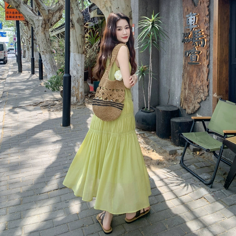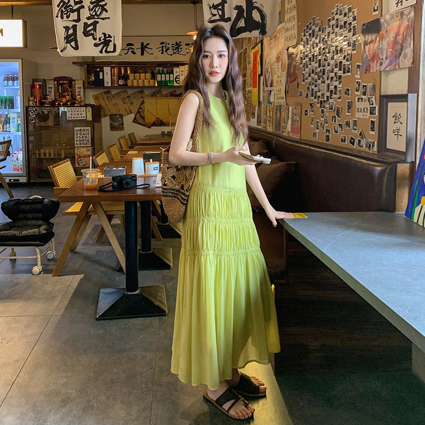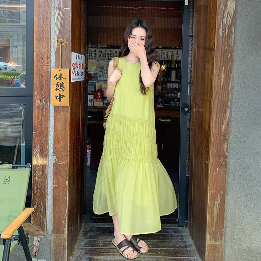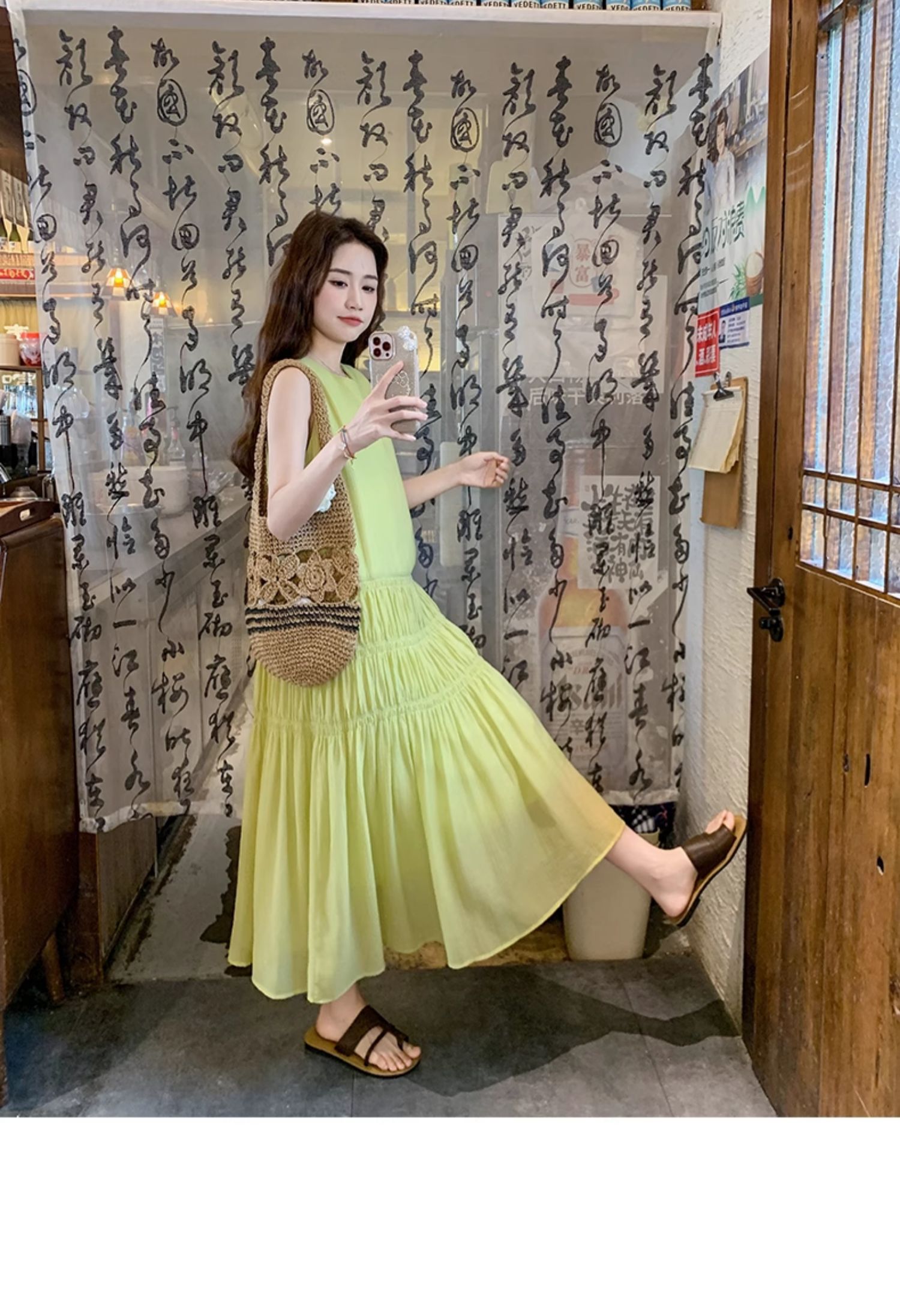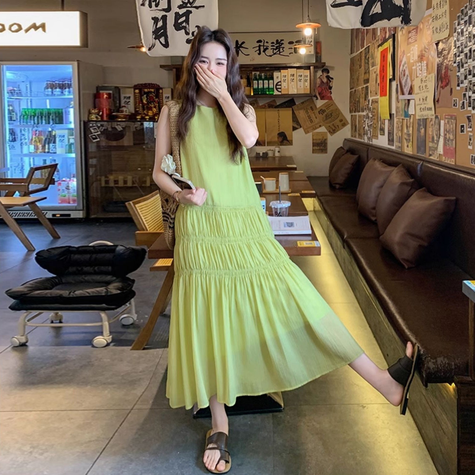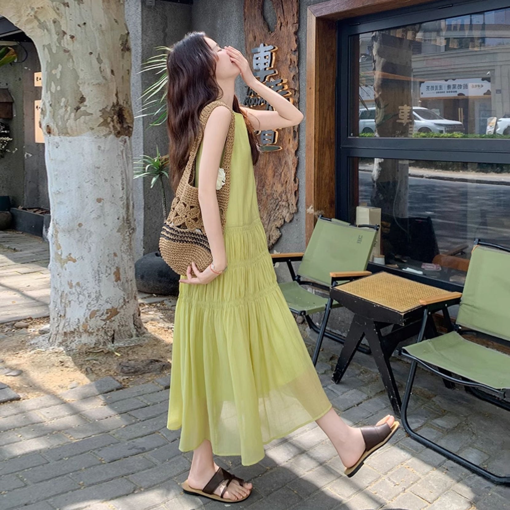【ワンピース】気質スタイル 夏 海辺リゾート風 ギャザー入りシフォンロングドレス ノースリーブワンピース