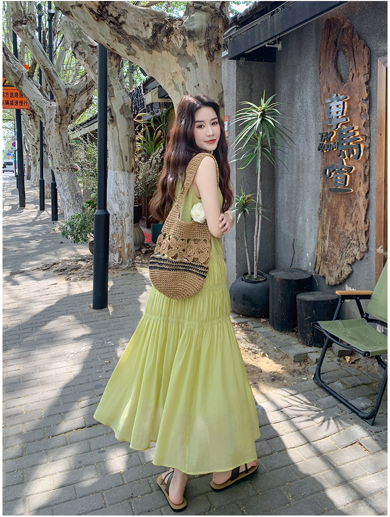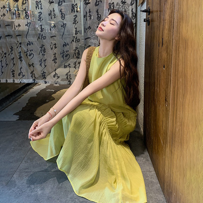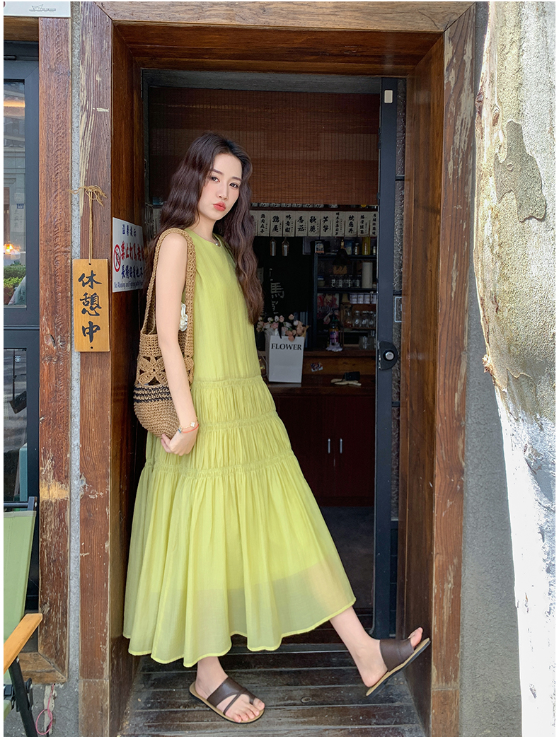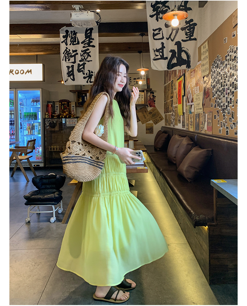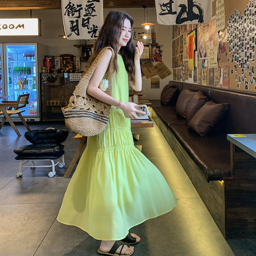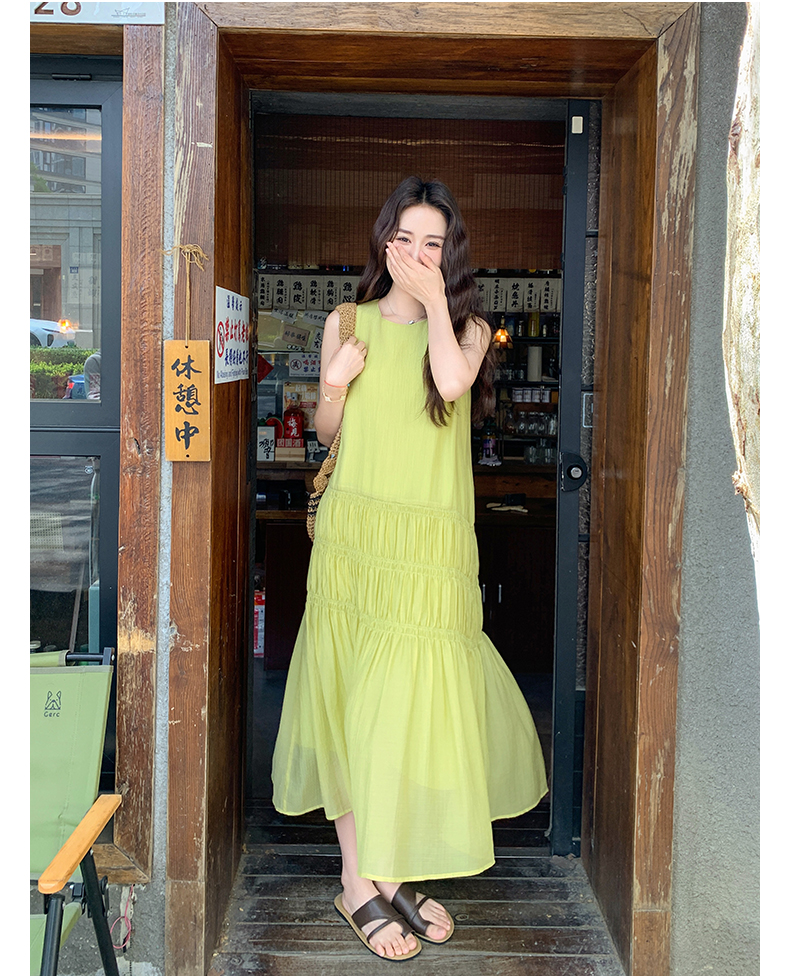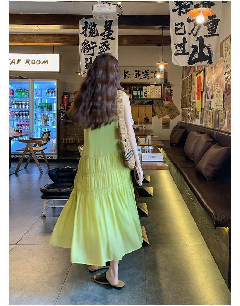 【ワンピース】気質スタイル 夏 海辺リゾート風 ギャザー入りシフォンロングドレス ノースリーブワンピース