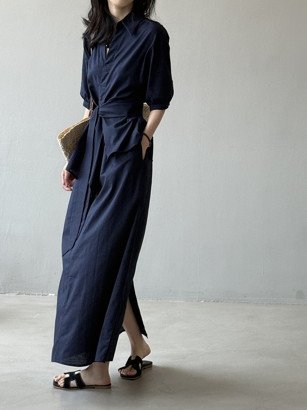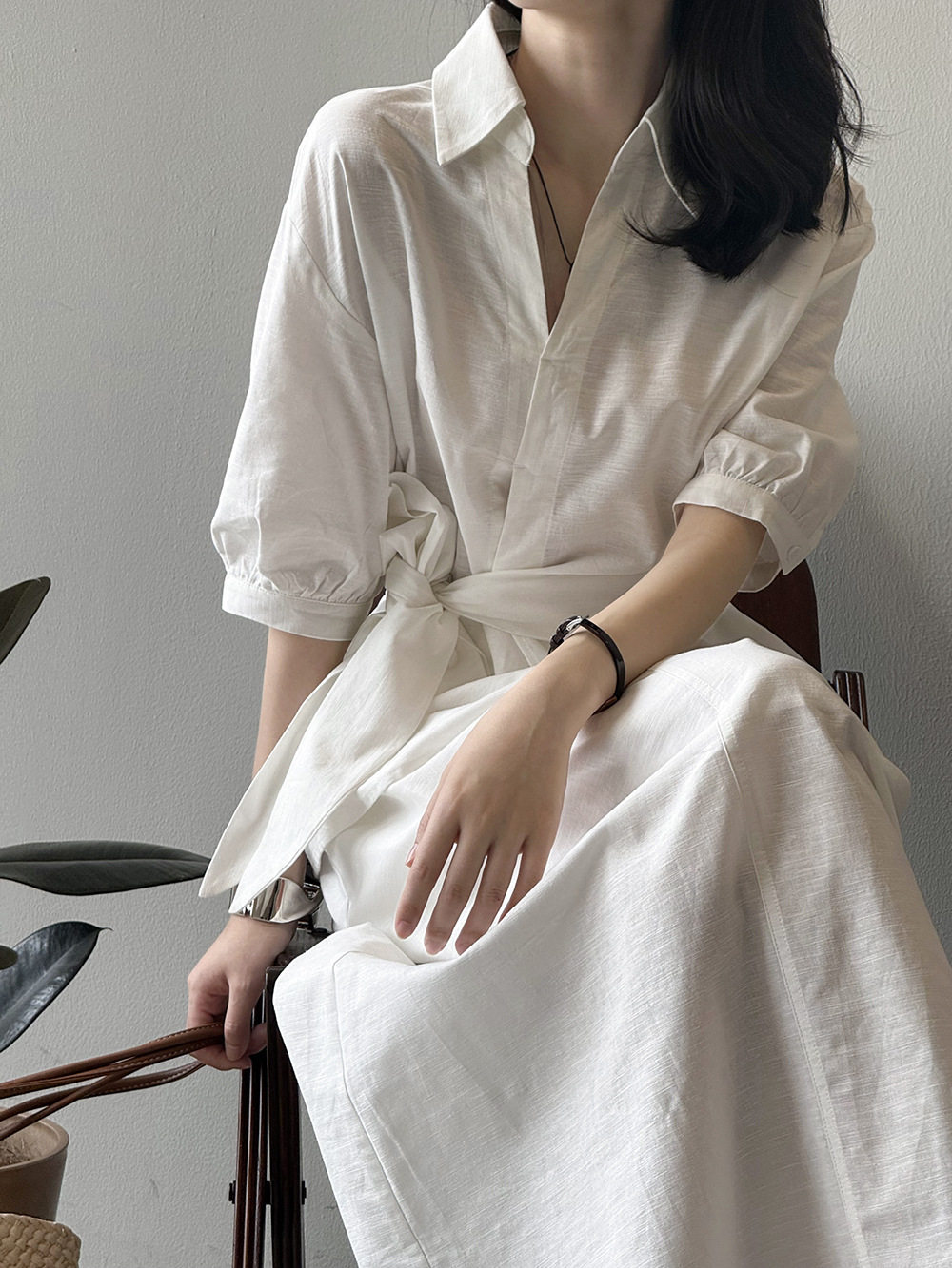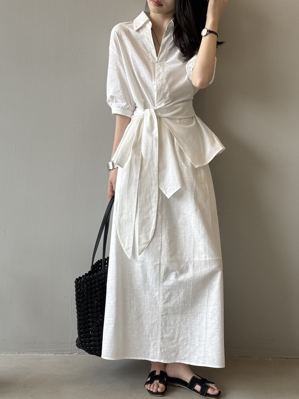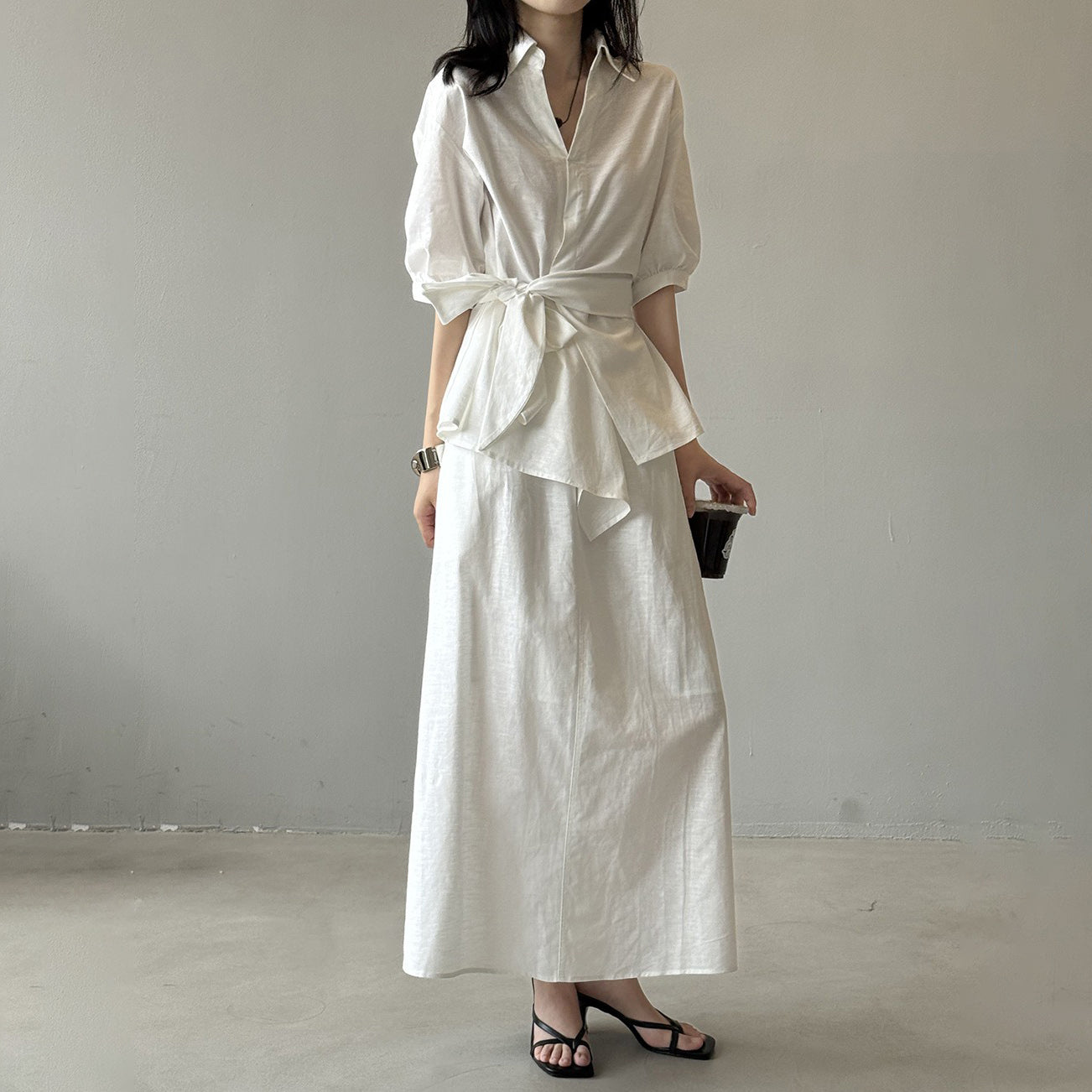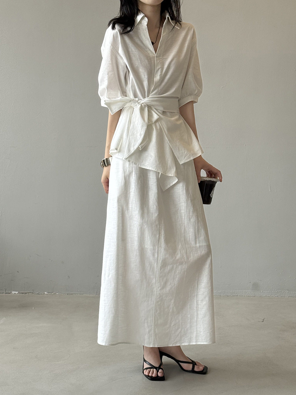 【セットアップ】フレンチエレガンス 麻素材ウエストリボンシャツ+ミモレ丈スカート 上下セット【JZシリーズ】