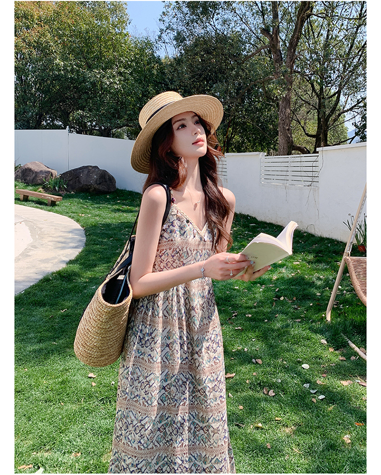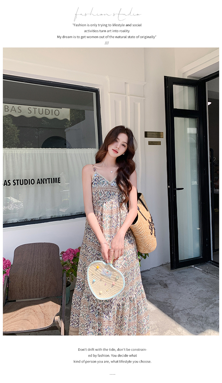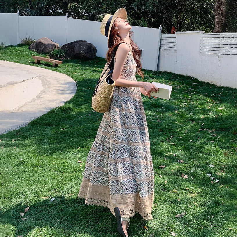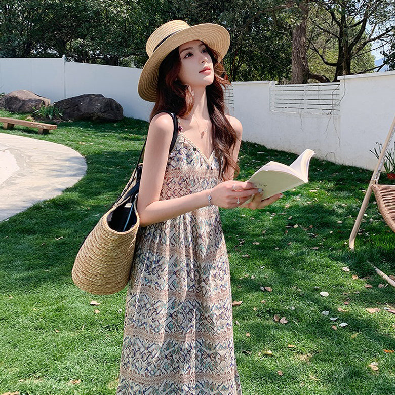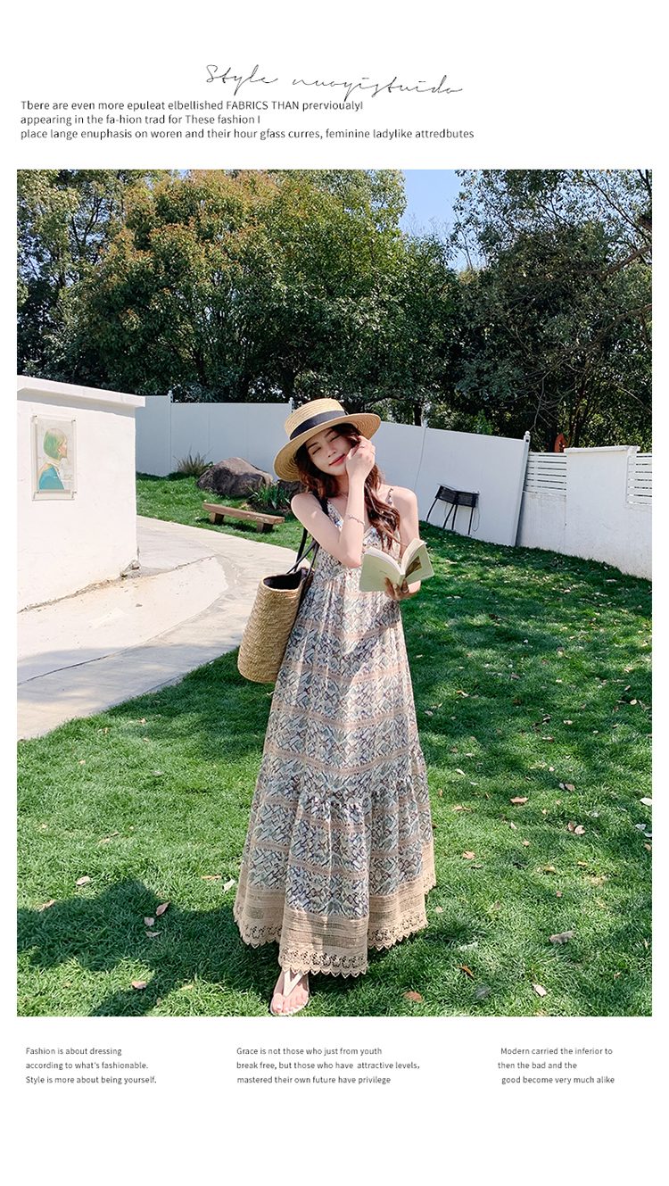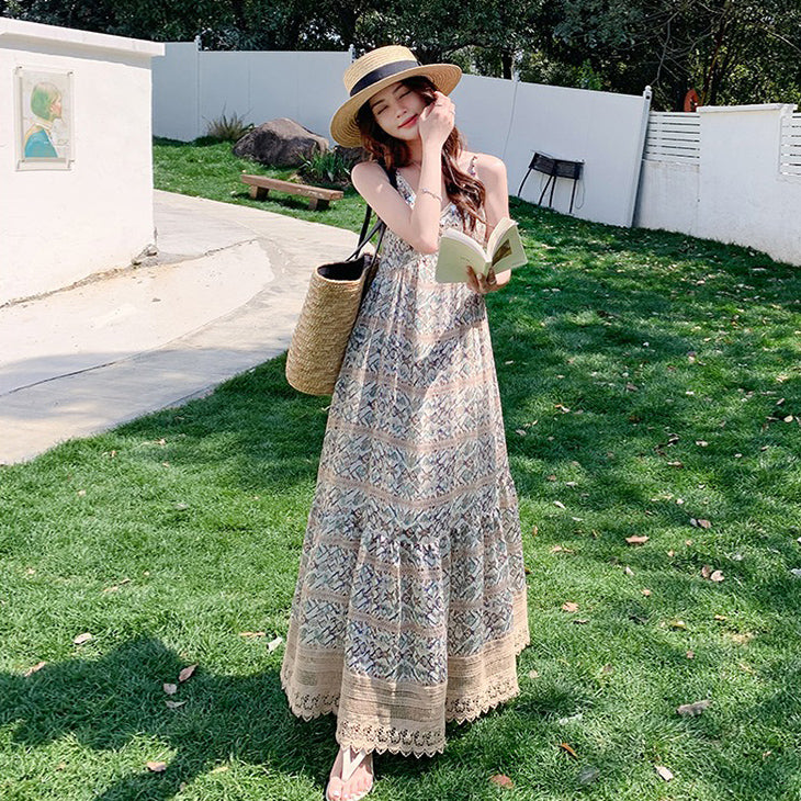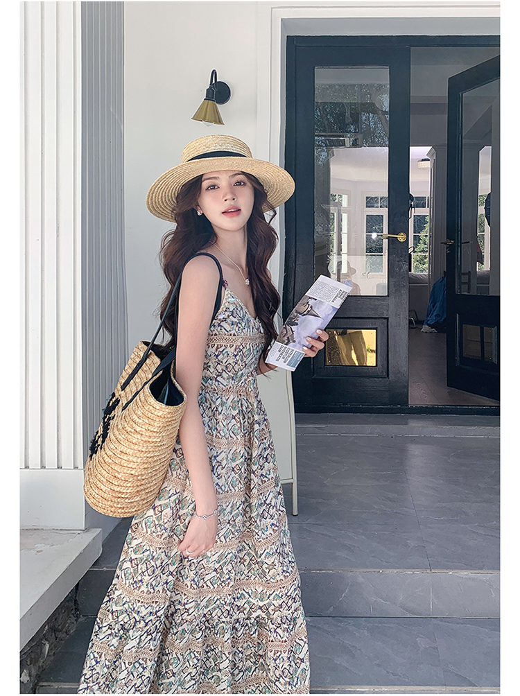 【ワンピース】バカンス映え ボヘミアン ノースリーブワンピース 花柄ロング丈 夏新作 リゾートスタイル【SHシリーズ】