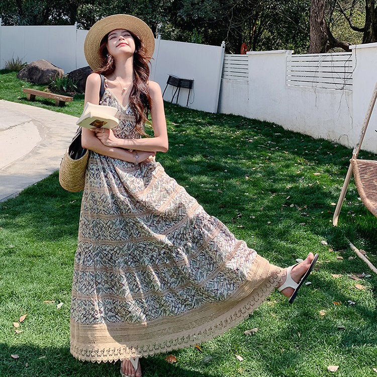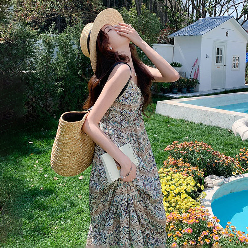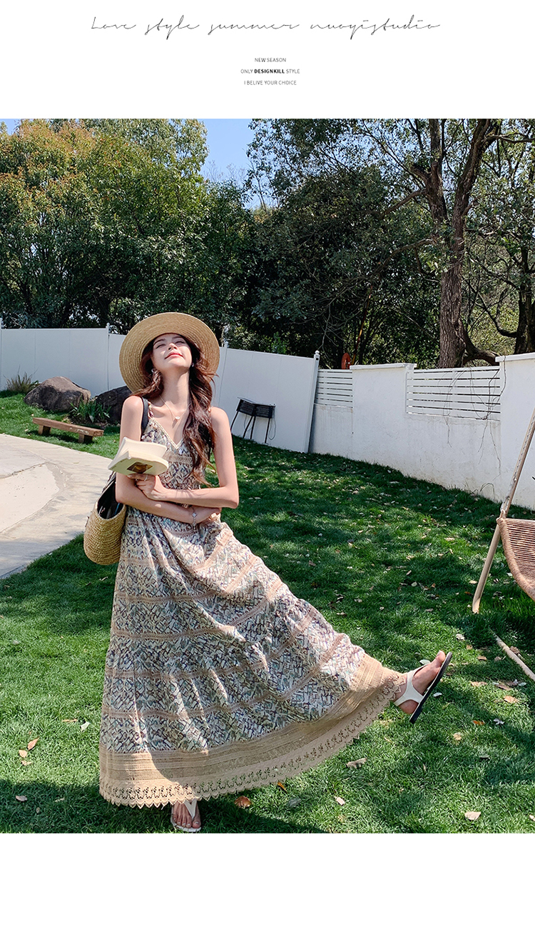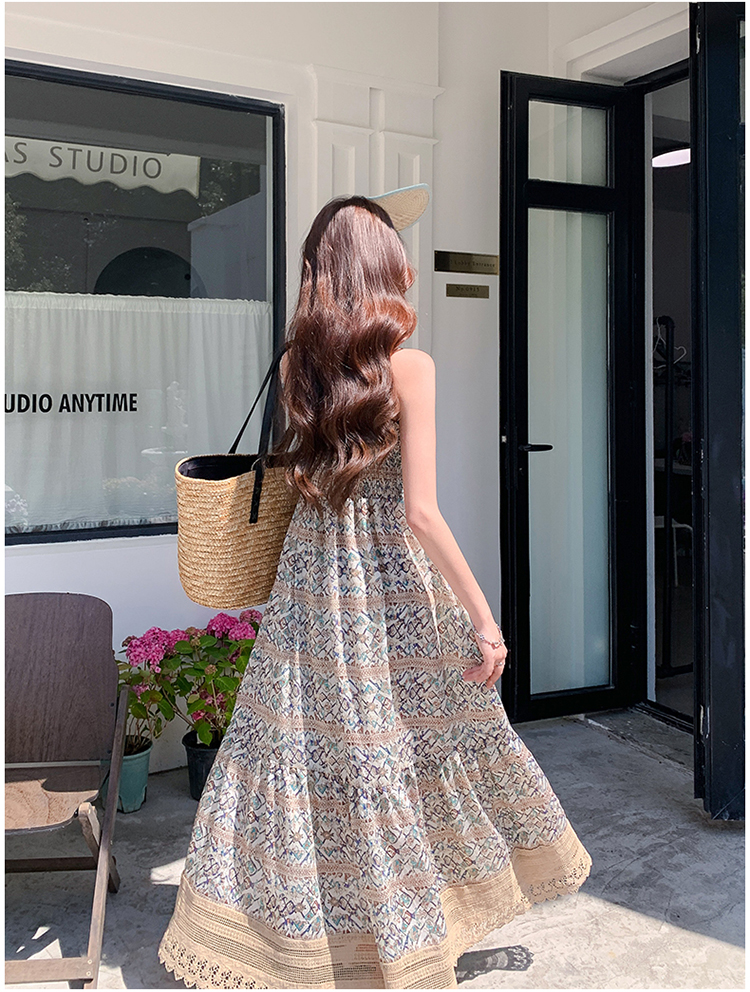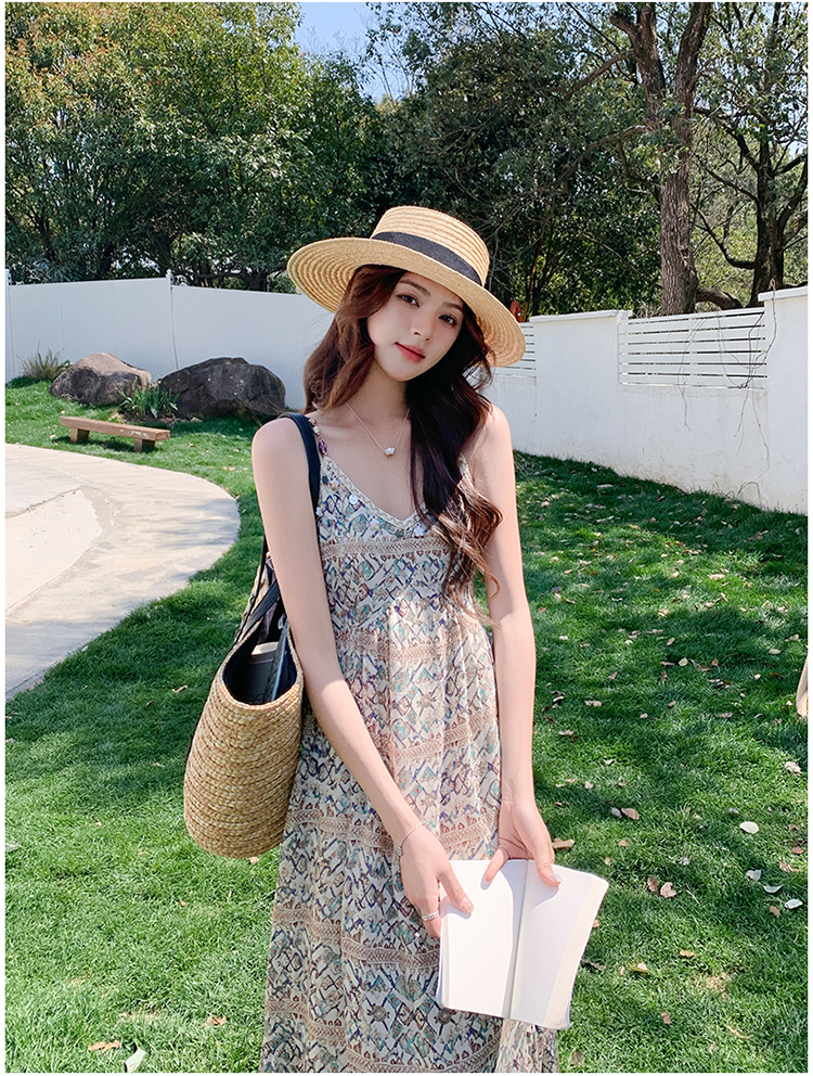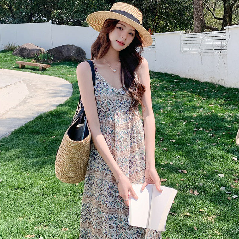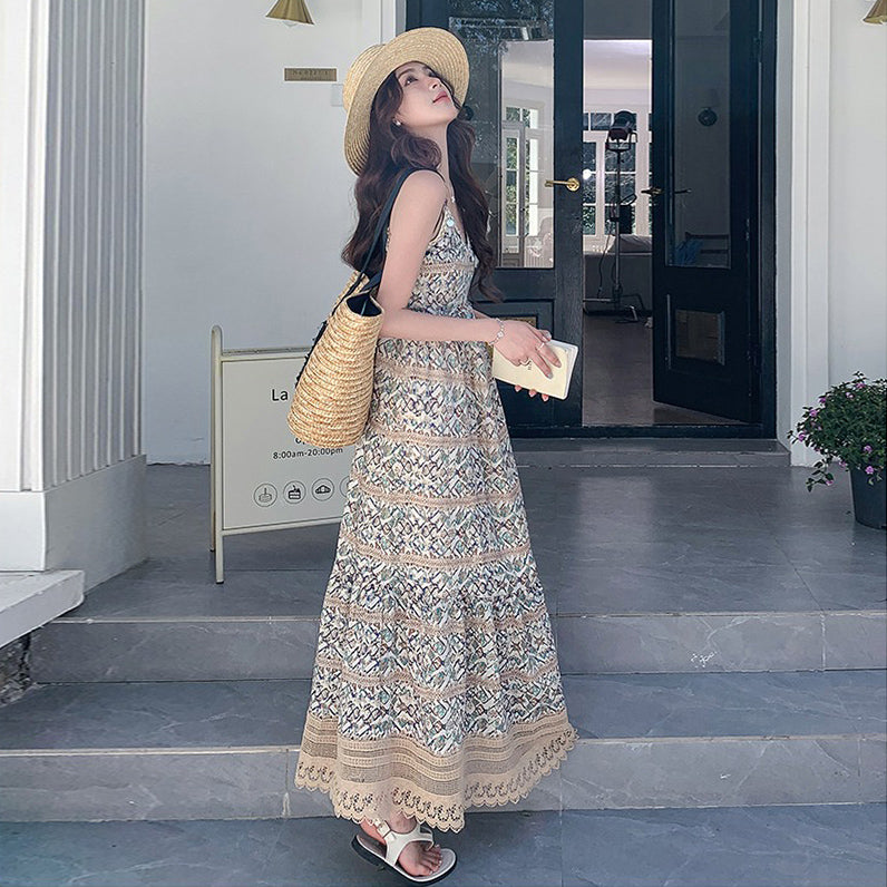 【ワンピース】バカンス映え ボヘミアン ノースリーブワンピース 花柄ロング丈 夏新作 リゾートスタイル【SHシリーズ】
