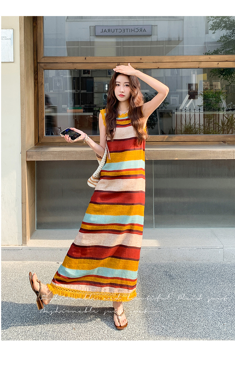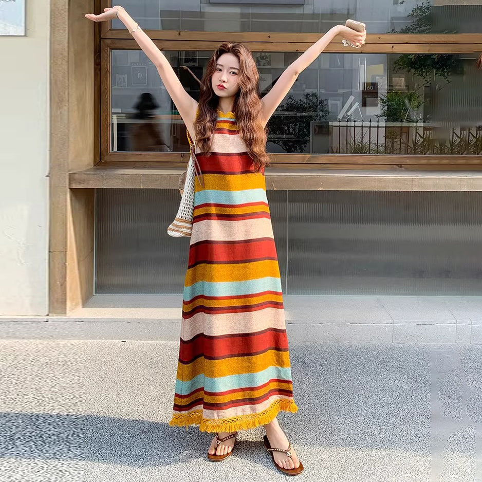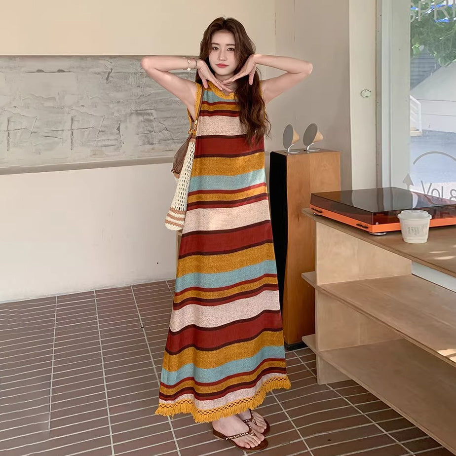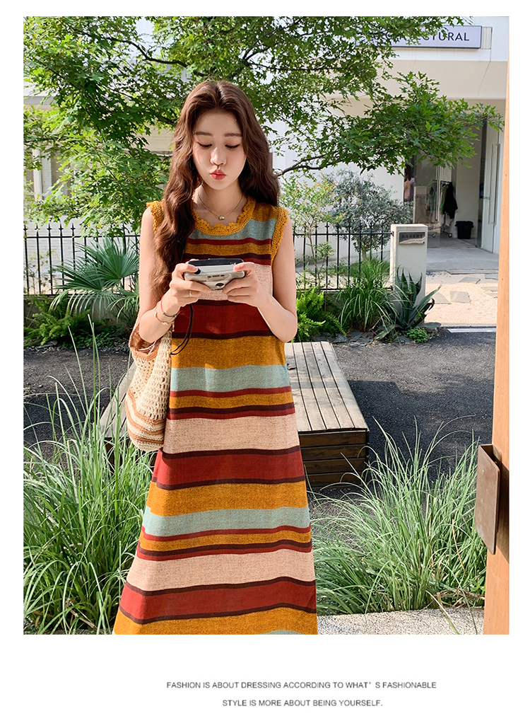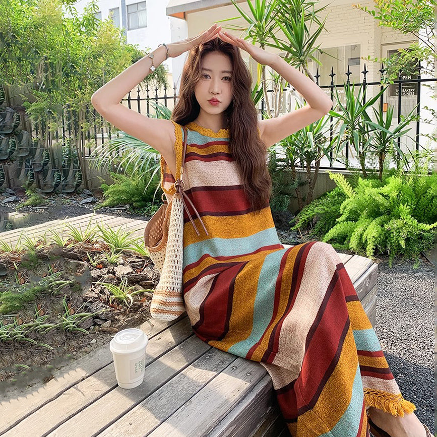 【ワンピース】韓国風ストライプ柄 ゆったりシルエット ドーパミン配色 ノースリーブワンピース【SHシリーズ】