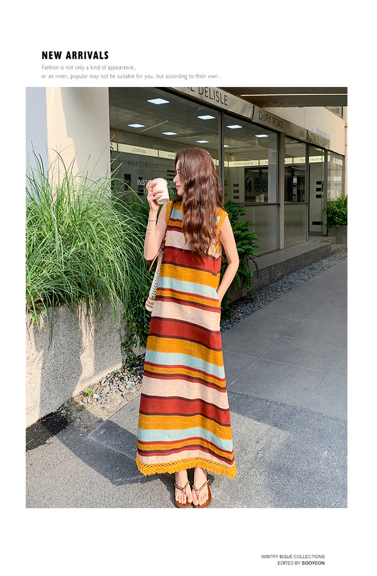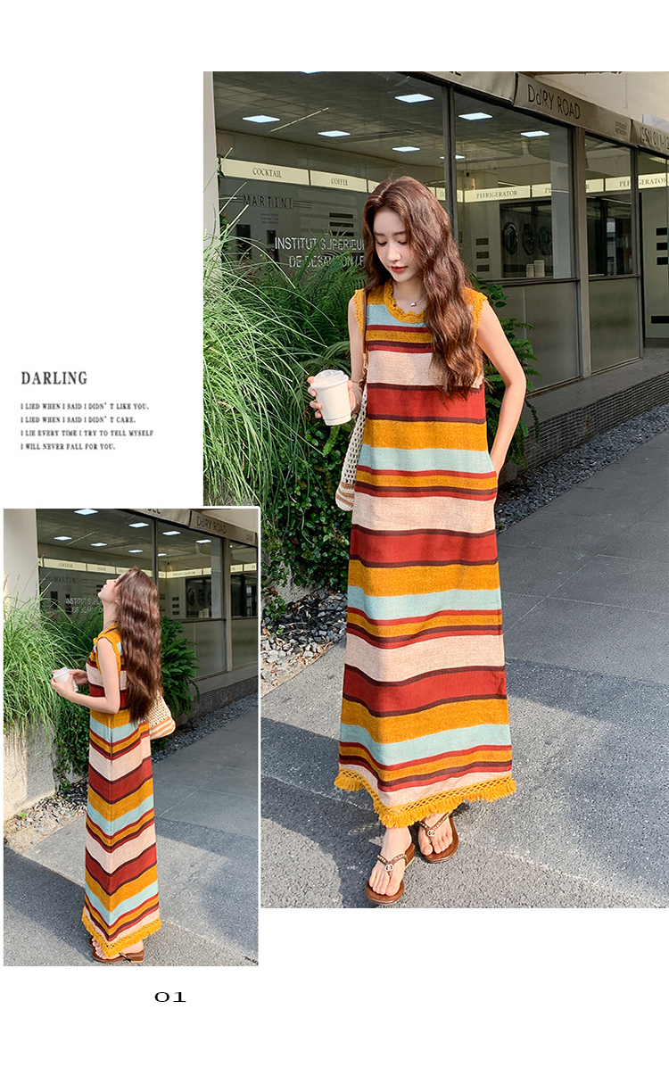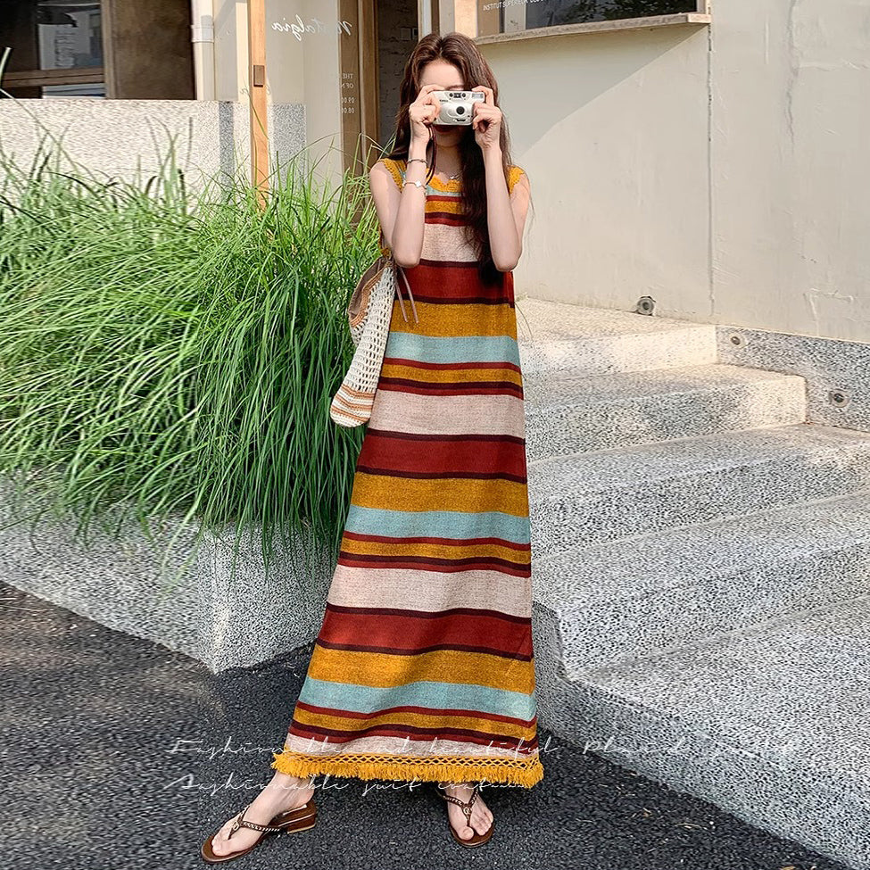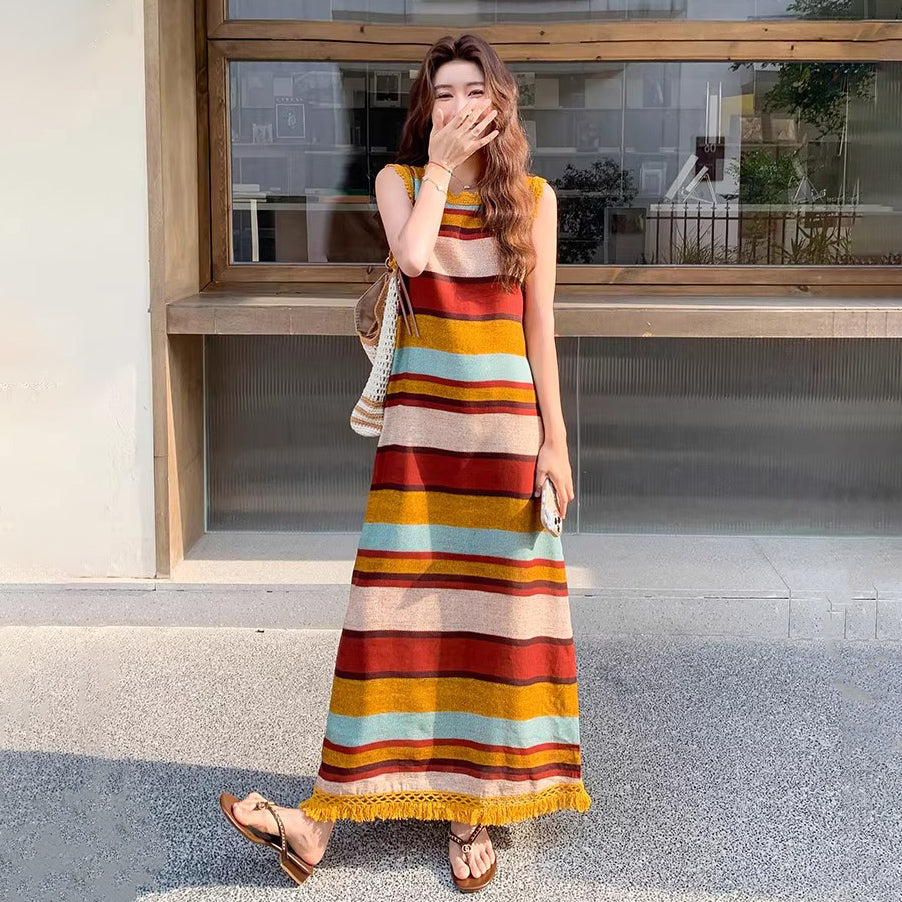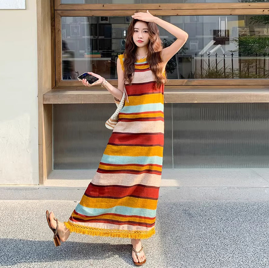 【ワンピース】韓国風ストライプ柄 ゆったりシルエット ドーパミン配色 ノースリーブワンピース【SHシリーズ】