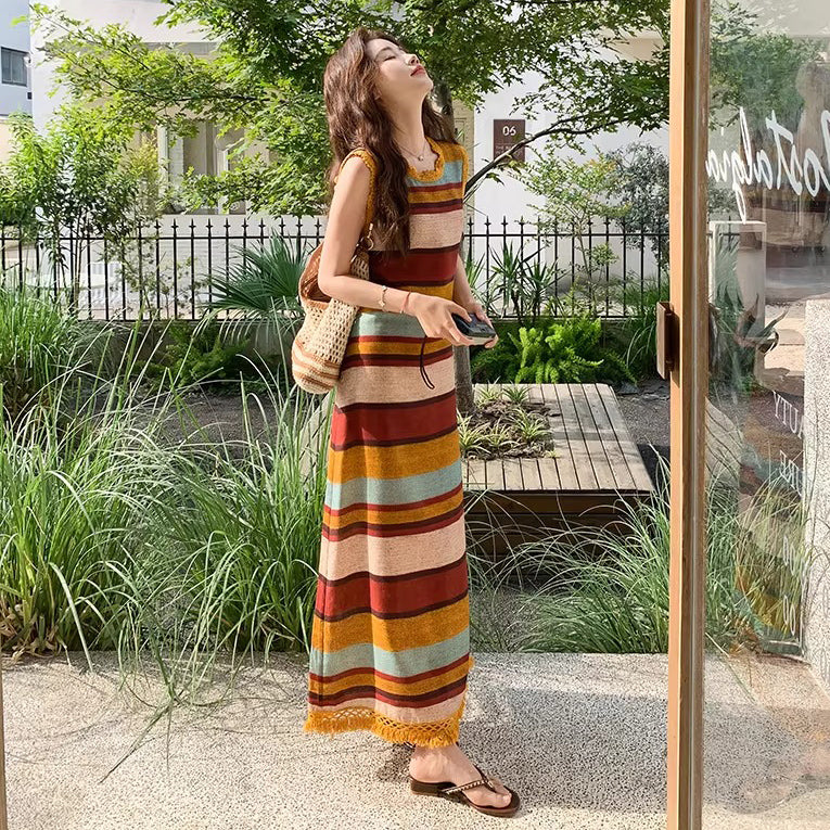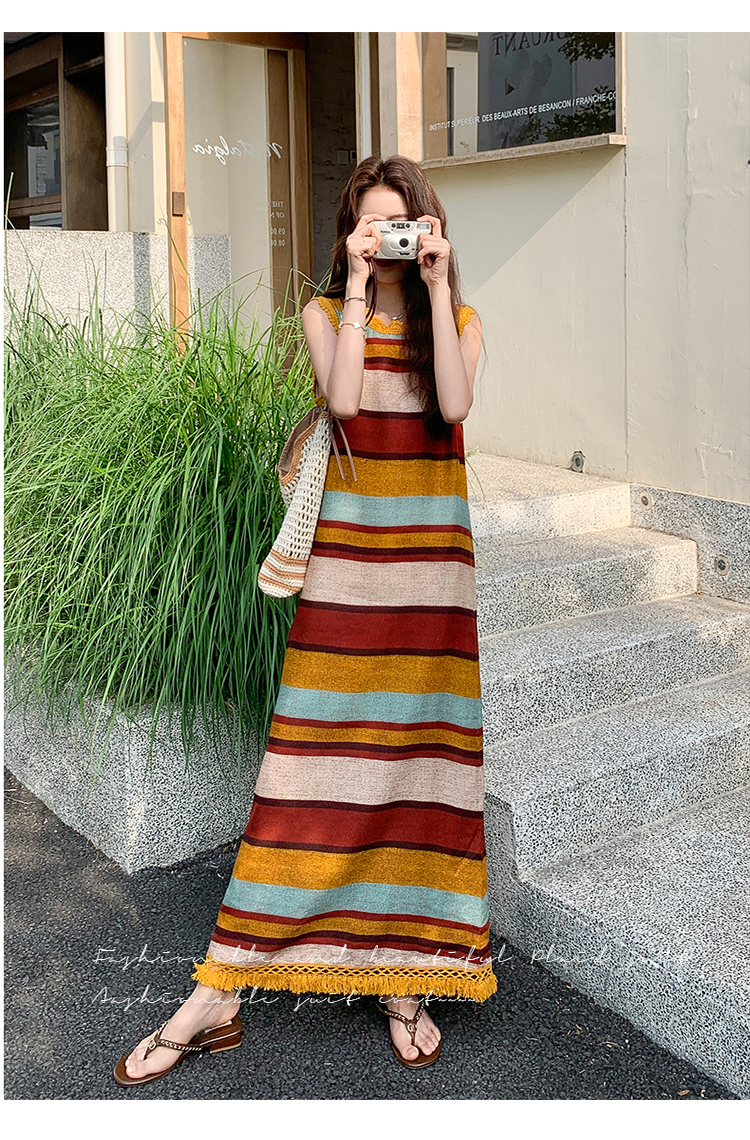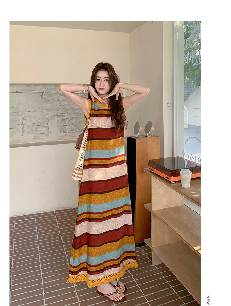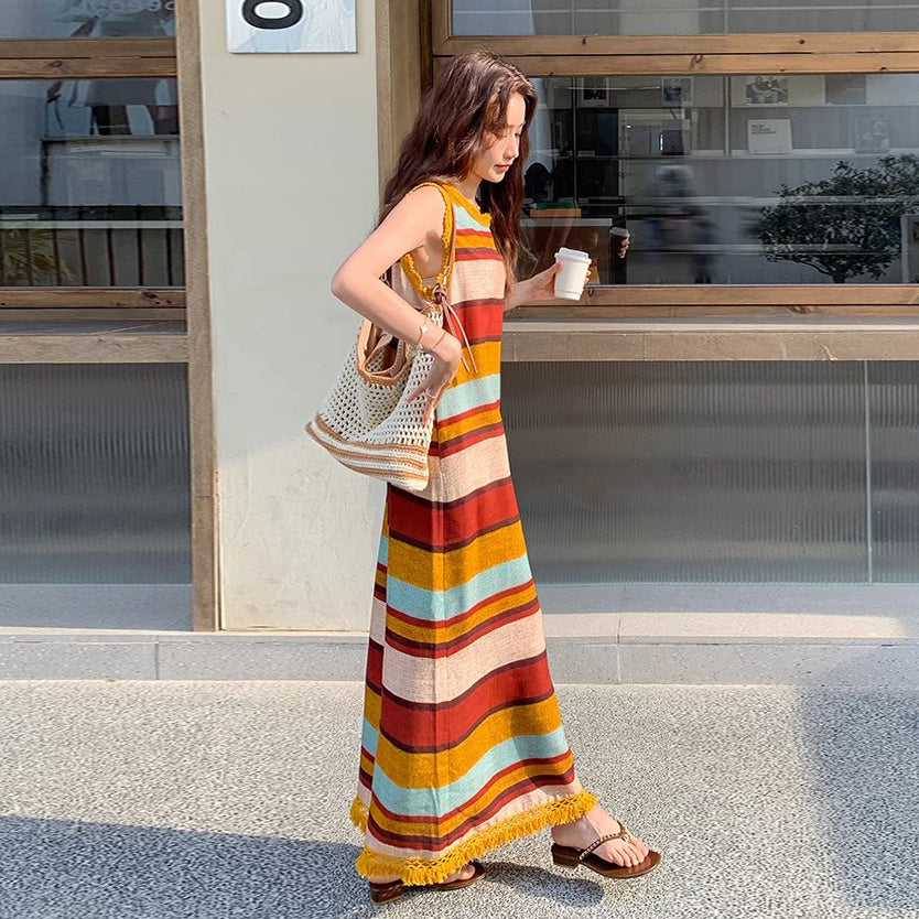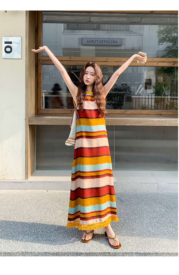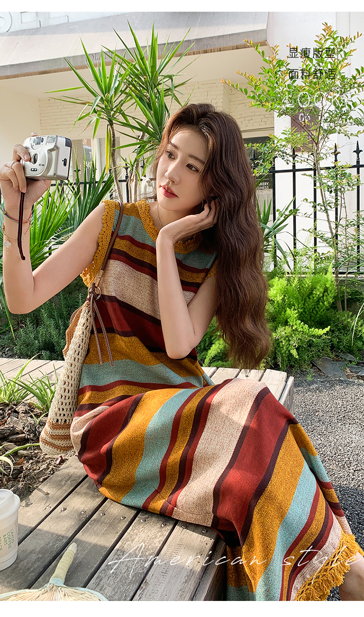【ワンピース】韓国風ストライプ柄 ゆったりシルエット ドーパミン配色 ノースリーブワンピース【SHシリーズ】