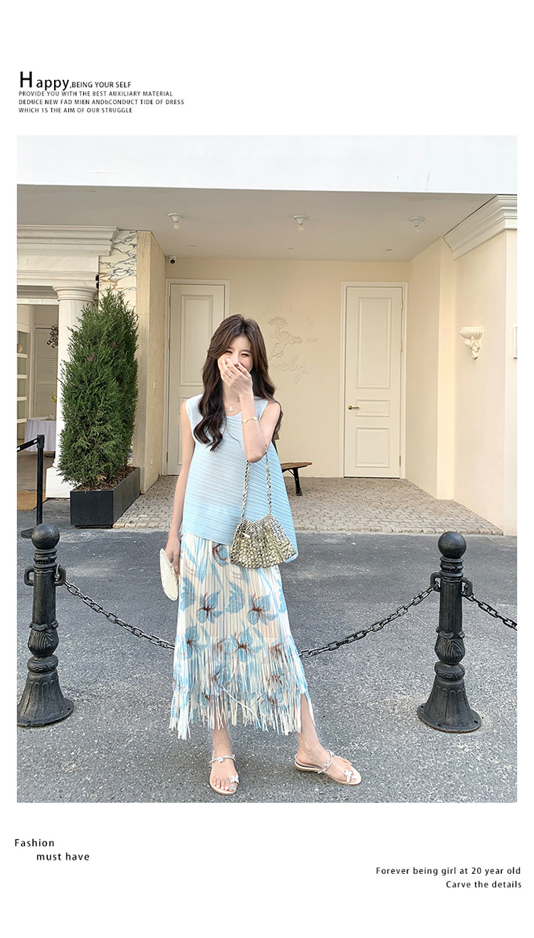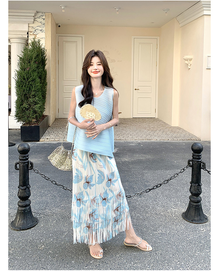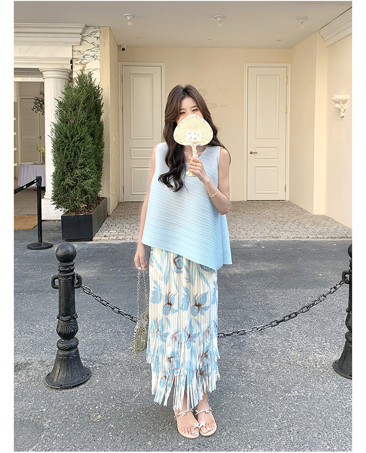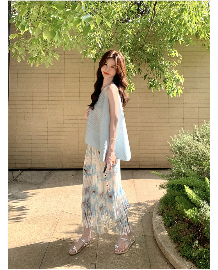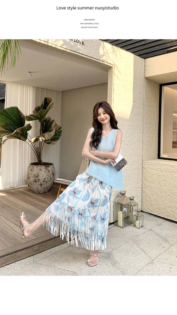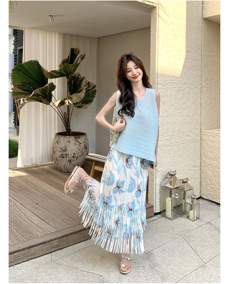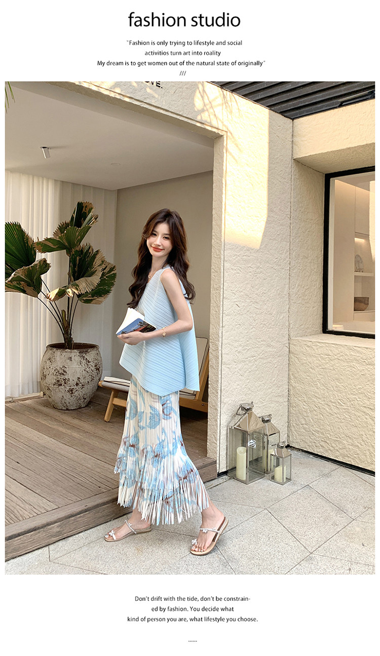 2点セット!【セットアップ】夏新作 涼しげ 韓国風 トップス+フリンジハイウエストスカート 上下セット【SHシリーズ】