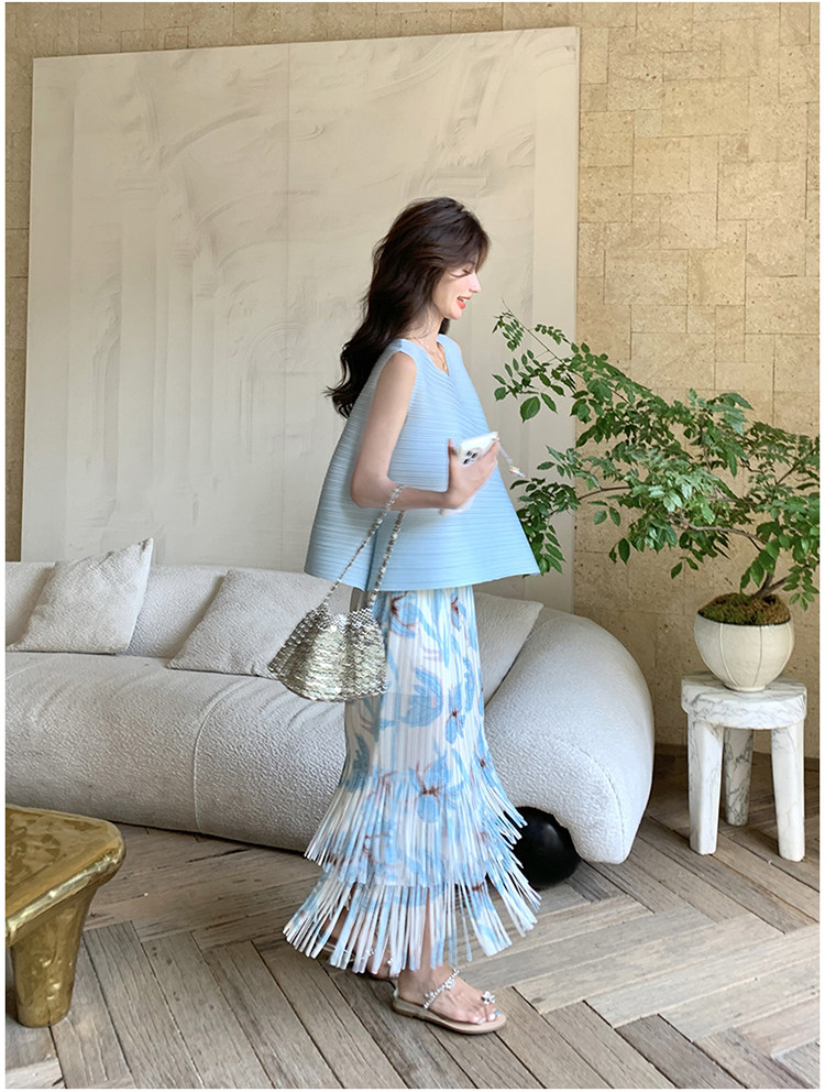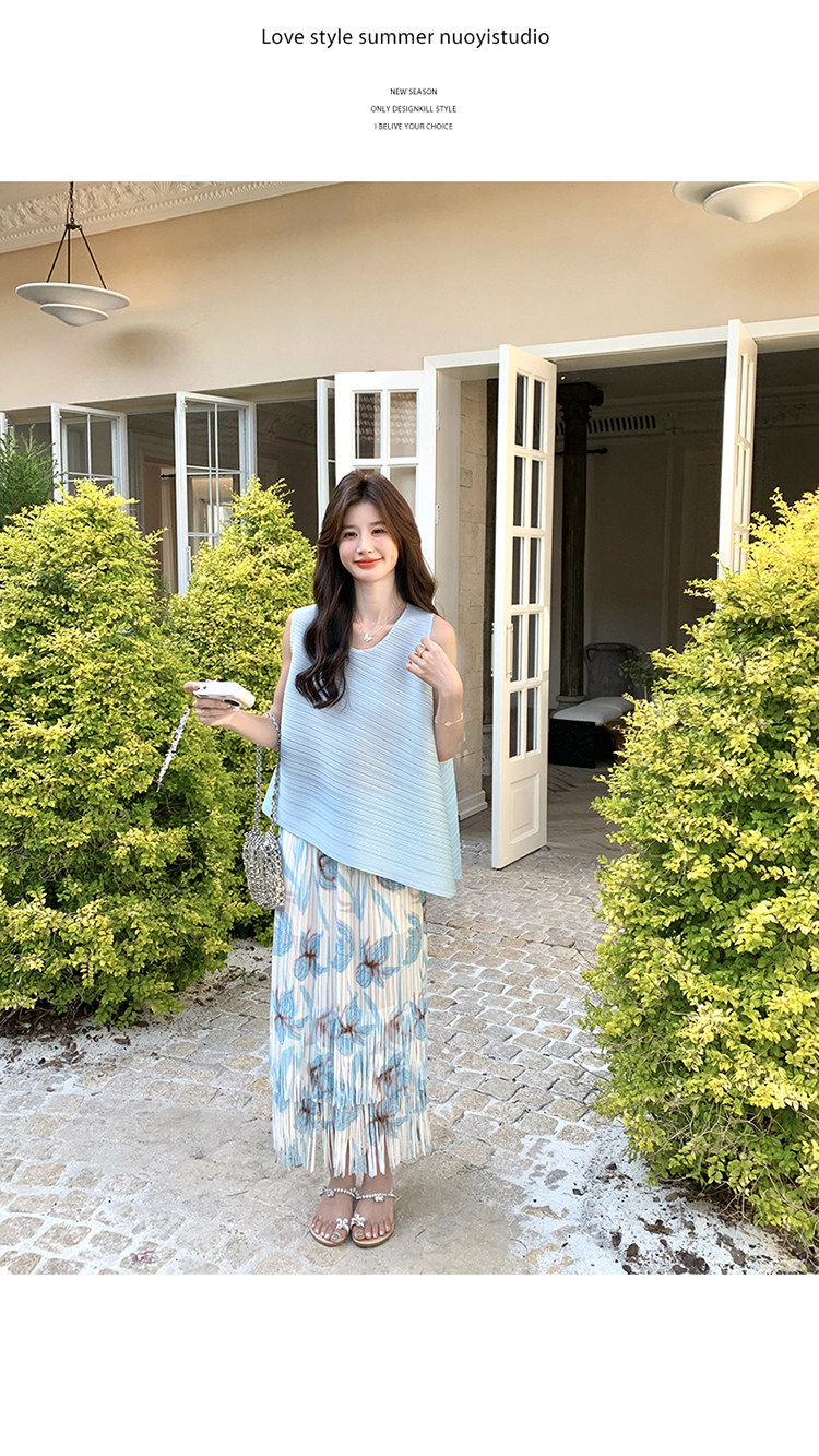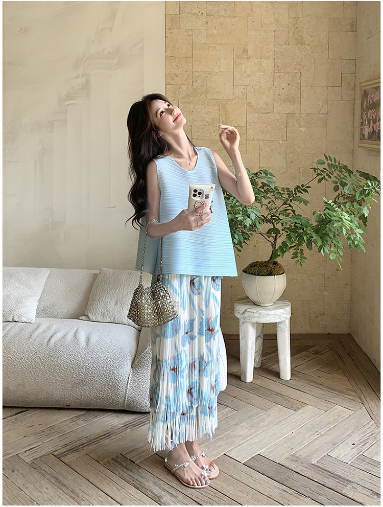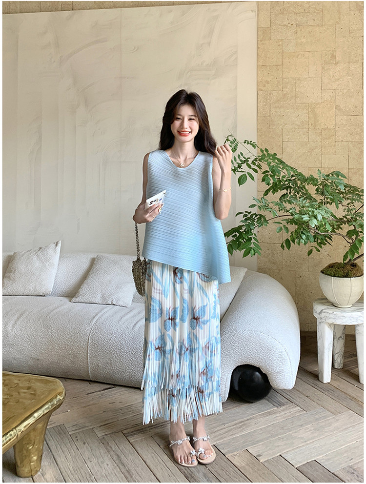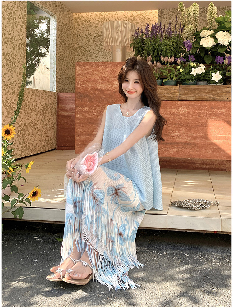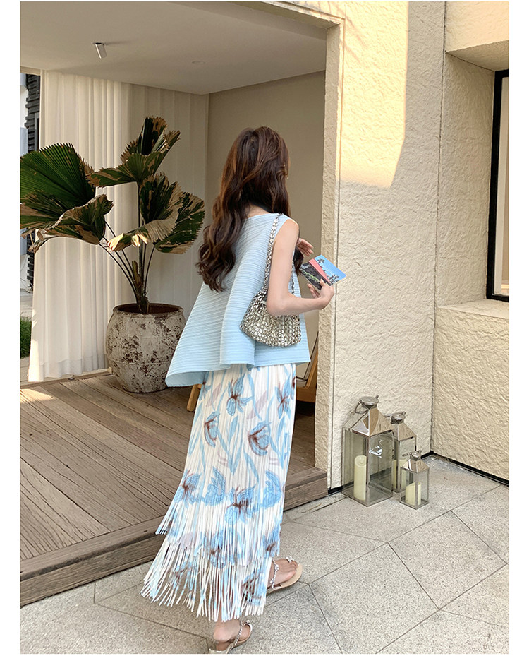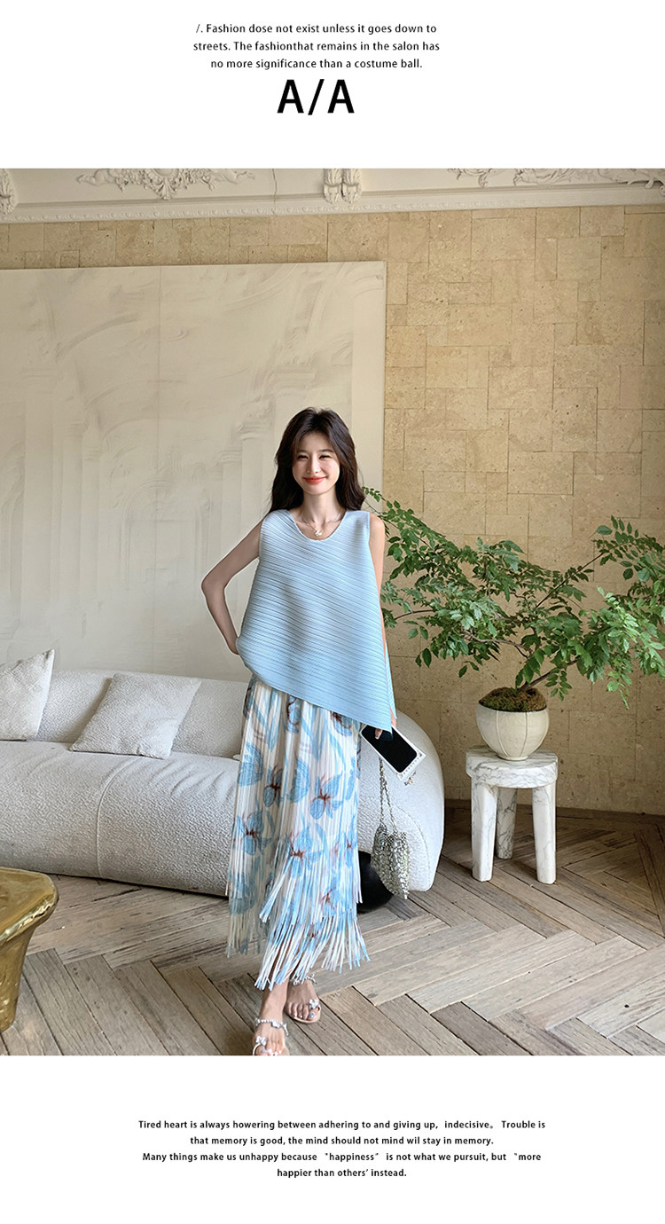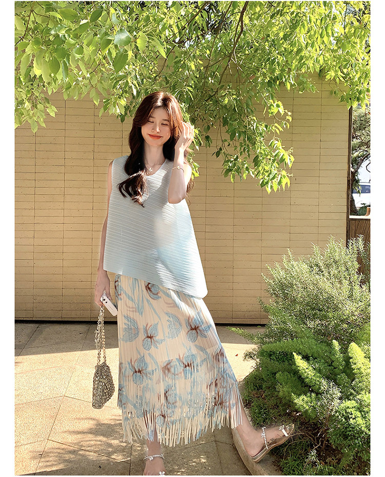 2点セット!【セットアップ】夏新作 涼しげ 韓国風 トップス+フリンジハイウエストスカート 上下セット【SHシリーズ】