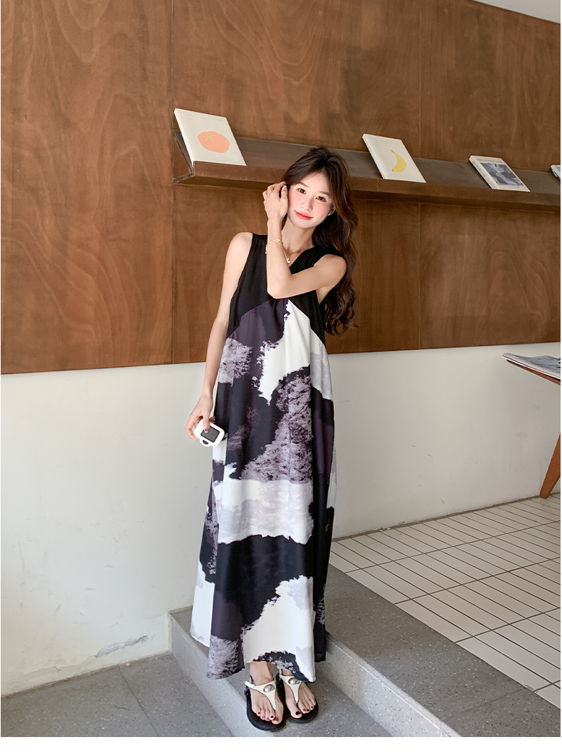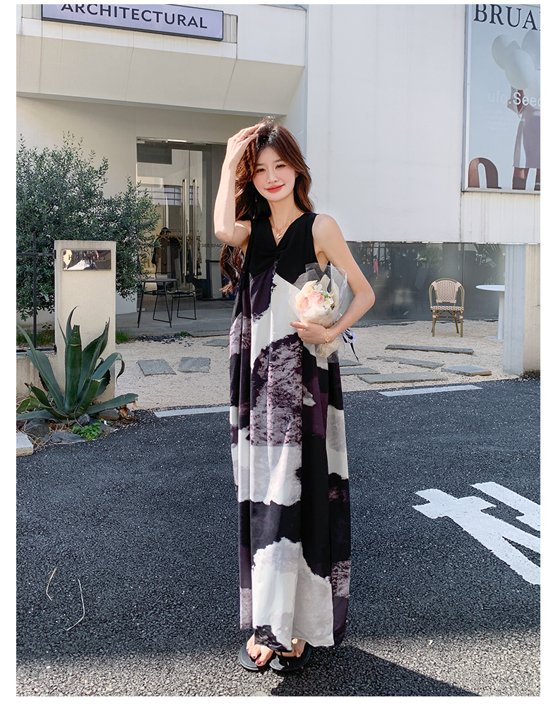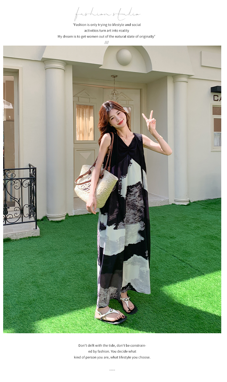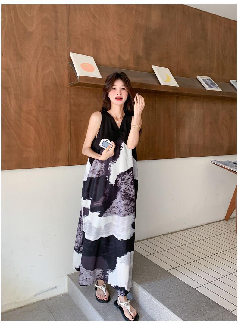 【商品名】【ワンピース】夏新作 レトロ水墨風プリント リラックス感Vネック ノースリーブワンピース【SHシリーズ】