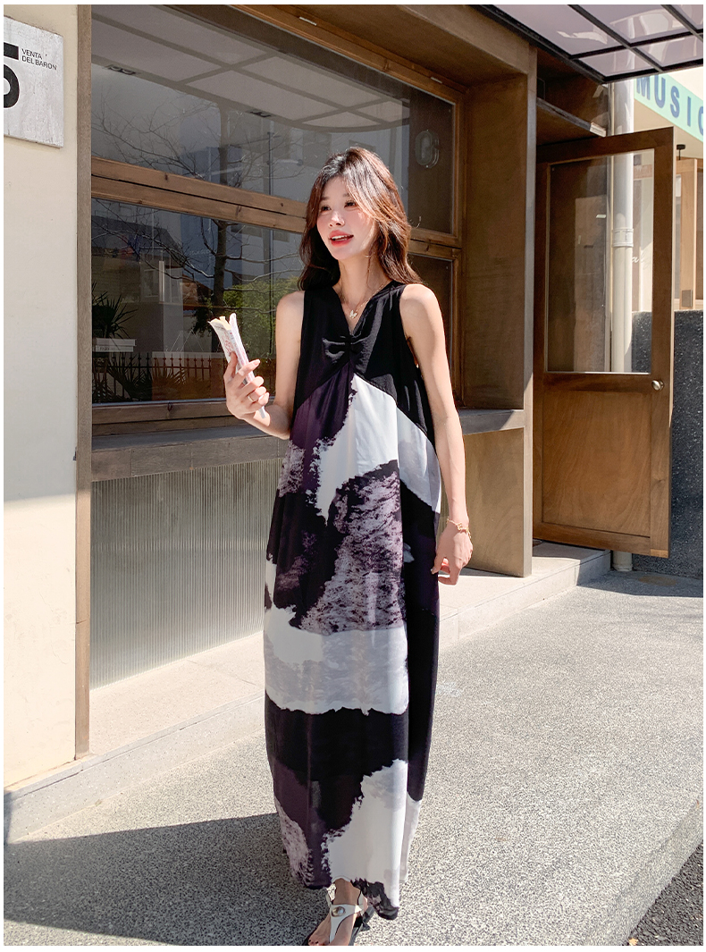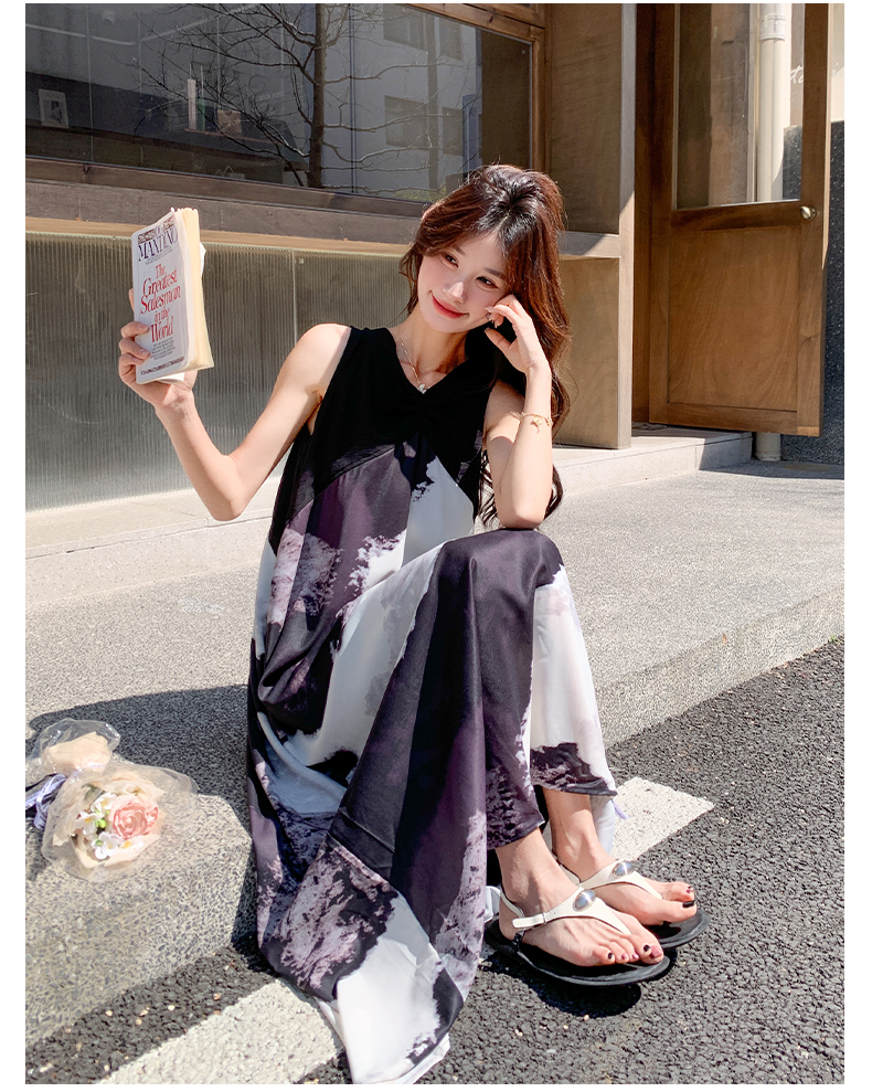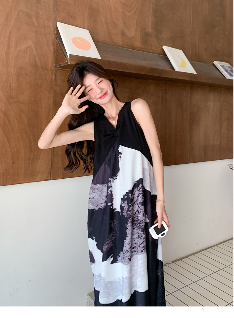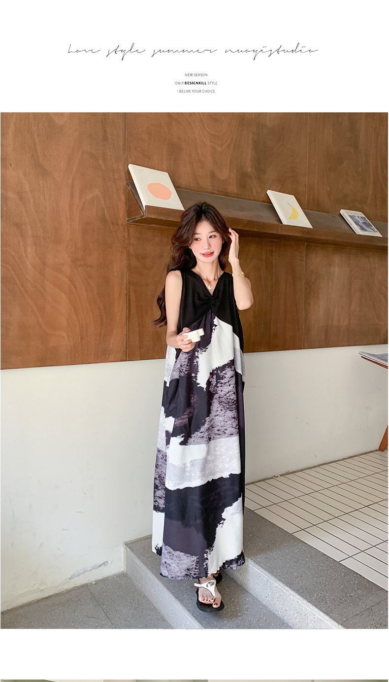 【ワンピース】夏新作 レトロ水墨風プリント リラックス感Vネック ノースリーブワンピース【SHシリーズ】