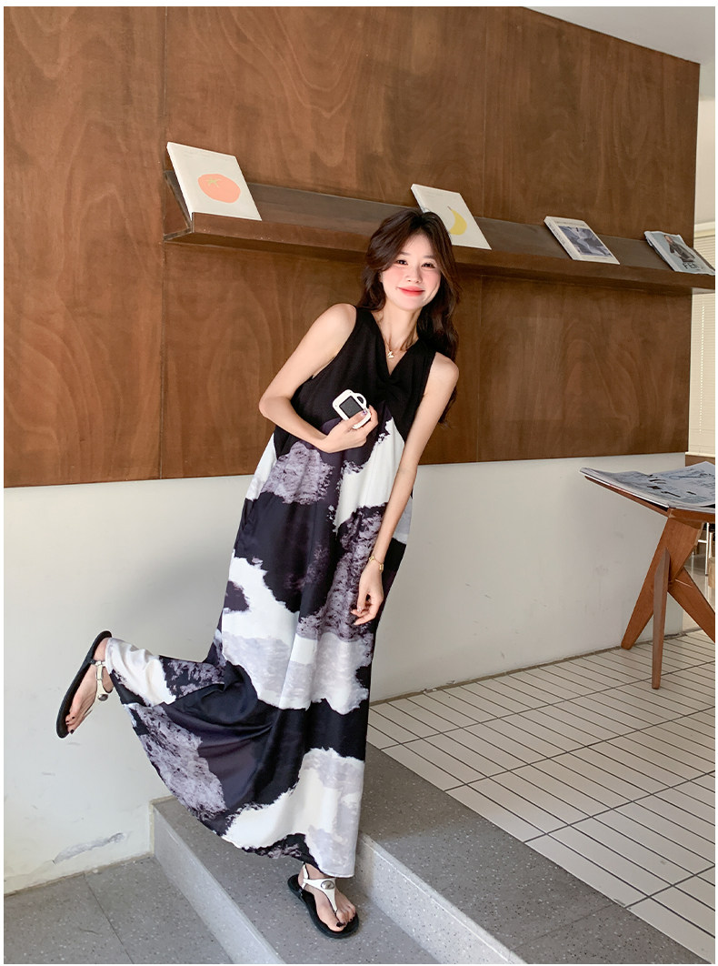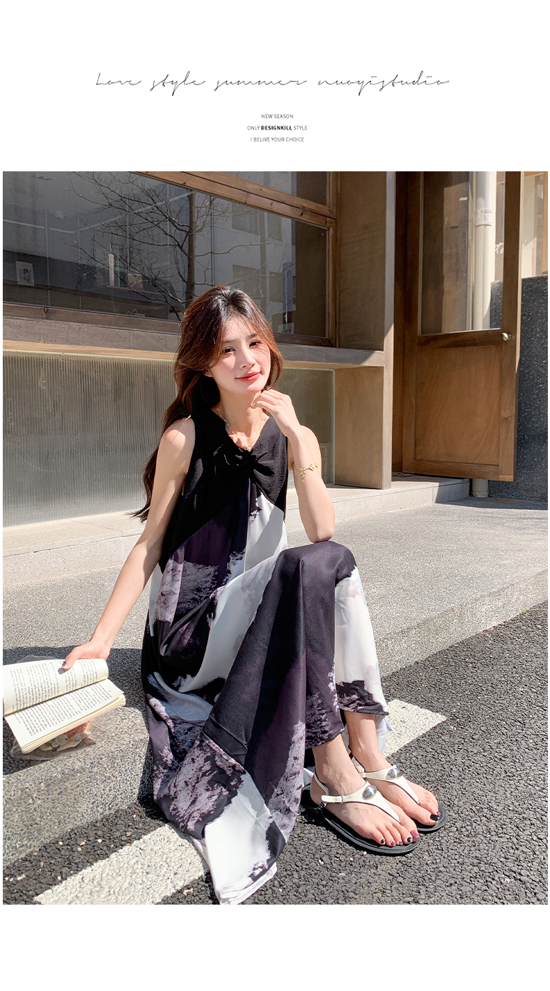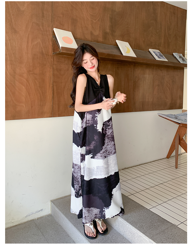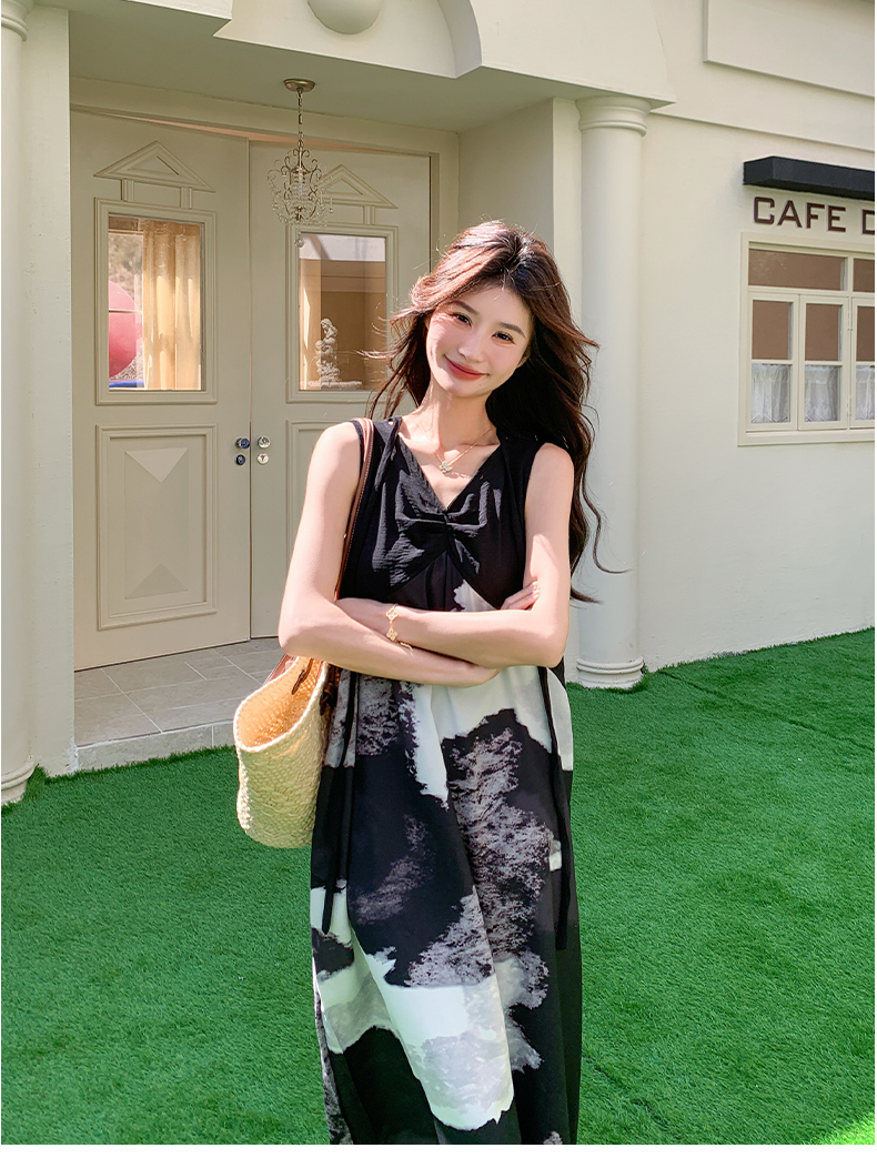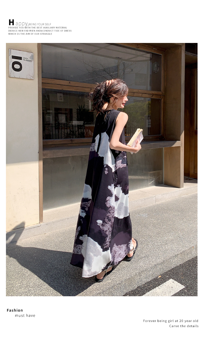 【ワンピース】夏新作 レトロ水墨風プリント リラックス感Vネック ノースリーブワンピース【SHシリーズ】