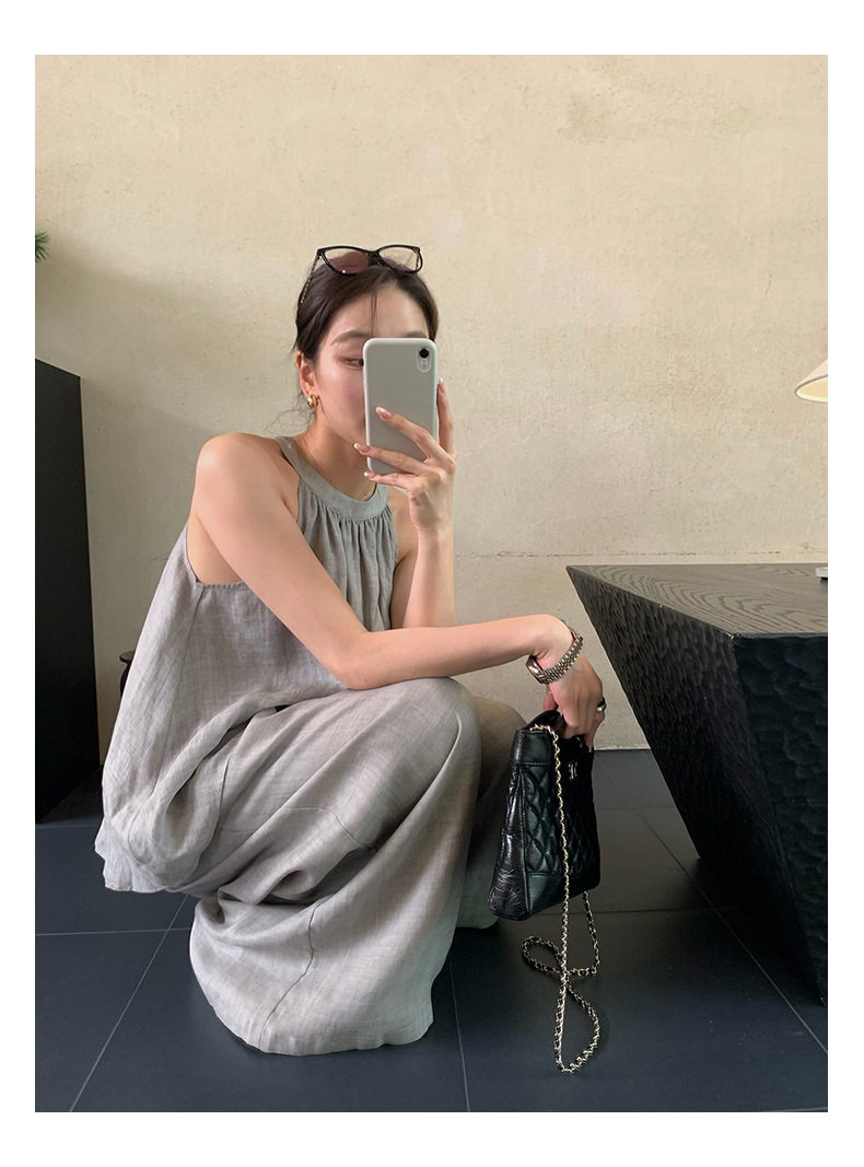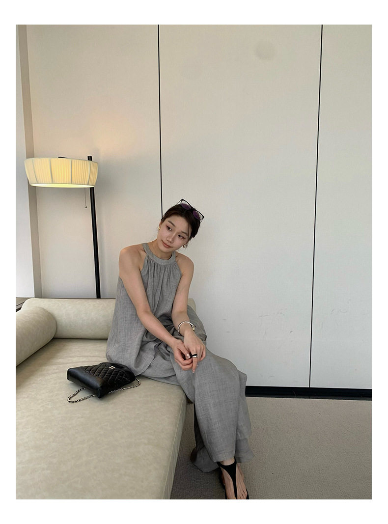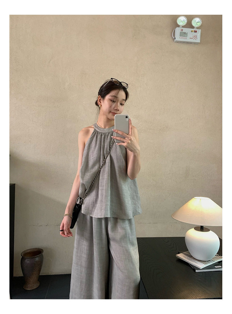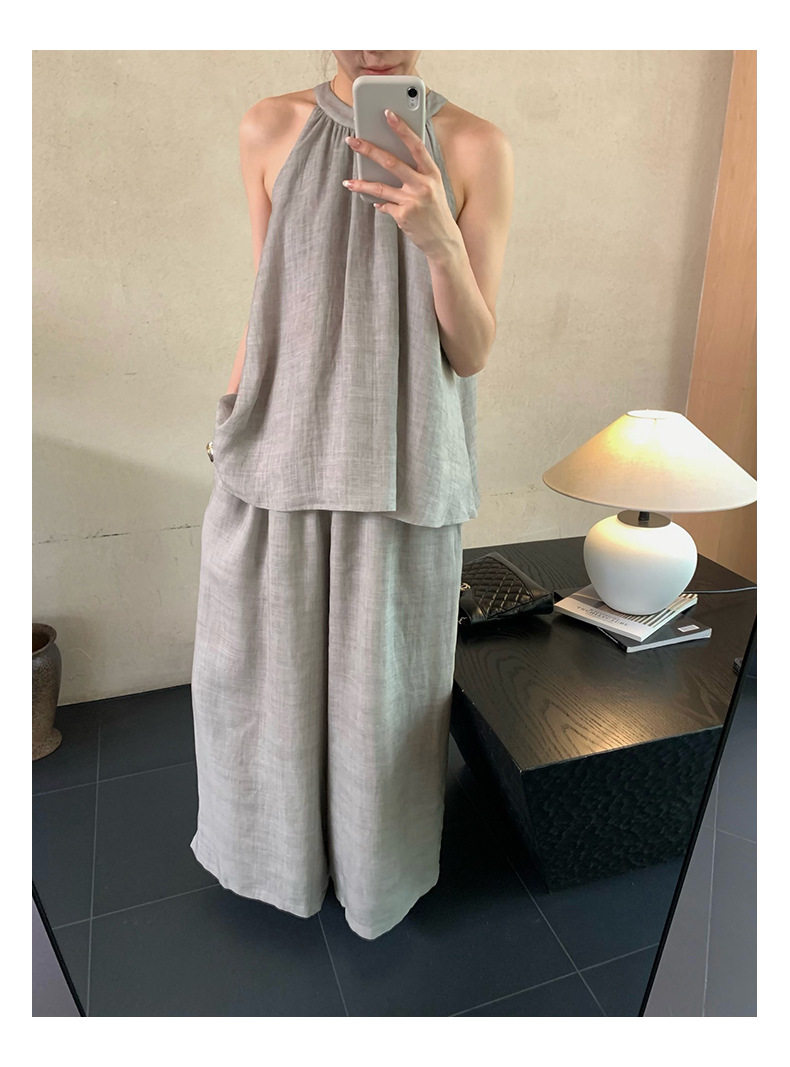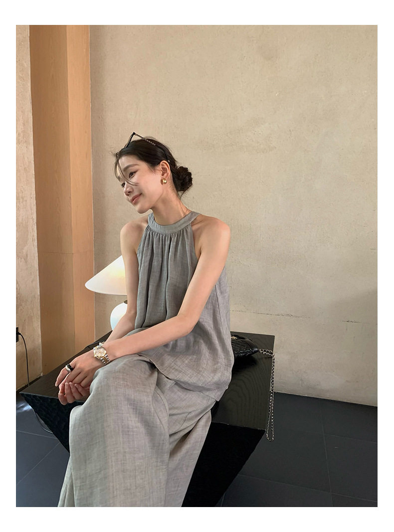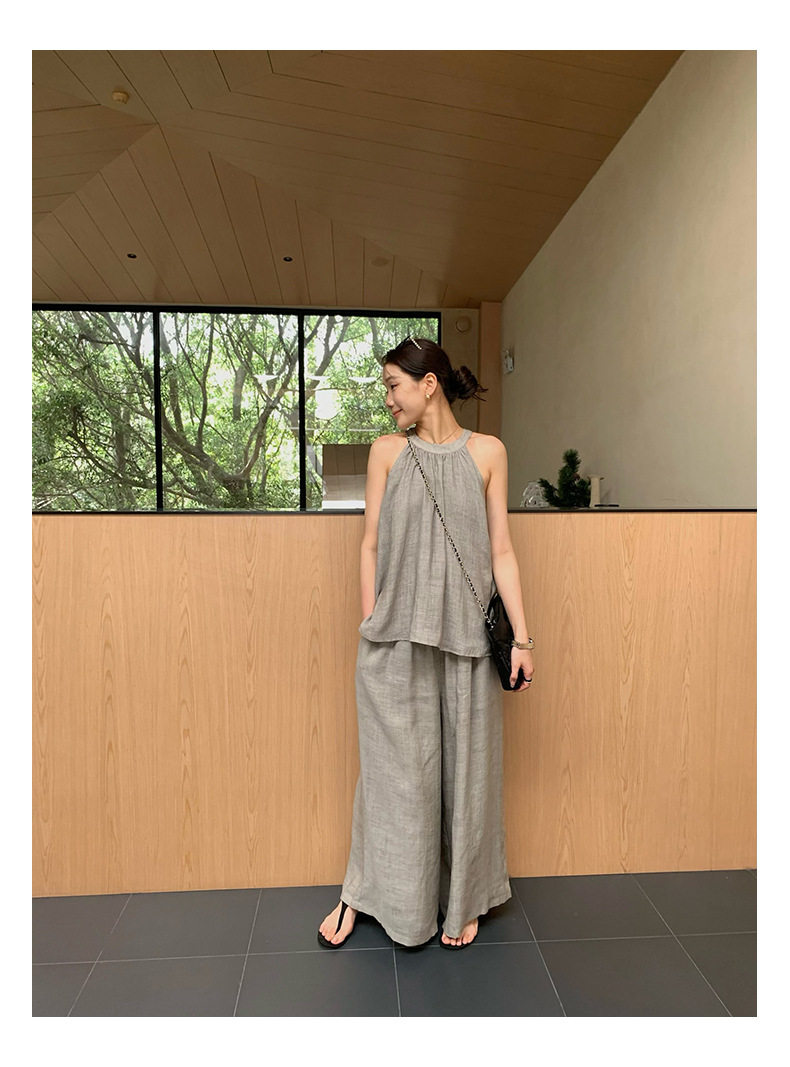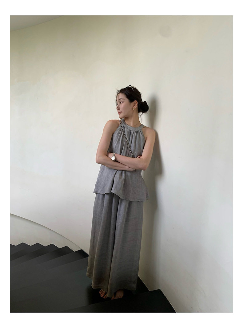 【商品名】2点セット!【ボトムス】夏 ラミー ハイネック プリーツ タンクトップ+ワイドレッグパンツ 上下セット【JZシリーズ】