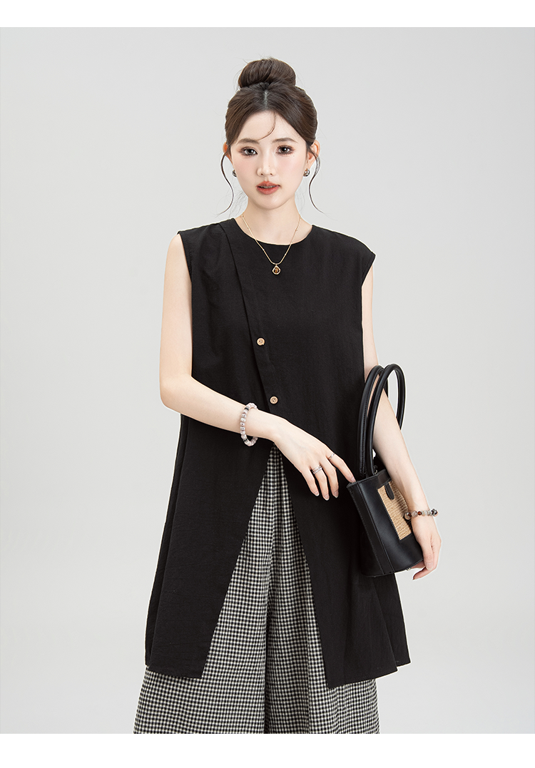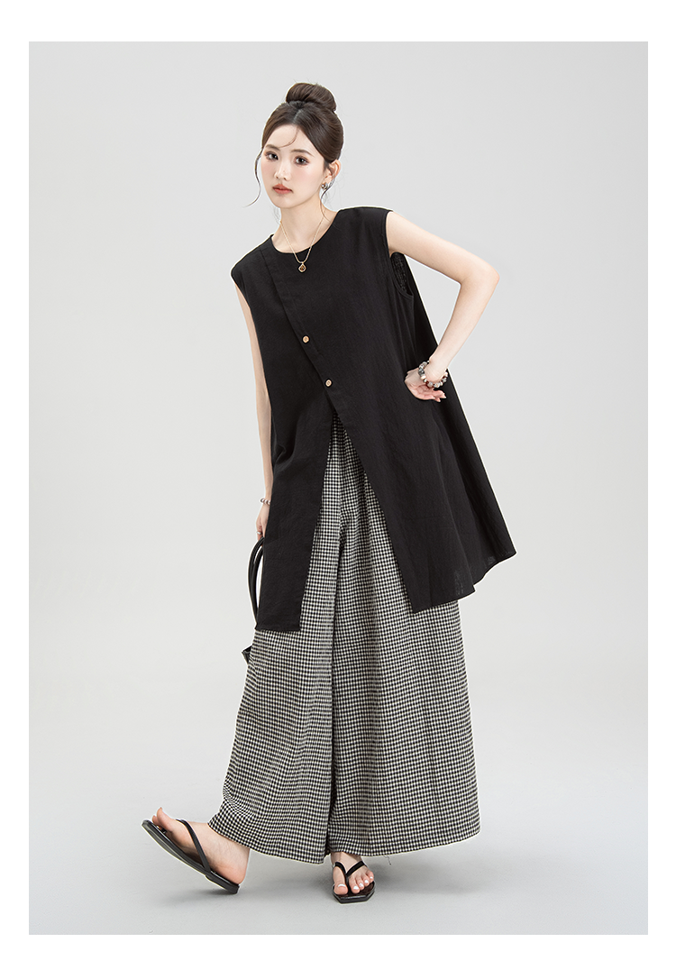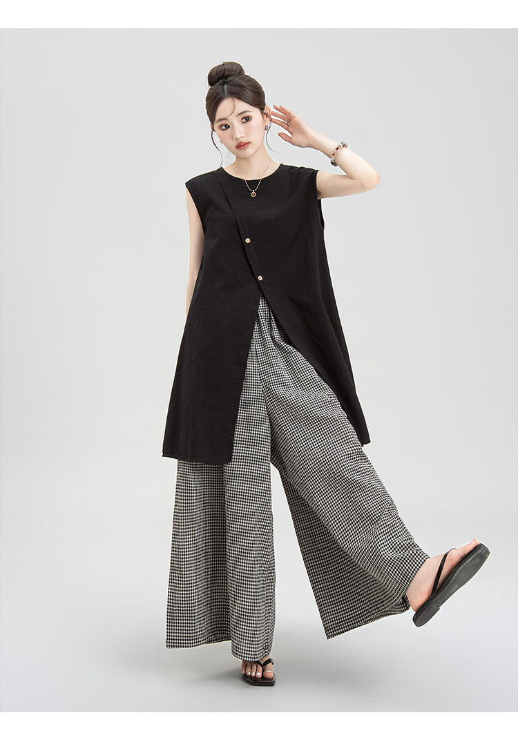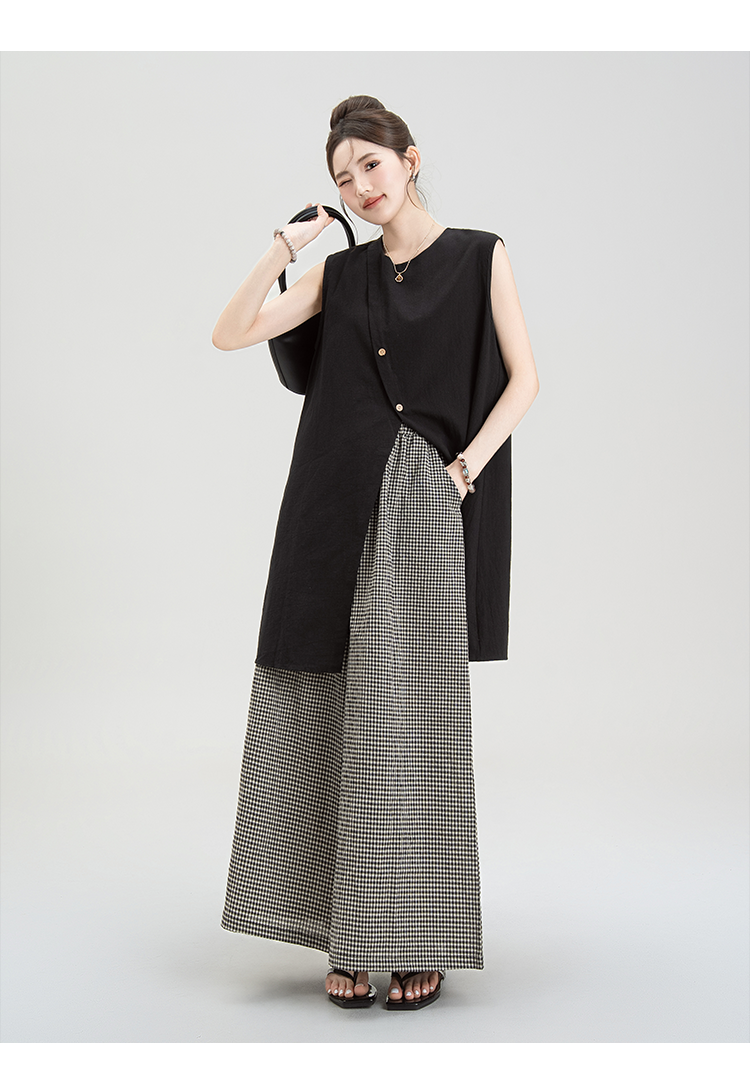 【商品名】【単品注文】【ボトムス】夏新作 アシンメトリースリット ミドル丈ノースリーブトップス+ゆったりチェックワイドパンツ 上下セット【JZシリーズ】
