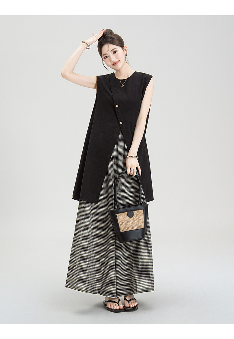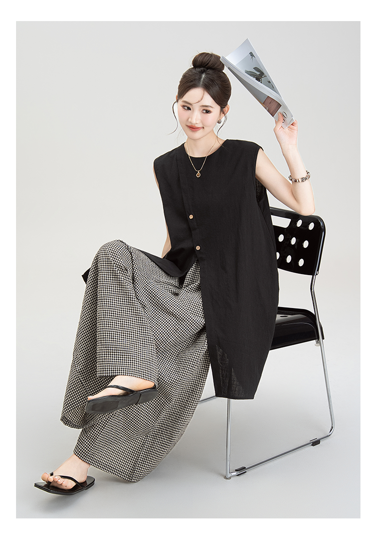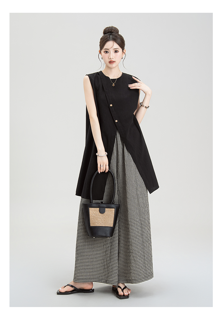 【単品注文】【セットアップ】夏新作 アシンメトリースリット ミドル丈ノースリーブトップス+ゆったりチェックワイドパンツ 上下セット【JZシリーズ】