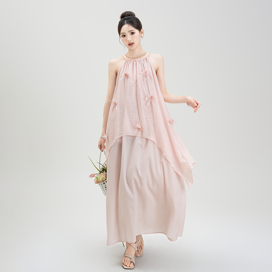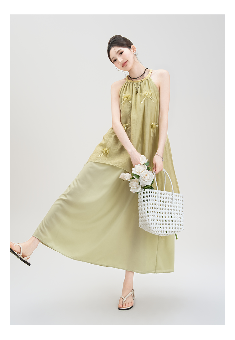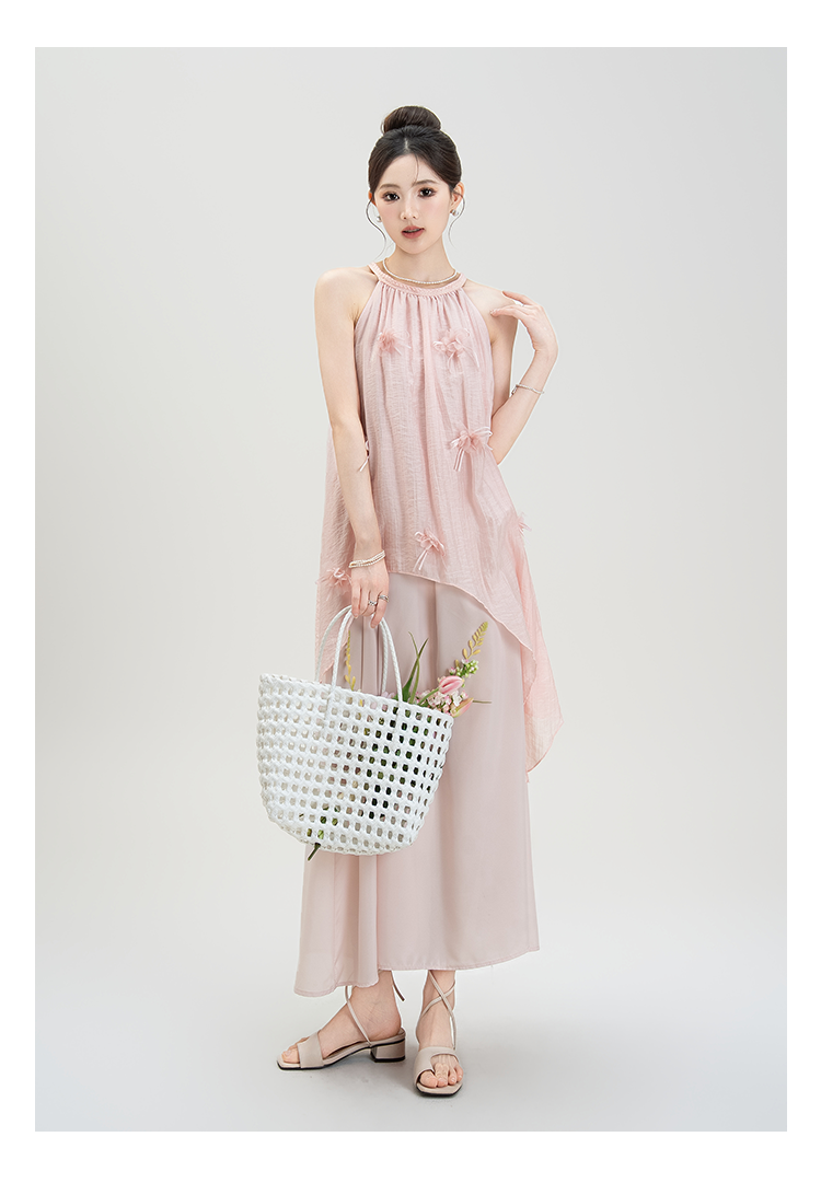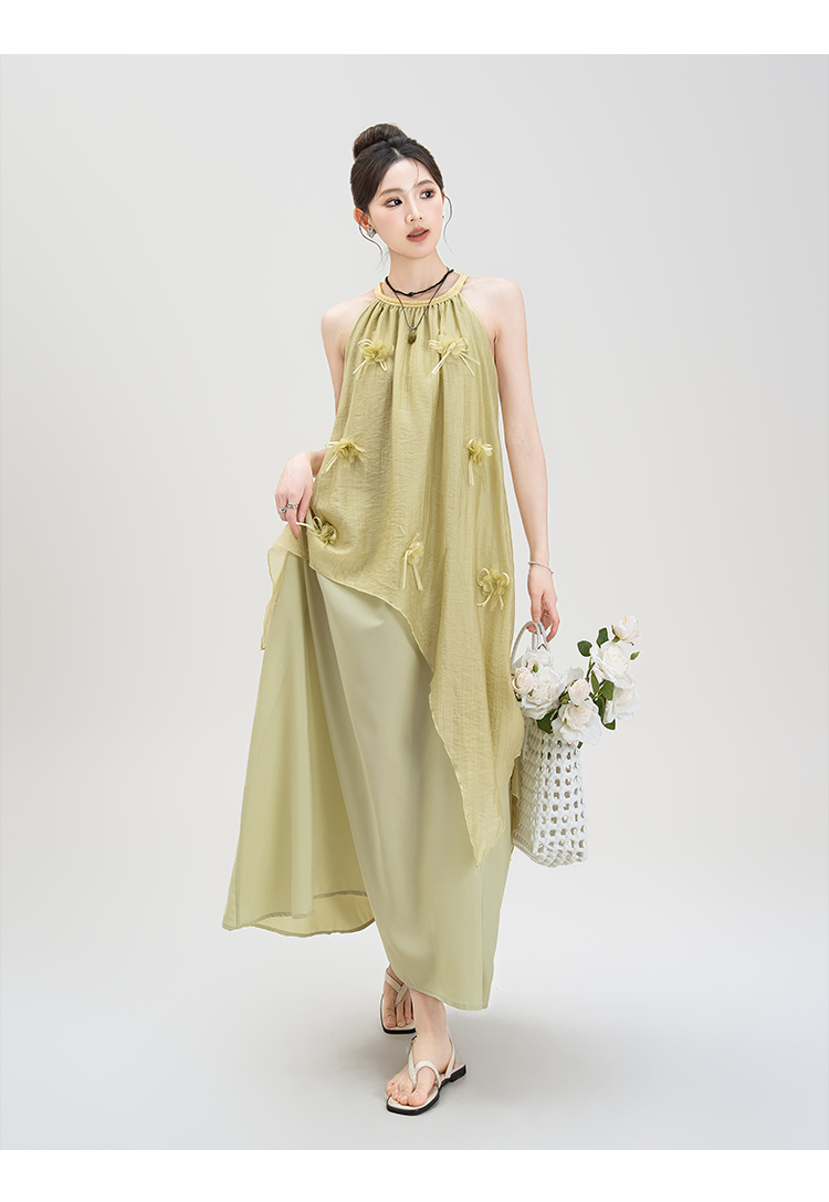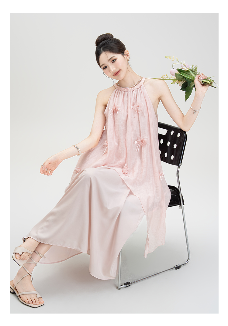 【ワンピース】夏新作 フレンチバカンス風 立体フラワー付き ハルターネック ノースリーブワンピース【SHシリーズ】