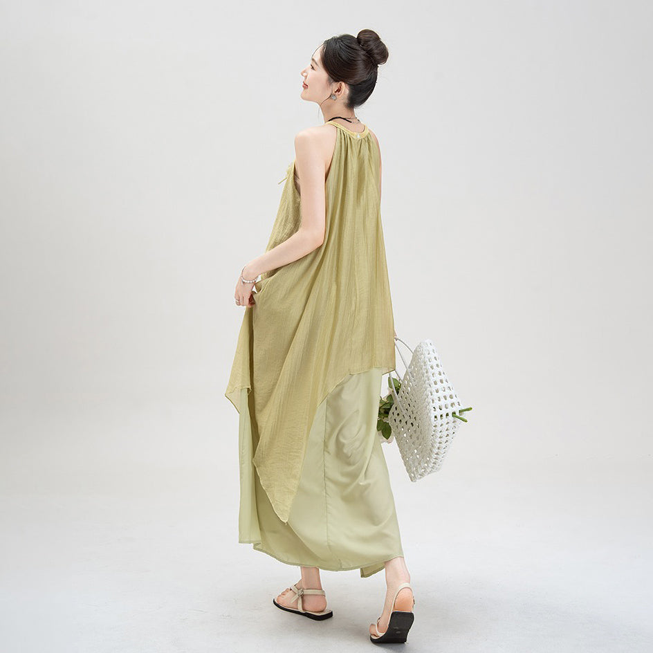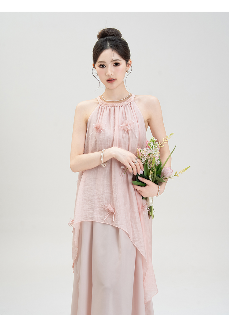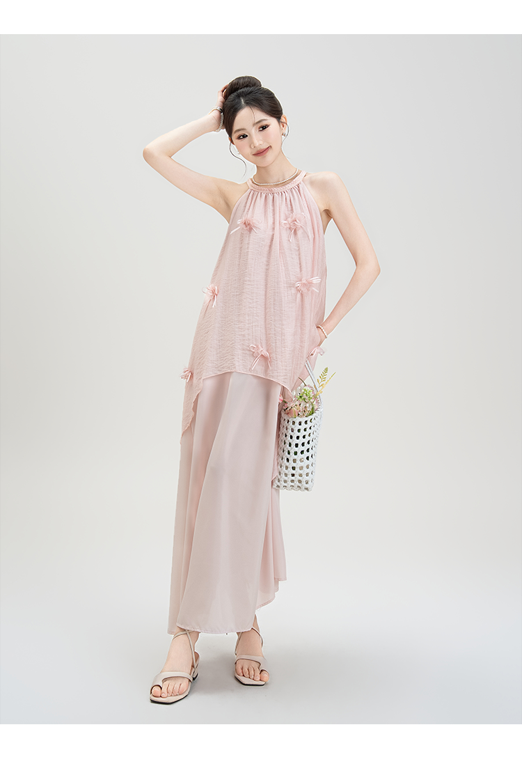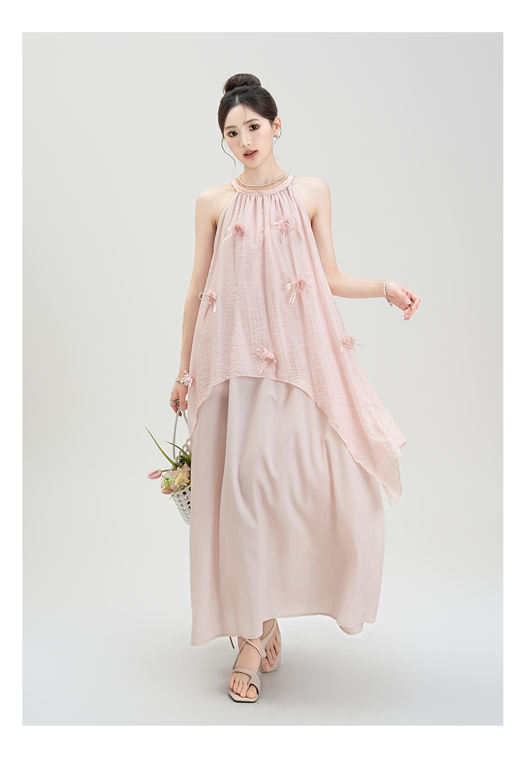 【ワンピース】夏新作 フレンチバカンス風 立体フラワー付き ハルターネック ノースリーブワンピース【SHシリーズ】