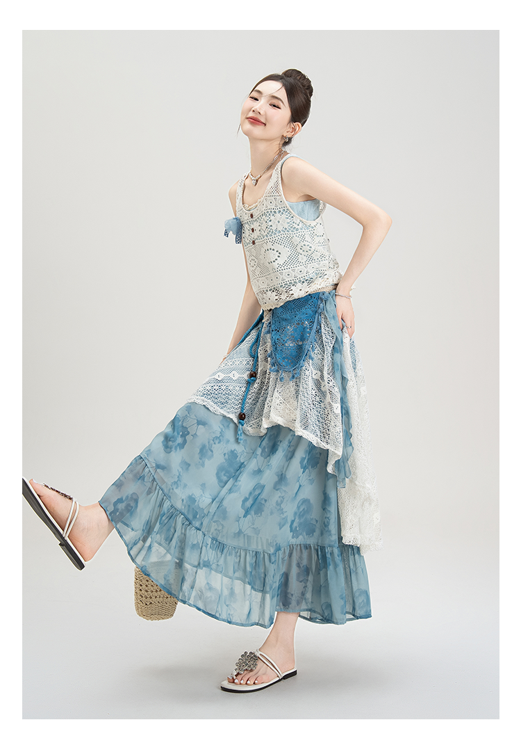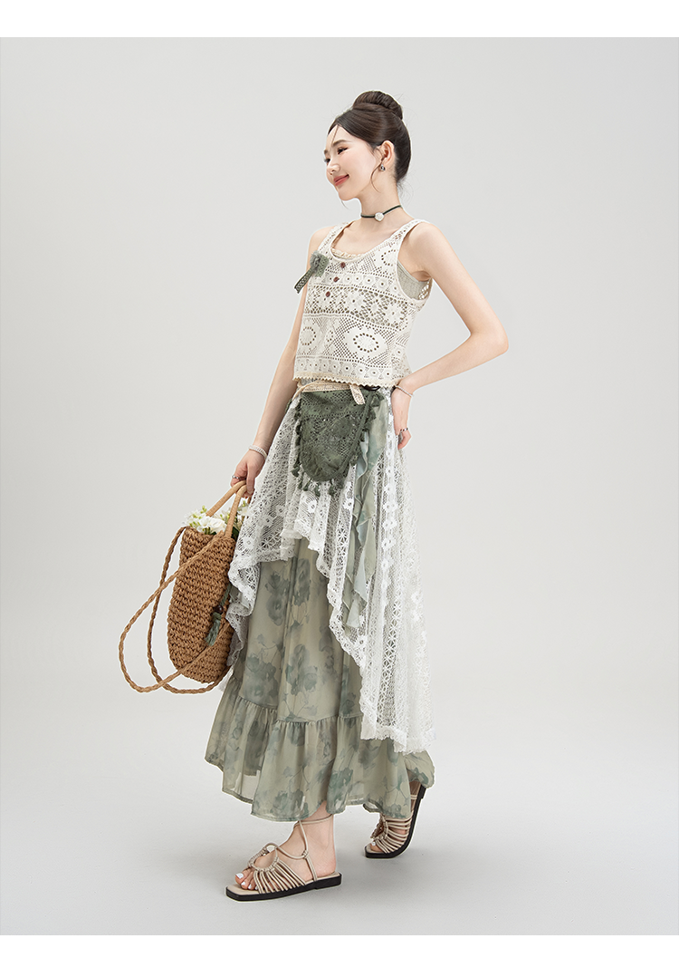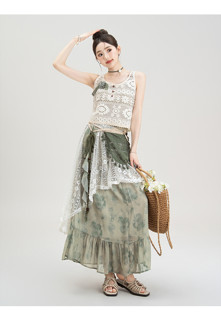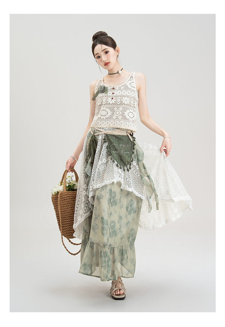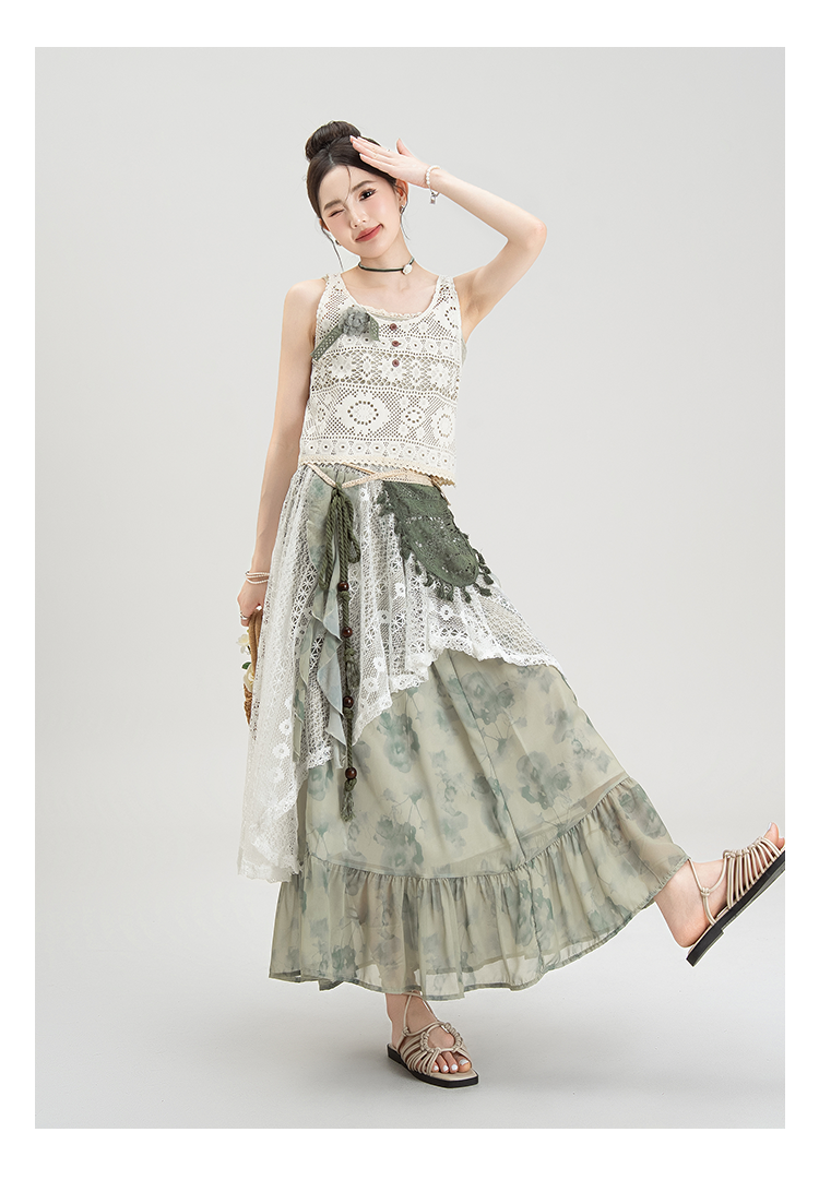 【商品名】3点セット【ボトムス】森系ボヘミアンキャミソール+レイヤード風ベスト+花柄切り替えロングスカート3点上下セット 【SHシリーズ】