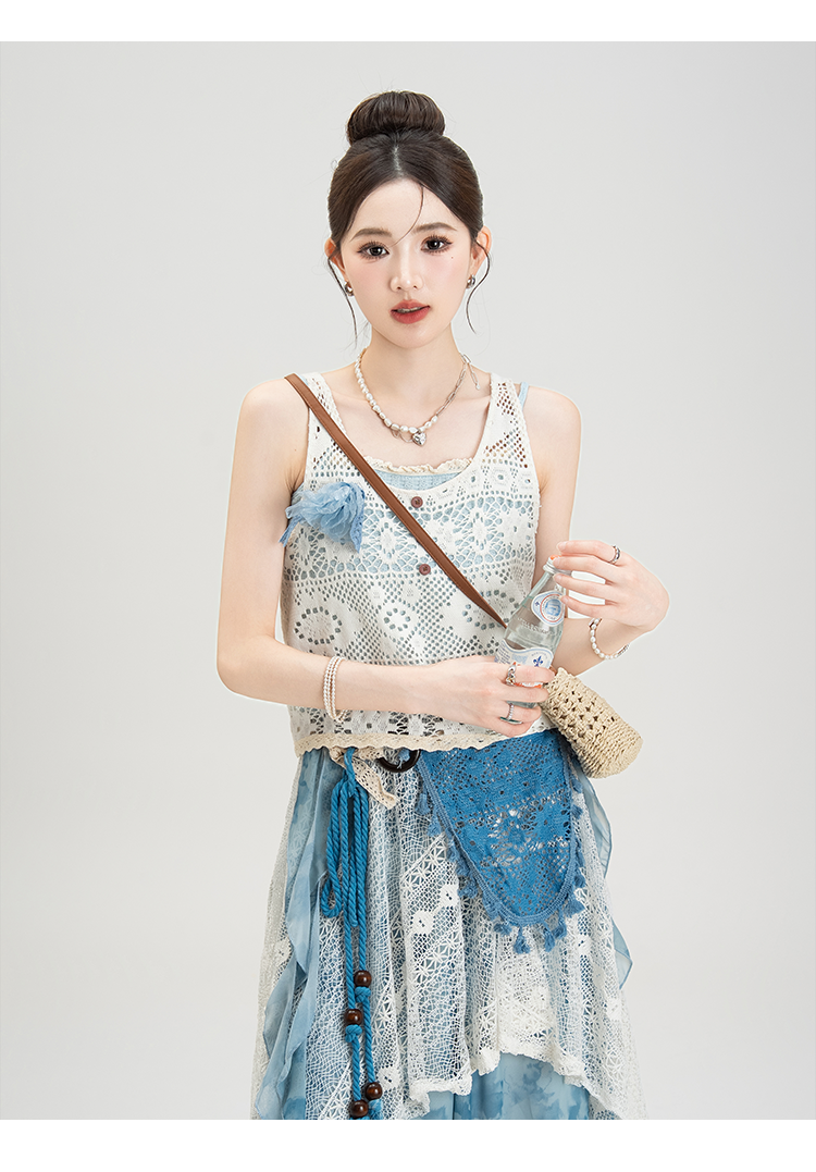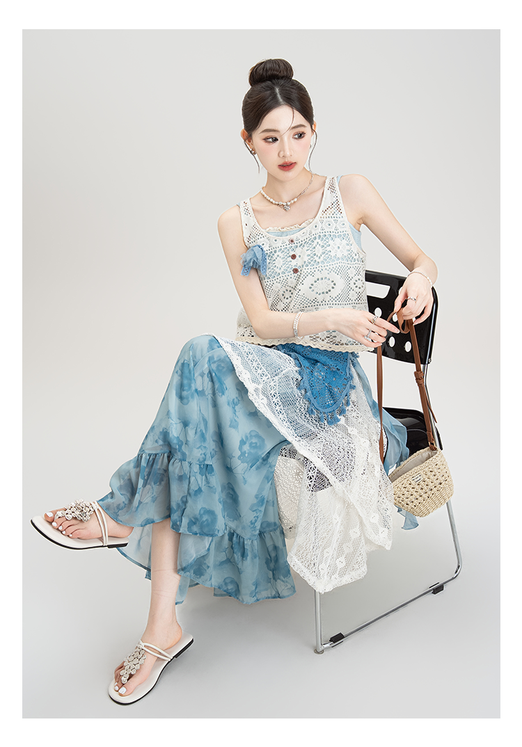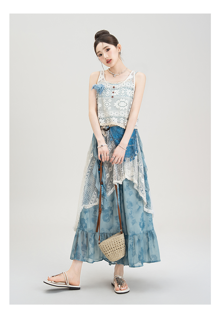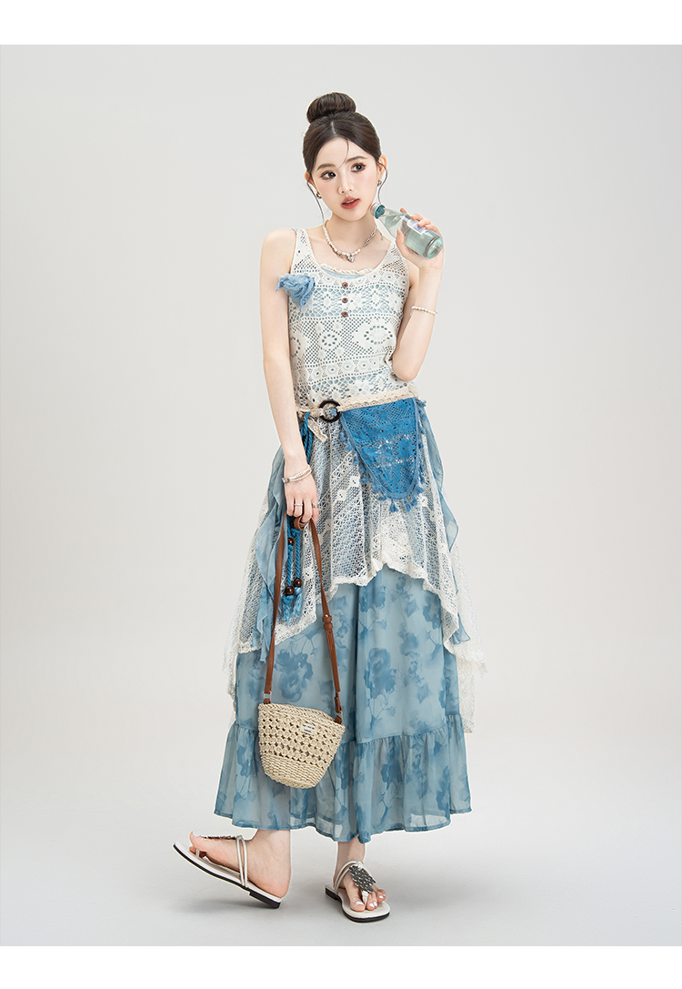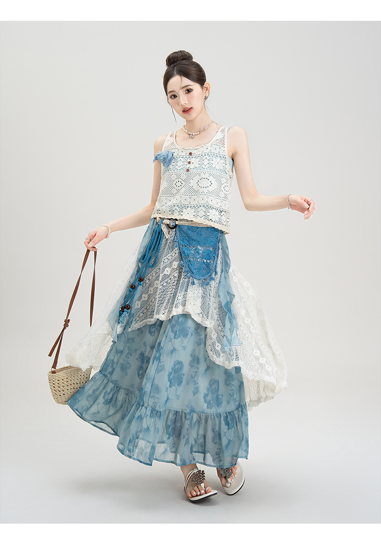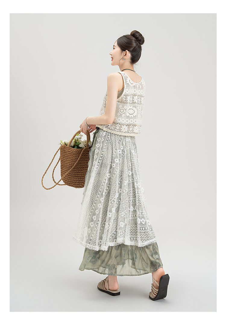【商品名】3点セット【ボトムス】森系ボヘミアンキャミソール+レイヤード風ベスト+花柄切り替えロングスカート3点上下セット 【SHシリーズ】