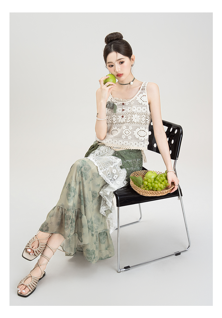 3点セット【セットアップ】森系ボヘミアンキャミソール+レイヤード風ベスト+花柄切り替えロングスカート3点上下セット 【SHシリーズ】